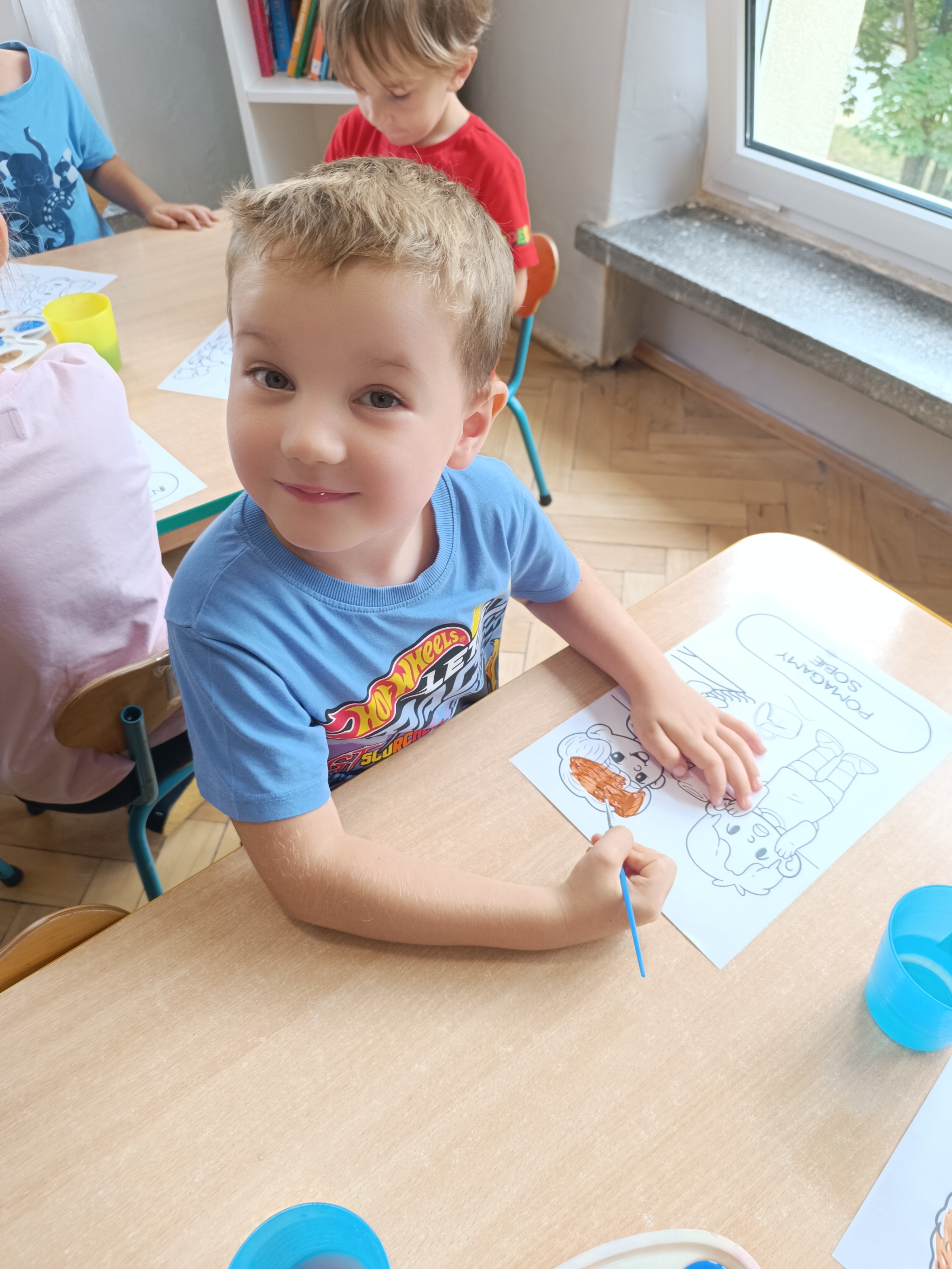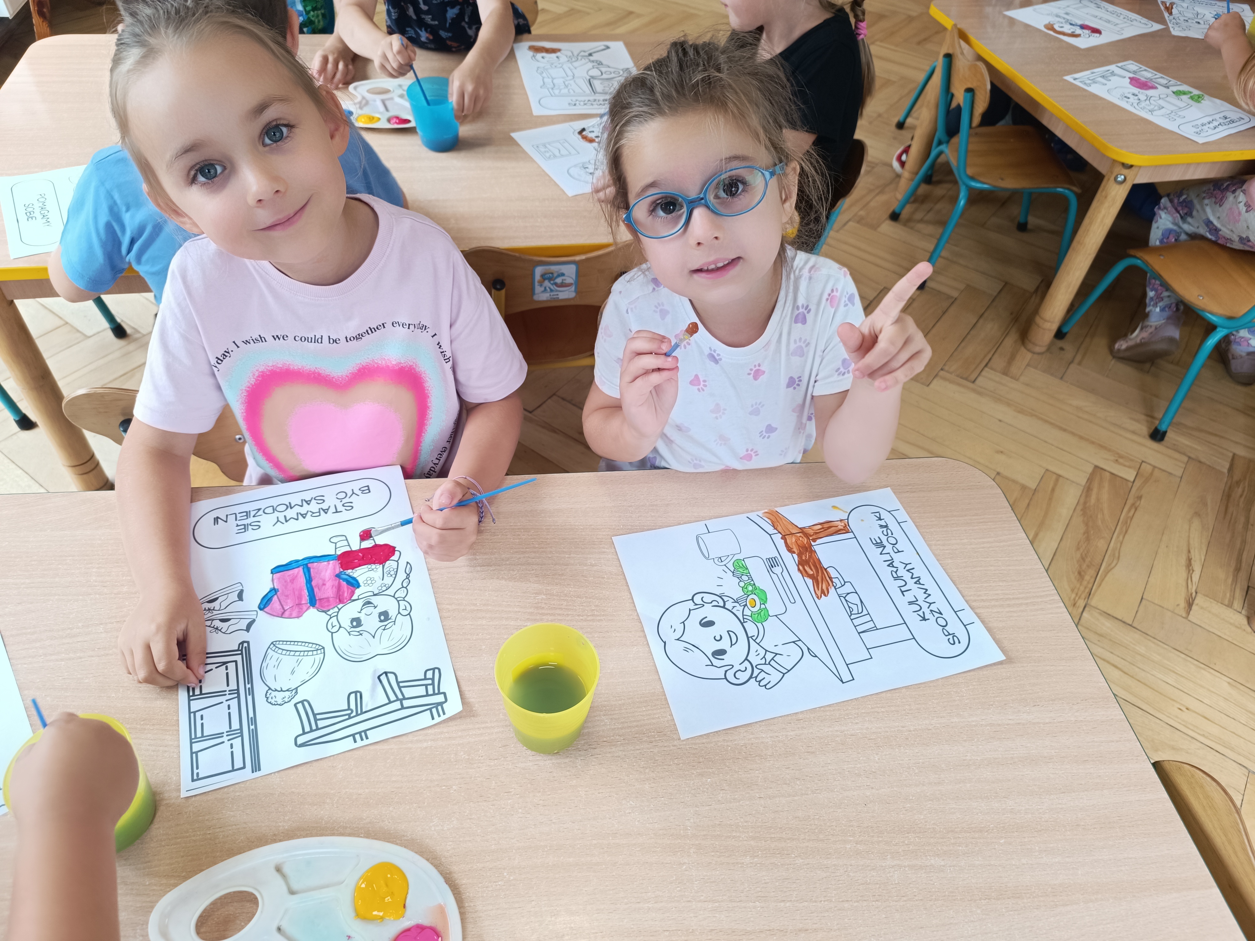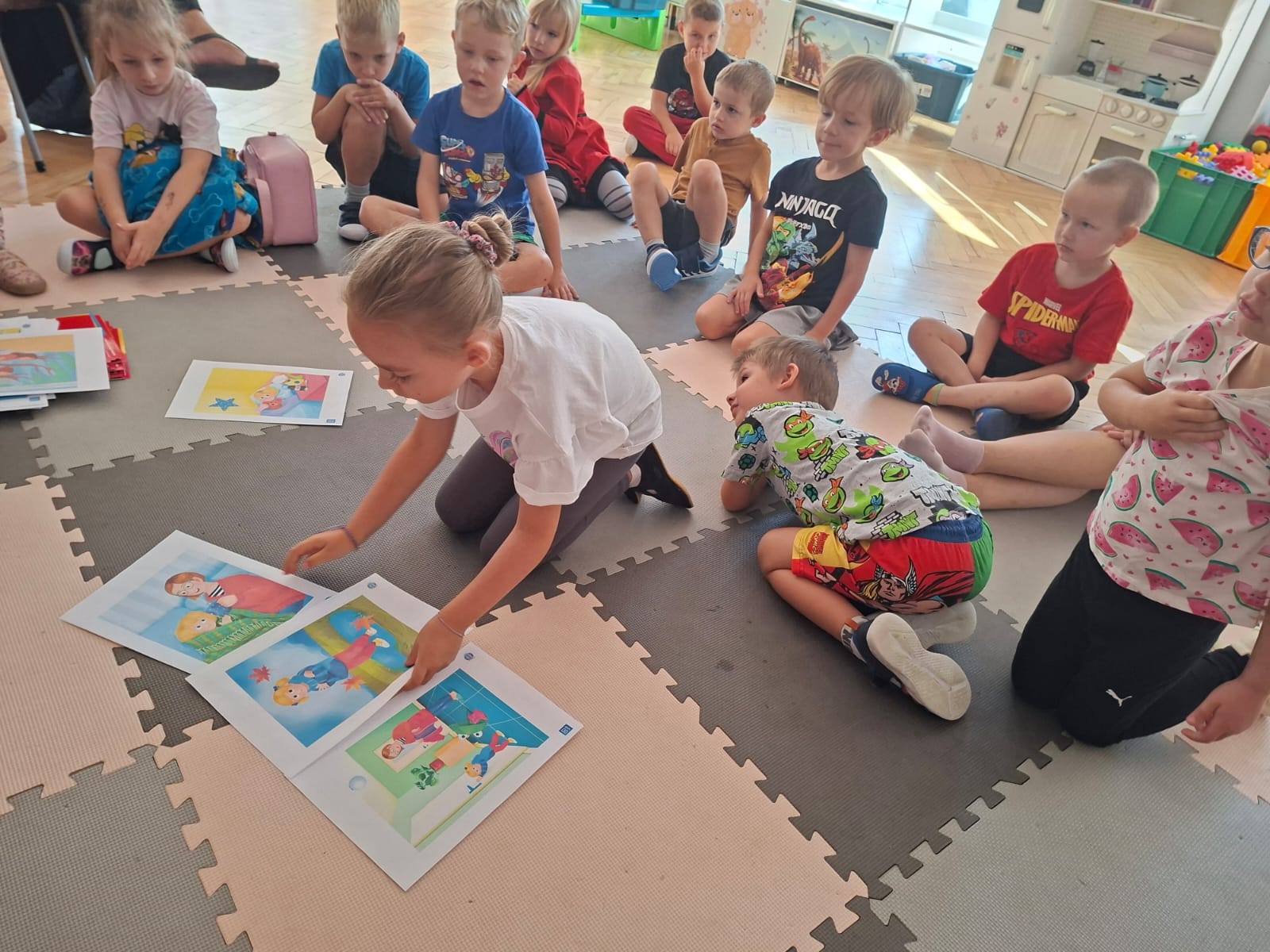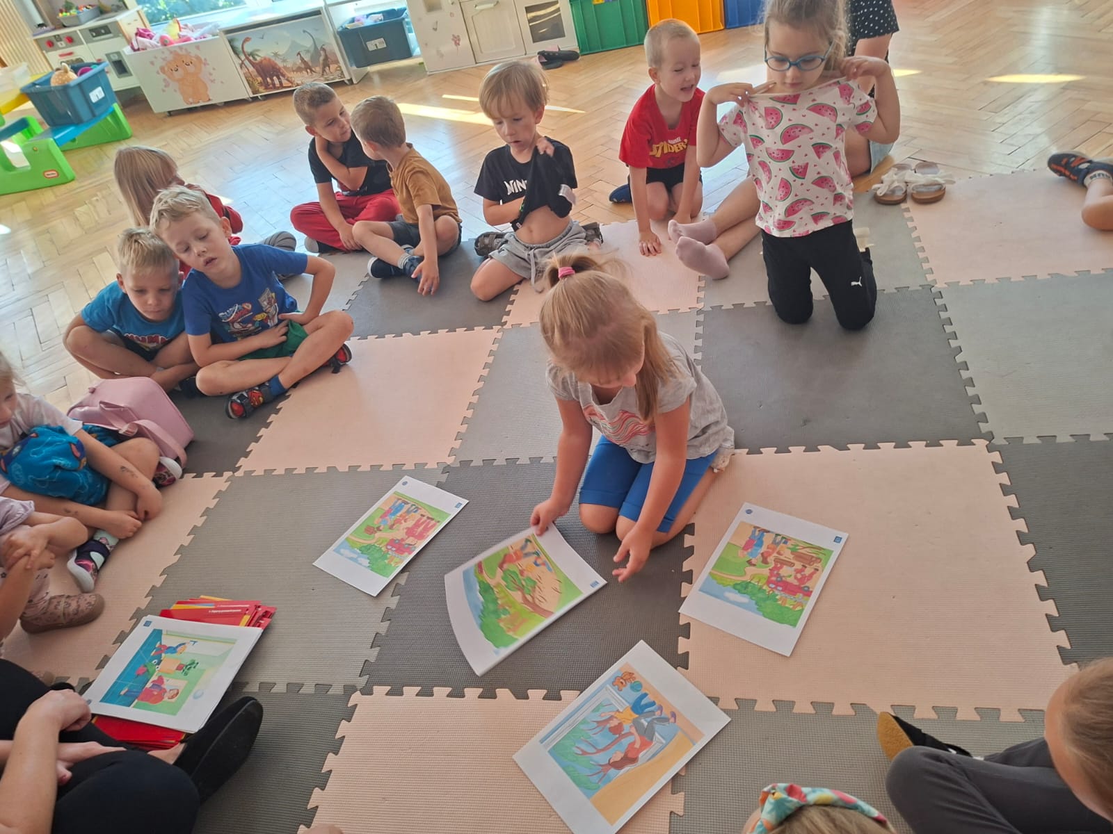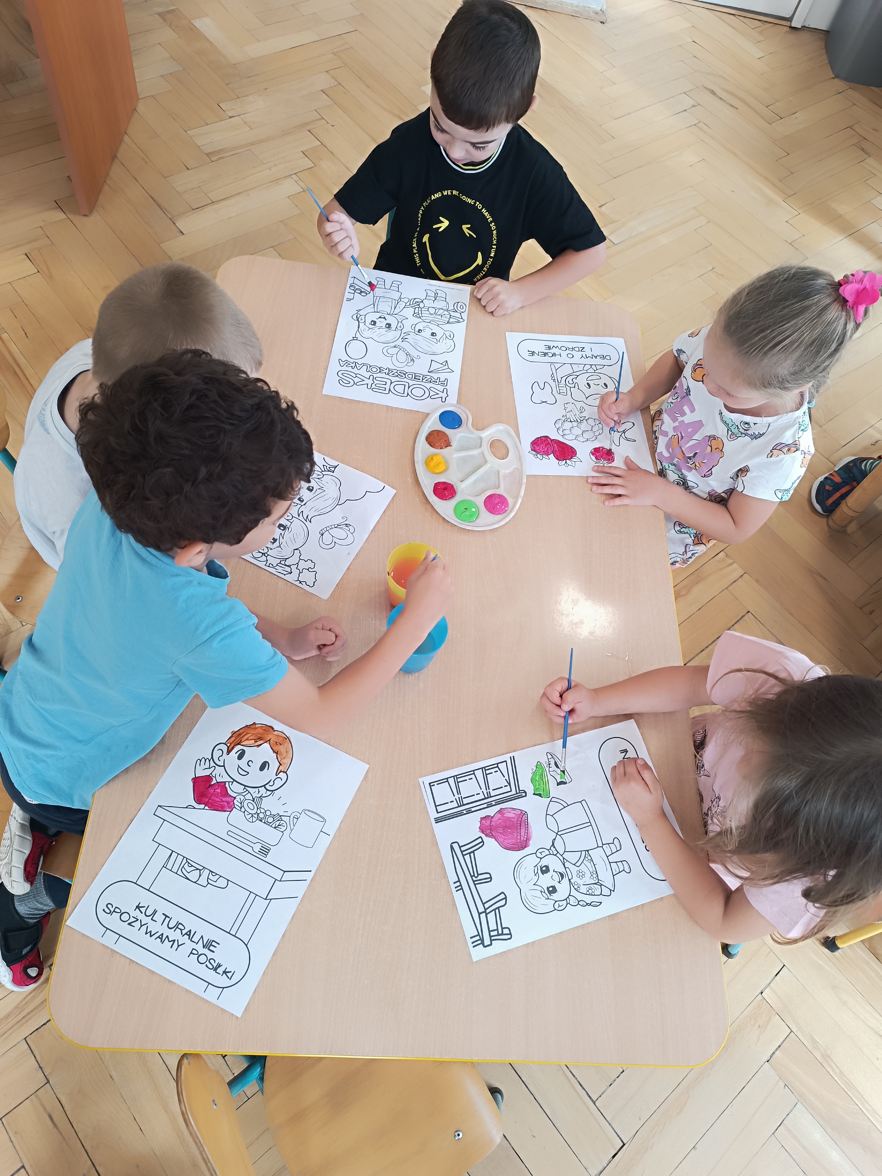 W tym tygodniu również poznawaliśmy pomieszczenia przedszkolne oraz wymienialiśmy pracowników przedszkola. Układaliśmy historyjki obrazkowe opowiadając o nich. Rozmawialiśmy o zabawkach, o czynnościach higienicznych w łazience, jak poprawnie myć ręce, zrobiliśmy doświadczenie z pieprzem i płynem do naczyń, pokazując jak oddziałuje mycie rączek mydłem na bakterie które mamy na sobie po zabawie np. na placu zabaw. Rozpoznawaliśmy dźwięki suszenia włosów, spuszczania wody, mycia rąk, pralki, mycia zębów puszczonych z radia. Oglądaliśmy film edukacyjny o czynnościach higienicznych w łazience.