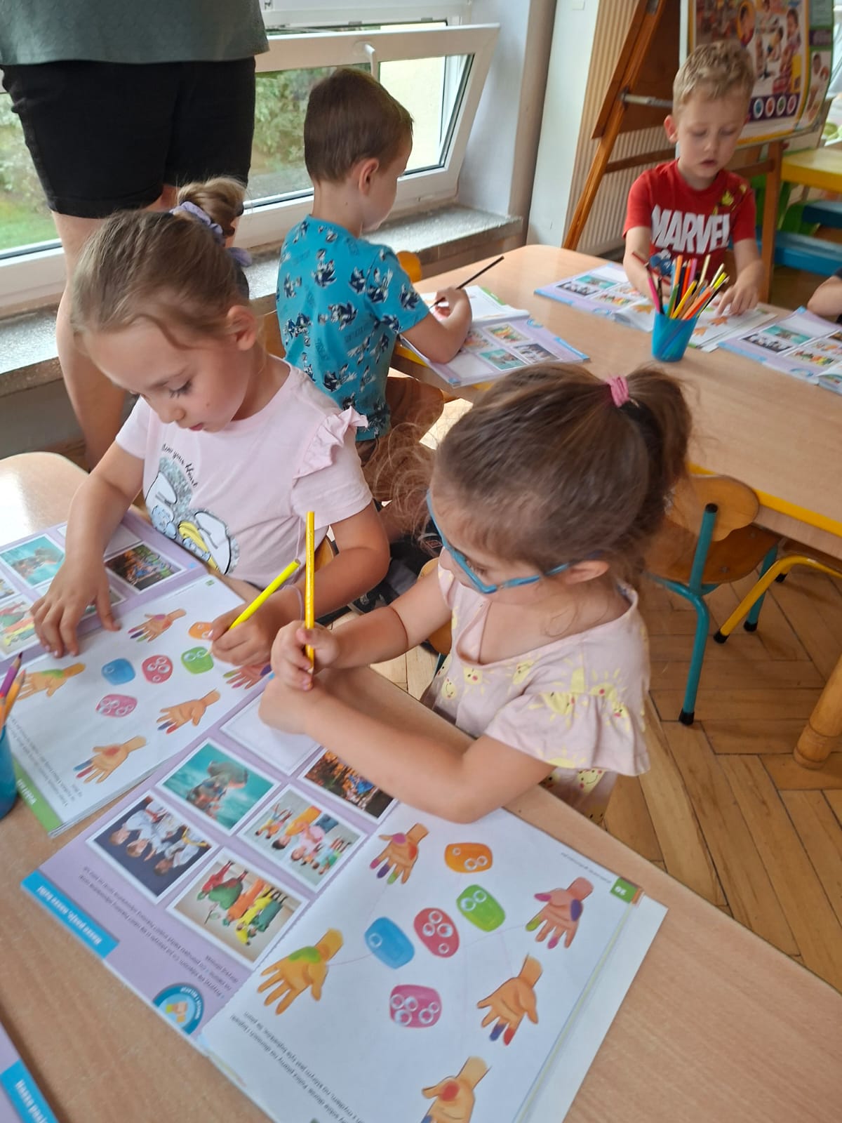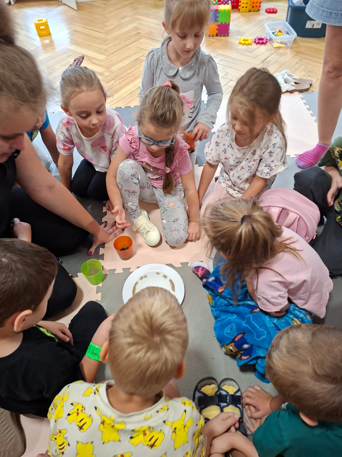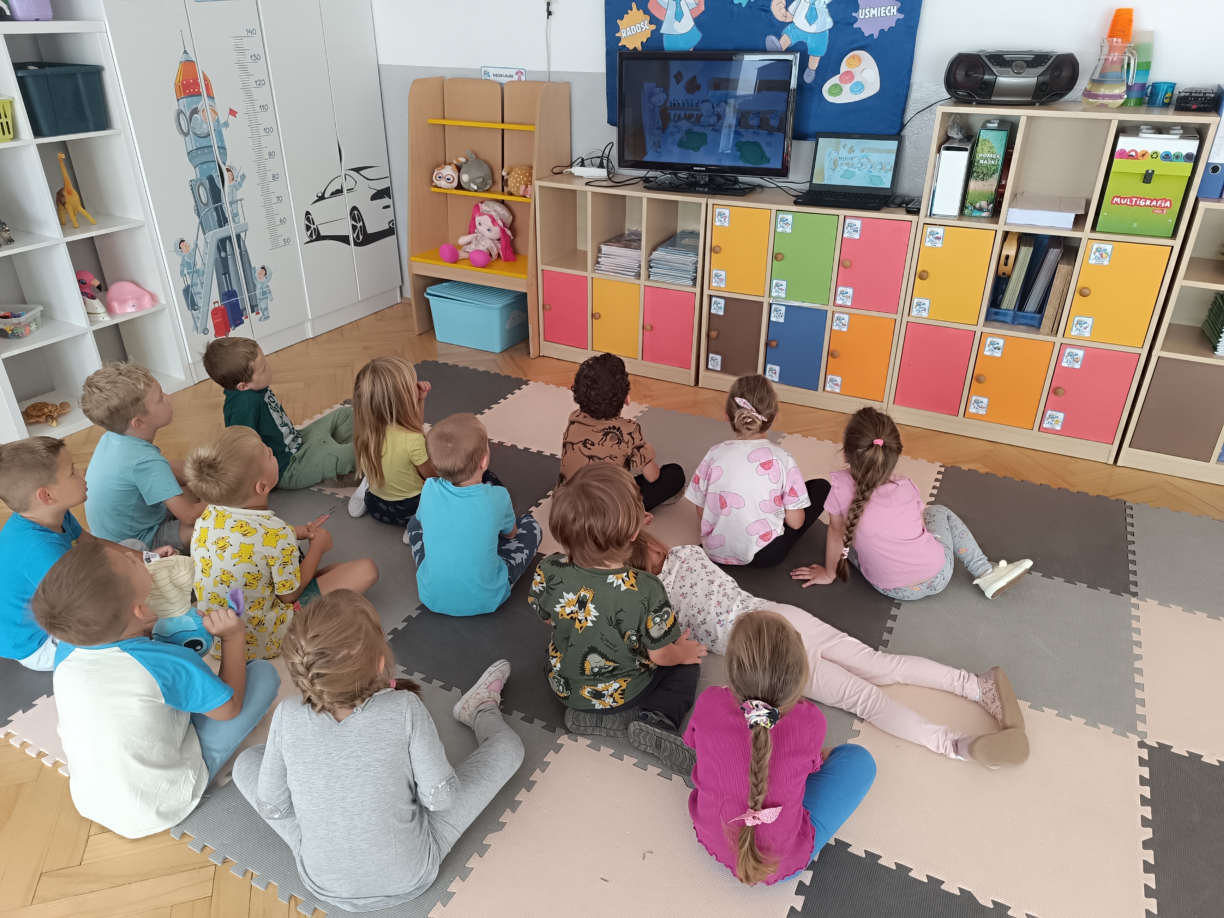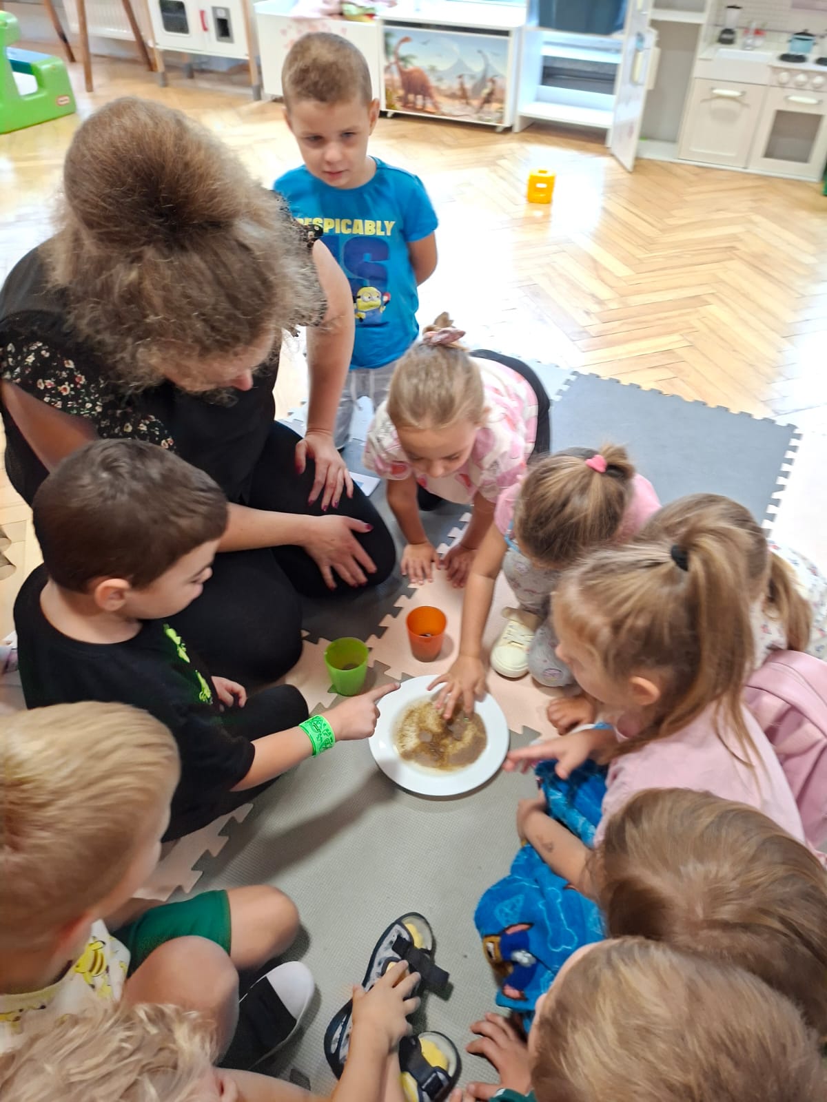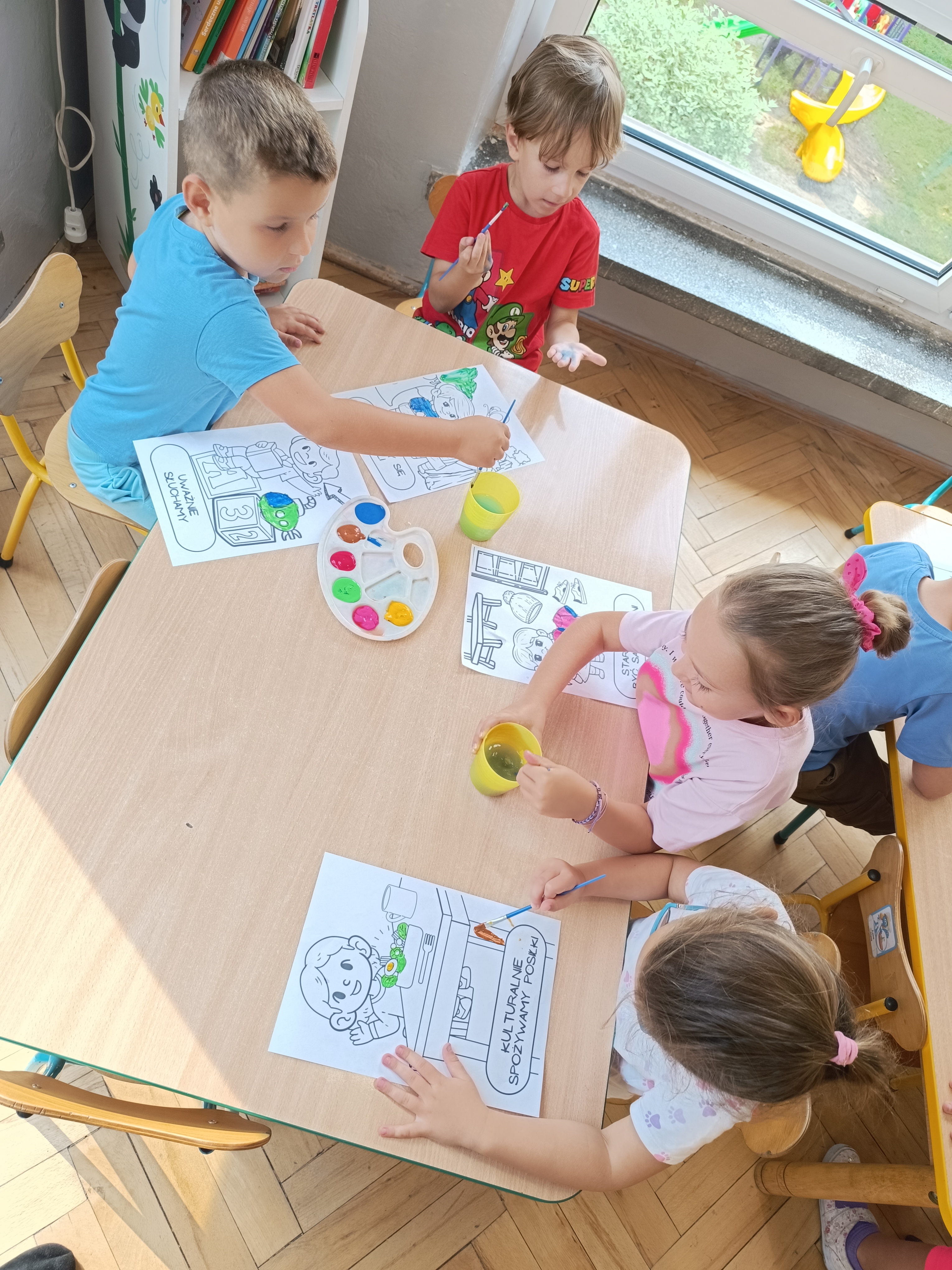 W tym tygodniu również poznawaliśmy pomieszczenia przedszkolne oraz wymienialiśmy pracowników przedszkola. Układaliśmy historyjki obrazkowe opowiadając o nich. Rozmawialiśmy o zabawkach, o czynnościach higienicznych w łazience, jak poprawnie myć ręce, zrobiliśmy doświadczenie z pieprzem i płynem do naczyń, pokazując jak oddziałuje mycie rączek mydłem na bakterie które mamy na sobie po zabawie np. na placu zabaw. Rozpoznawaliśmy dźwięki suszenia włosów, spuszczania wody, mycia rąk, pralki, mycia zębów puszczonych z radia. Oglądaliśmy film edukacyjny o czynnościach higienicznych w łazience.