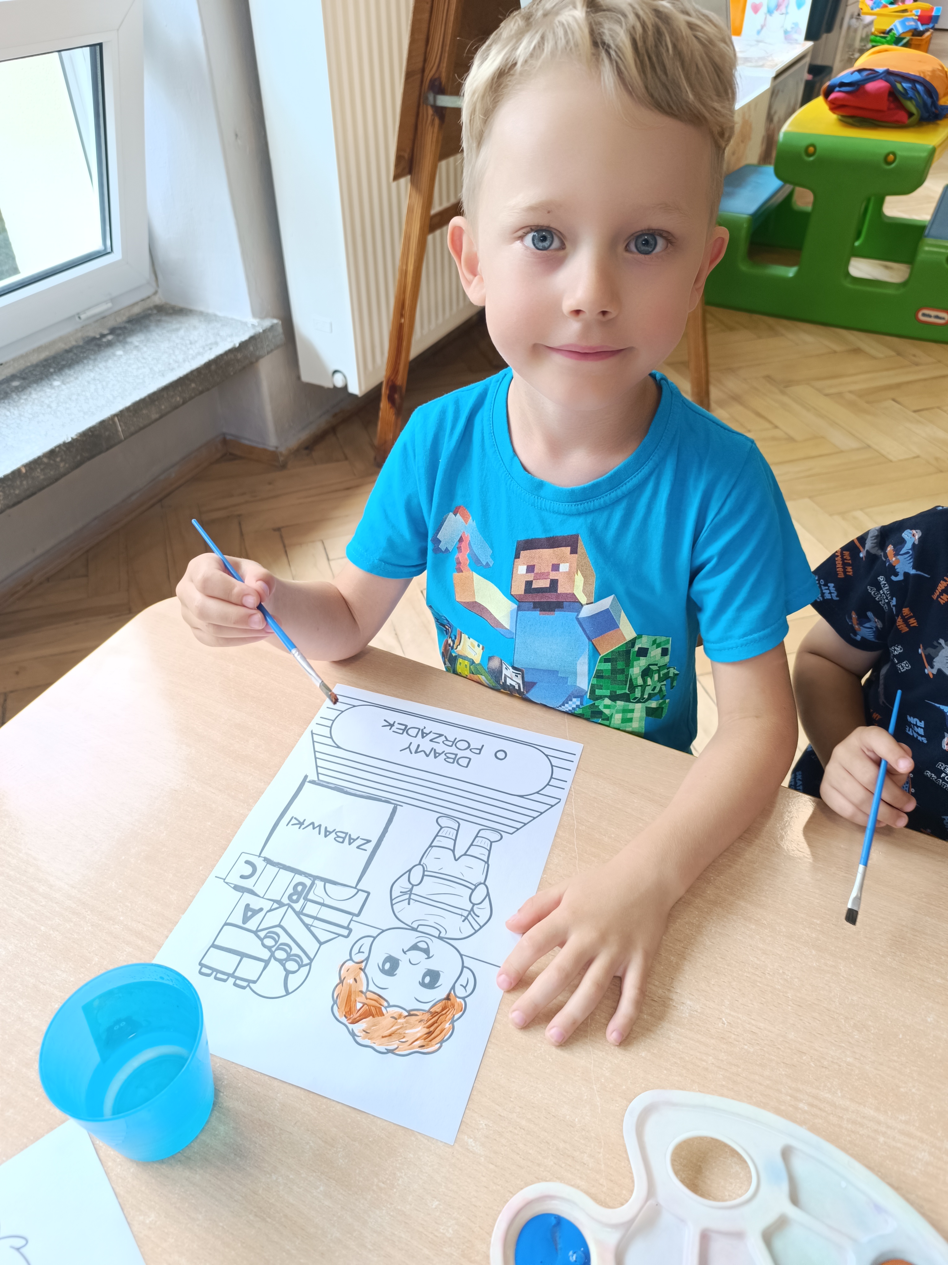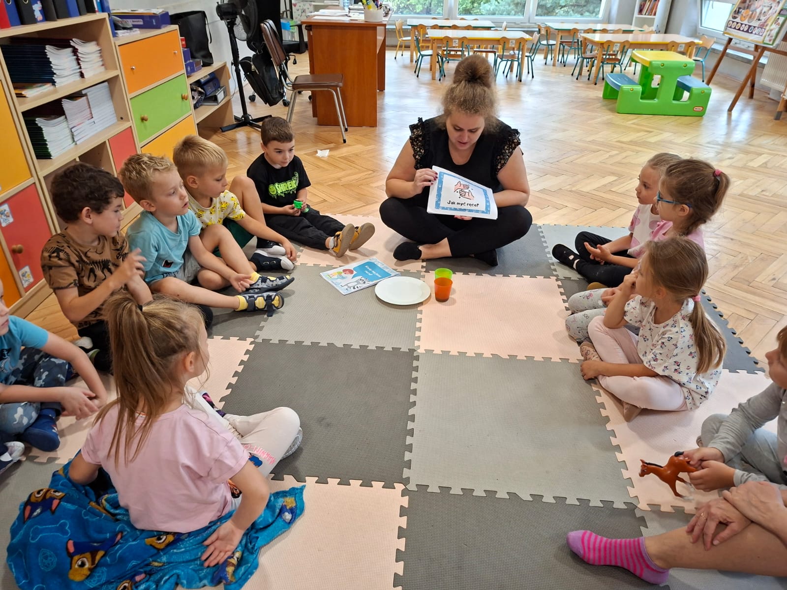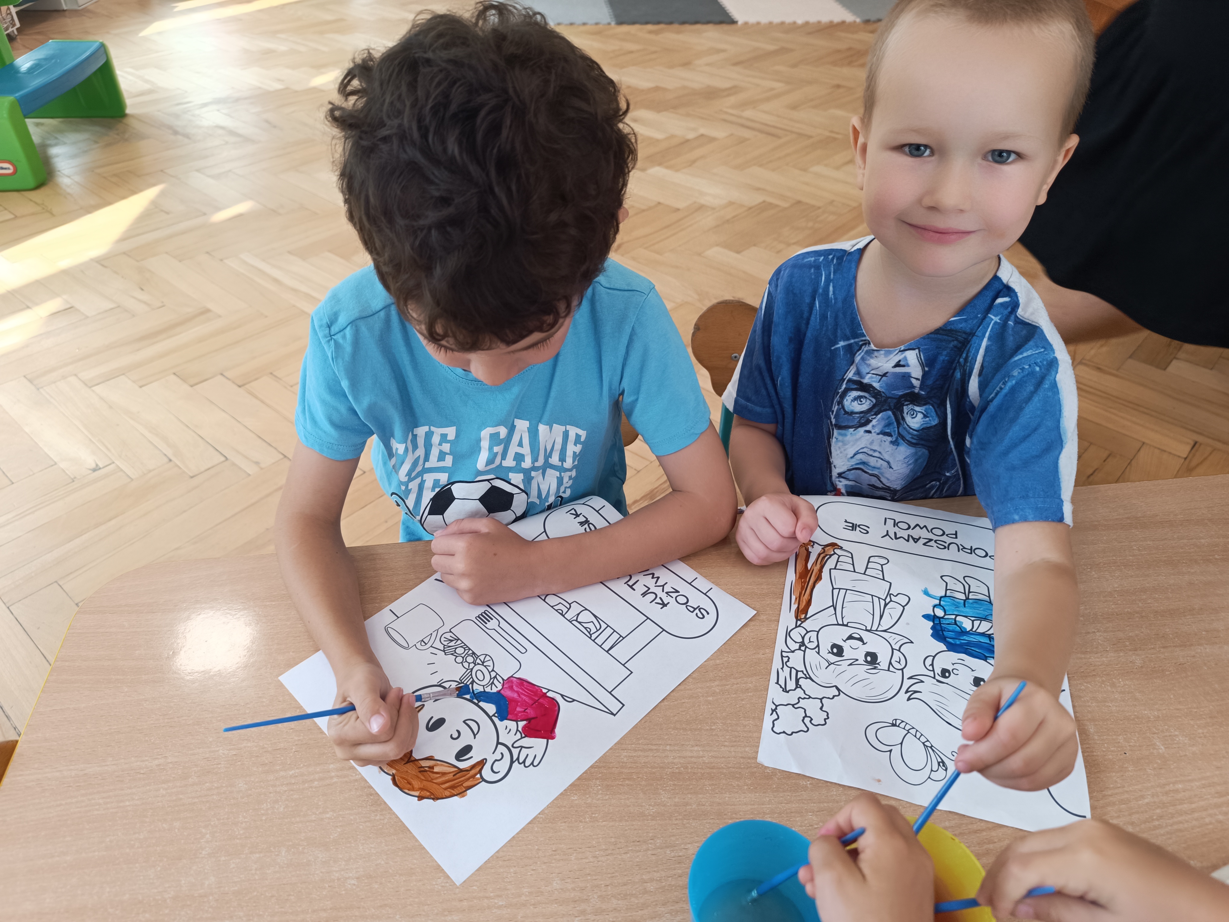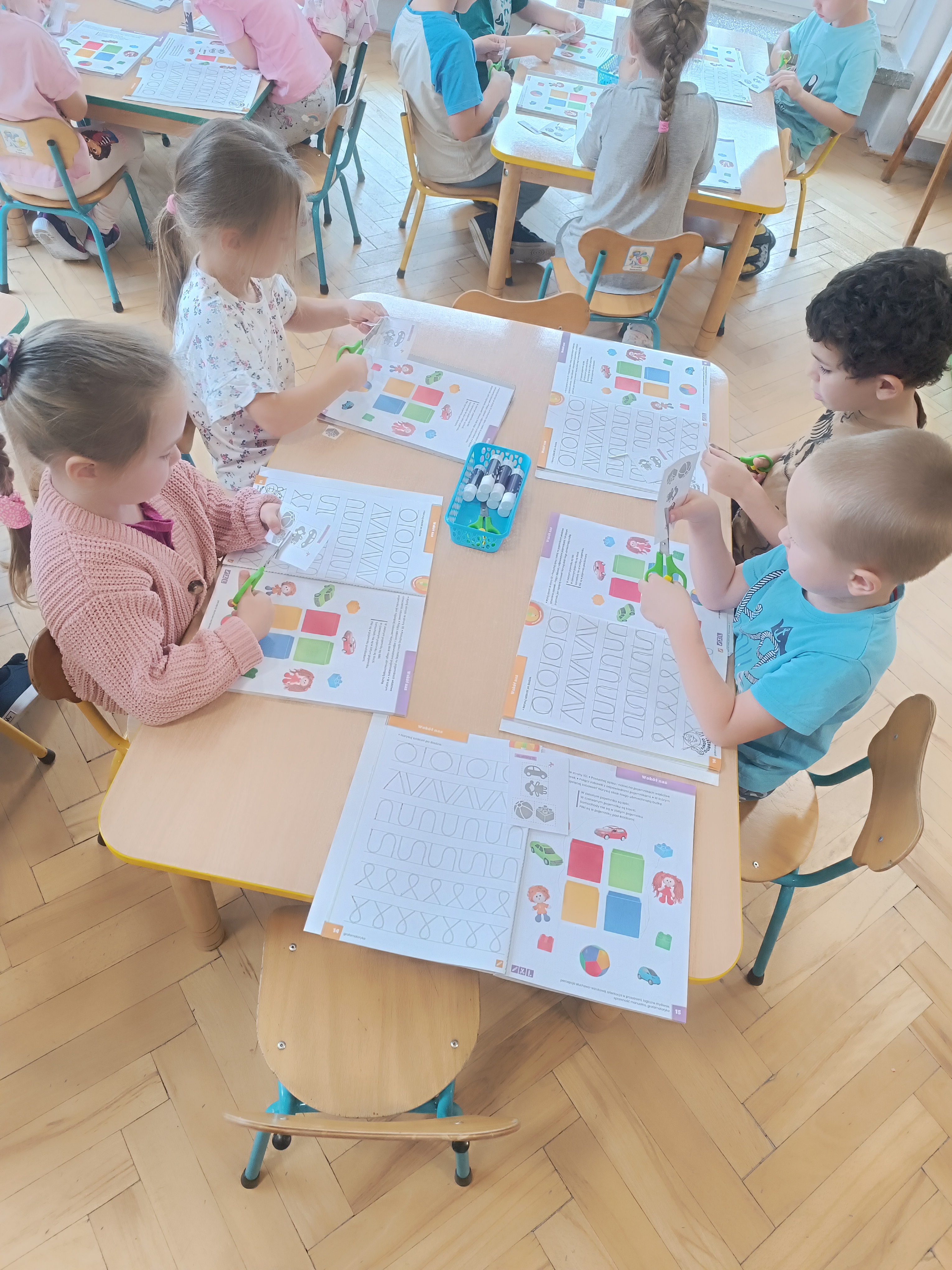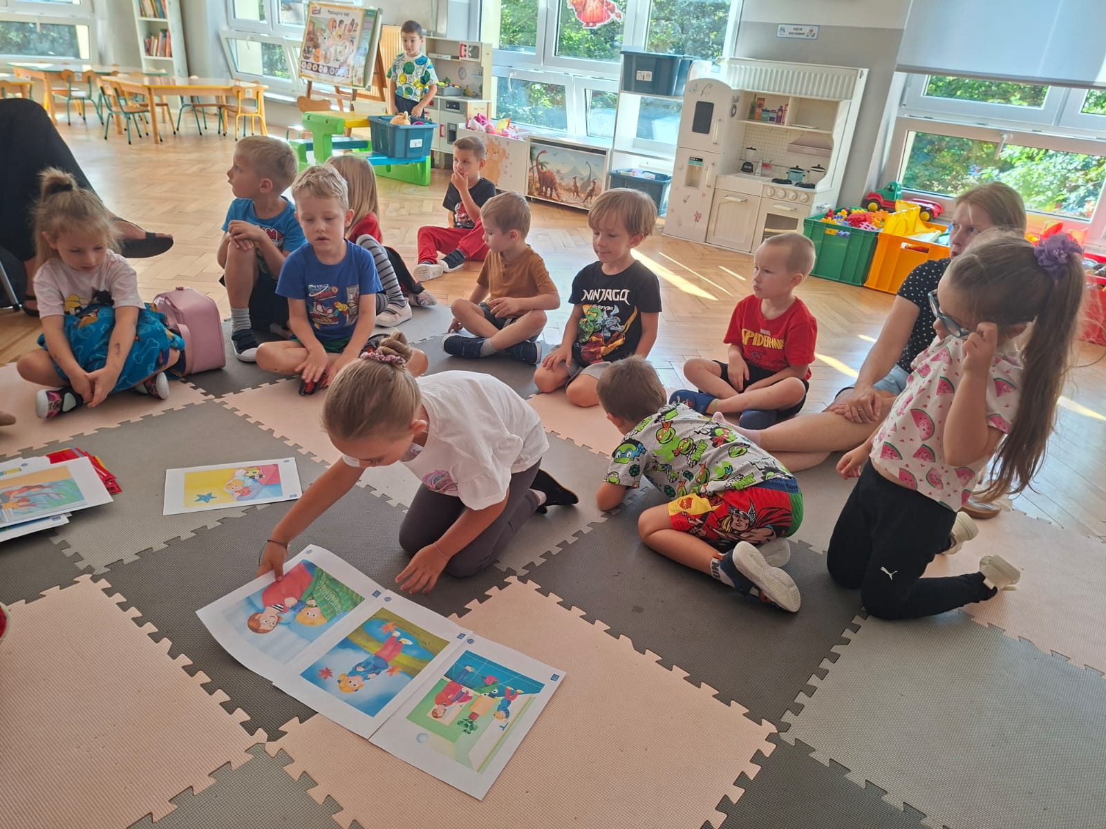 W tym tygodniu również poznawaliśmy pomieszczenia przedszkolne oraz wymienialiśmy pracowników przedszkola. Układaliśmy historyjki obrazkowe opowiadając o nich. Rozmawialiśmy o zabawkach, o czynnościach higienicznych w łazience, jak poprawnie myć ręce, zrobiliśmy doświadczenie z pieprzem i płynem do naczyń, pokazując jak oddziałuje mycie rączek mydłem na bakterie które mamy na sobie po zabawie np. na placu zabaw. Rozpoznawaliśmy dźwięki suszenia włosów, spuszczania wody, mycia rąk, pralki, mycia zębów puszczonych z radia. Oglądaliśmy film edukacyjny o czynnościach higienicznych w łazience.