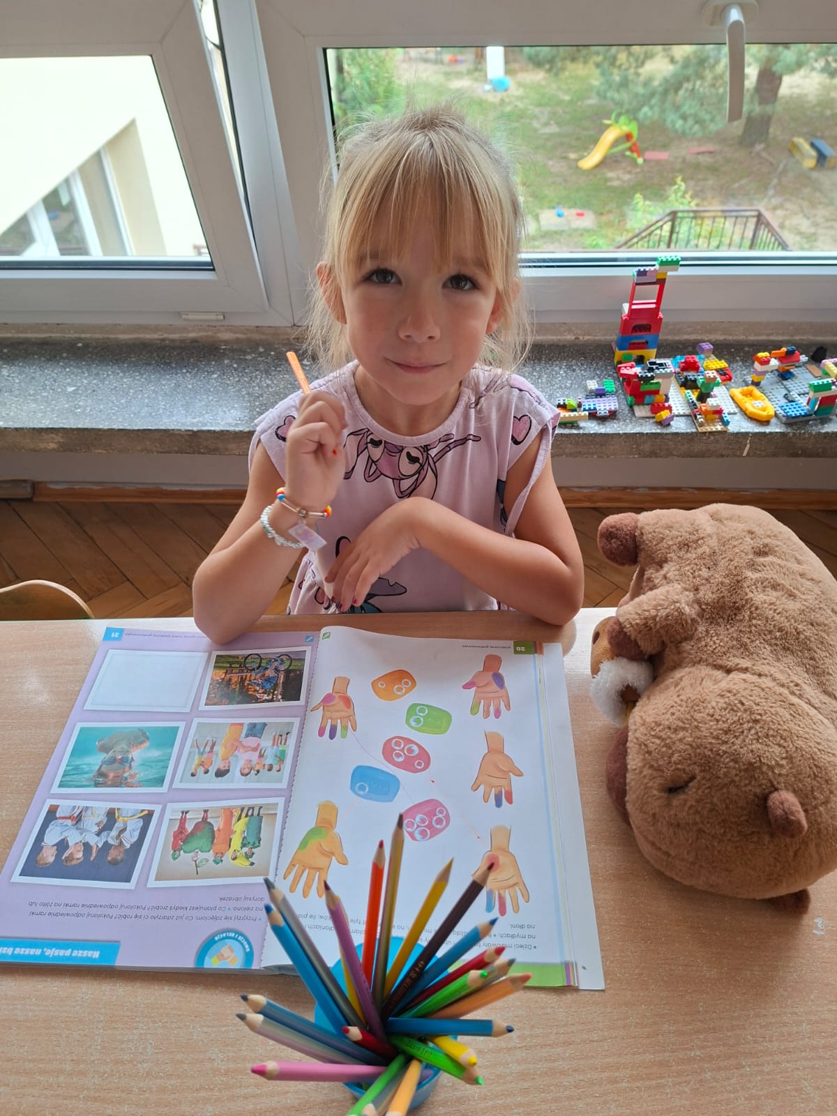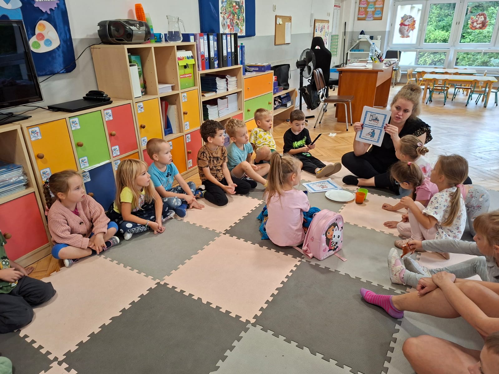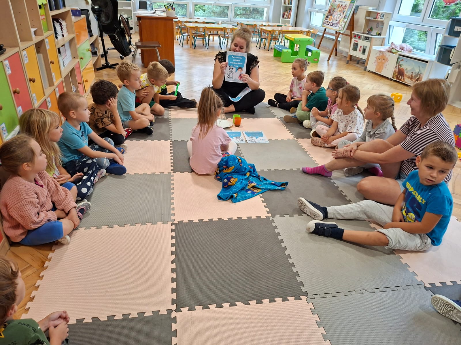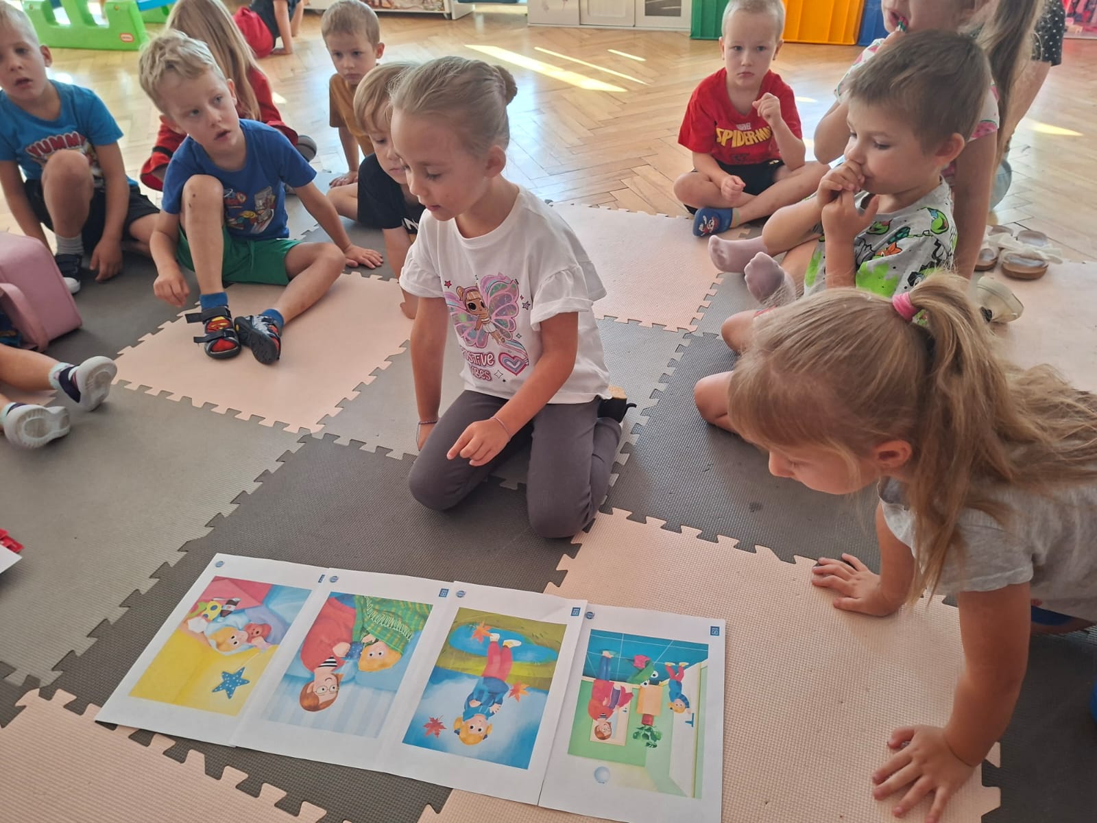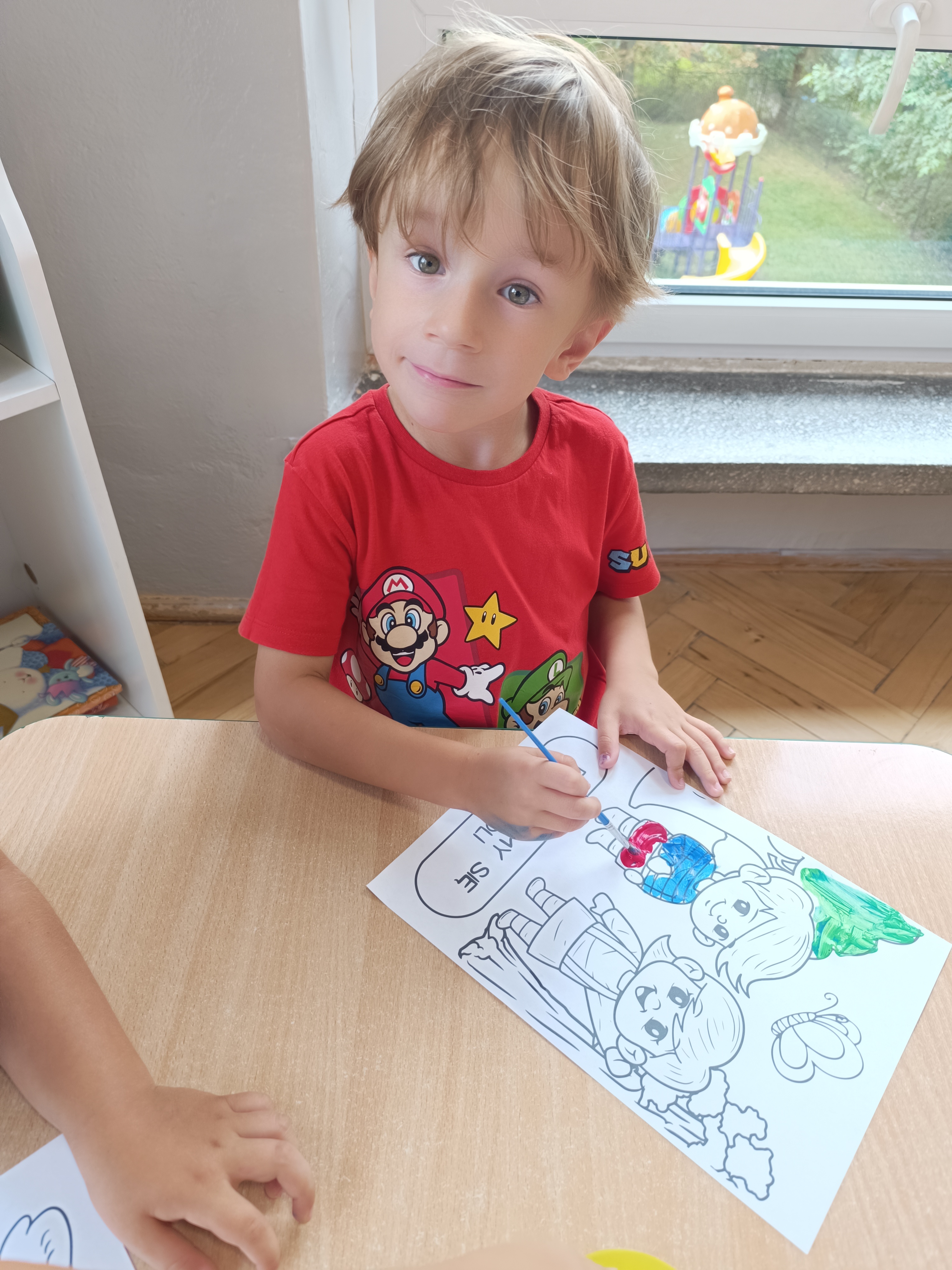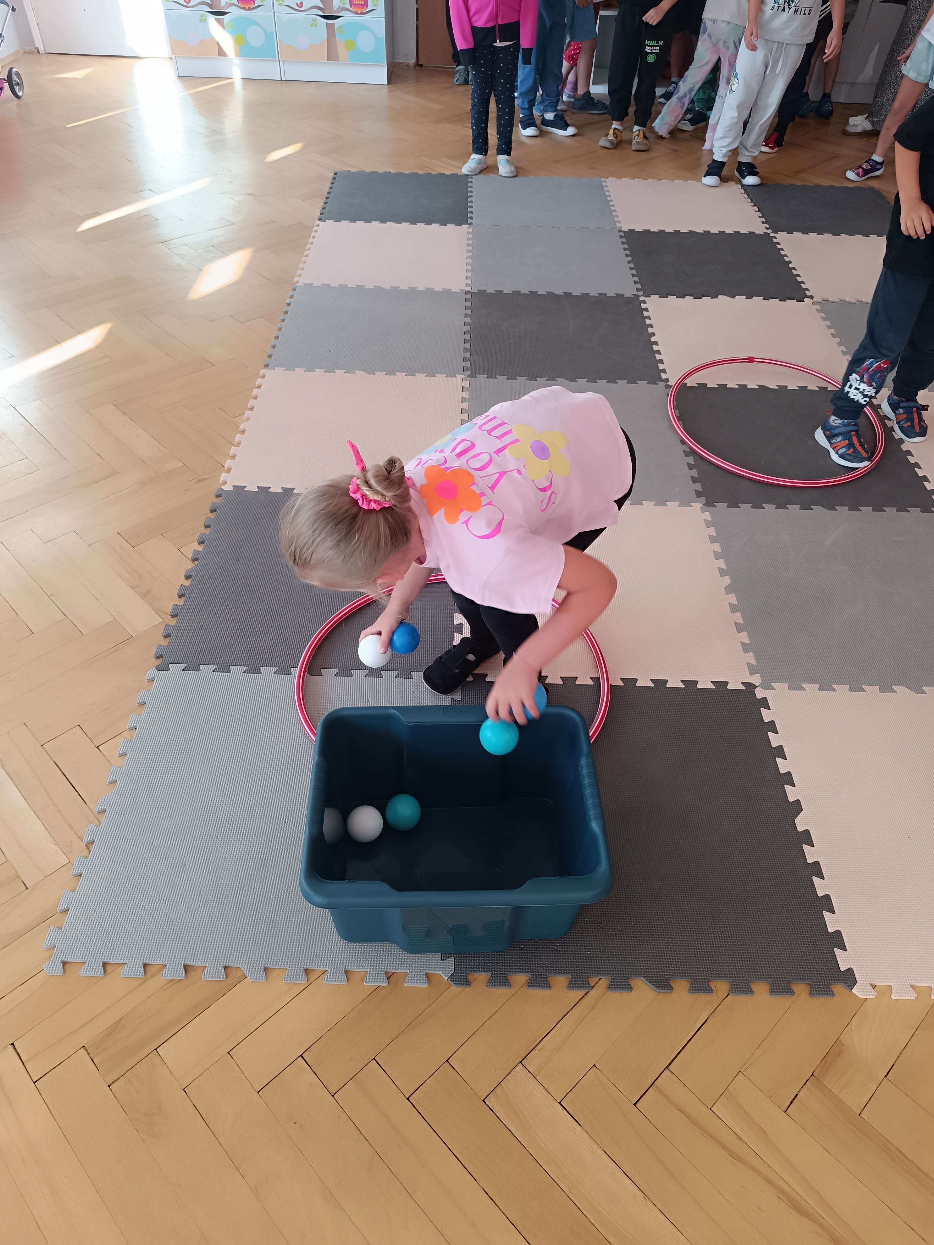 W tym tygodniu również poznawaliśmy pomieszczenia przedszkolne oraz wymienialiśmy pracowników przedszkola. Układaliśmy historyjki obrazkowe opowiadając o nich. Rozmawialiśmy o zabawkach, o czynnościach higienicznych w łazience, jak poprawnie myć ręce, zrobiliśmy doświadczenie z pieprzem i płynem do naczyń, pokazując jak oddziałuje mycie rączek mydłem na bakterie które mamy na sobie po zabawie np. na placu zabaw. Rozpoznawaliśmy dźwięki suszenia włosów, spuszczania wody, mycia rąk, pralki, mycia zębów puszczonych z radia. Oglądaliśmy film edukacyjny o czynnościach higienicznych w łazience.
