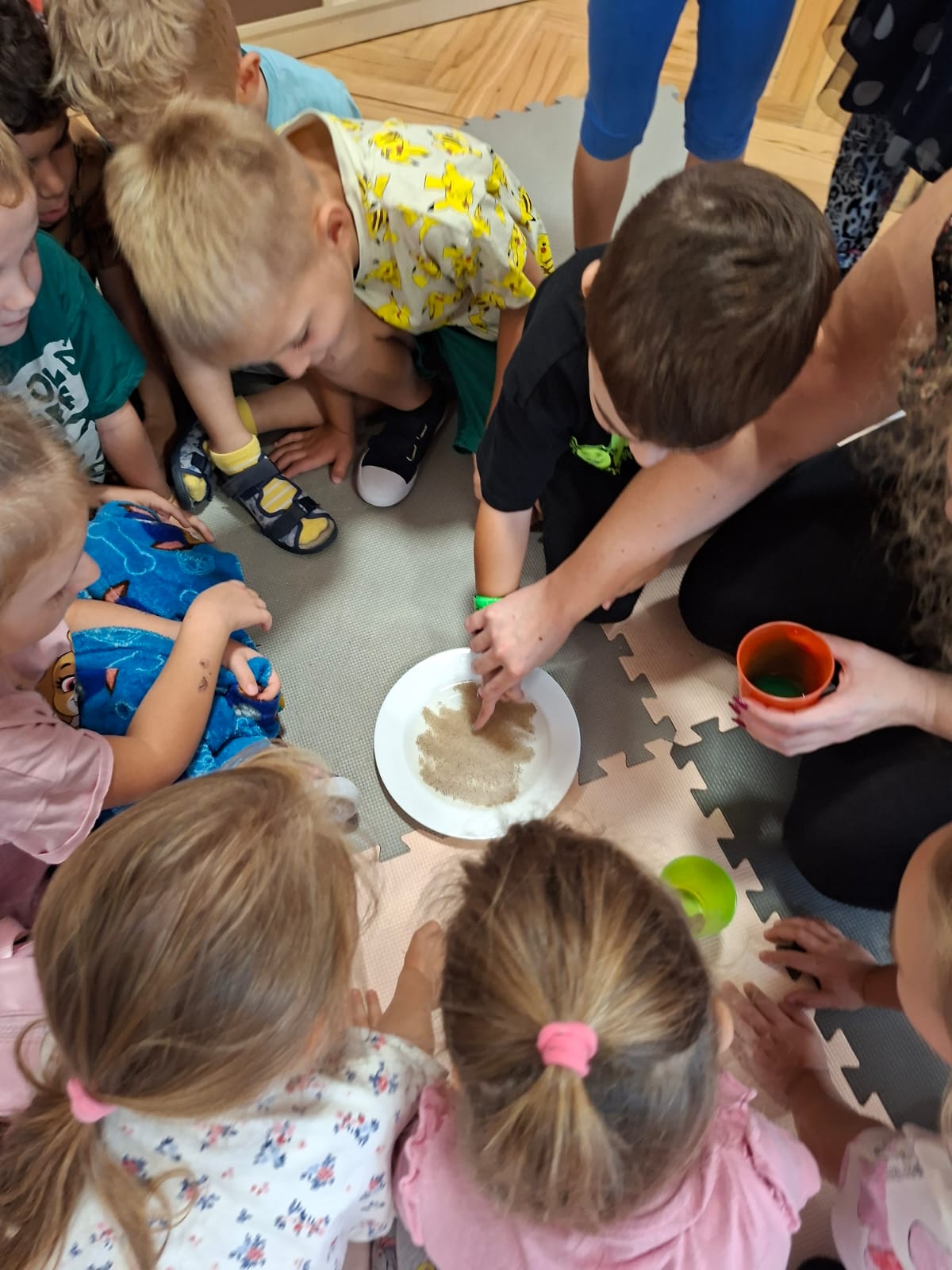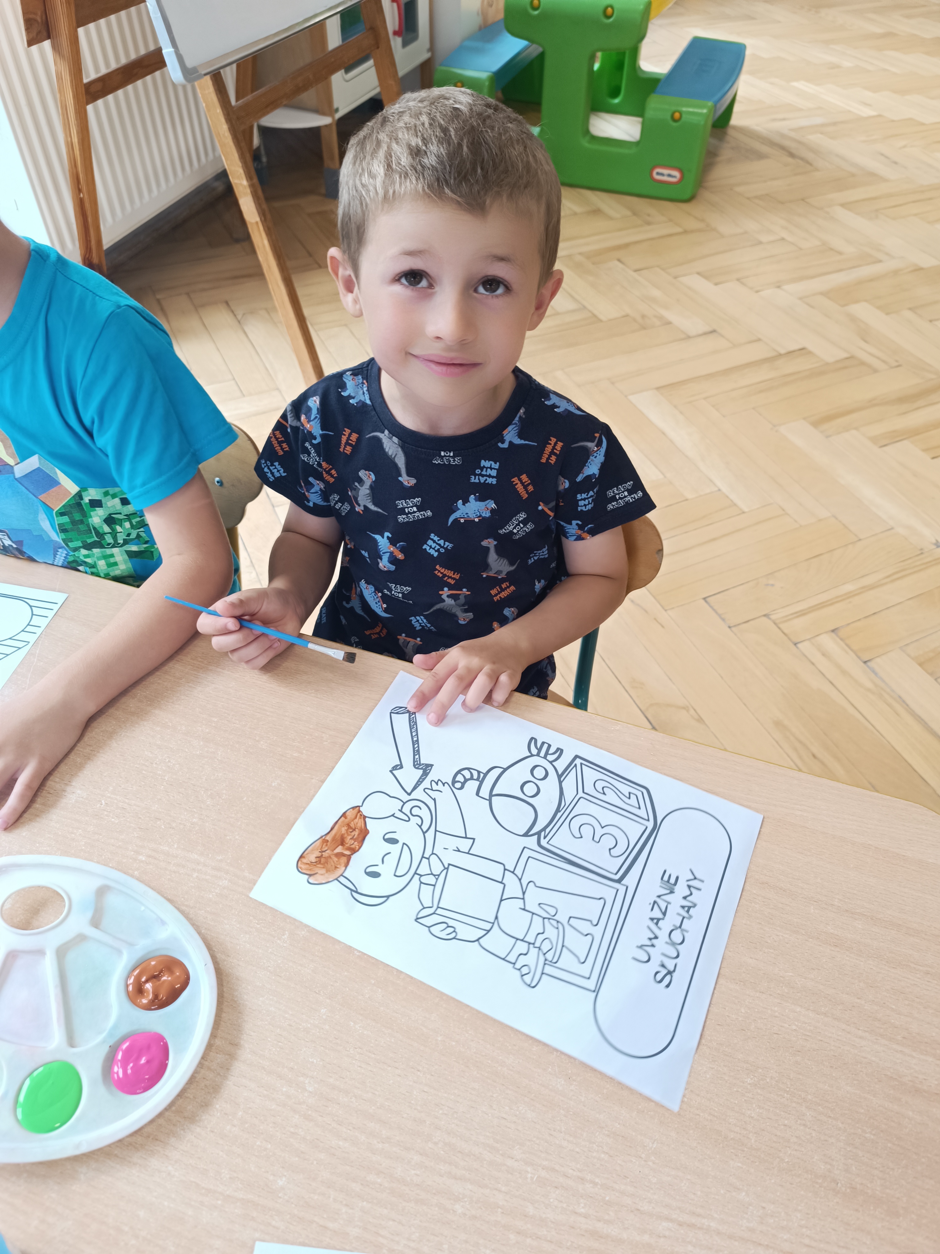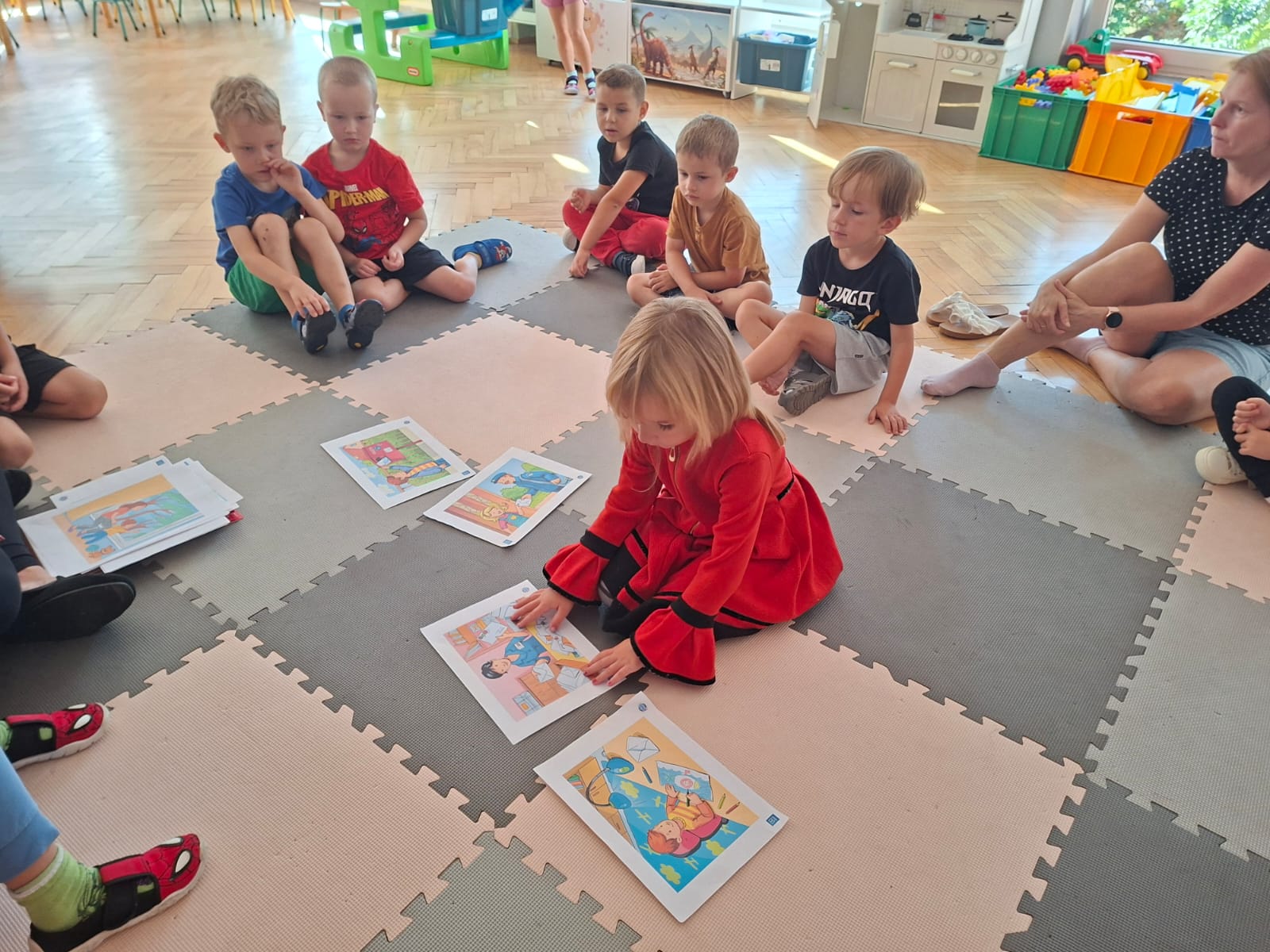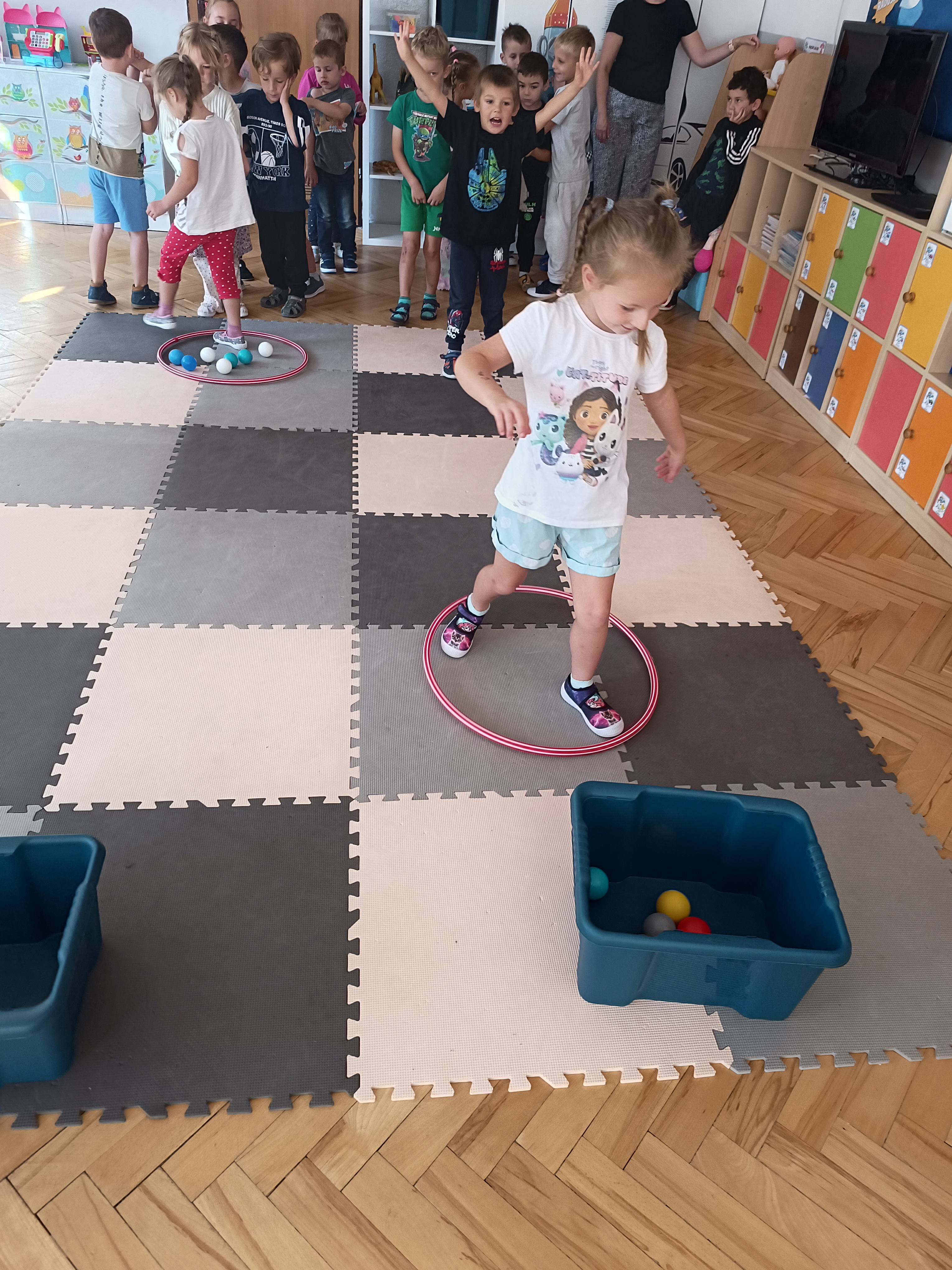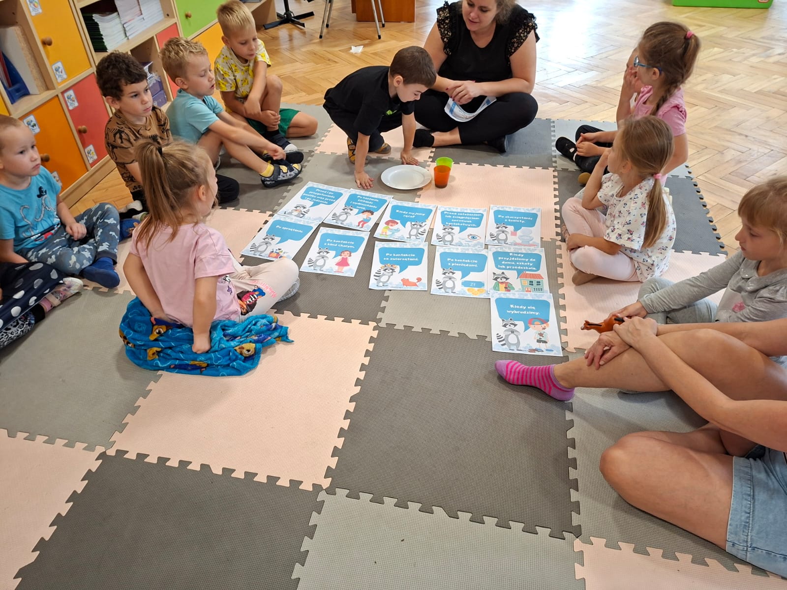 W tym tygodniu również poznawaliśmy pomieszczenia przedszkolne oraz wymienialiśmy pracowników przedszkola. Układaliśmy historyjki obrazkowe opowiadając o nich. Rozmawialiśmy o zabawkach, o czynnościach higienicznych w łazience, jak poprawnie myć ręce, zrobiliśmy doświadczenie z pieprzem i płynem do naczyń, pokazując jak oddziałuje mycie rączek mydłem na bakterie które mamy na sobie po zabawie np. na placu zabaw. Rozpoznawaliśmy dźwięki suszenia włosów, spuszczania wody, mycia rąk, pralki, mycia zębów puszczonych z radia. Oglądaliśmy film edukacyjny o czynnościach higienicznych w łazience.