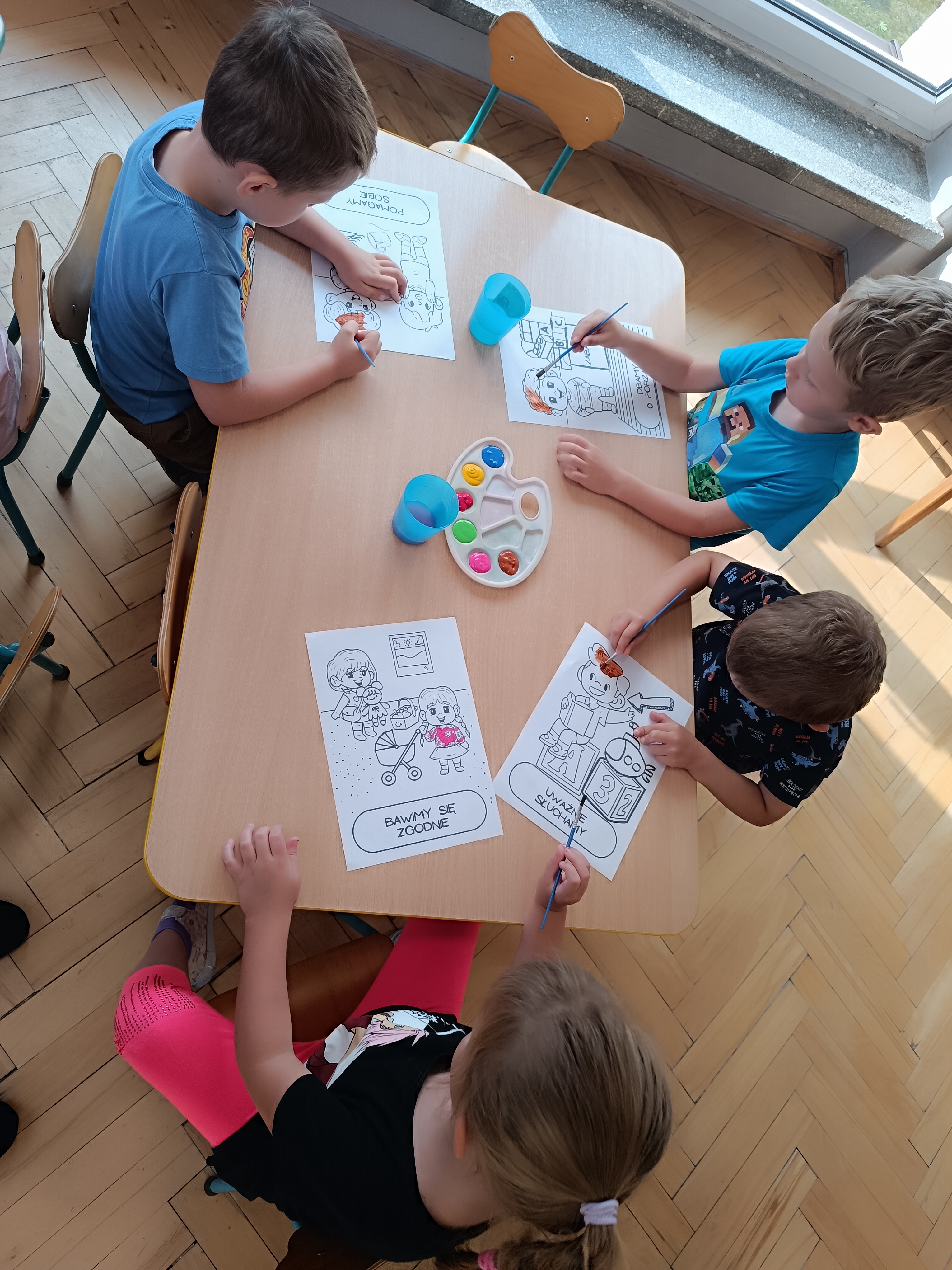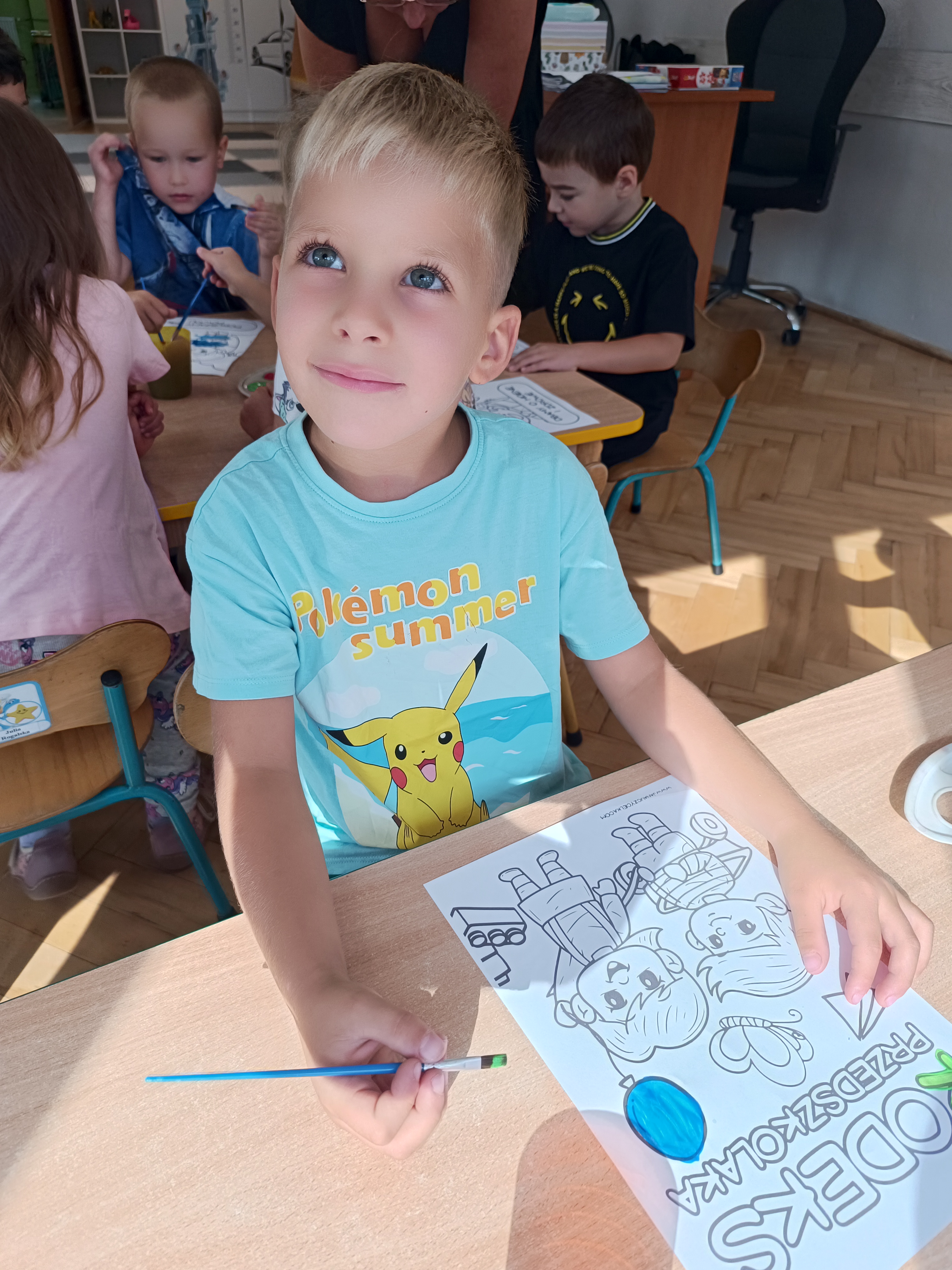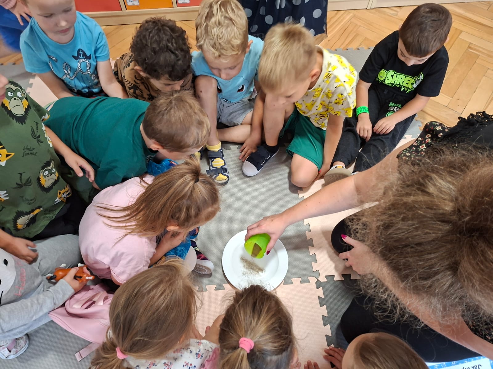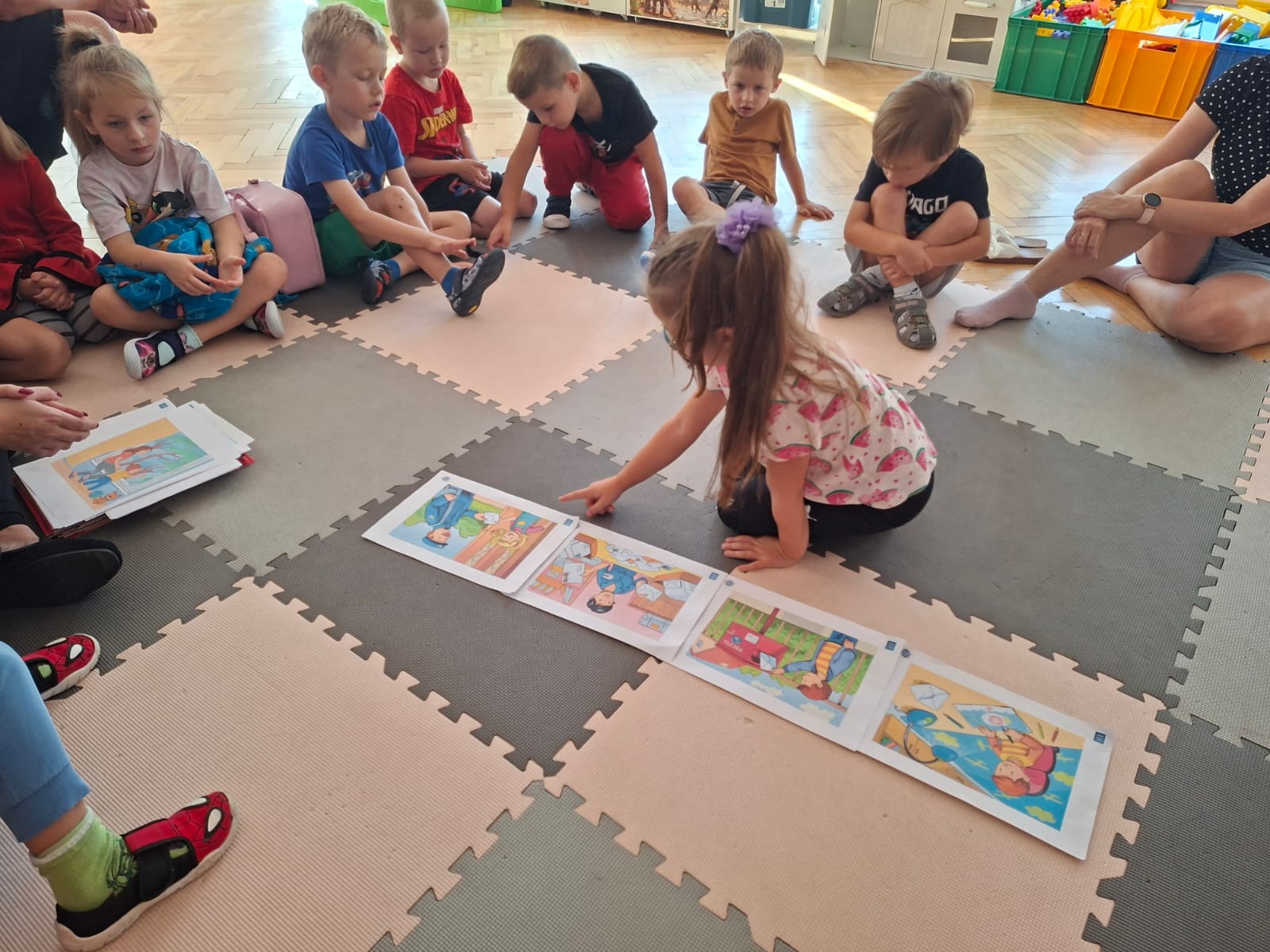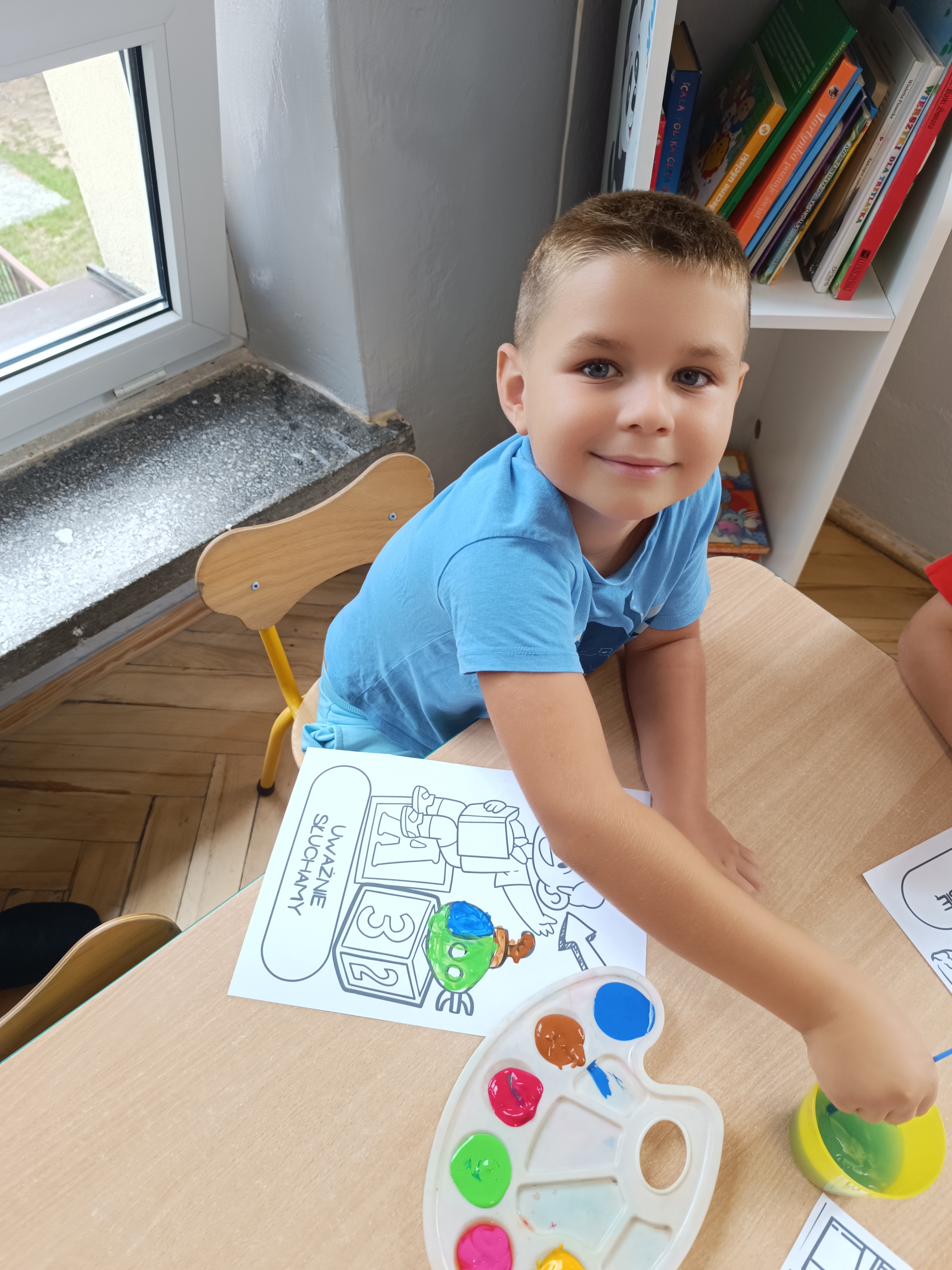 W tym tygodniu również poznawaliśmy pomieszczenia przedszkolne oraz wymienialiśmy pracowników przedszkola. Układaliśmy historyjki obrazkowe opowiadając o nich. Rozmawialiśmy o zabawkach, o czynnościach higienicznych w łazience, jak poprawnie myć ręce, zrobiliśmy doświadczenie z pieprzem i płynem do naczyń, pokazując jak oddziałuje mycie rączek mydłem na bakterie które mamy na sobie po zabawie np. na placu zabaw. Rozpoznawaliśmy dźwięki suszenia włosów, spuszczania wody, mycia rąk, pralki, mycia zębów puszczonych z radia. Oglądaliśmy film edukacyjny o czynnościach higienicznych w łazience.