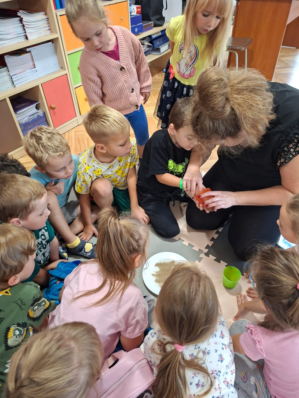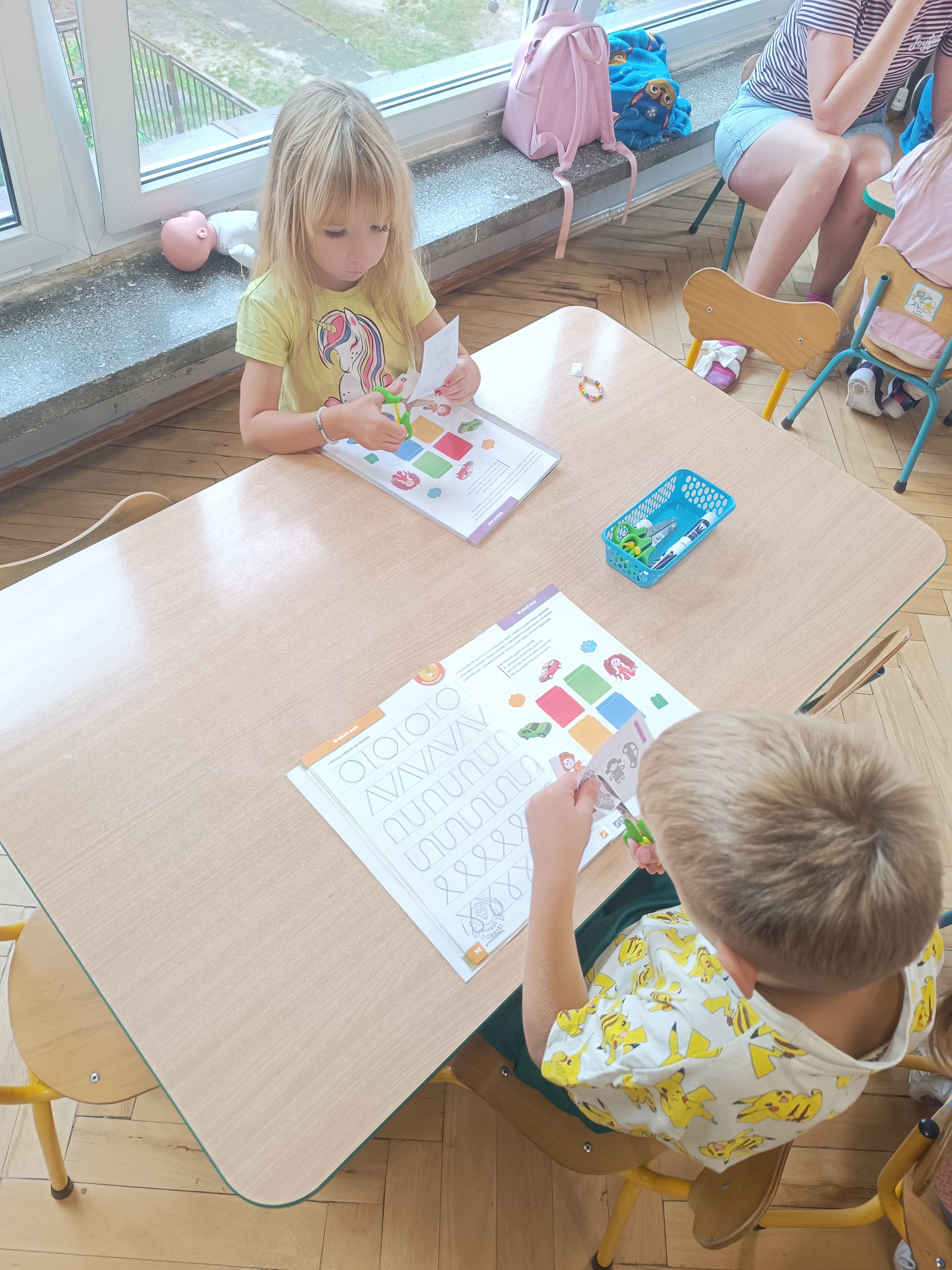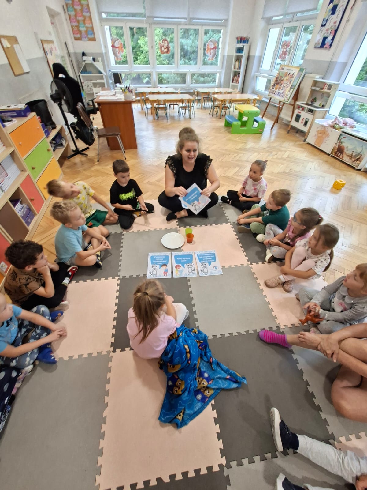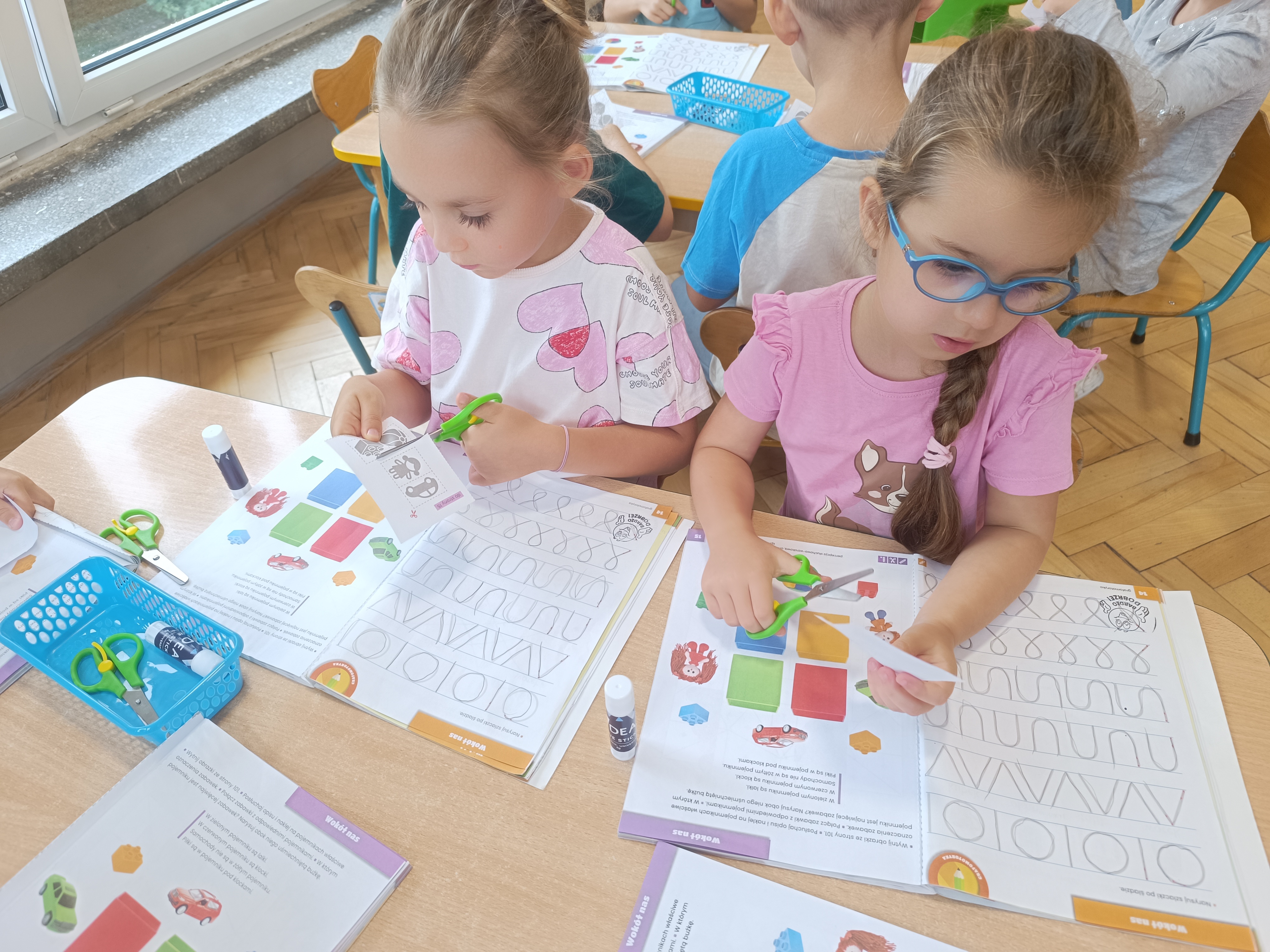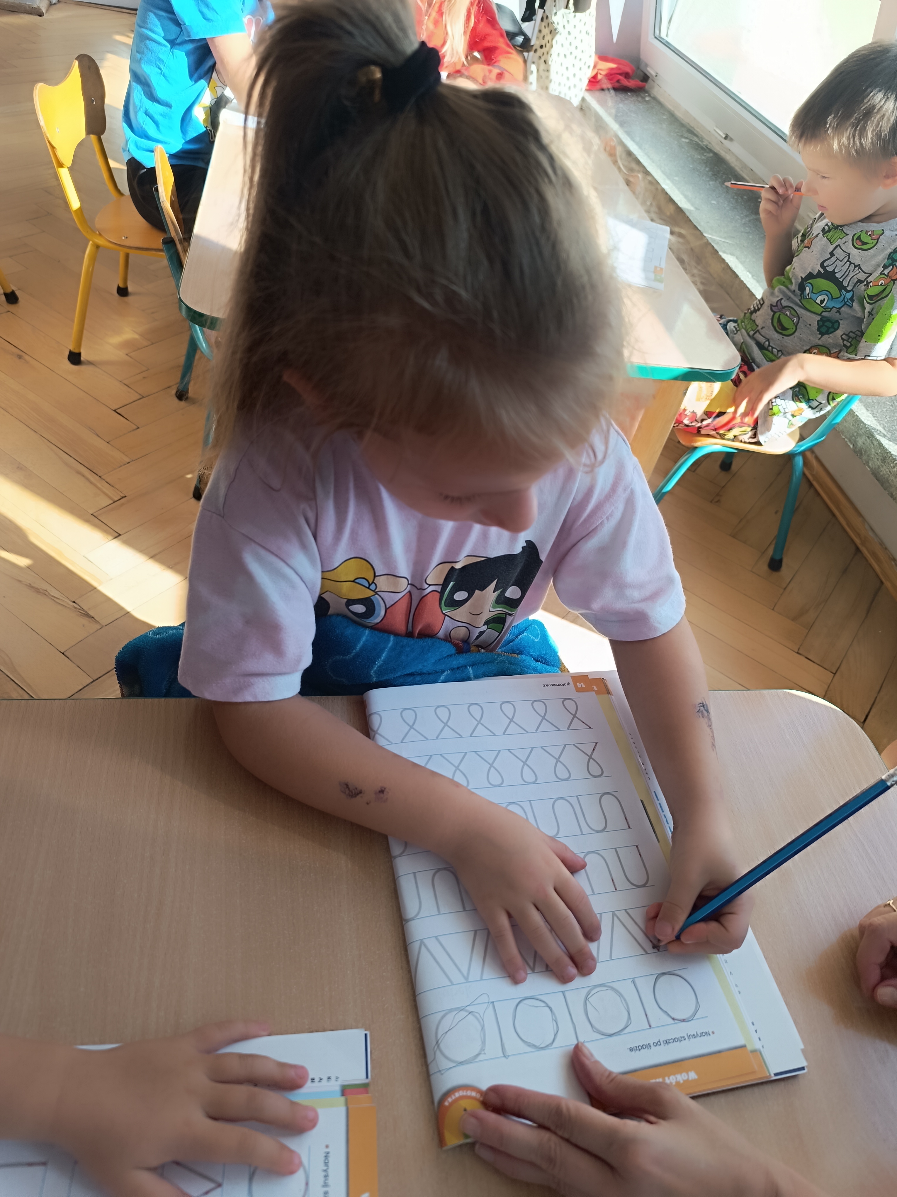 W tym tygodniu również poznawaliśmy pomieszczenia przedszkolne oraz wymienialiśmy pracowników przedszkola. Układaliśmy historyjki obrazkowe opowiadając o nich. Rozmawialiśmy o zabawkach, o czynnościach higienicznych w łazience, jak poprawnie myć ręce, zrobiliśmy doświadczenie z pieprzem i płynem do naczyń, pokazując jak oddziałuje mycie rączek mydłem na bakterie które mamy na sobie po zabawie np. na placu zabaw. Rozpoznawaliśmy dźwięki suszenia włosów, spuszczania wody, mycia rąk, pralki, mycia zębów puszczonych z radia. Oglądaliśmy film edukacyjny o czynnościach higienicznych w łazience.