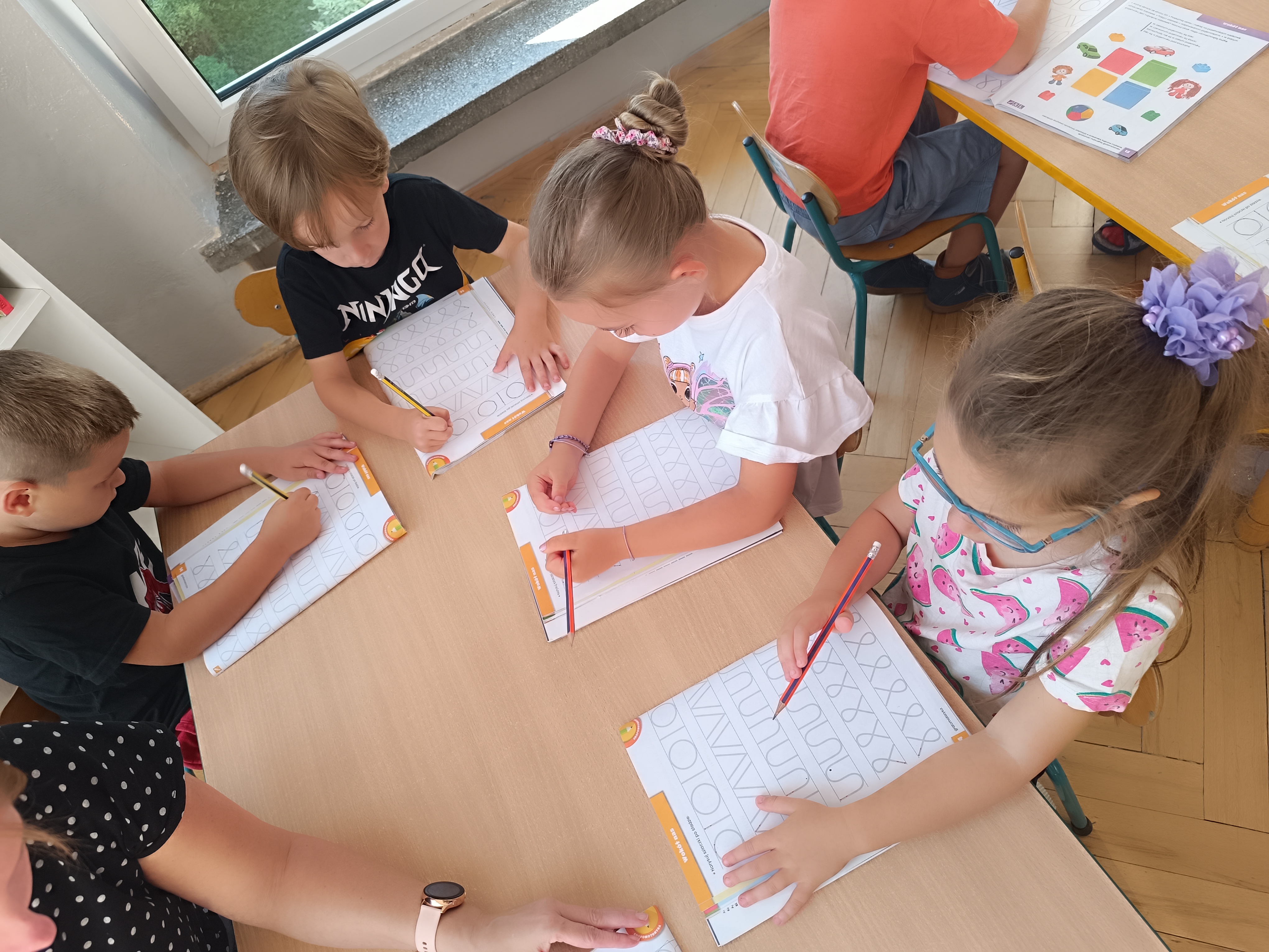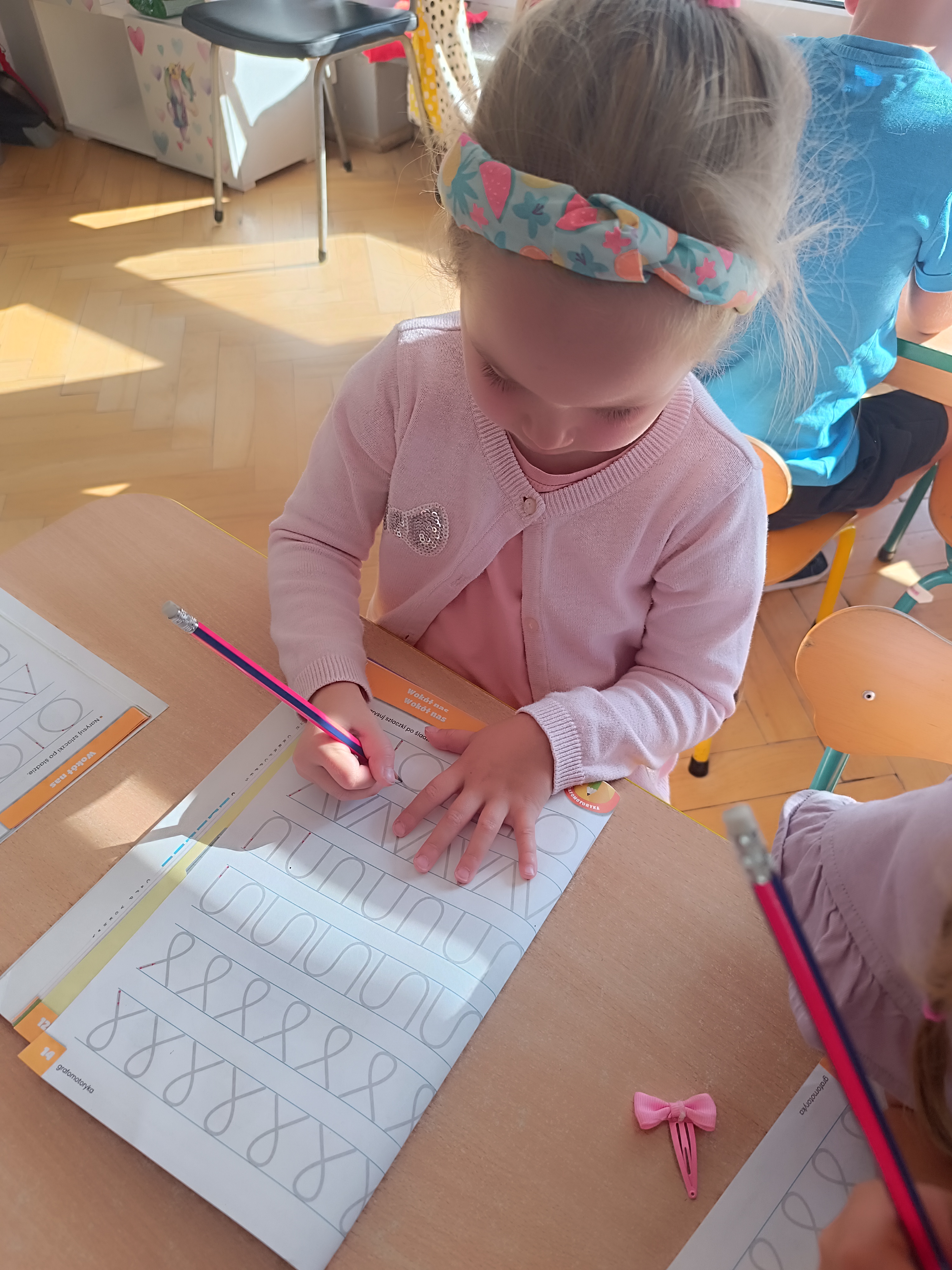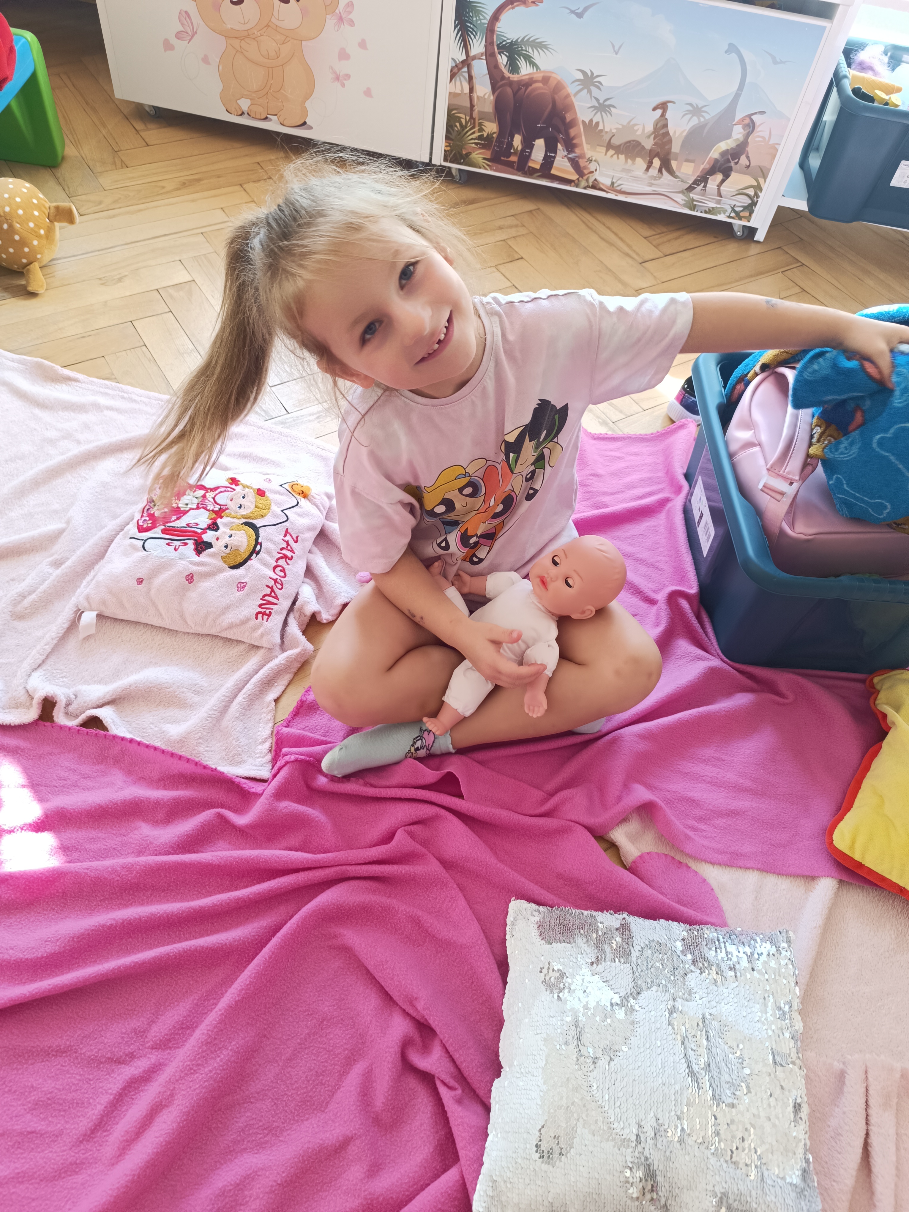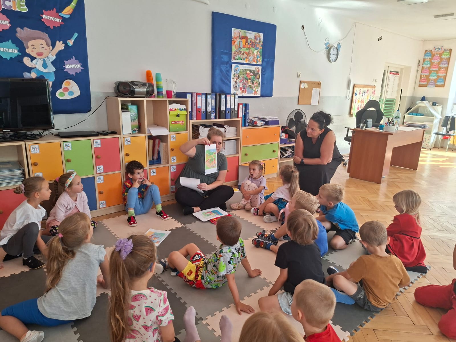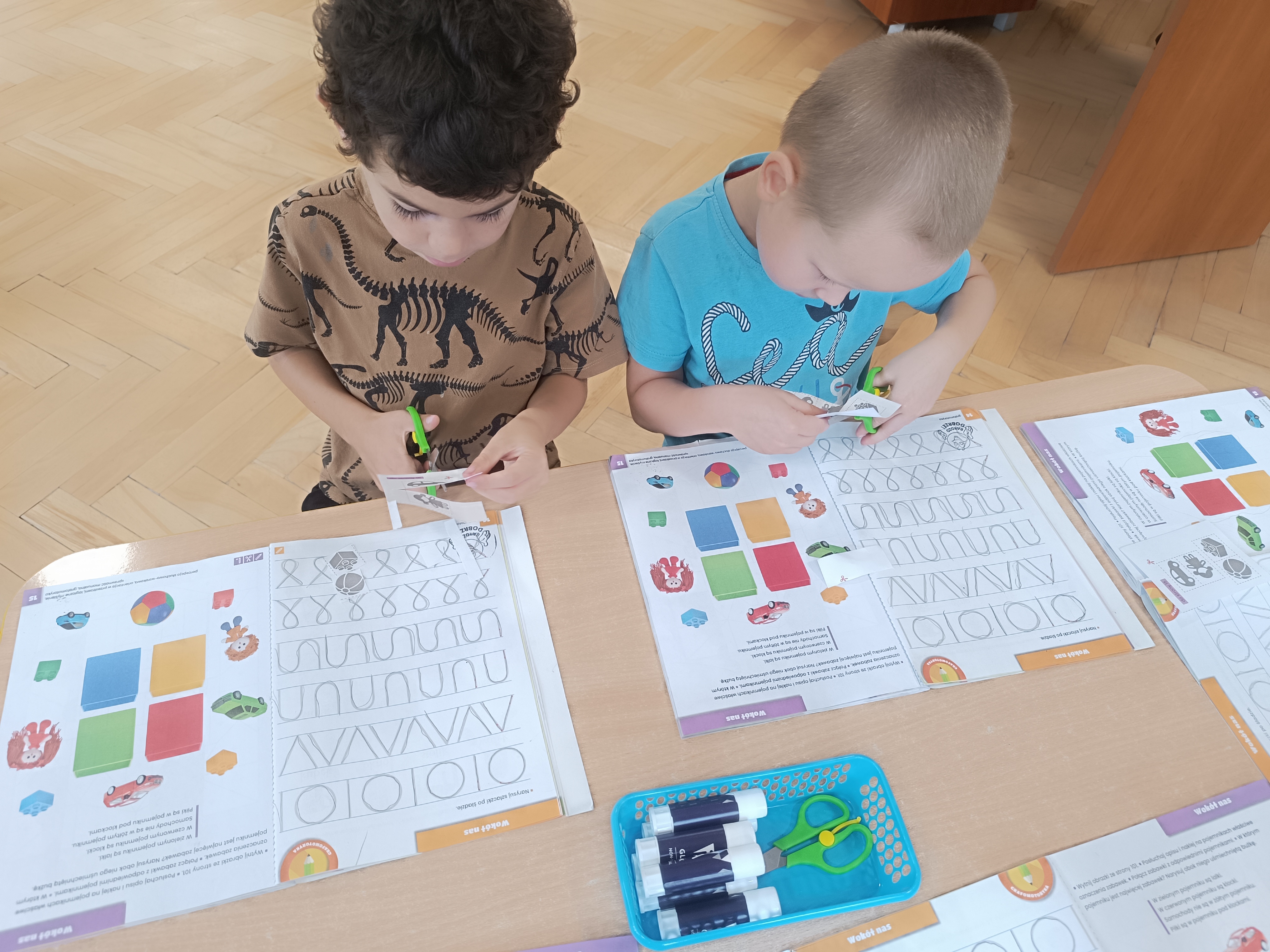 W tym tygodniu również poznawaliśmy pomieszczenia przedszkolne oraz wymienialiśmy pracowników przedszkola. Układaliśmy historyjki obrazkowe opowiadając o nich. Rozmawialiśmy o zabawkach, o czynnościach higienicznych w łazience, jak poprawnie myć ręce, zrobiliśmy doświadczenie z pieprzem i płynem do naczyń, pokazując jak oddziałuje mycie rączek mydłem na bakterie które mamy na sobie po zabawie np. na placu zabaw. Rozpoznawaliśmy dźwięki suszenia włosów, spuszczania wody, mycia rąk, pralki, mycia zębów puszczonych z radia. Oglądaliśmy film edukacyjny o czynnościach higienicznych w łazience.