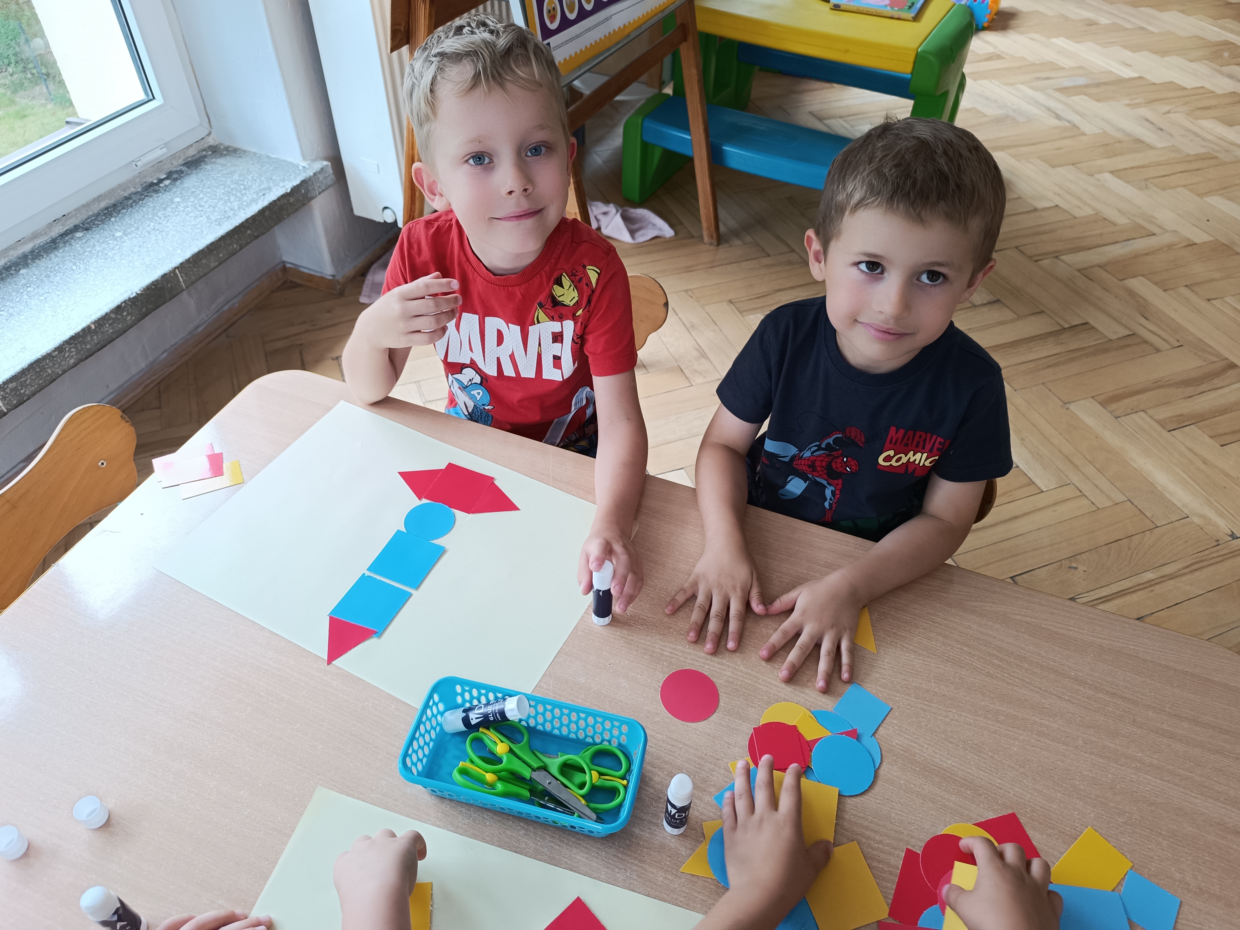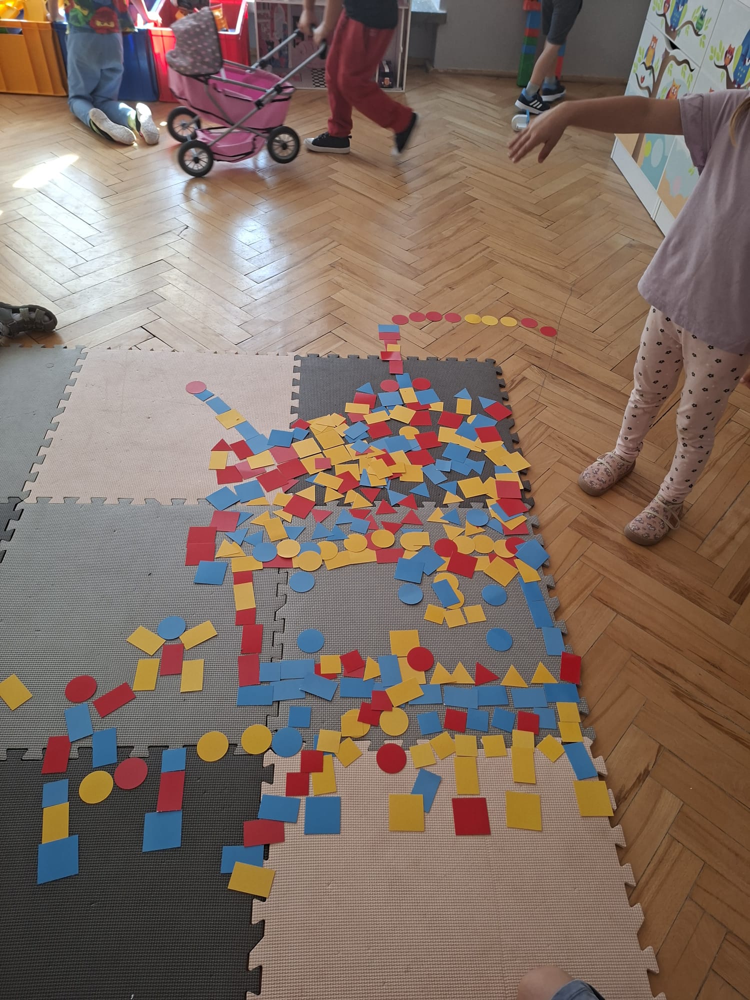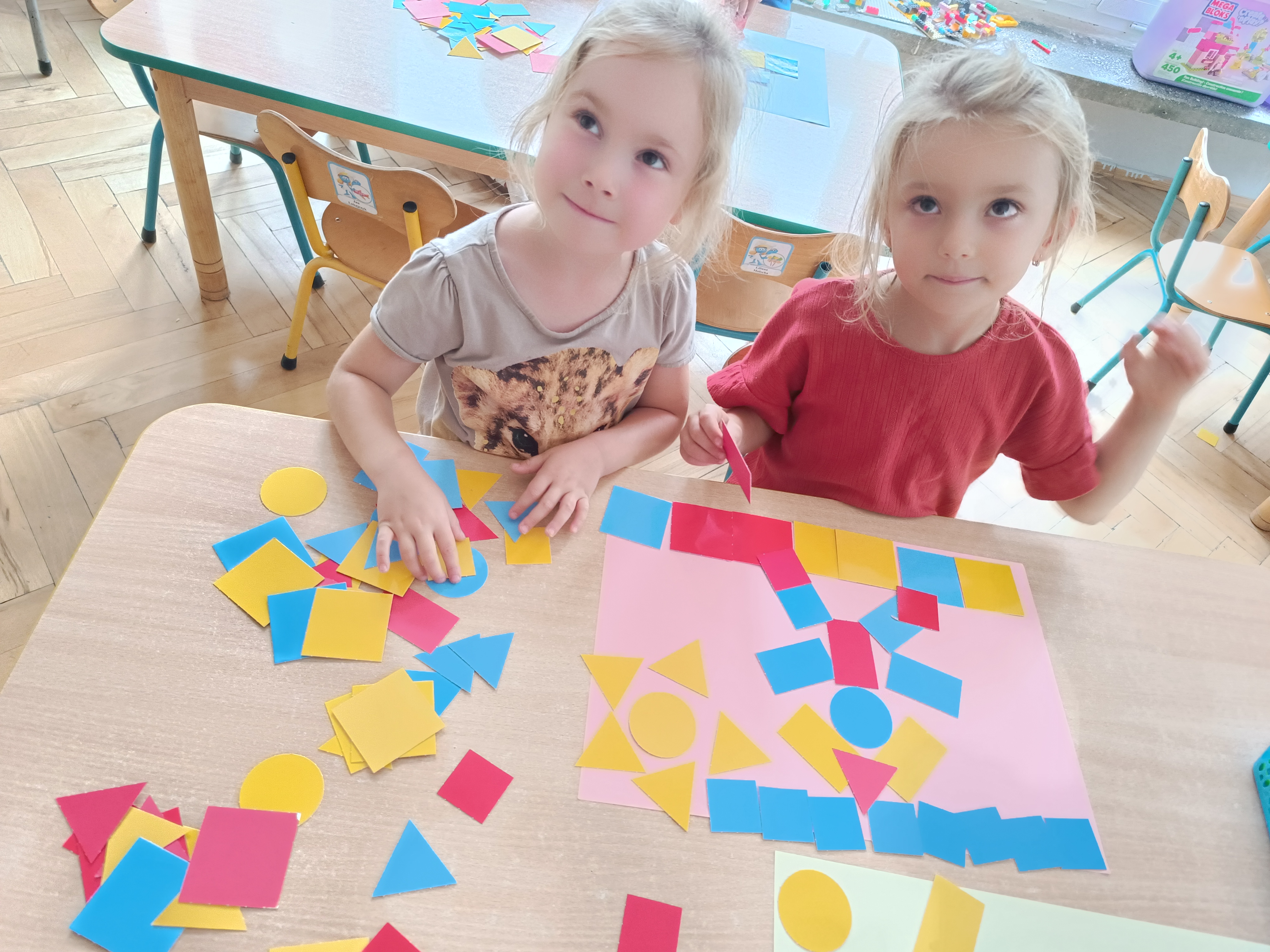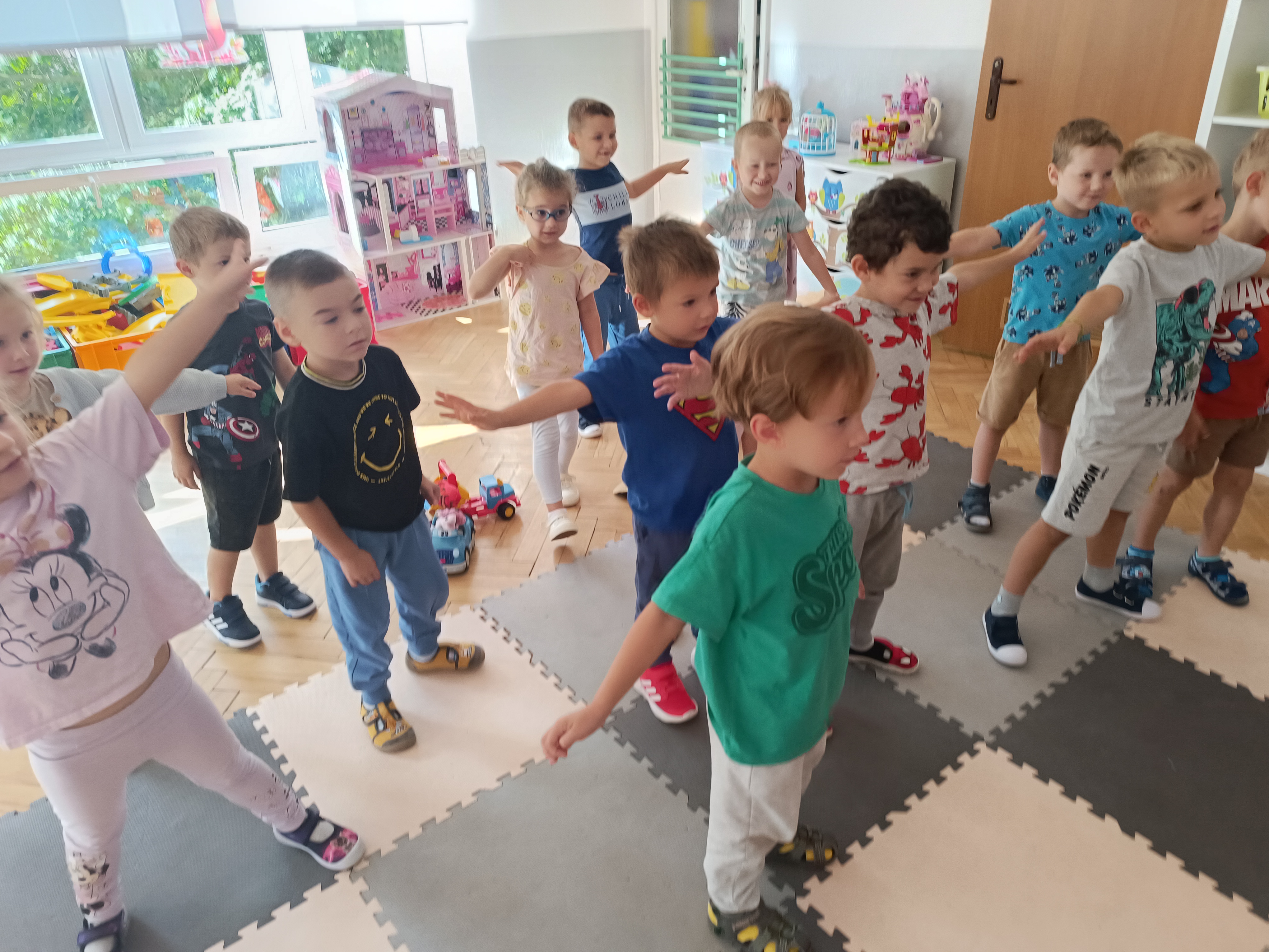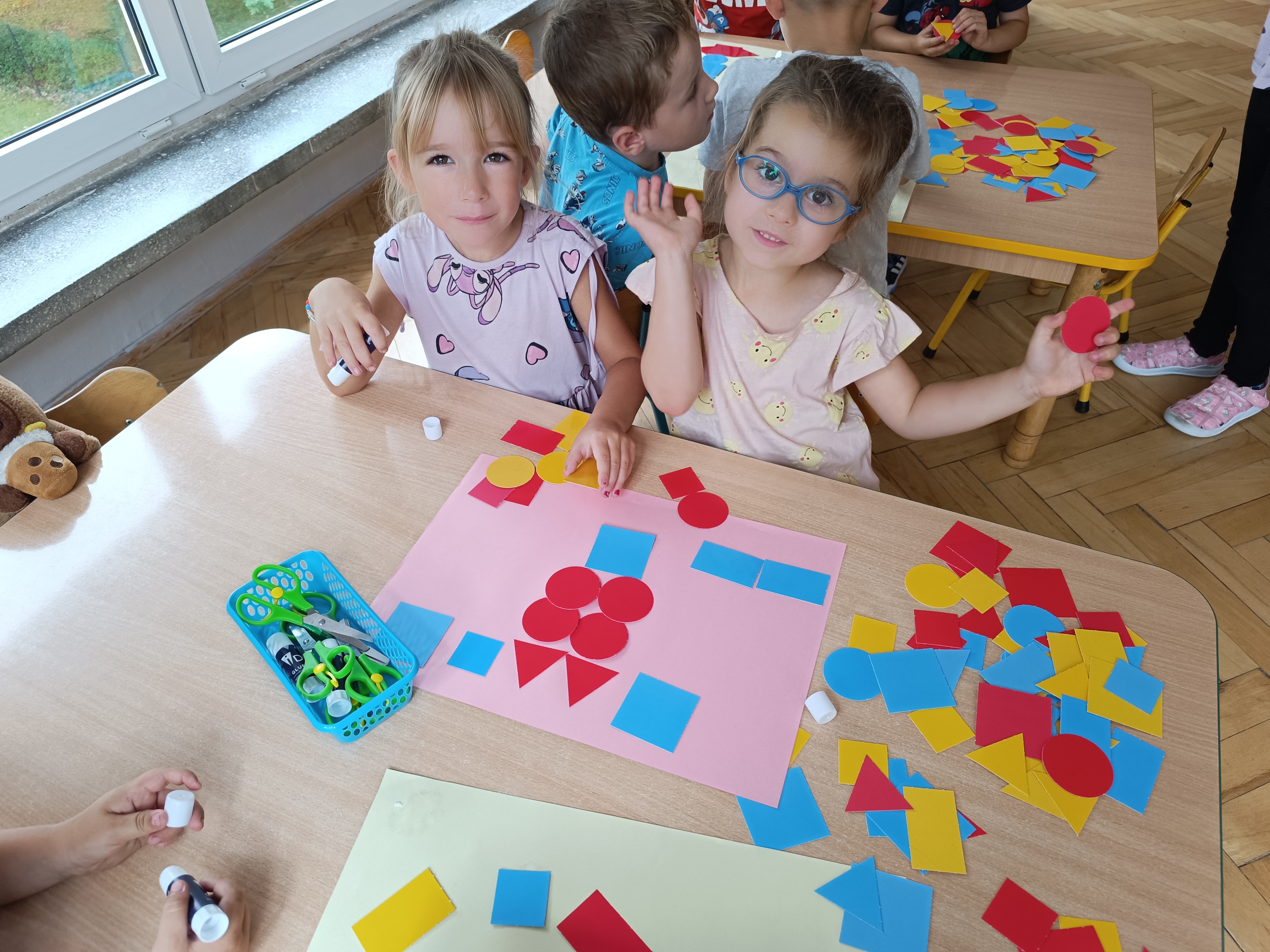 Układaliśmy misia, dom z figur geometrycznych, utrwalając ich nazwy. Przeliczyliśmy na figurach geometrycznych. Braliśmy udział w przeróżnych zabawach ruchowych. Oczywiście nie zabrakło wyjścia na plac zabaw przedszkolny.