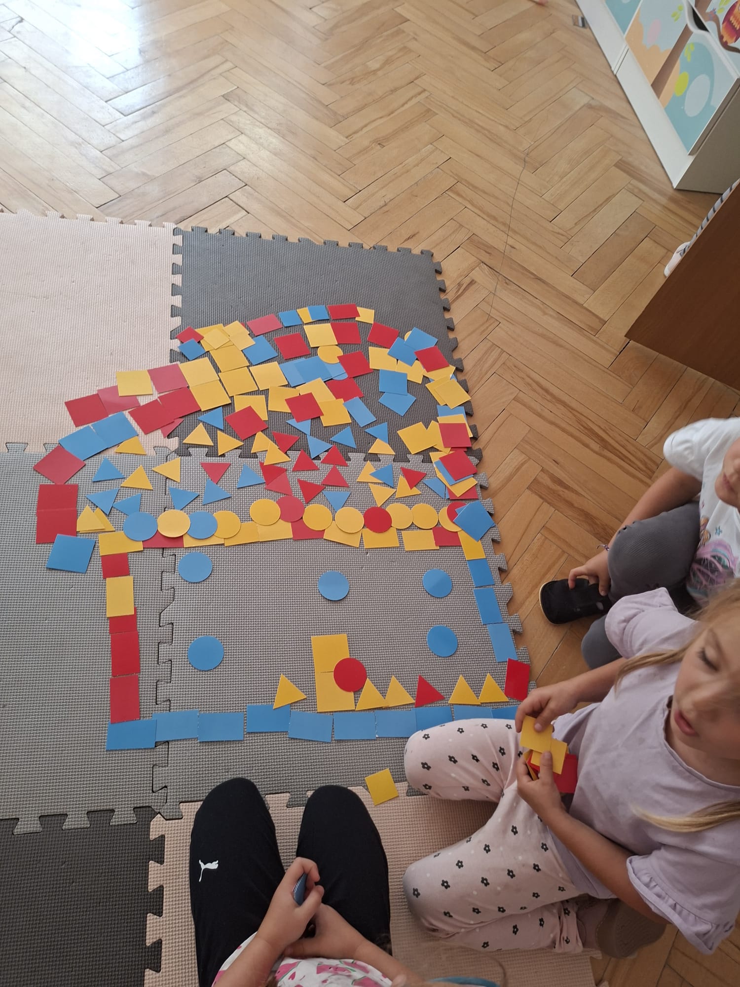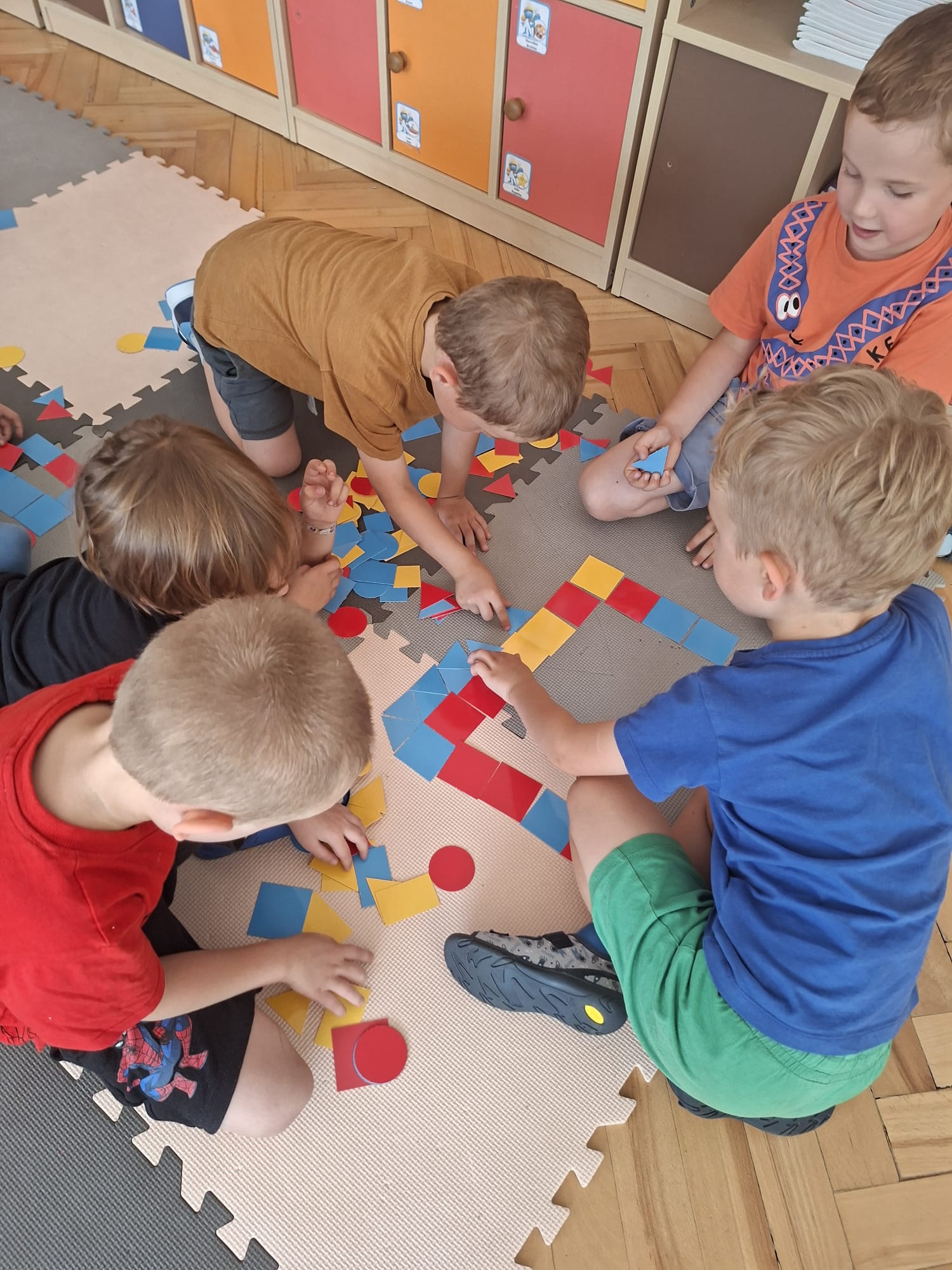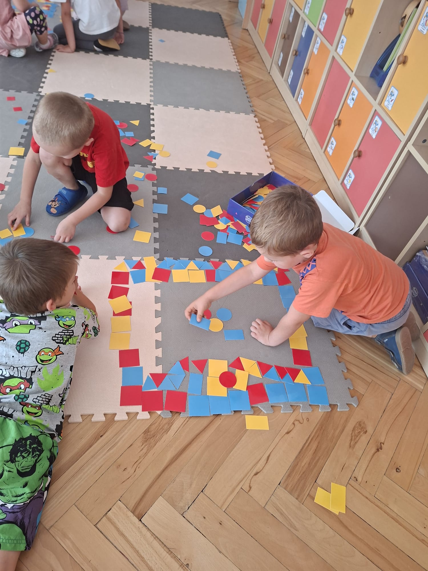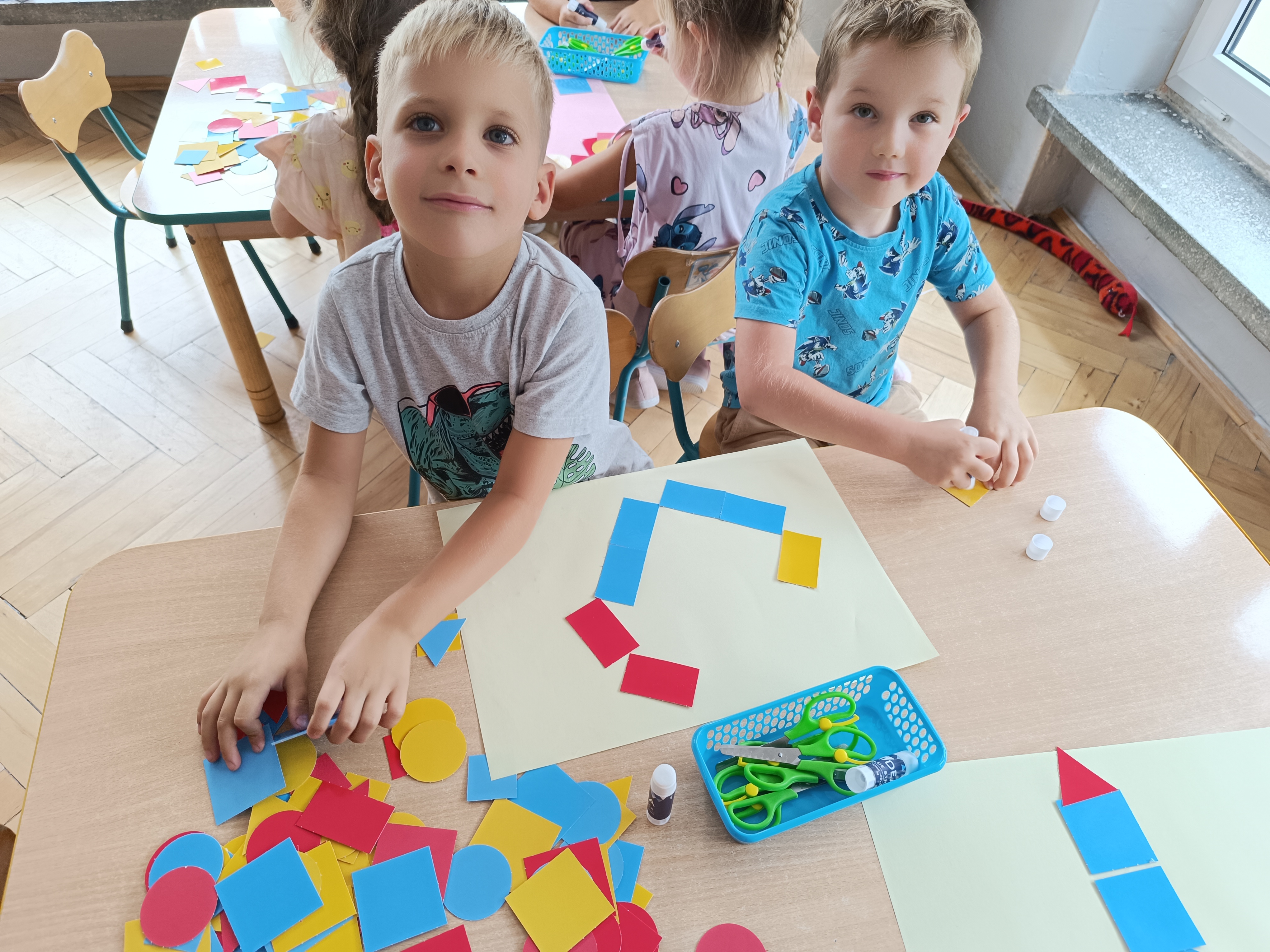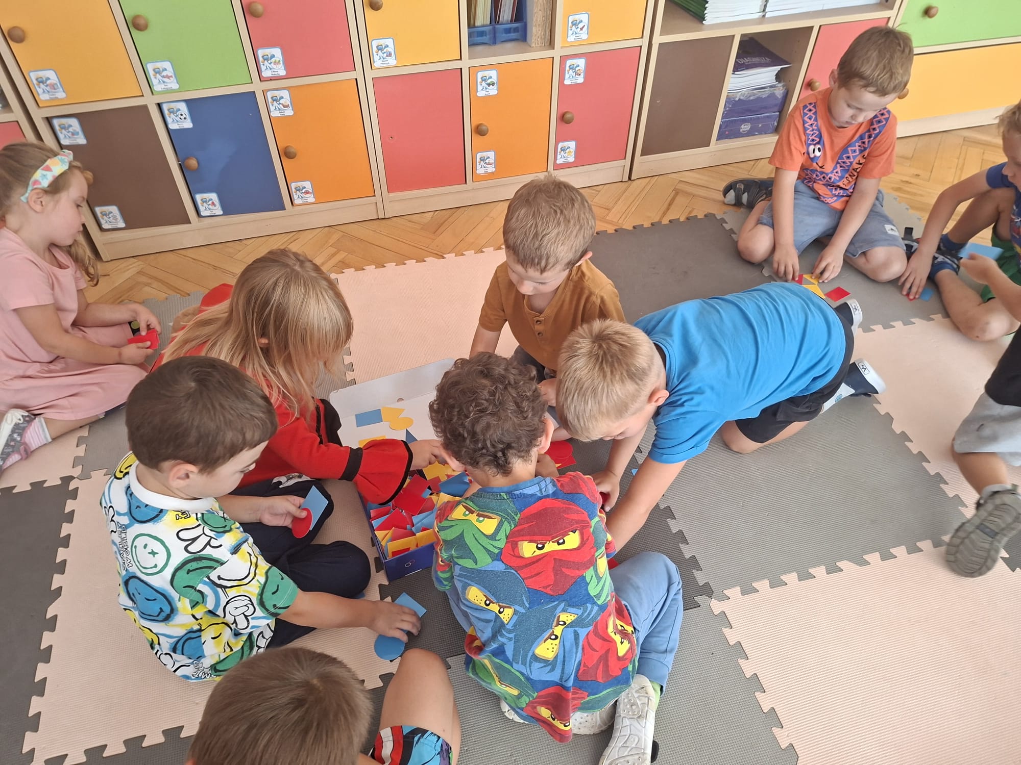 Układaliśmy misia, dom z figur geometrycznych, utrwalając ich nazwy. Przeliczyliśmy na figurach geometrycznych. Braliśmy udział w przeróżnych zabawach ruchowych. Oczywiście nie zabrakło wyjścia na plac zabaw przedszkolny.