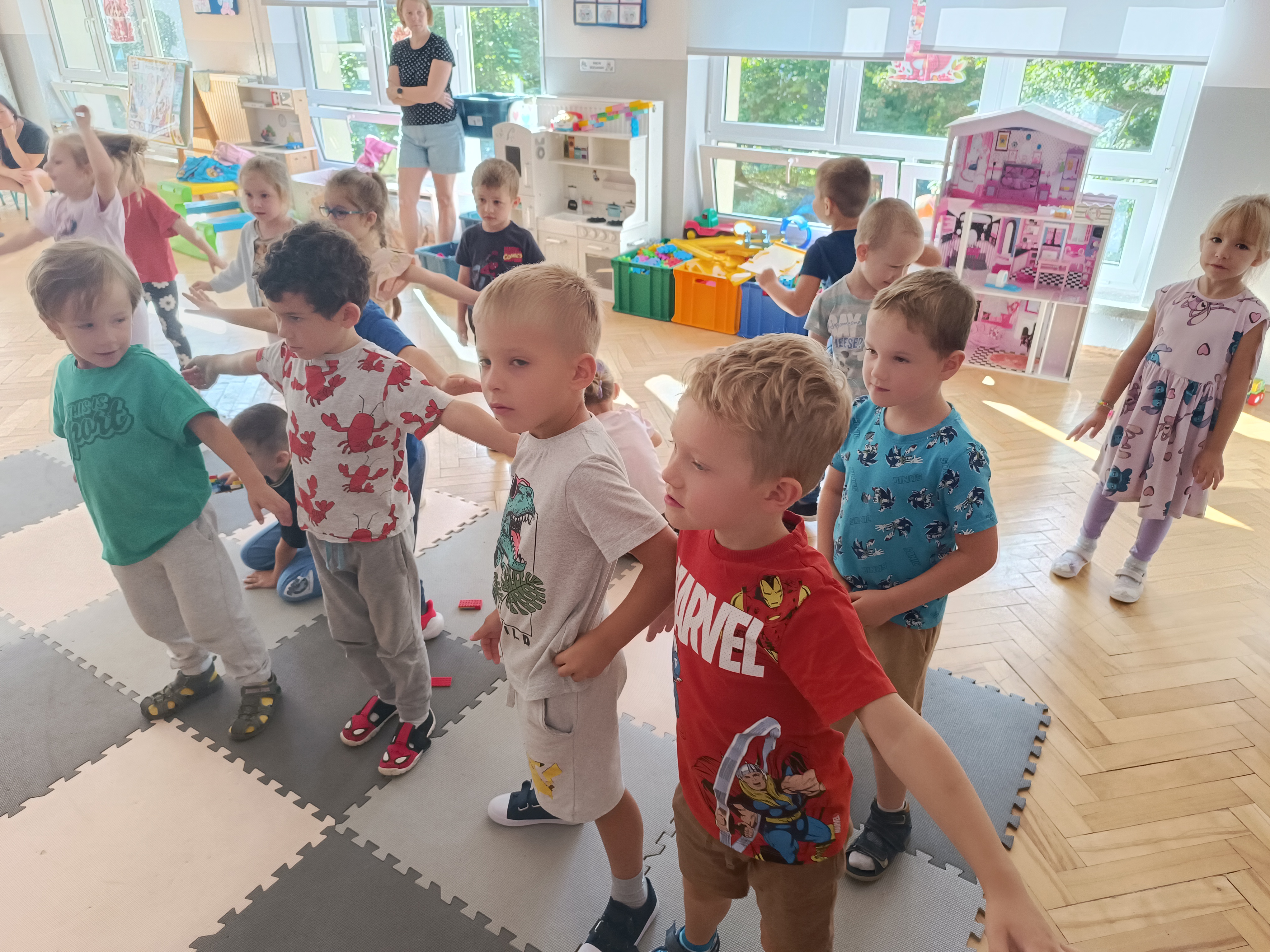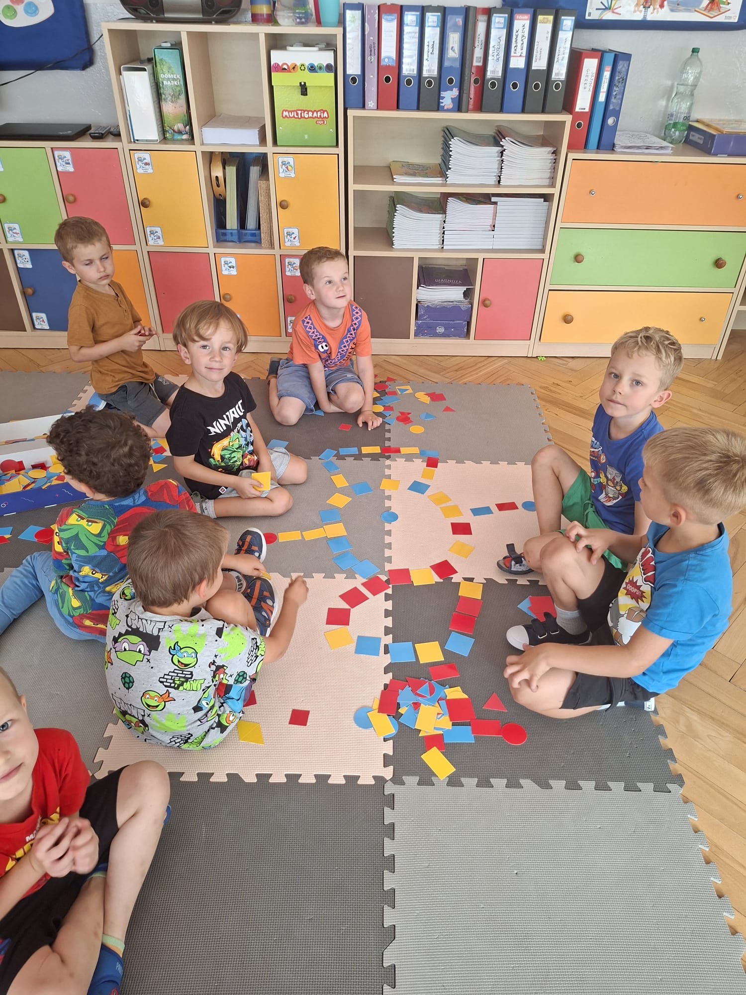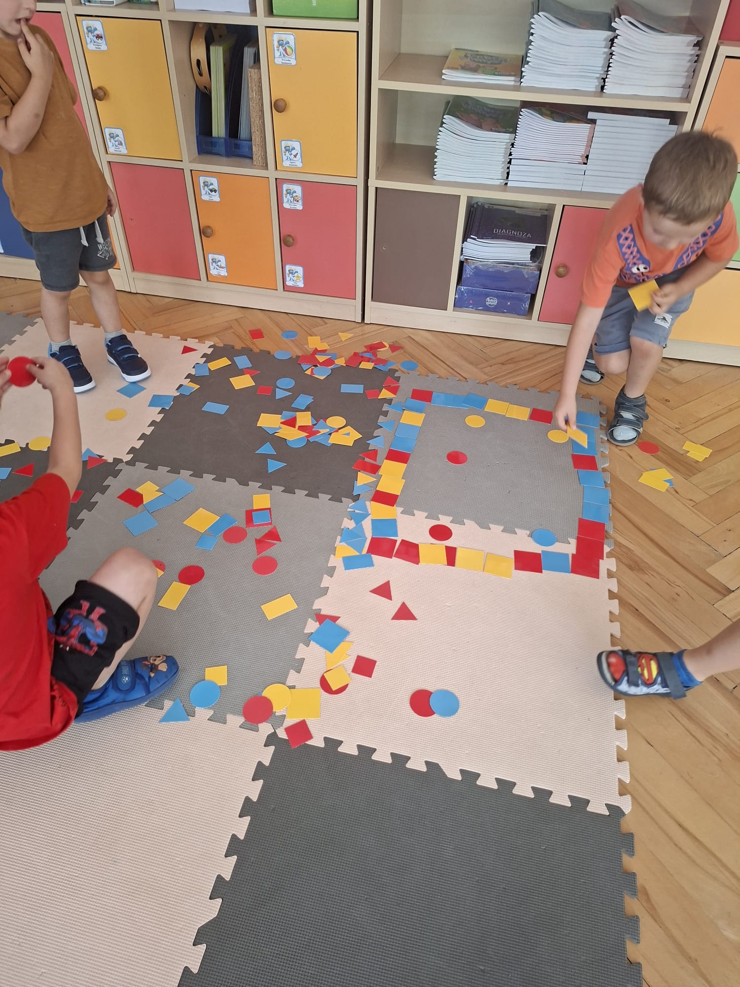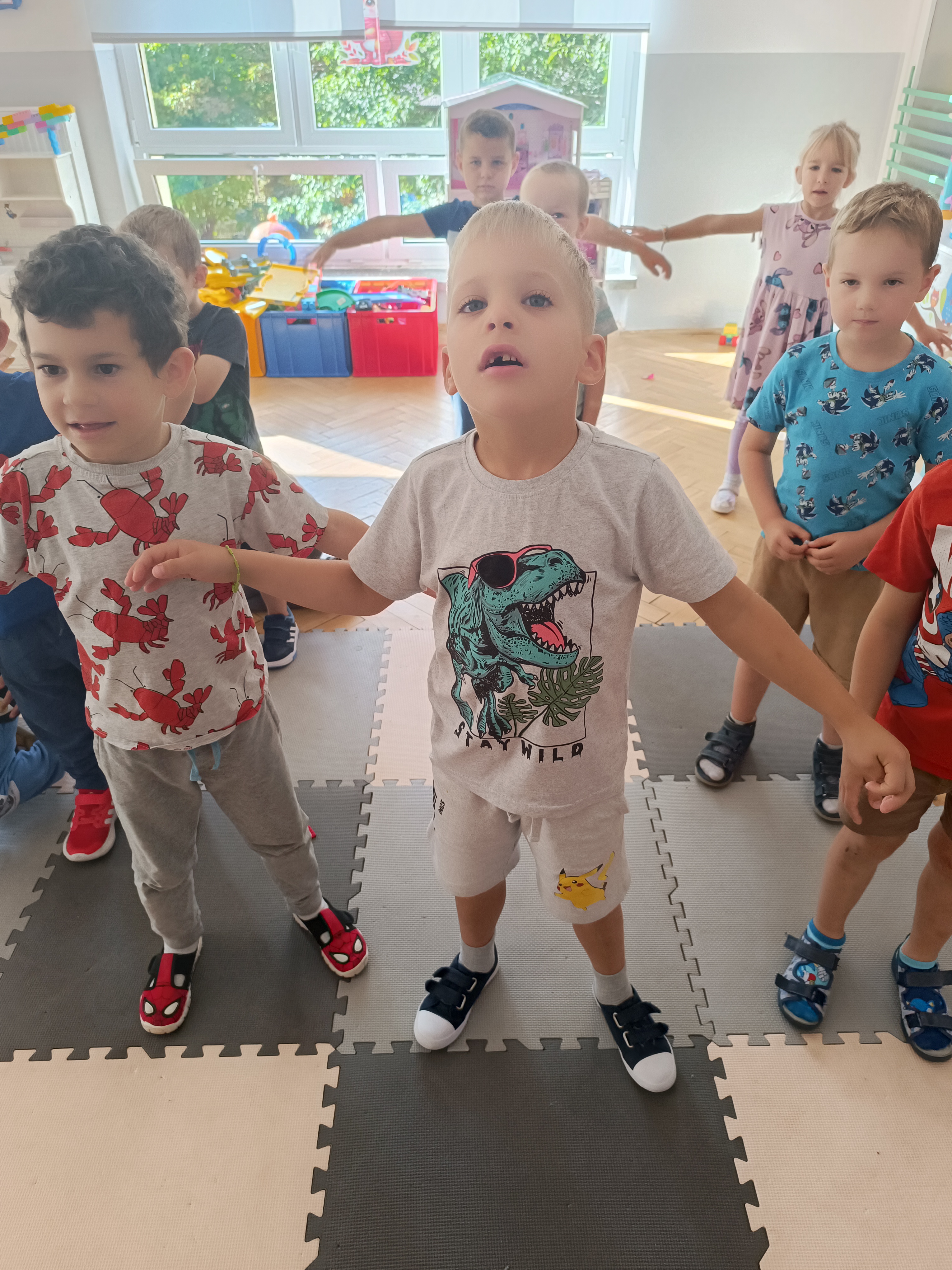 Układaliśmy misia, dom z figur geometrycznych, utrwalając ich nazwy. Przeliczyliśmy na figurach geometrycznych. Braliśmy udział w przeróżnych zabawach ruchowych. Oczywiście nie zabrakło wyjścia na plac zabaw przedszkolny.