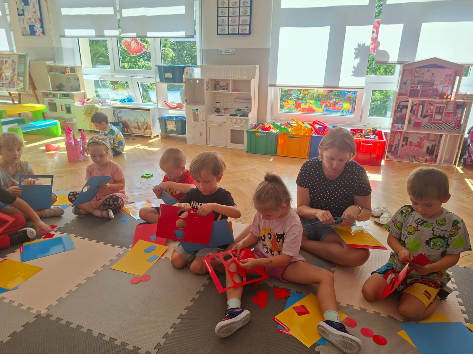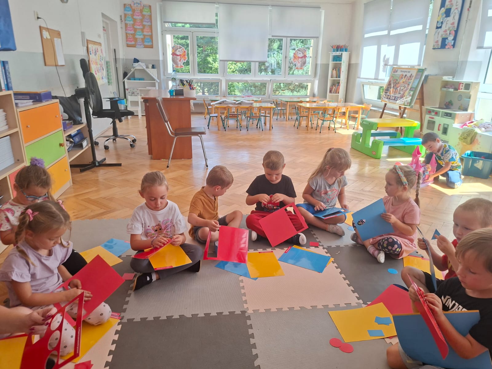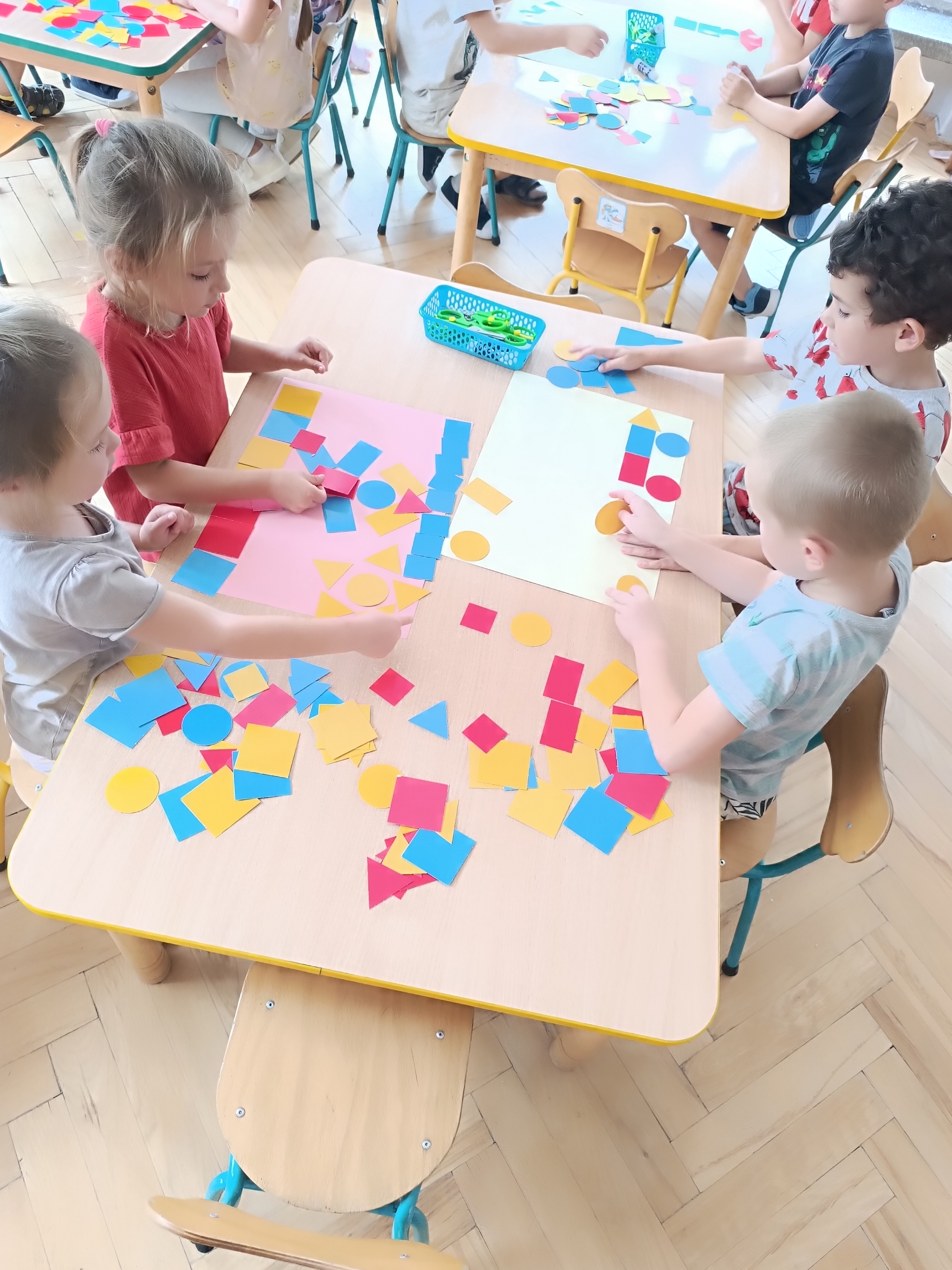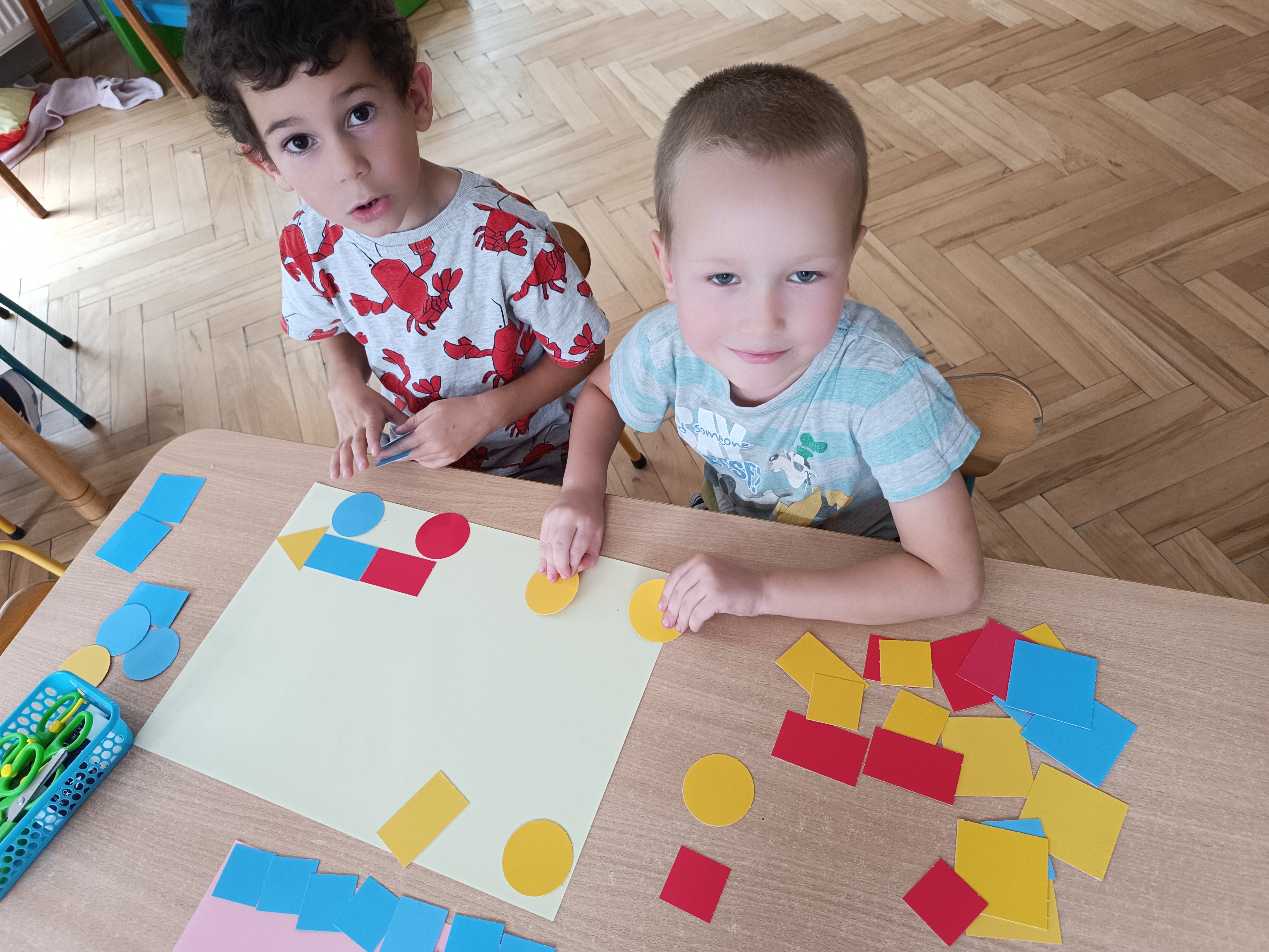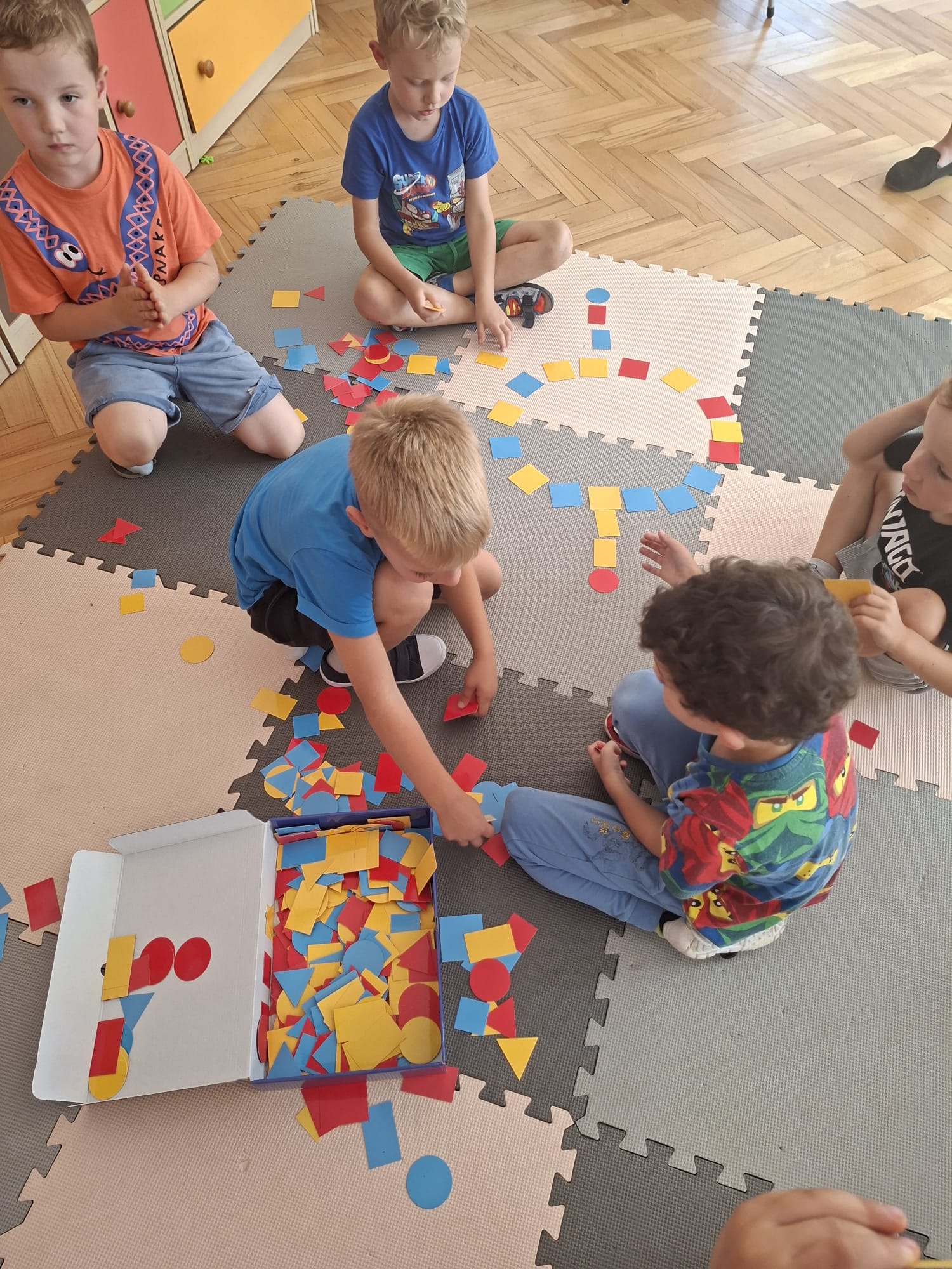 Układaliśmy misia, dom z figur geometrycznych, utrwalając ich nazwy. Przeliczyliśmy na figurach geometrycznych. Braliśmy udział w przeróżnych zabawach ruchowych. Oczywiście nie zabrakło wyjścia na plac zabaw przedszkolny.