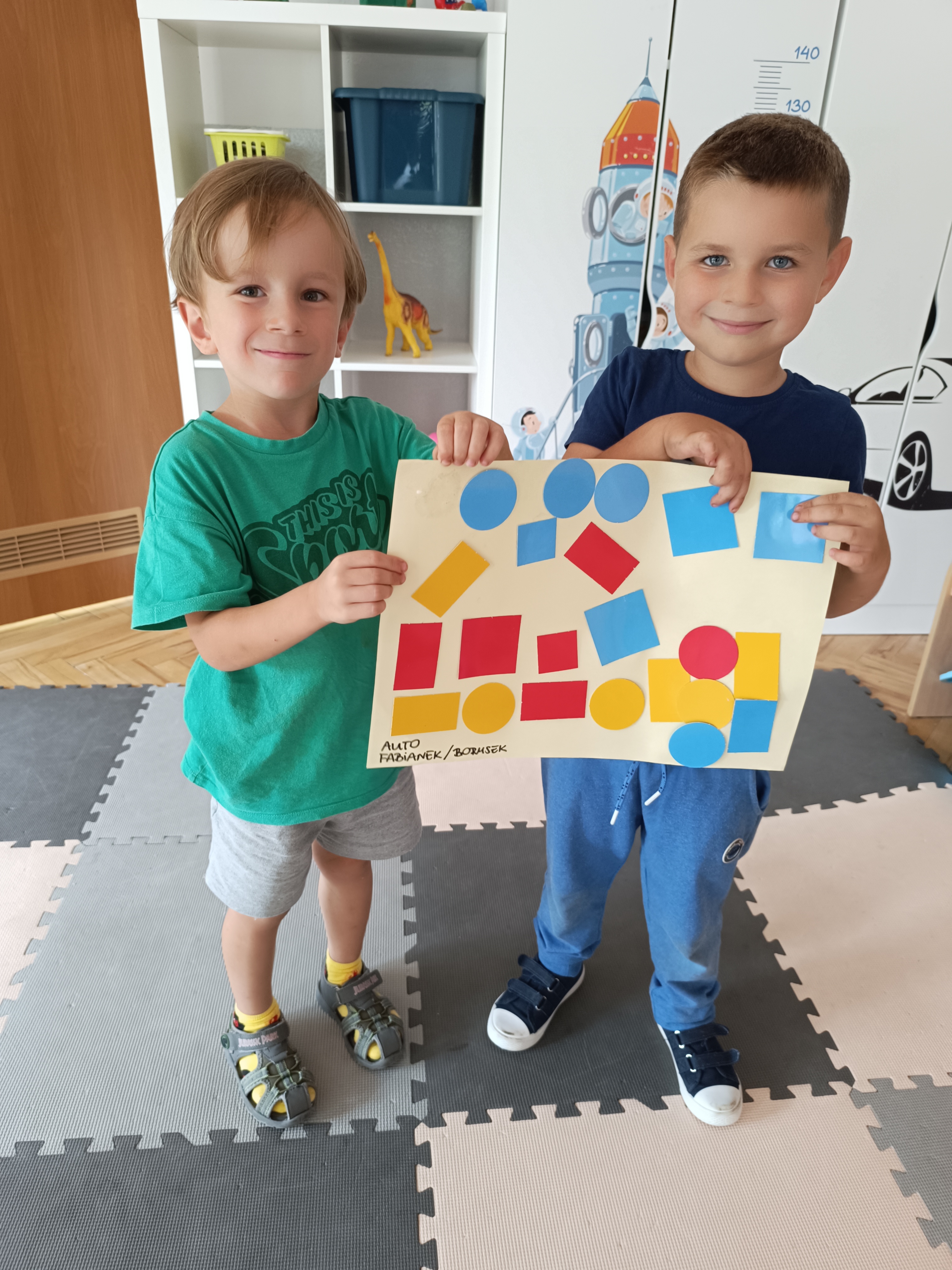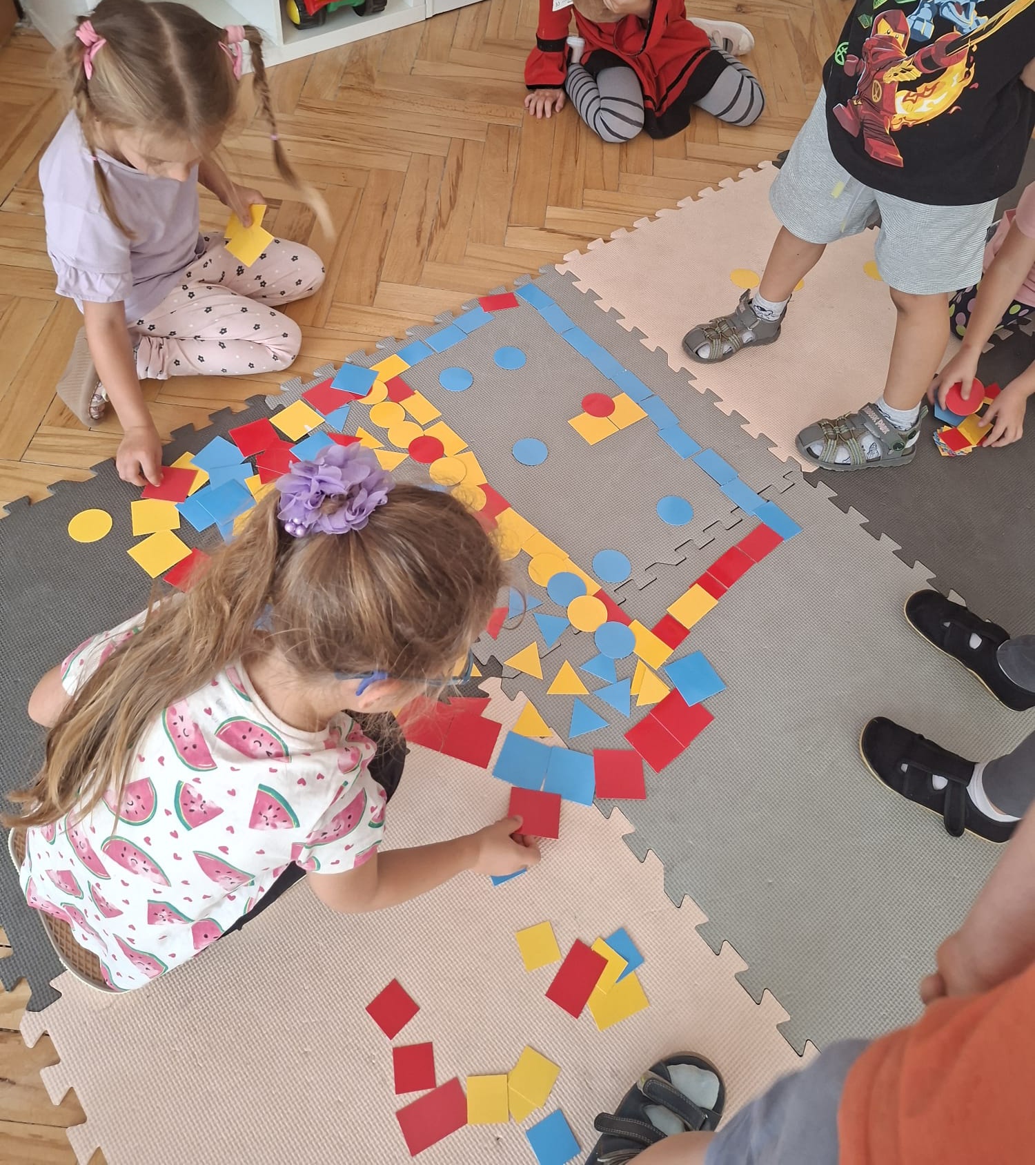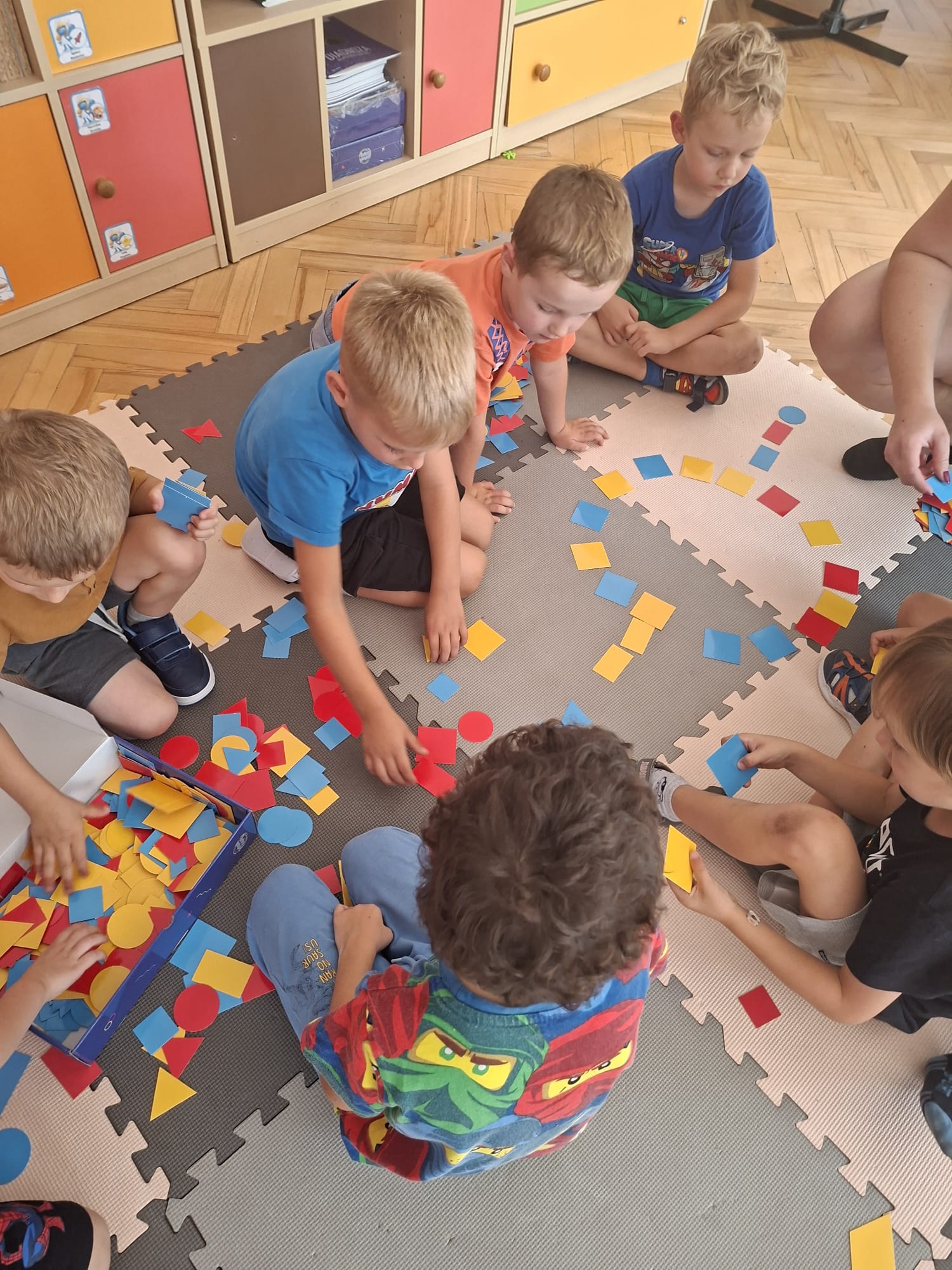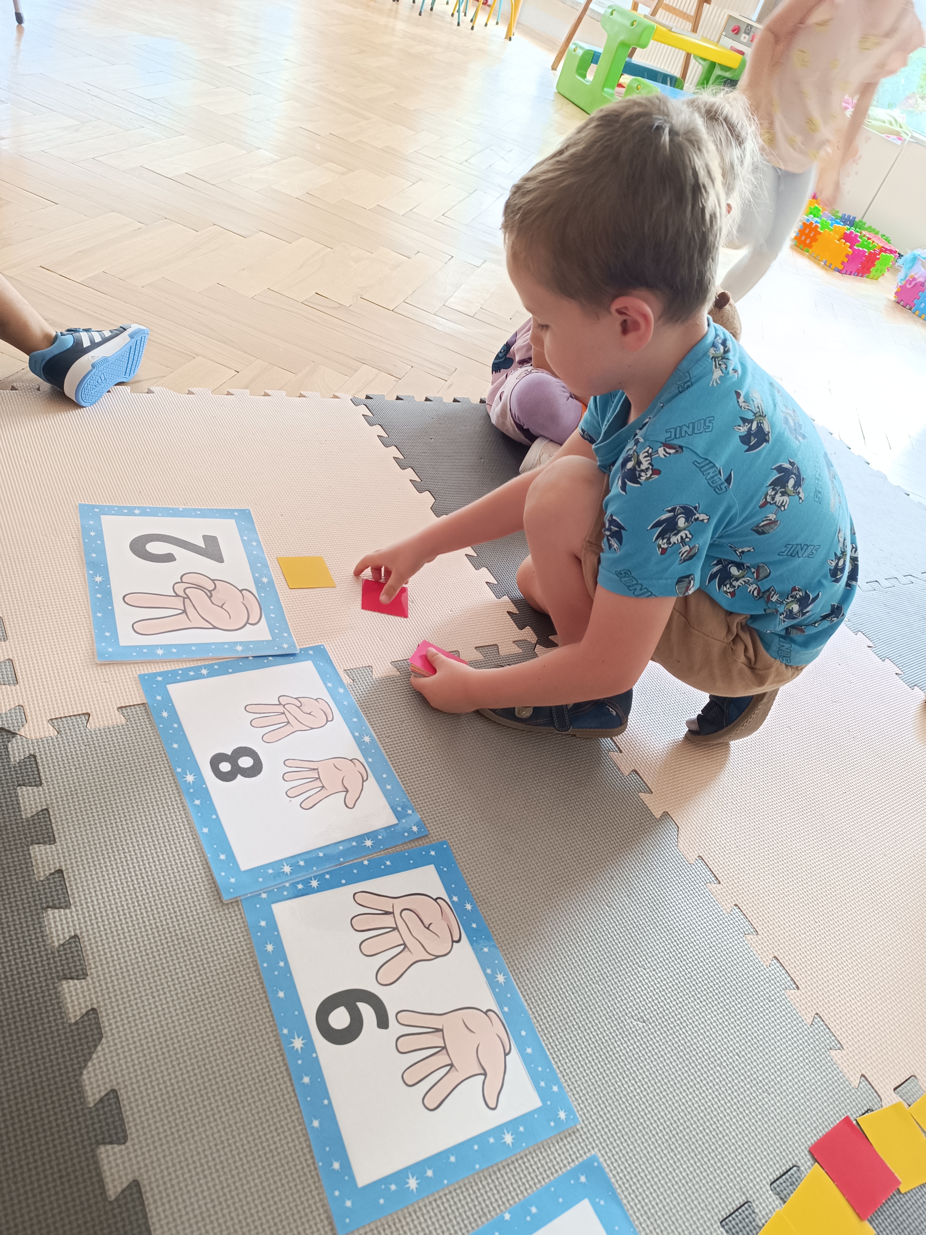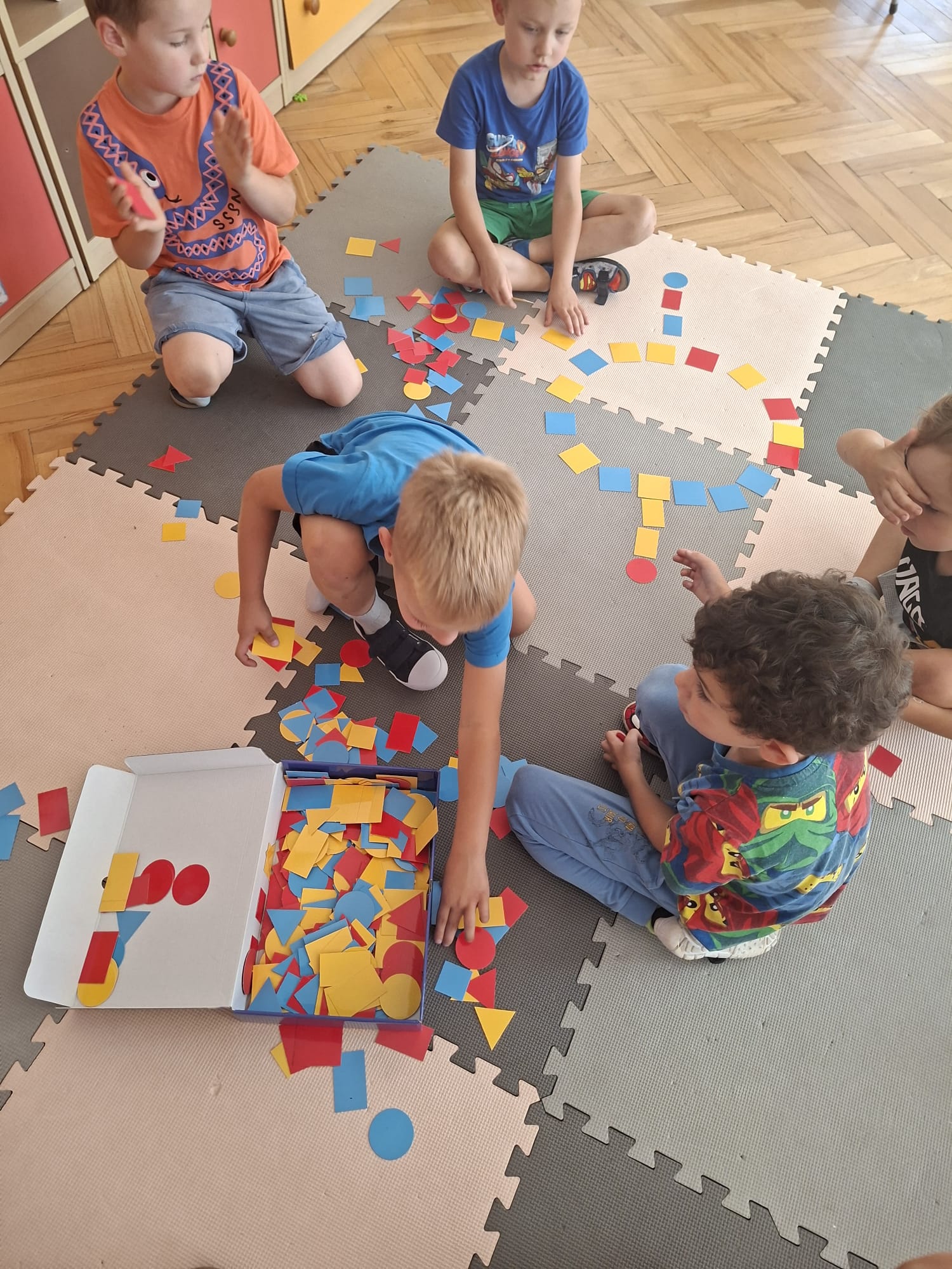 Układaliśmy misia, dom z figur geometrycznych, utrwalając ich nazwy. Przeliczyliśmy na figurach geometrycznych. Braliśmy udział w przeróżnych zabawach ruchowych. Oczywiście nie zabrakło wyjścia na plac zabaw przedszkolny.