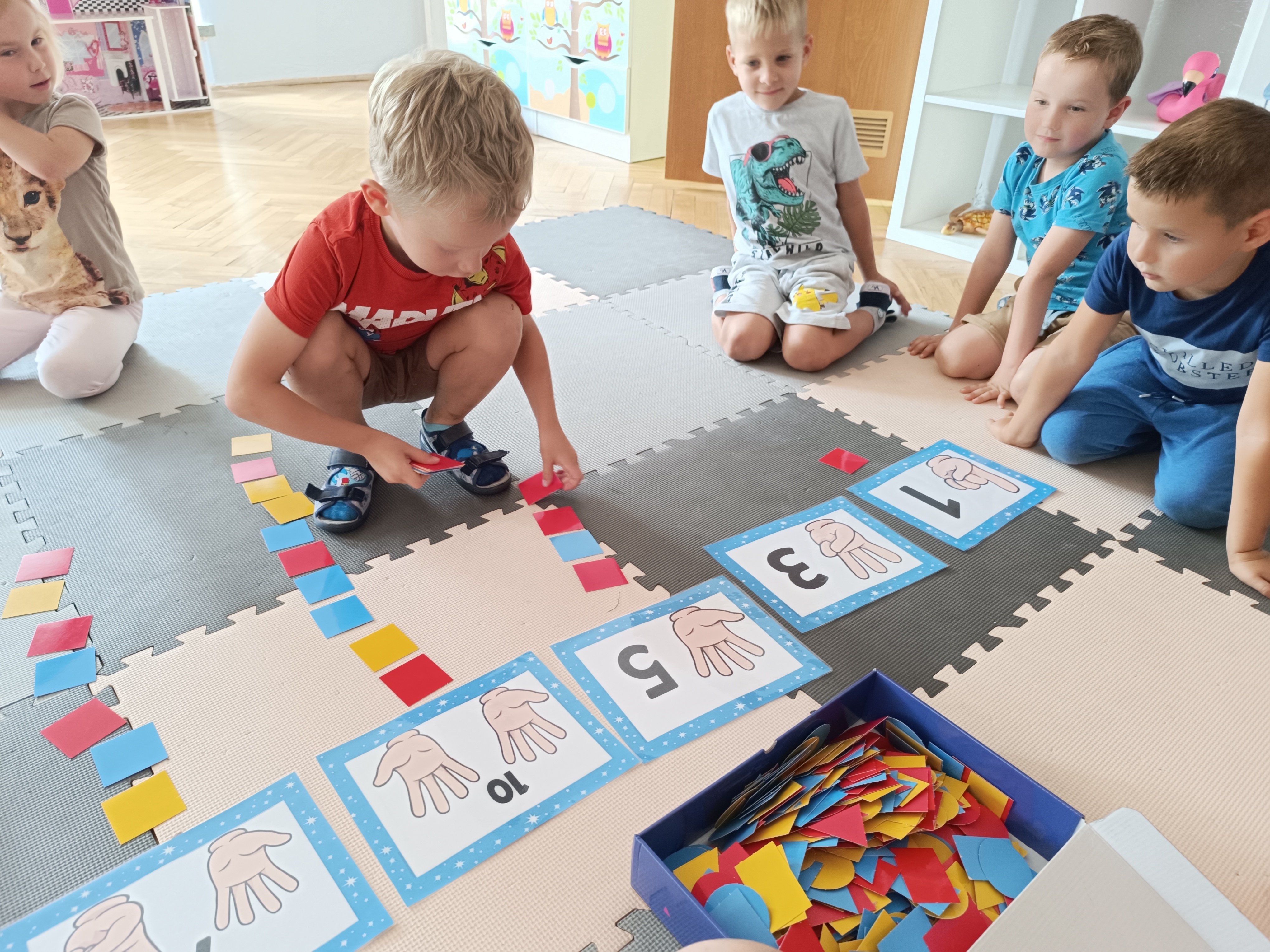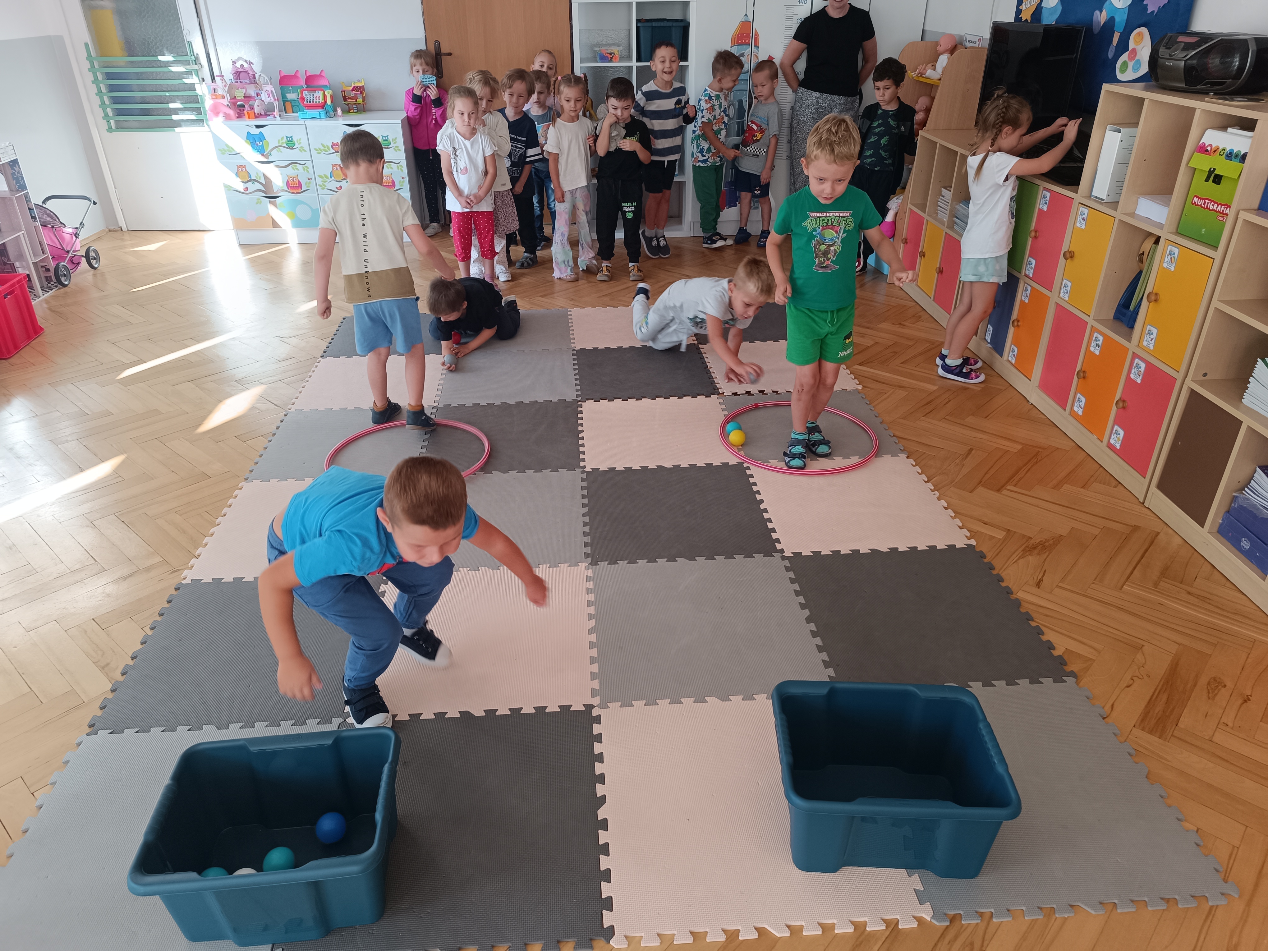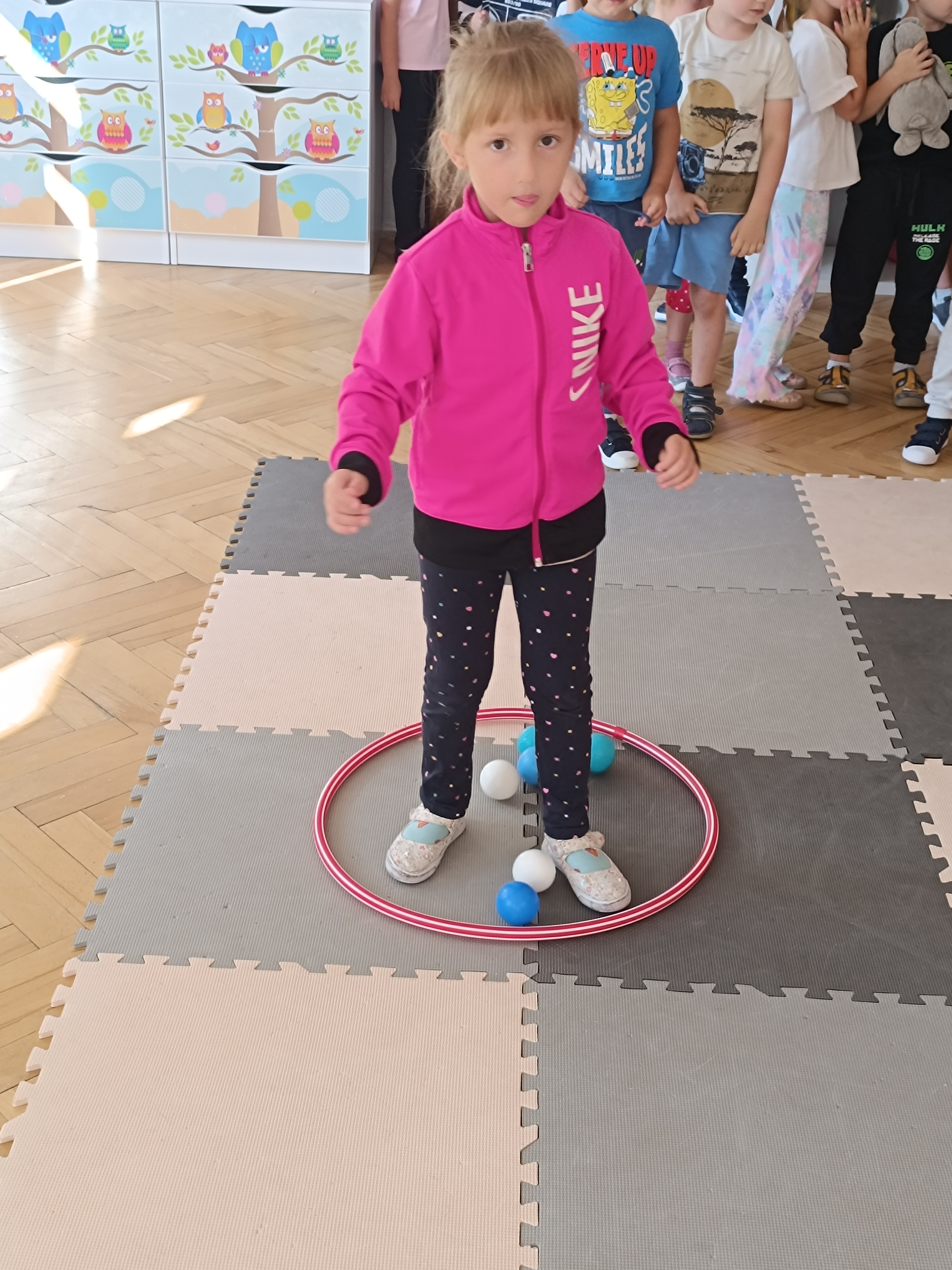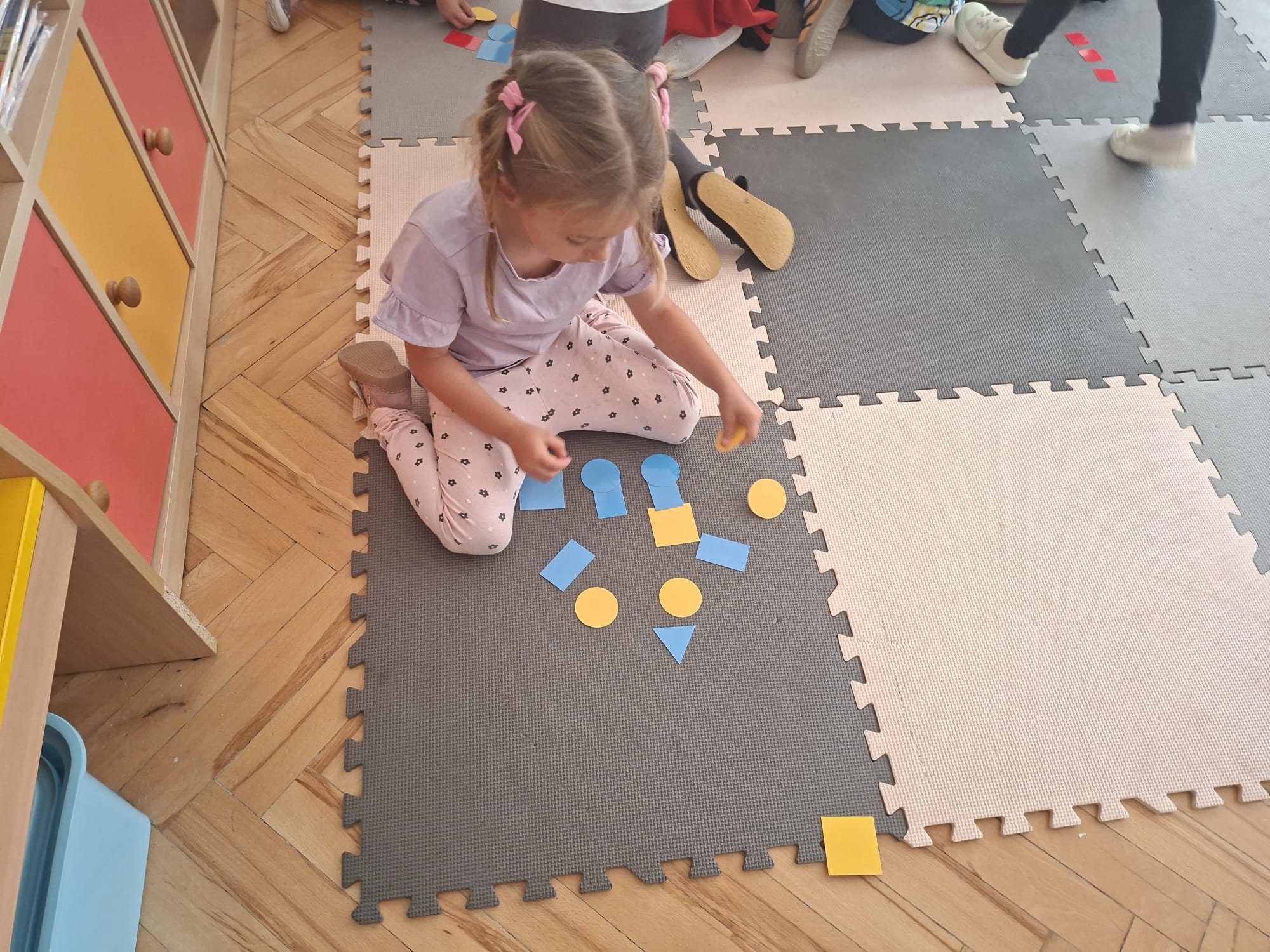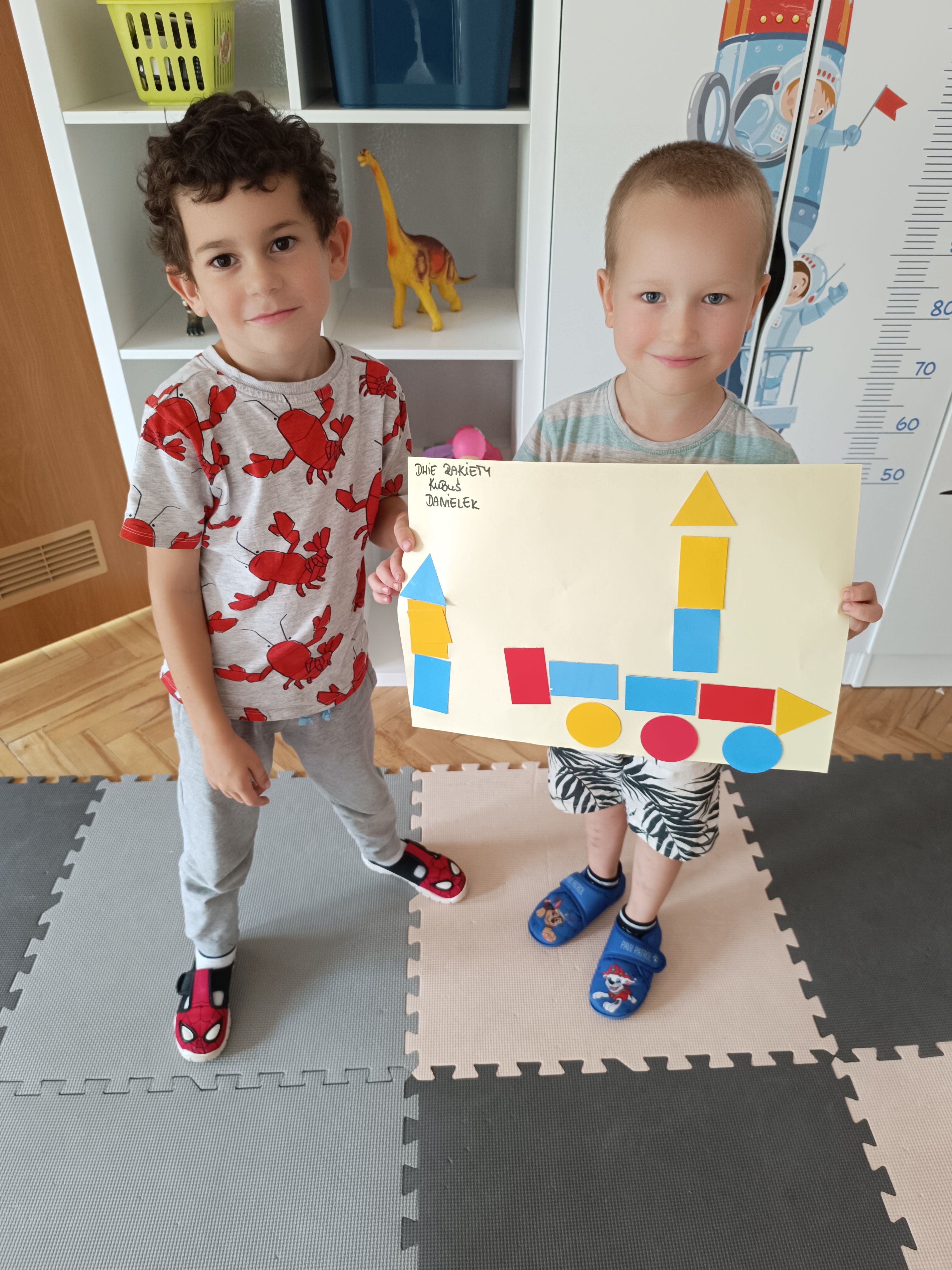 Układaliśmy misia, dom z figur geometrycznych, utrwalając ich nazwy. Przeliczyliśmy na figurach geometrycznych. Braliśmy udział w przeróżnych zabawach ruchowych. Oczywiście nie zabrakło wyjścia na plac zabaw przedszkolny.