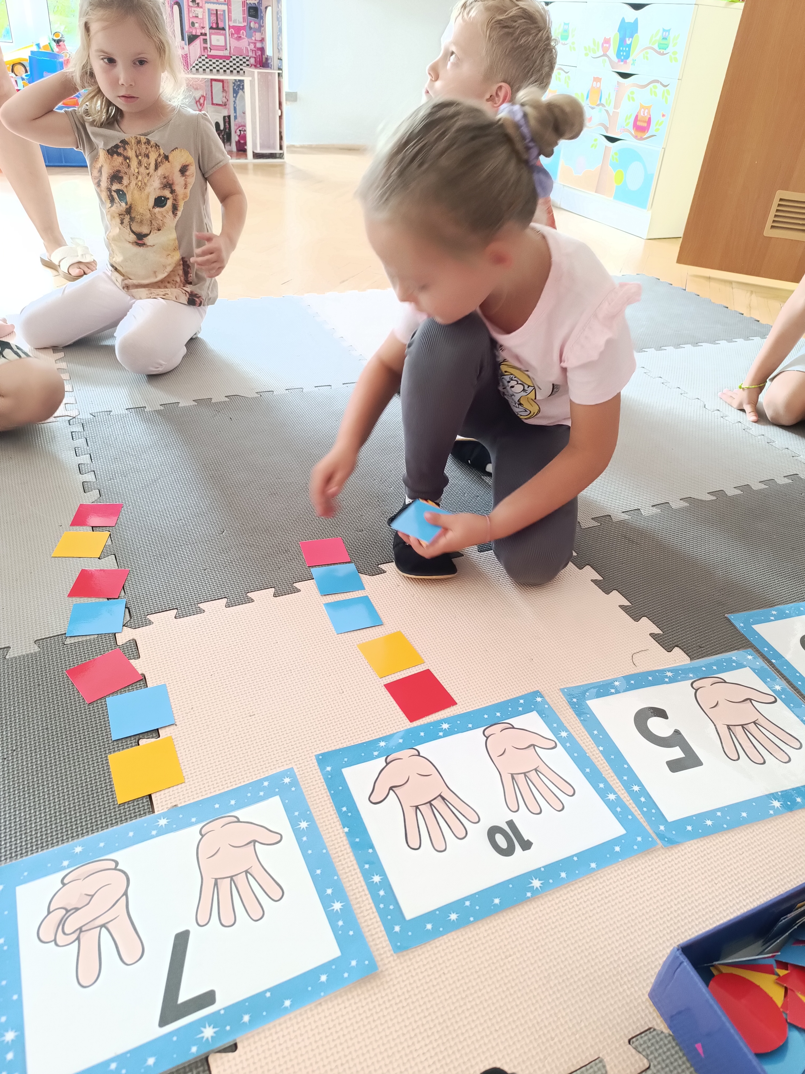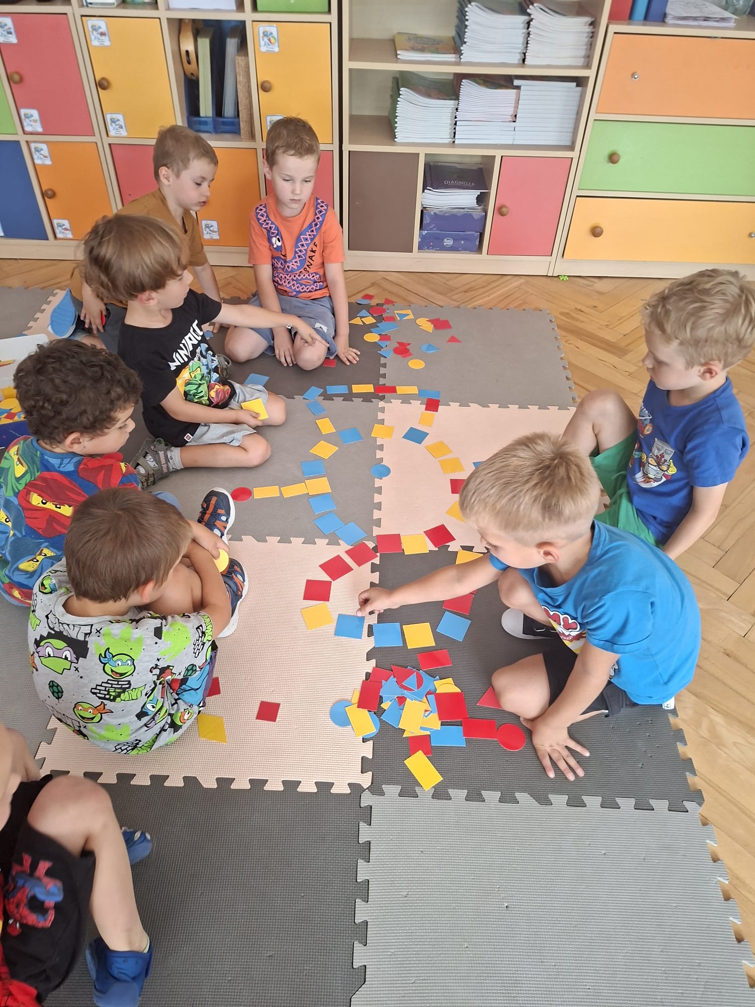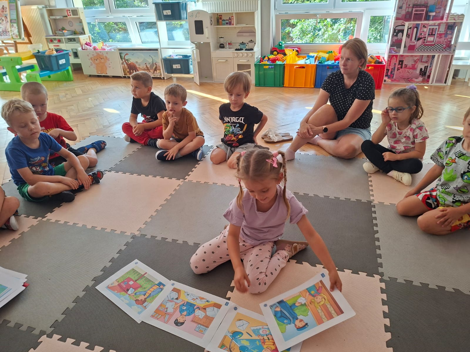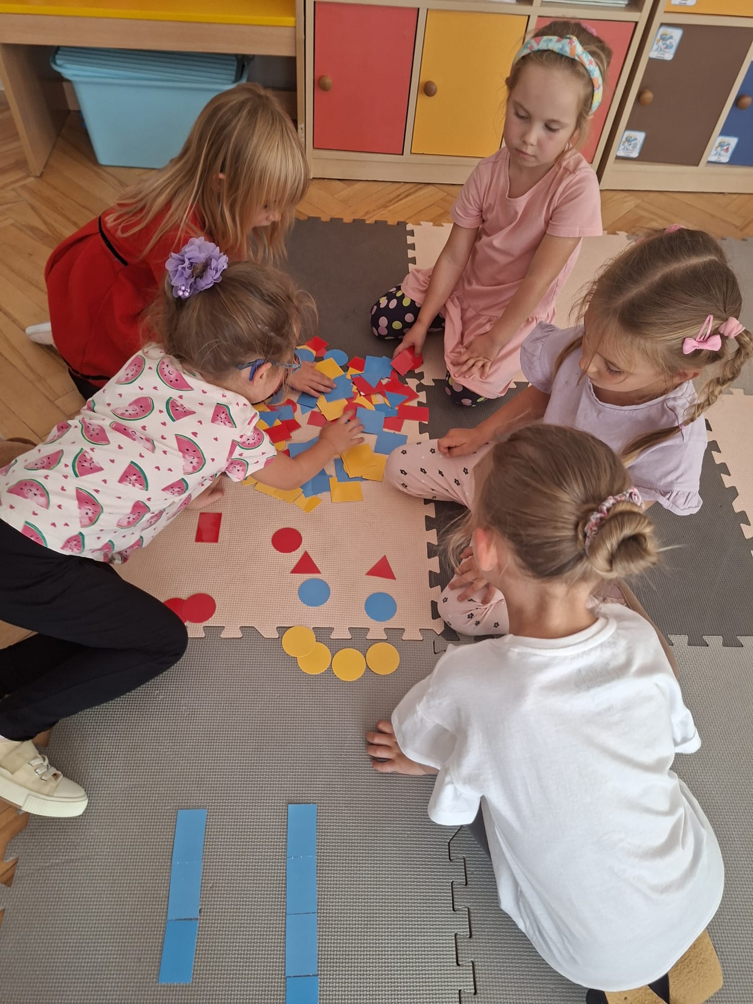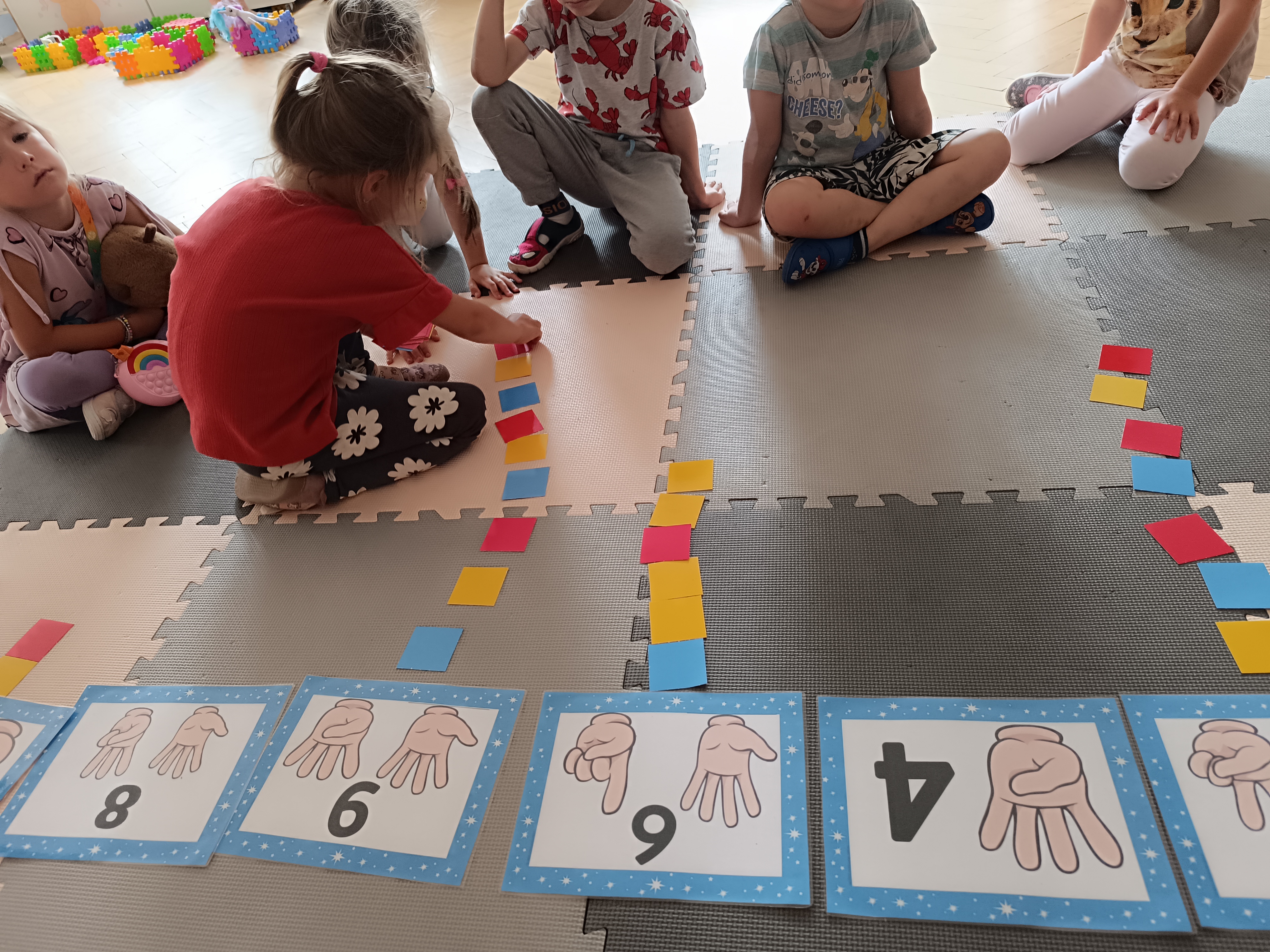 Układaliśmy misia, dom z figur geometrycznych, utrwalając ich nazwy. Przeliczyliśmy na figurach geometrycznych. Braliśmy udział w przeróżnych zabawach ruchowych. Oczywiście nie zabrakło wyjścia na plac zabaw przedszkolny.