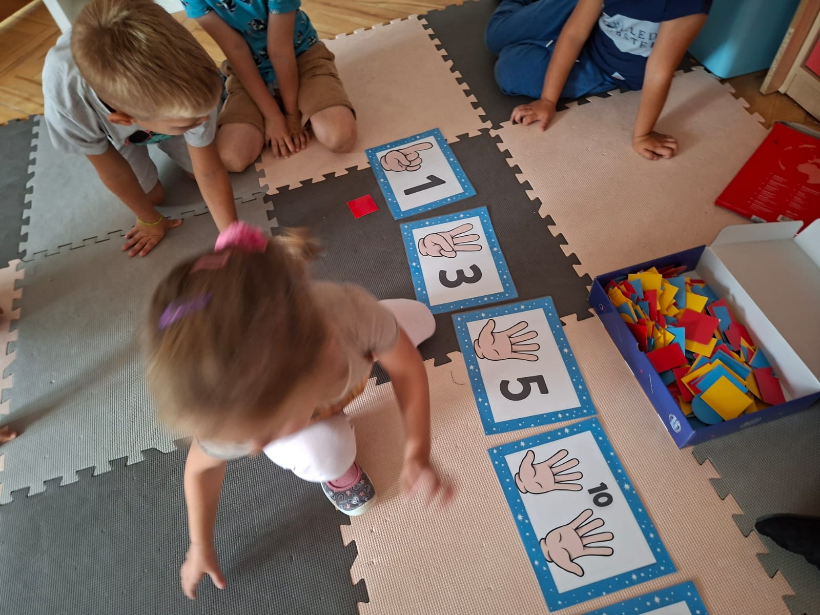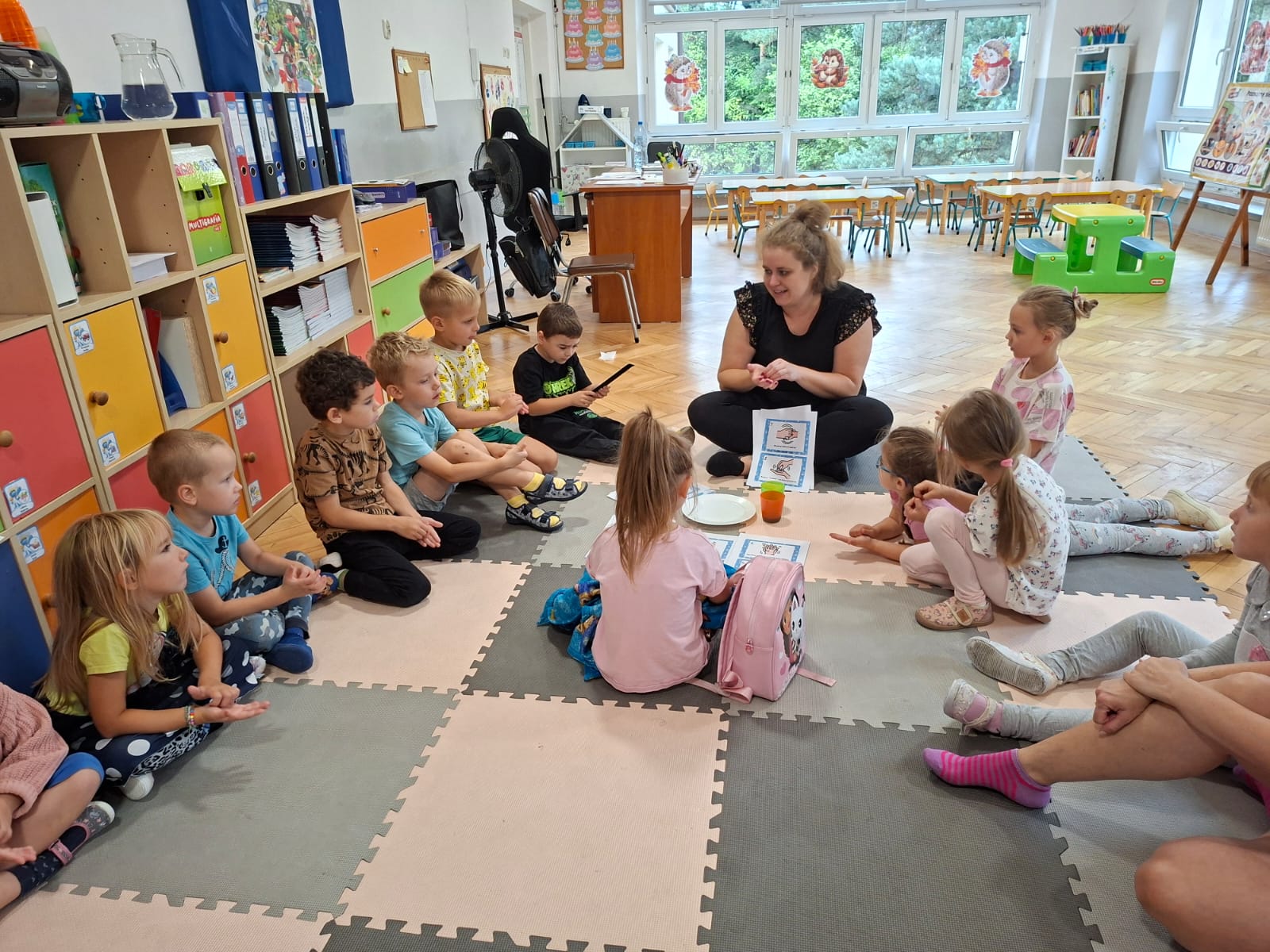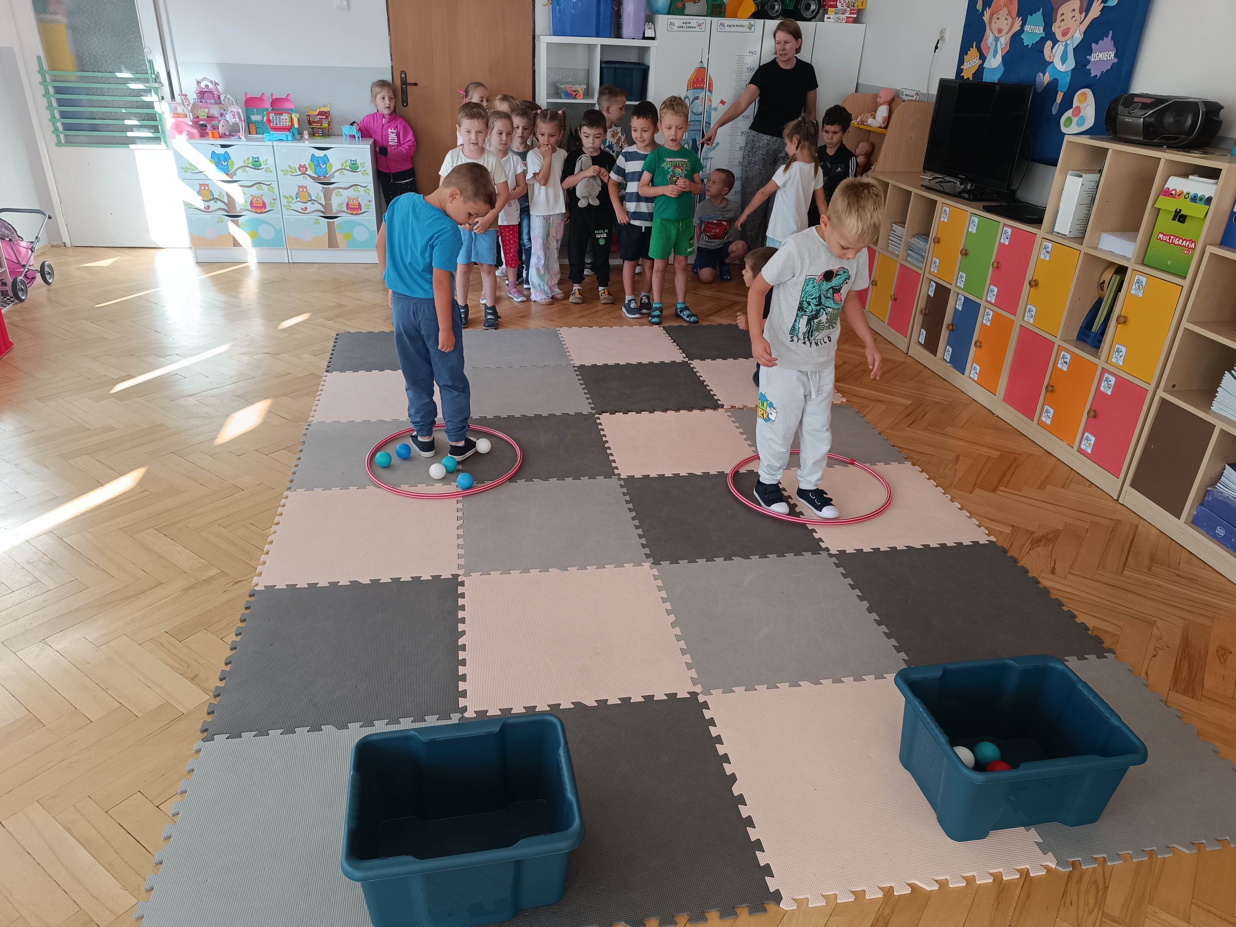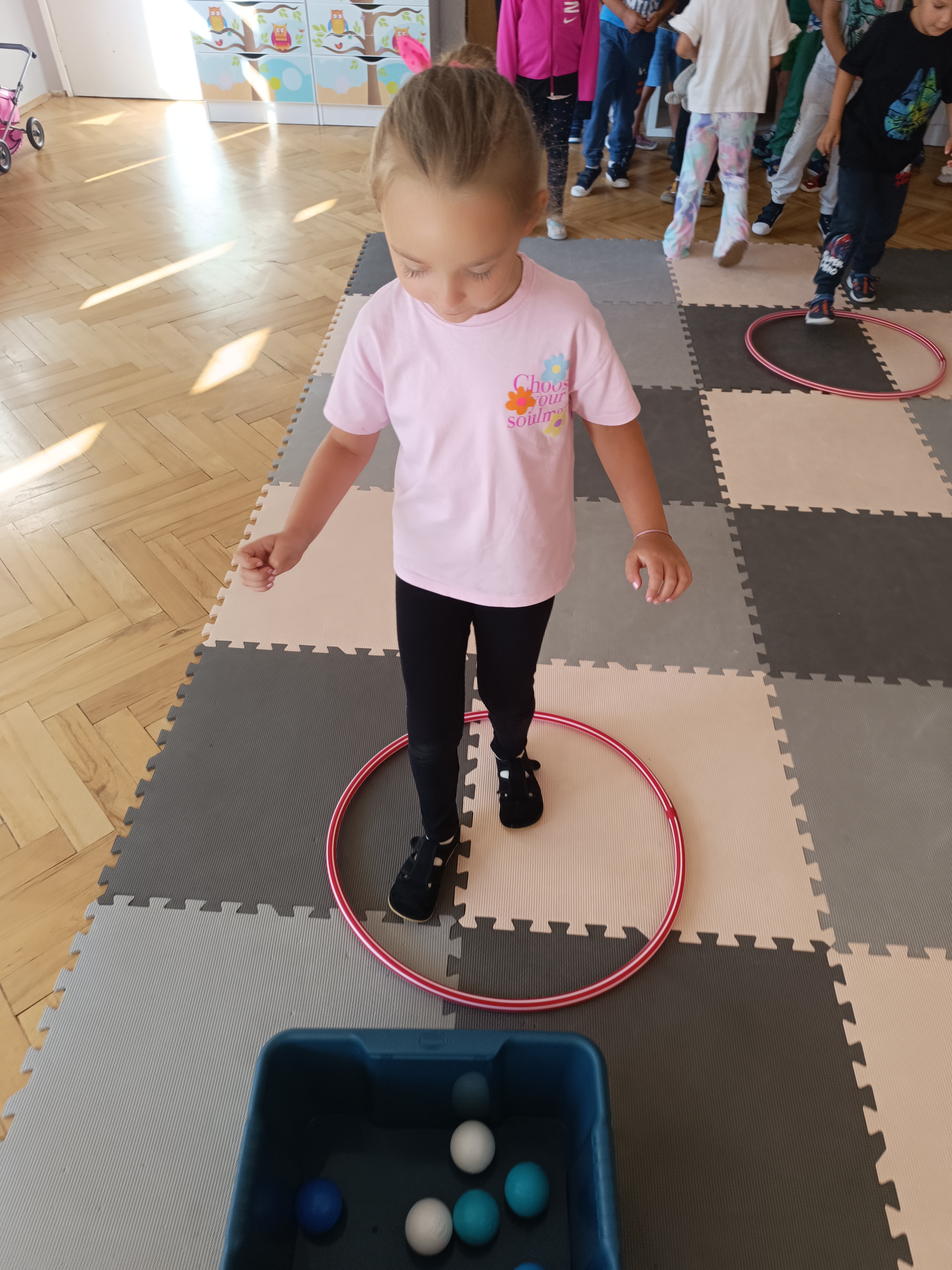 Układaliśmy misia, dom z figur geometrycznych, utrwalając ich nazwy. Przeliczyliśmy na figurach geometrycznych. Braliśmy udział w przeróżnych zabawach ruchowych. Oczywiście nie zabrakło wyjścia na plac zabaw przedszkolny.