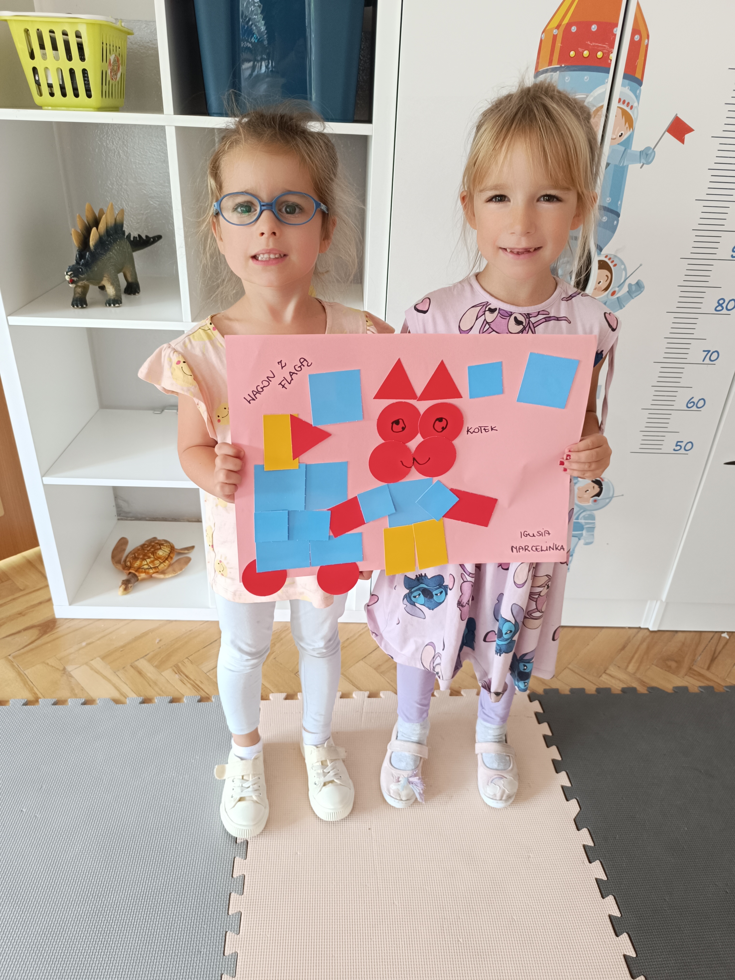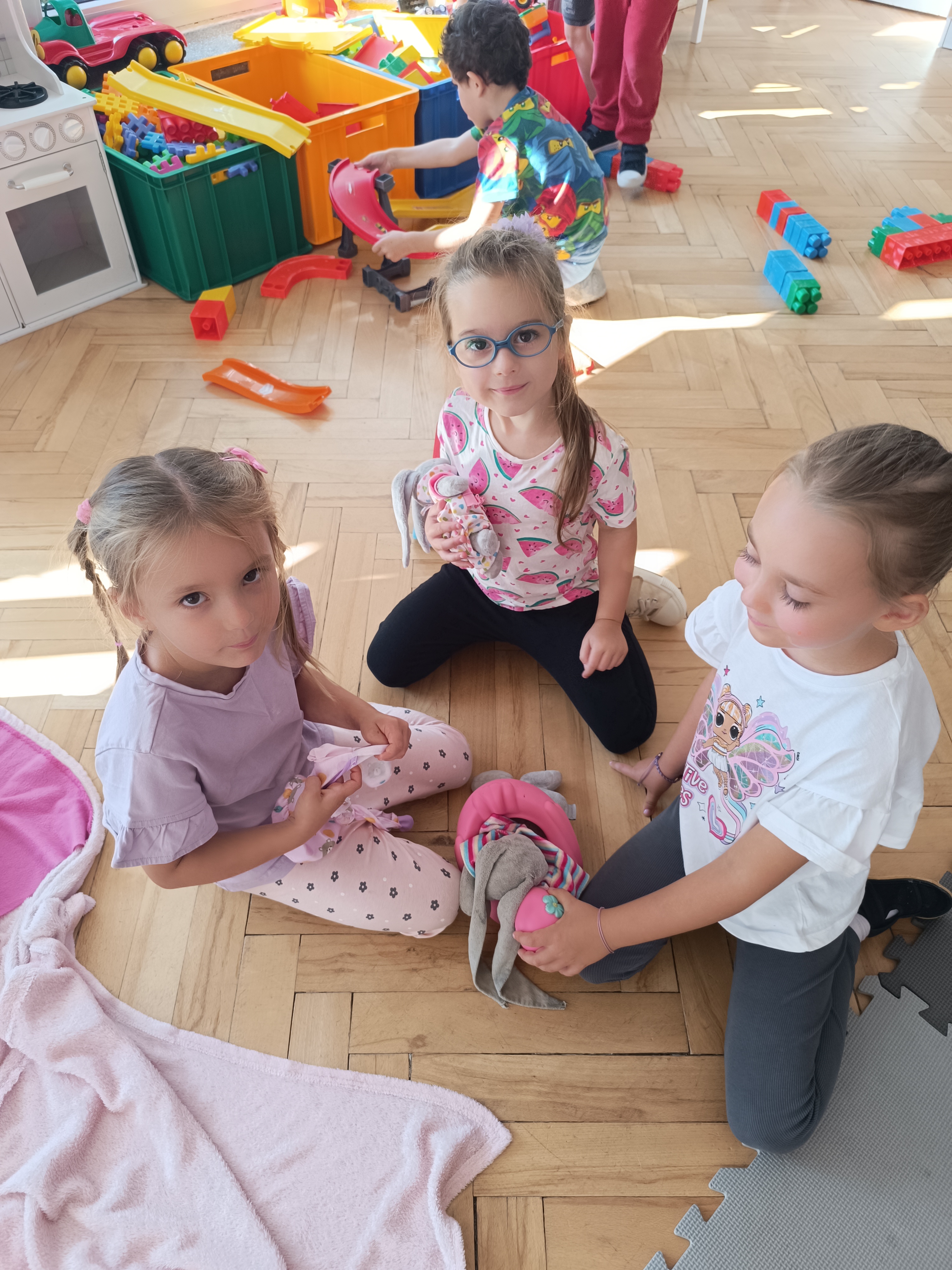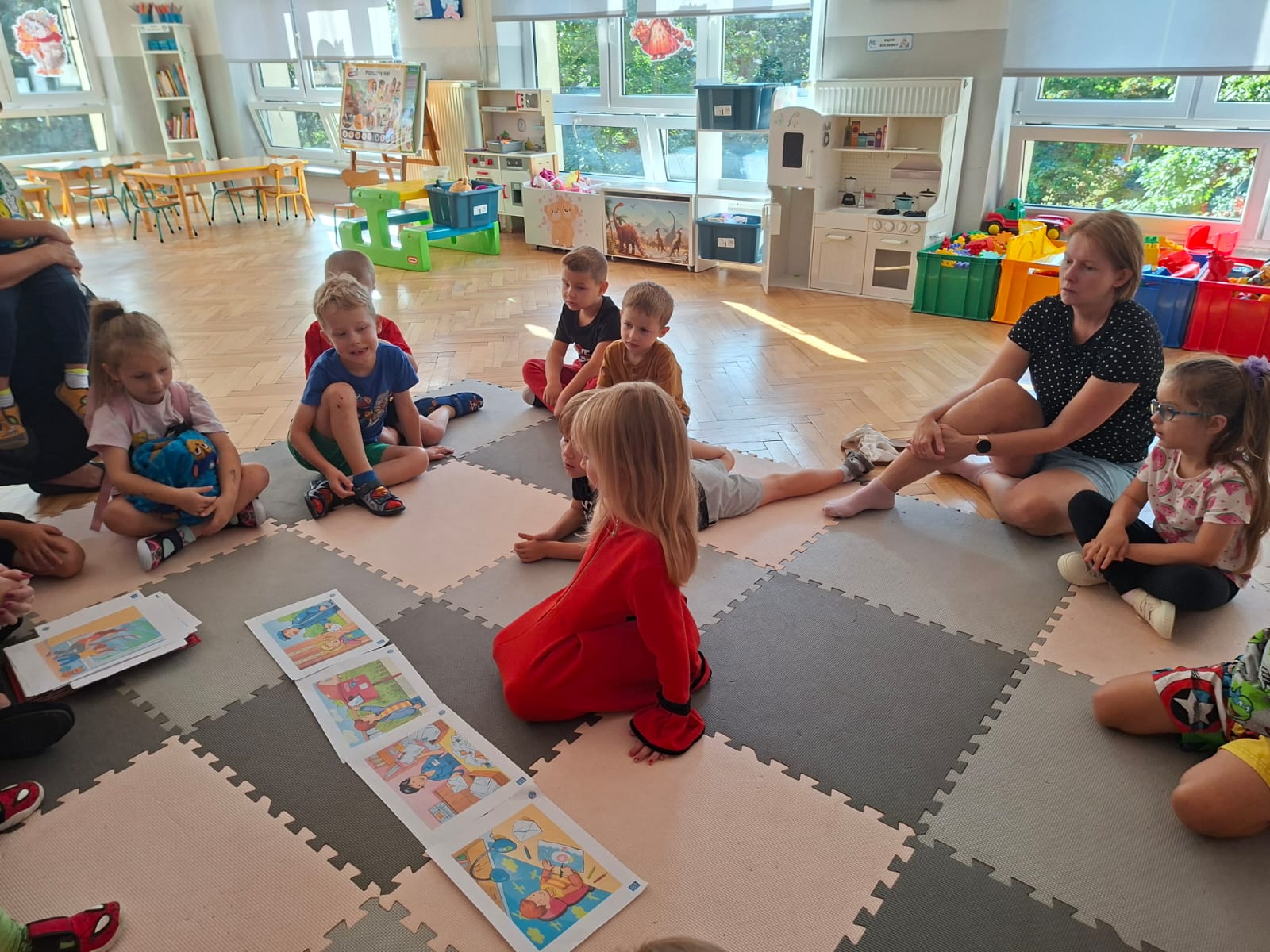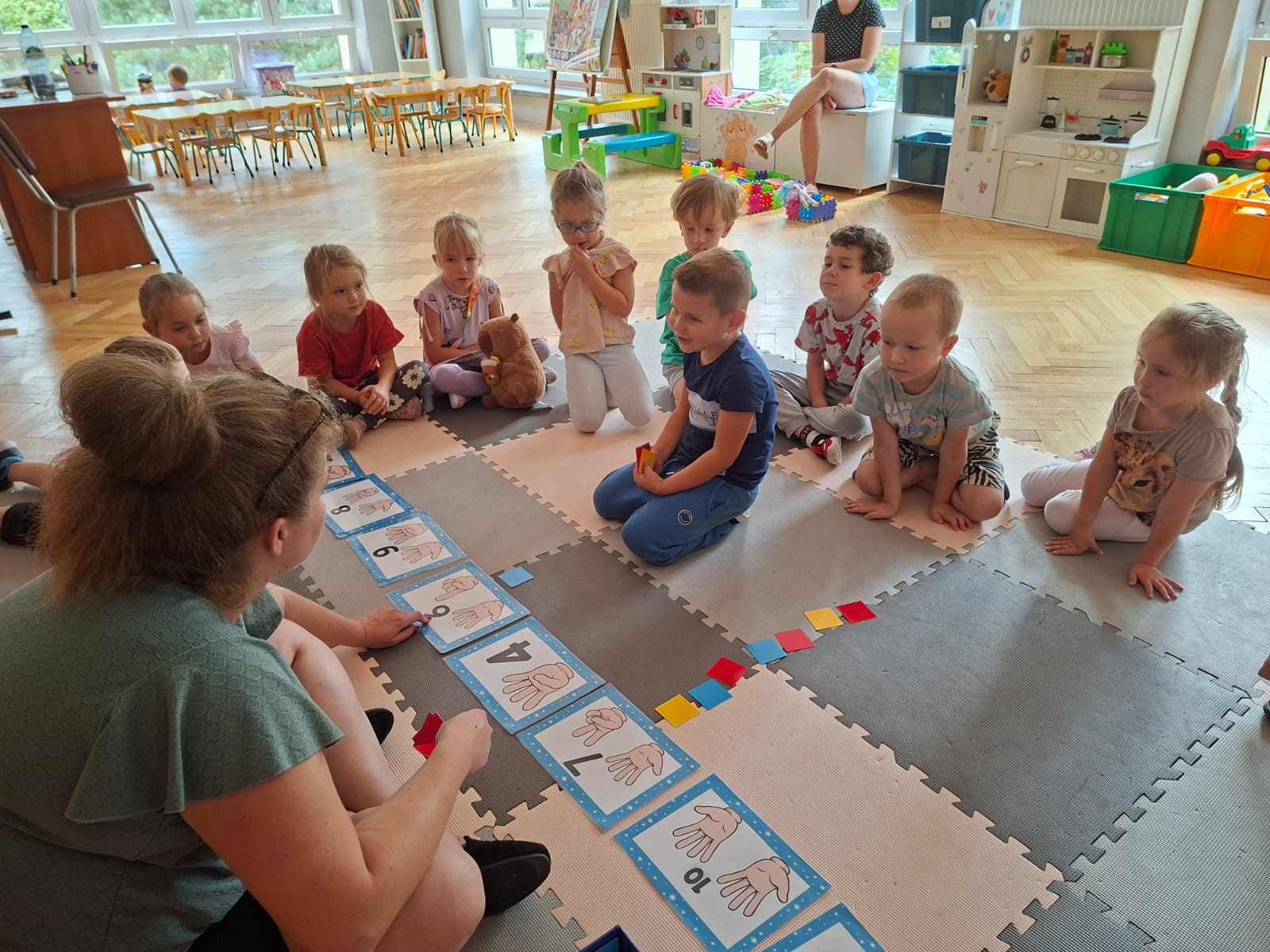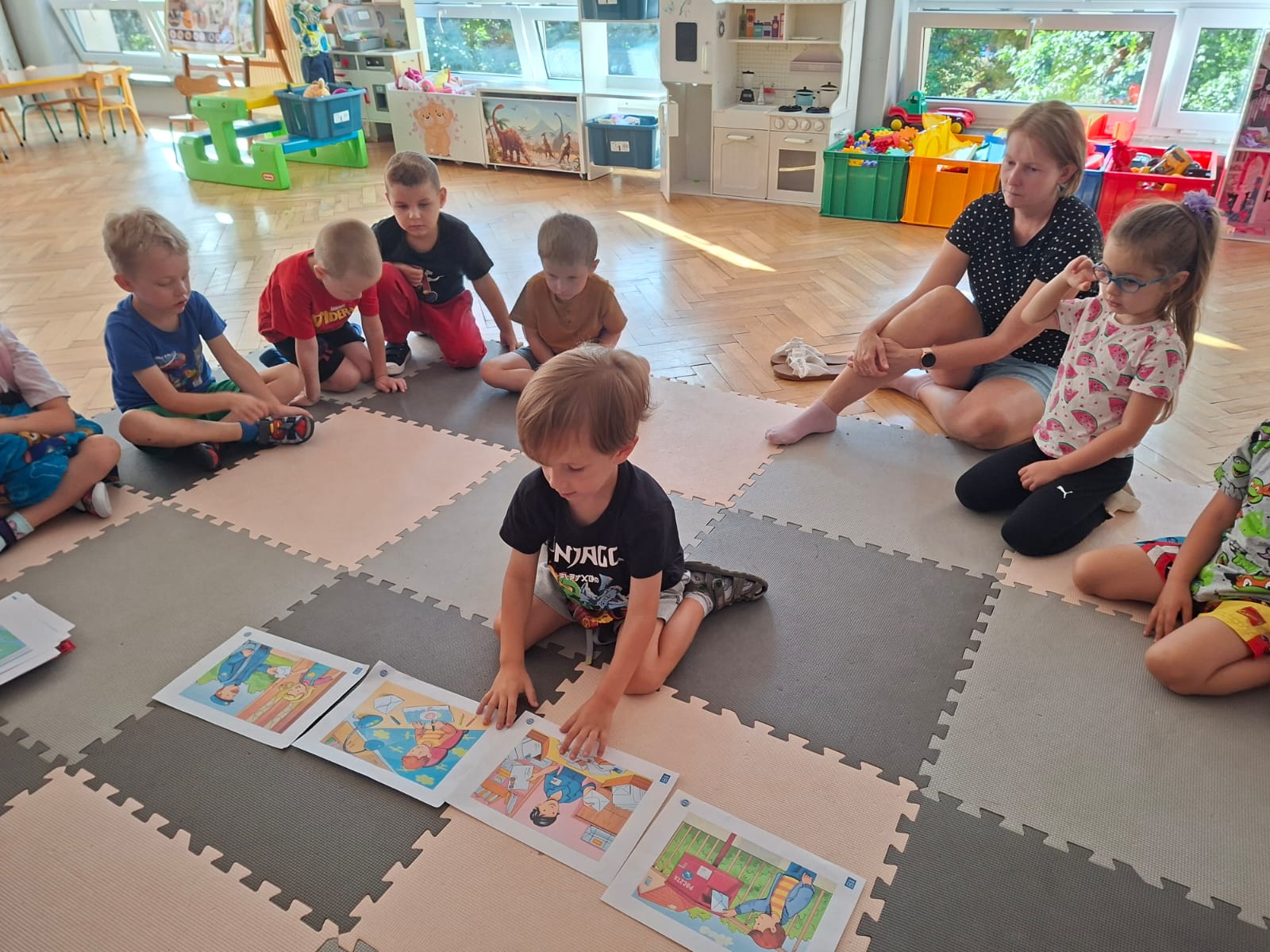 Układaliśmy misia, dom z figur geometrycznych, utrwalając ich nazwy. Przeliczyliśmy na figurach geometrycznych. Braliśmy udział w przeróżnych zabawach ruchowych. Oczywiście nie zabrakło wyjścia na plac zabaw przedszkolny.