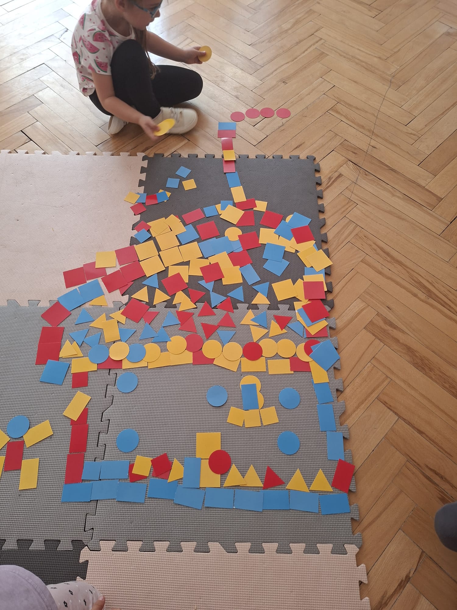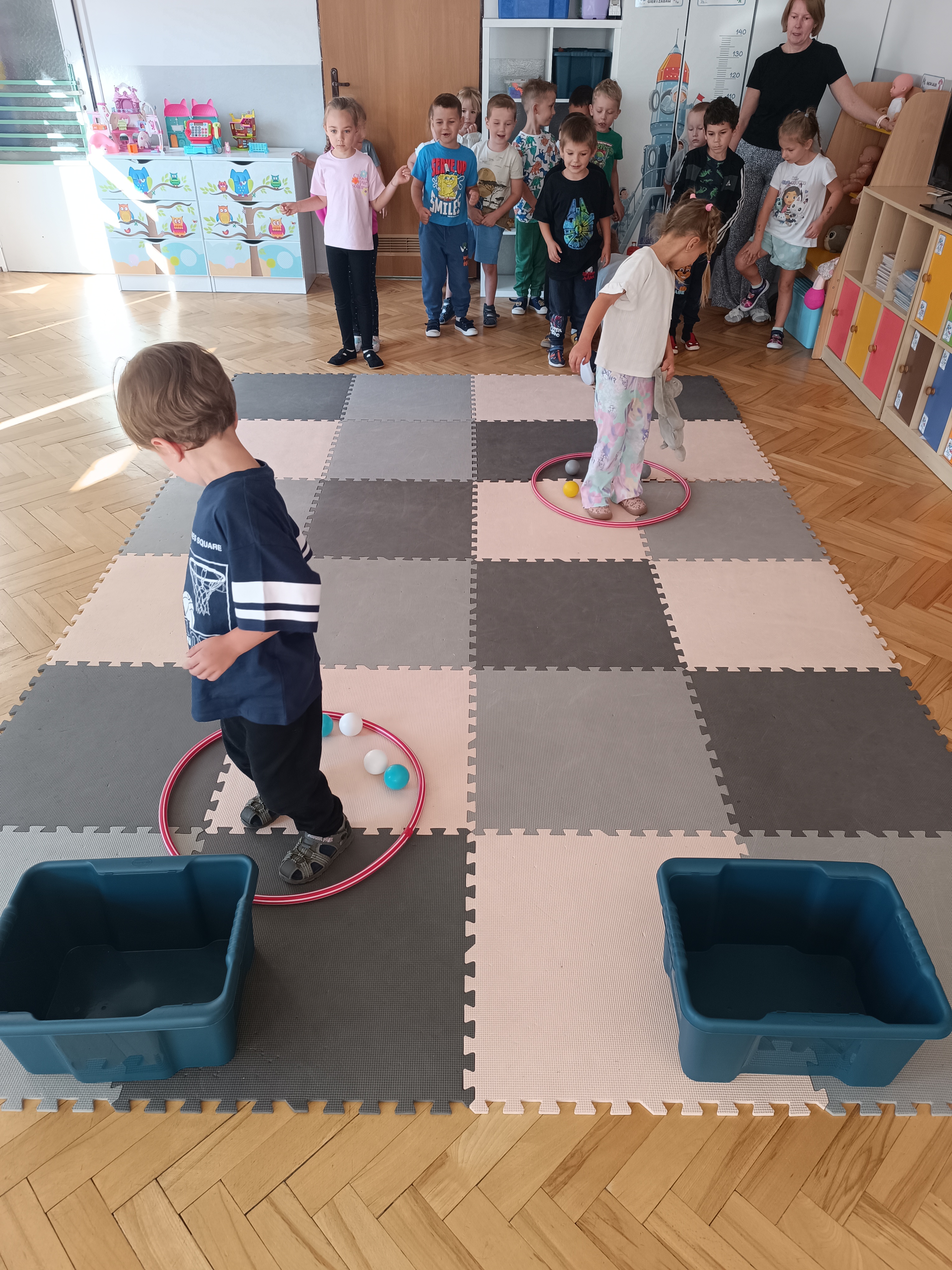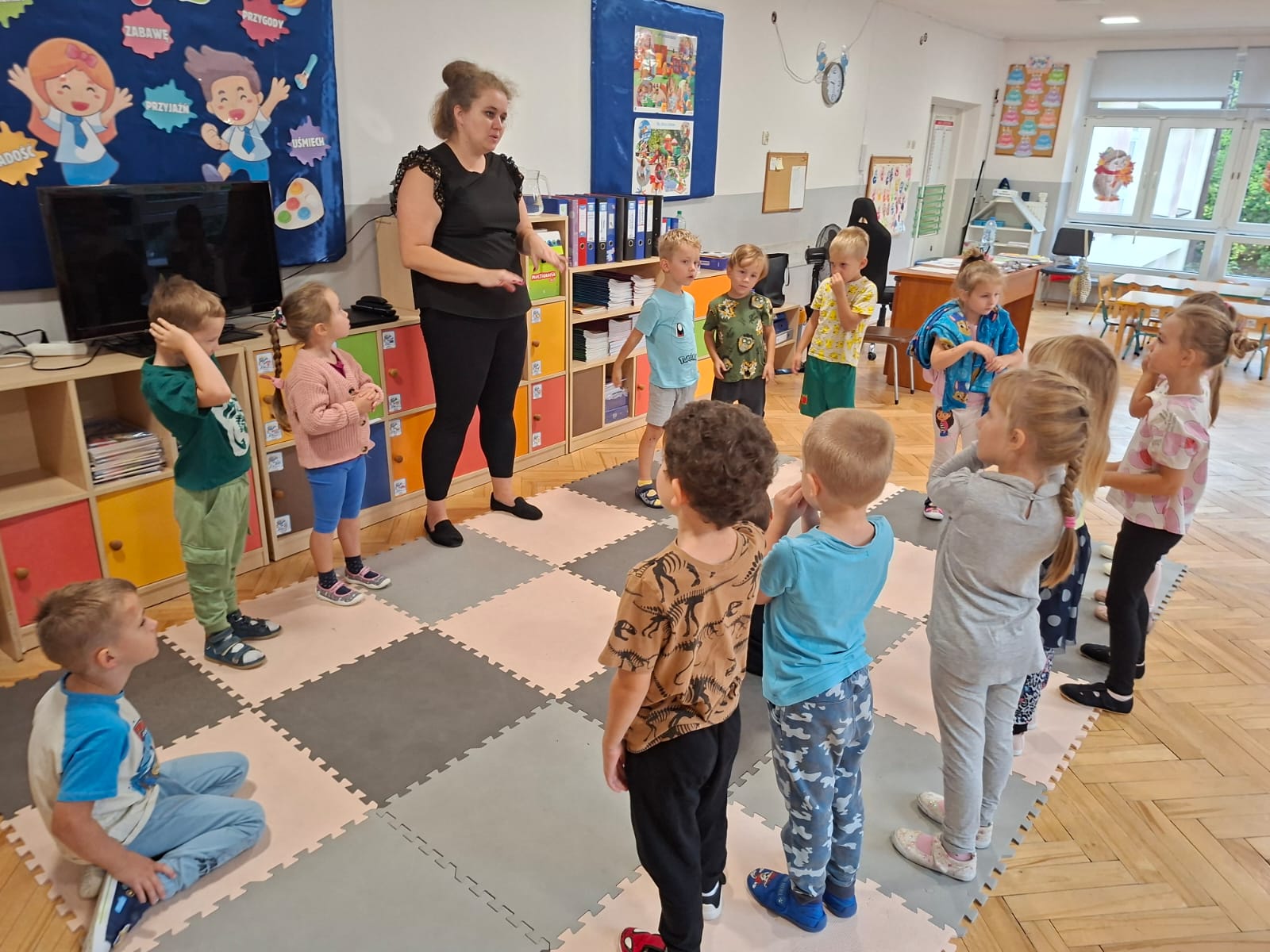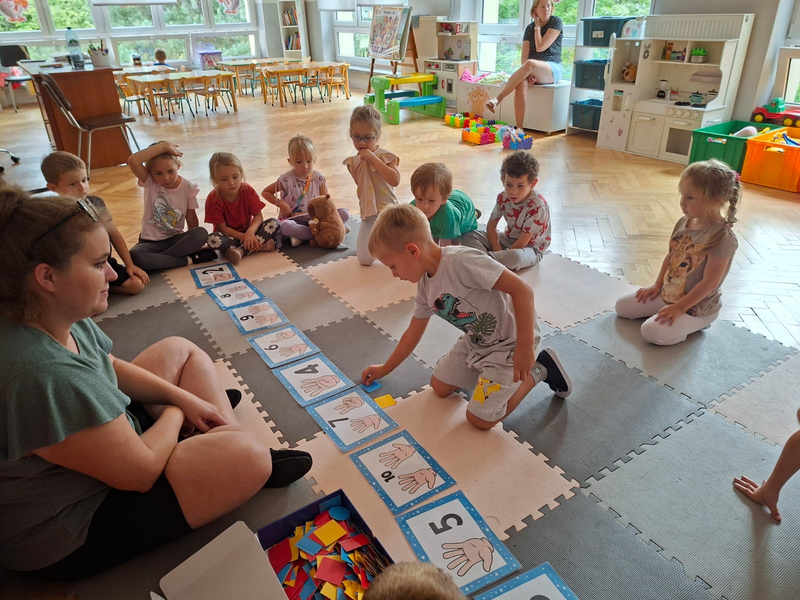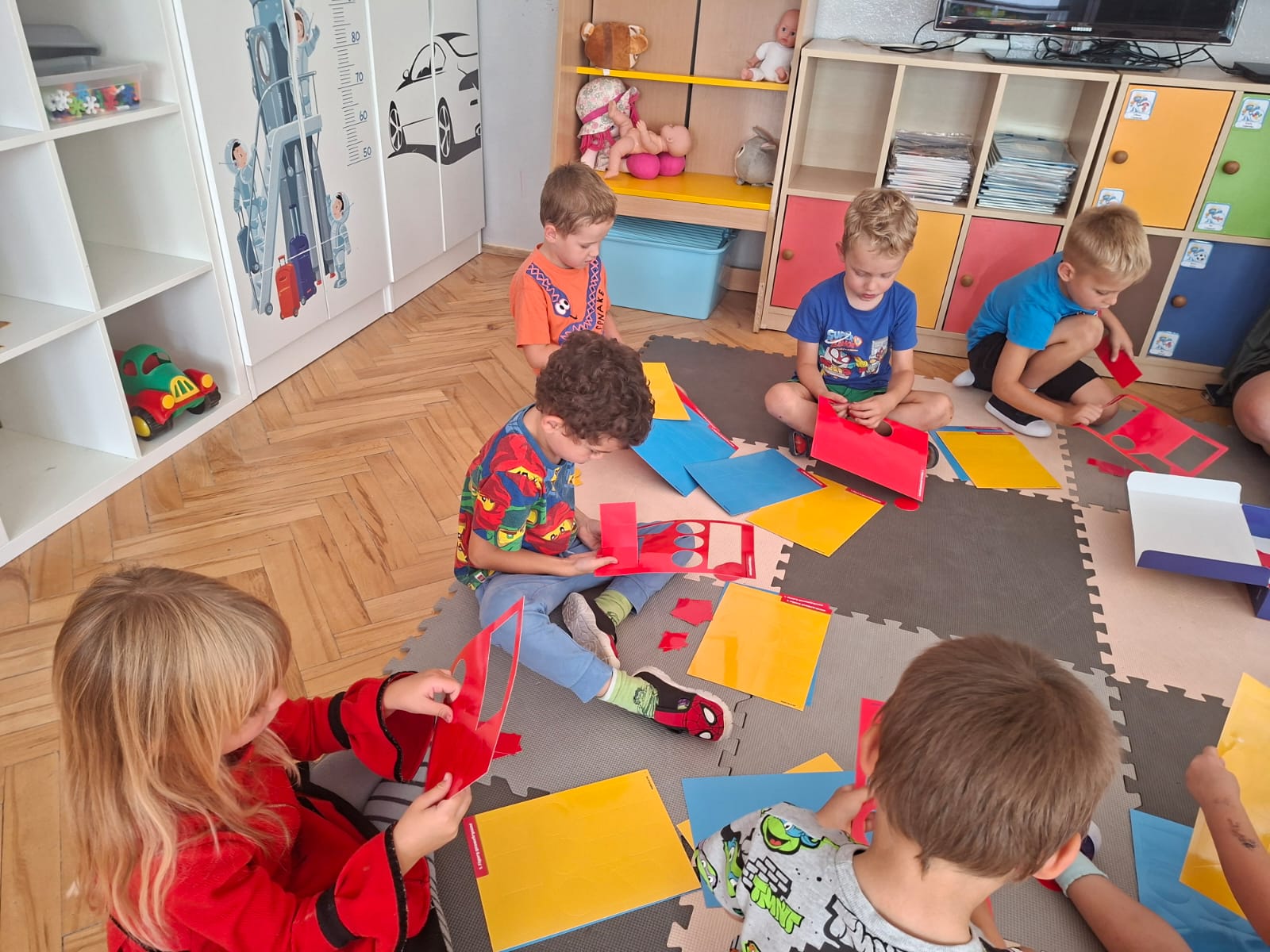 Układaliśmy misia, dom z figur geometrycznych, utrwalając ich nazwy. Przeliczyliśmy na figurach geometrycznych. Braliśmy udział w przeróżnych zabawach ruchowych. Oczywiście nie zabrakło wyjścia na plac zabaw przedszkolny.