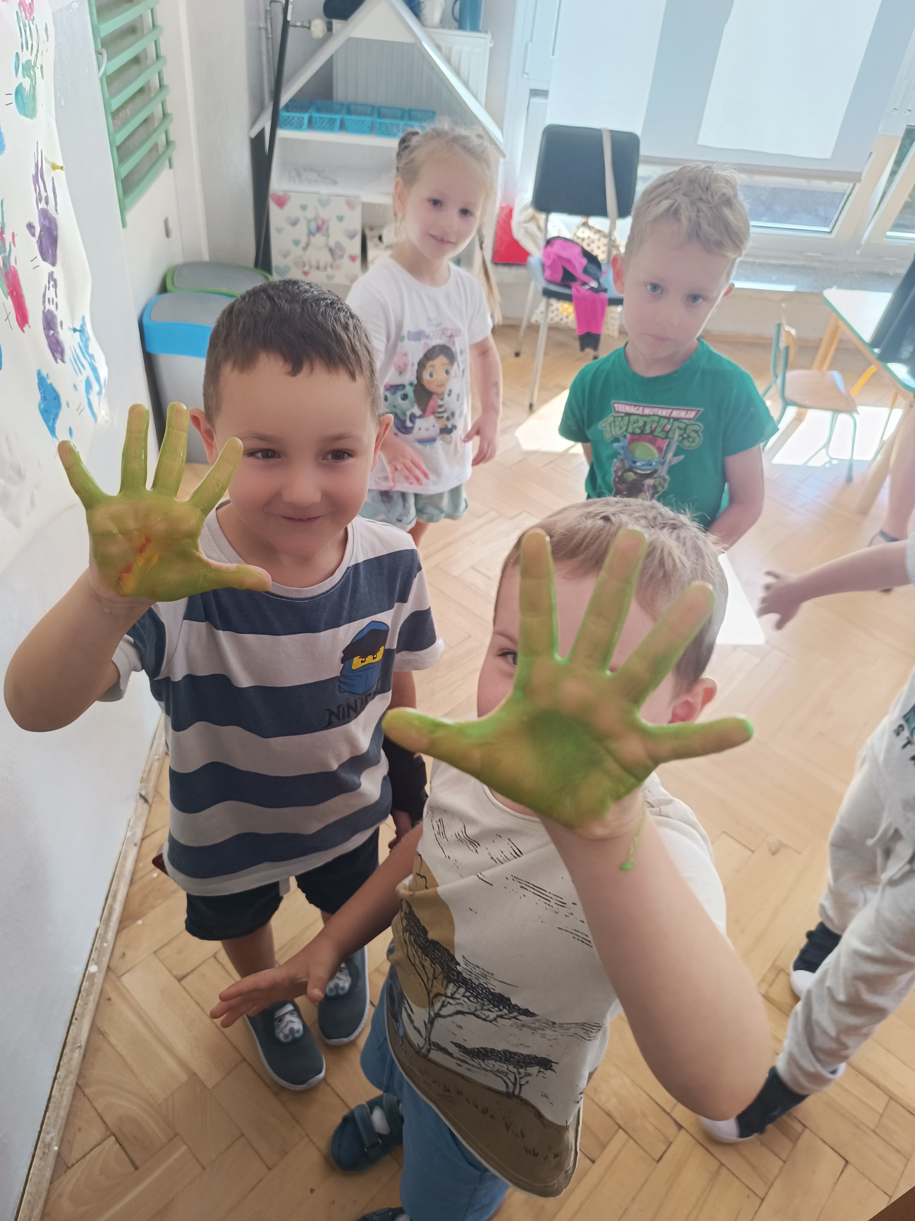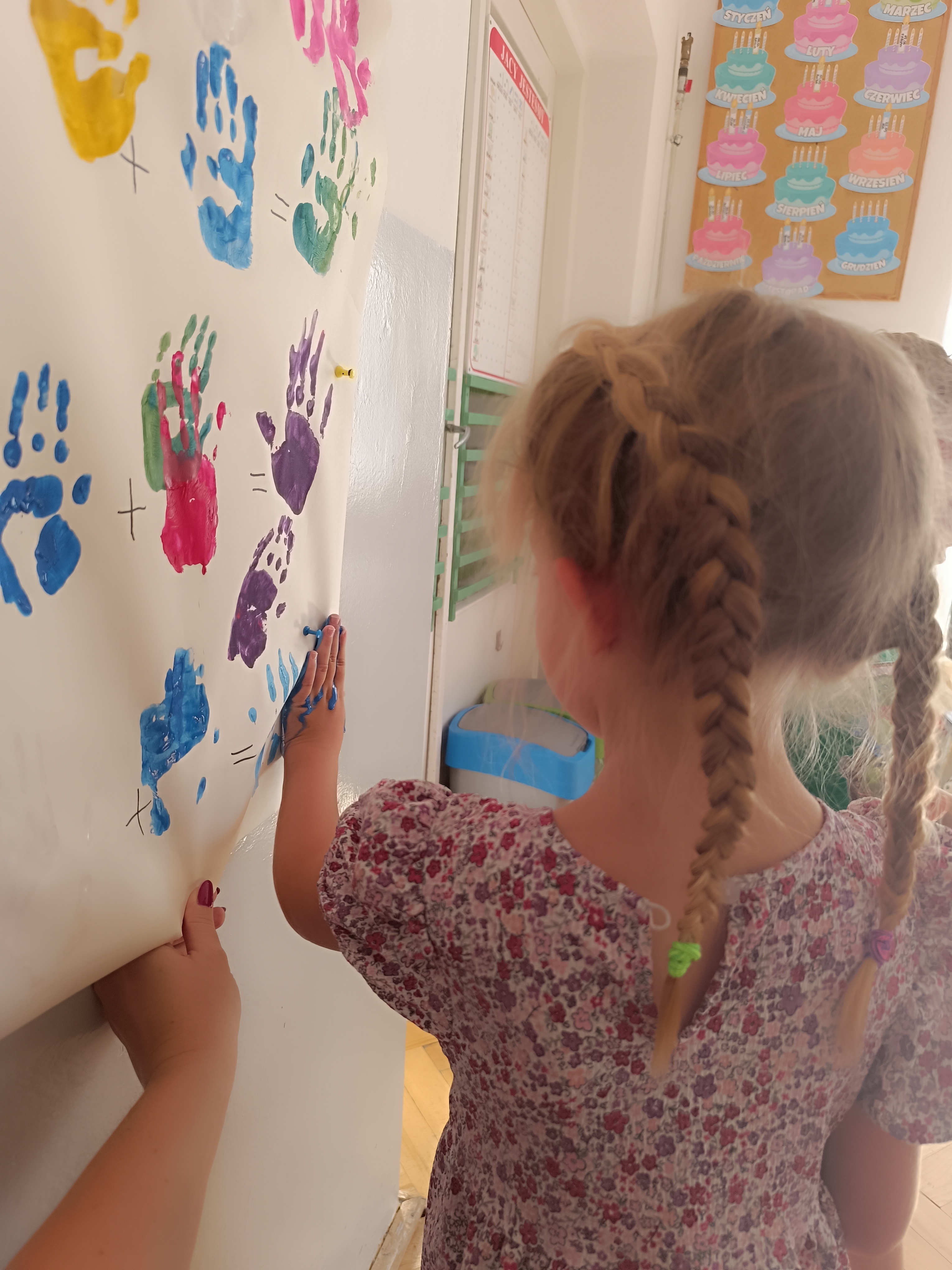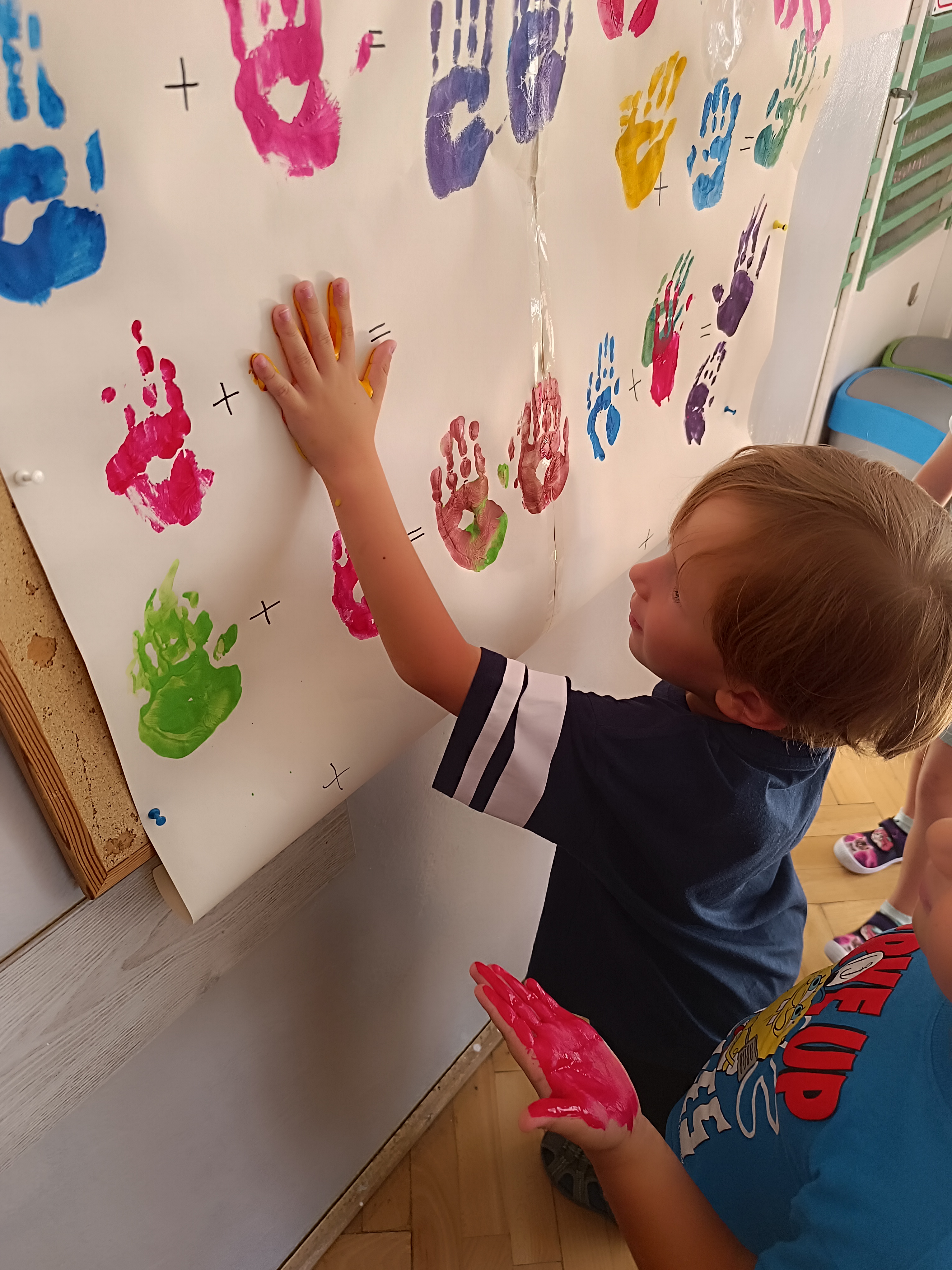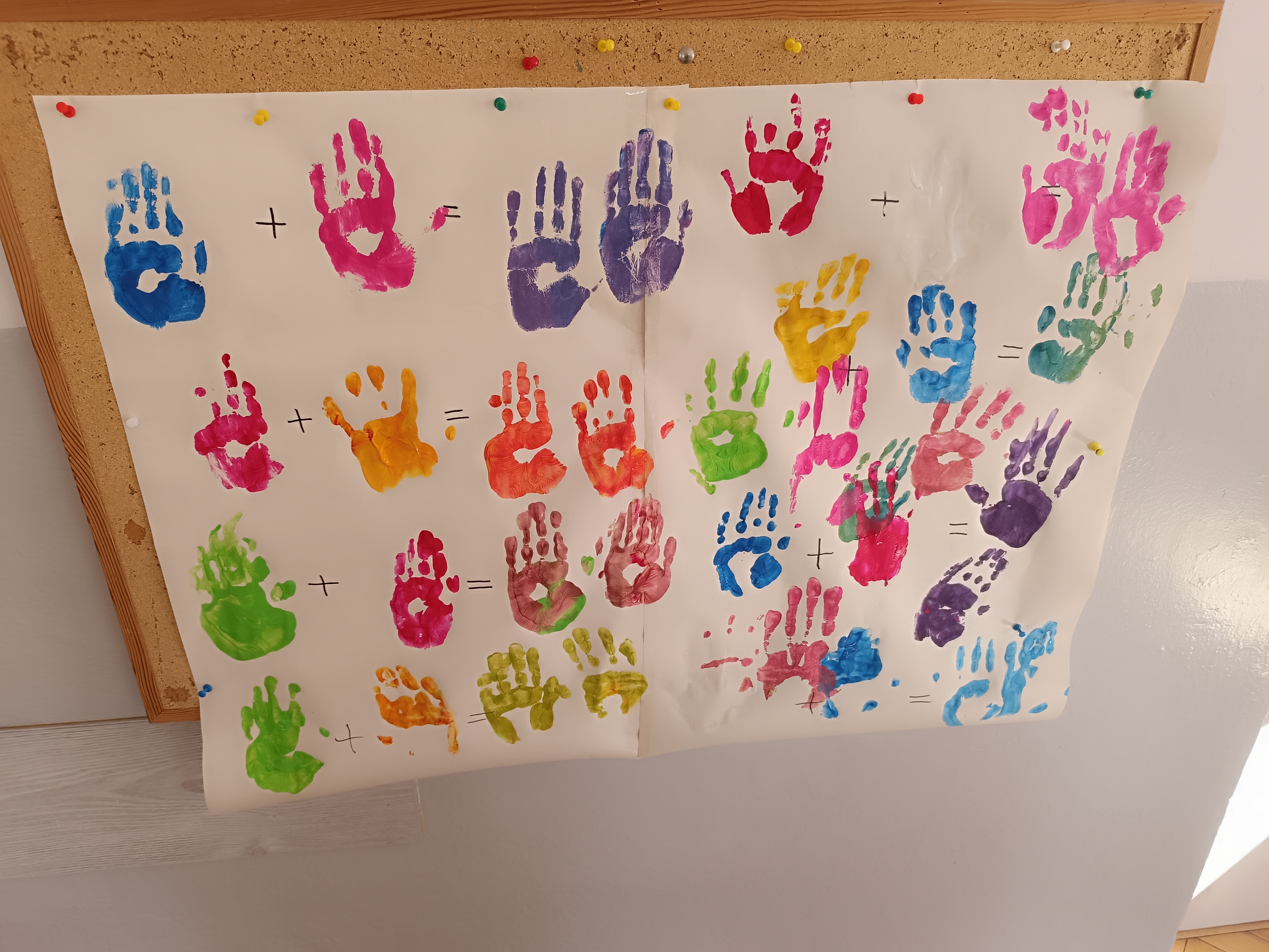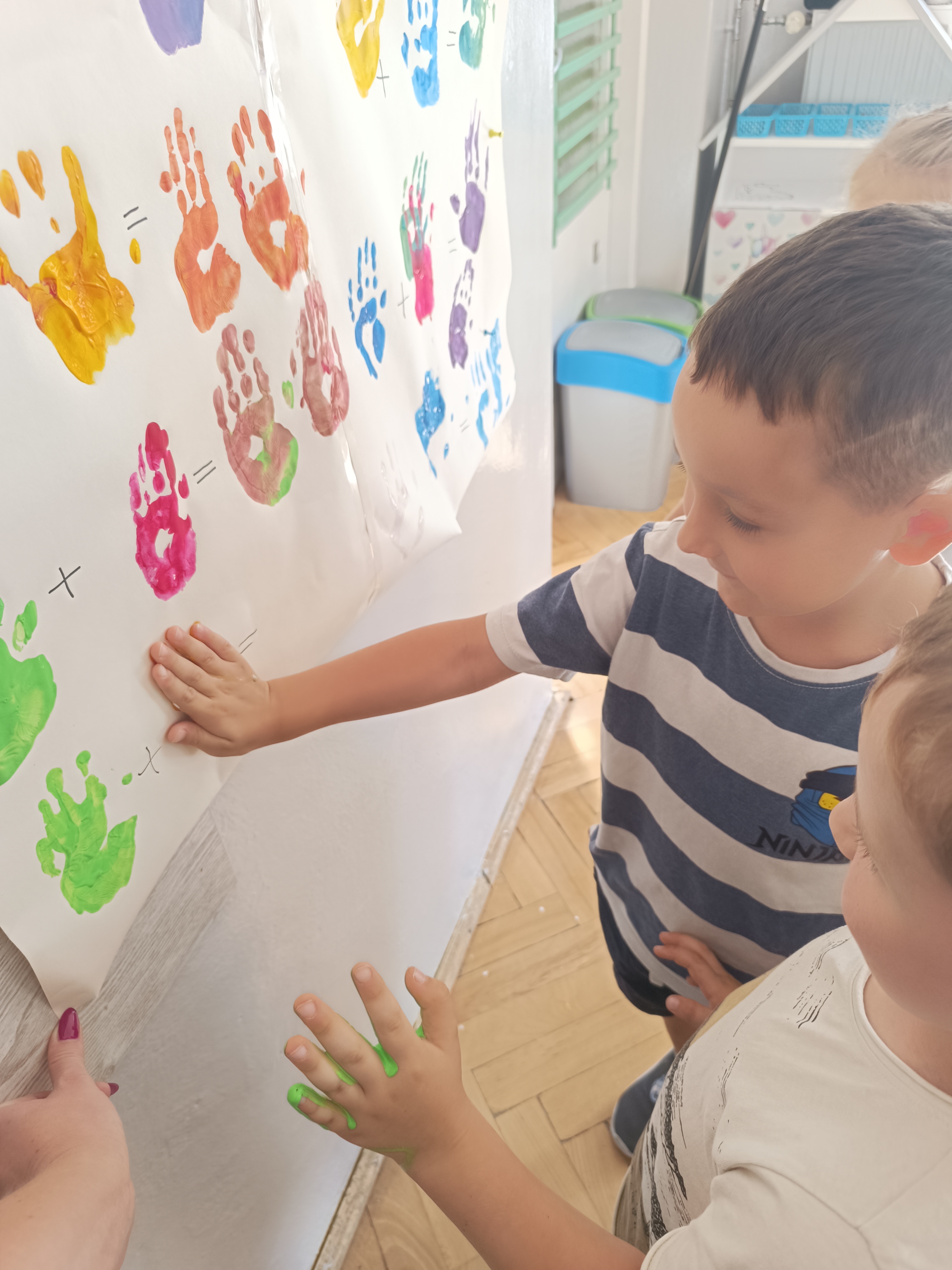 Wykonaliśmy przeróżne prace plastyczne, plastyczno - techniczne. Malowaliśmy rączki farbami, odbijając na kartce, a później mieszając kolory i sprawdzając jaki kolor powstał.