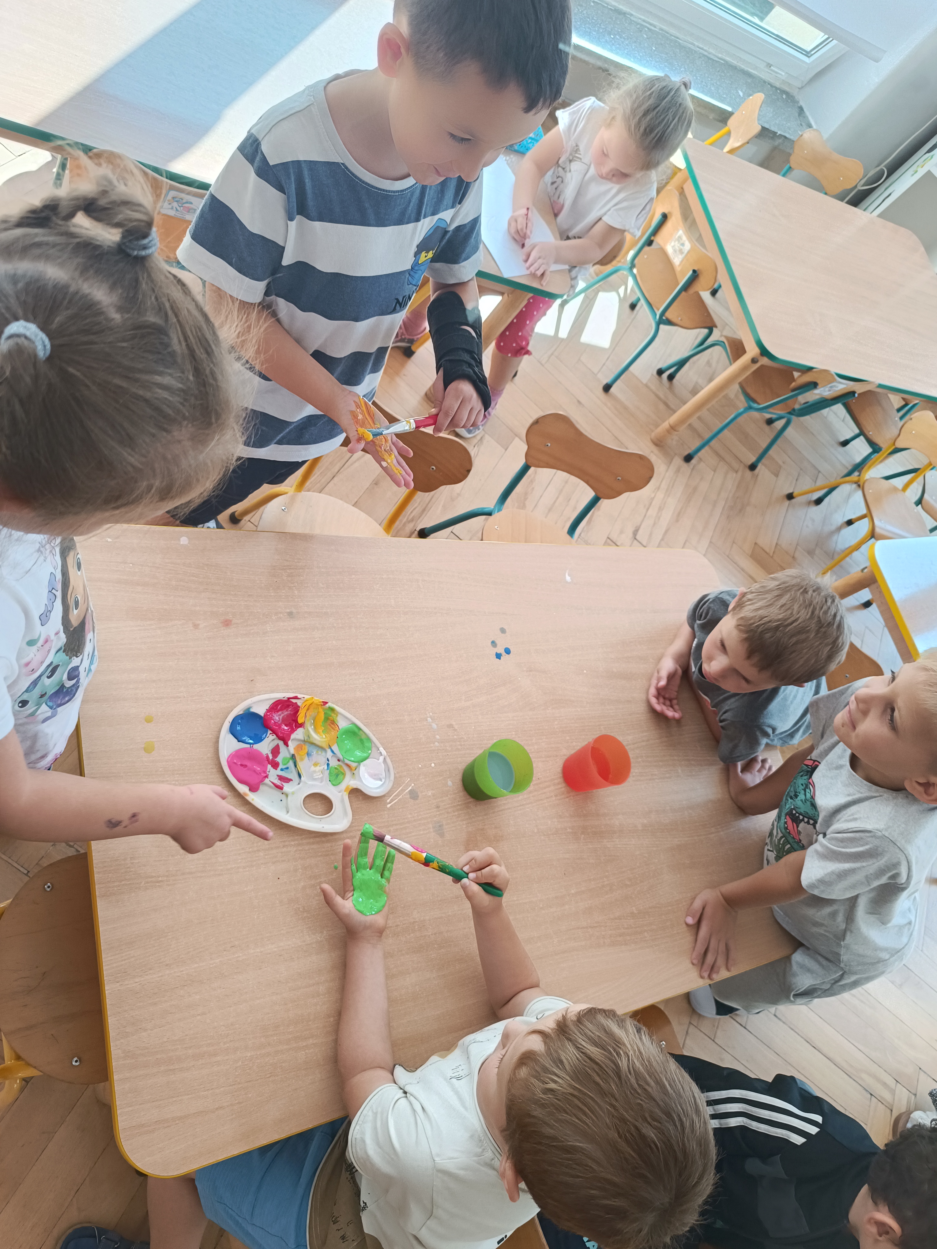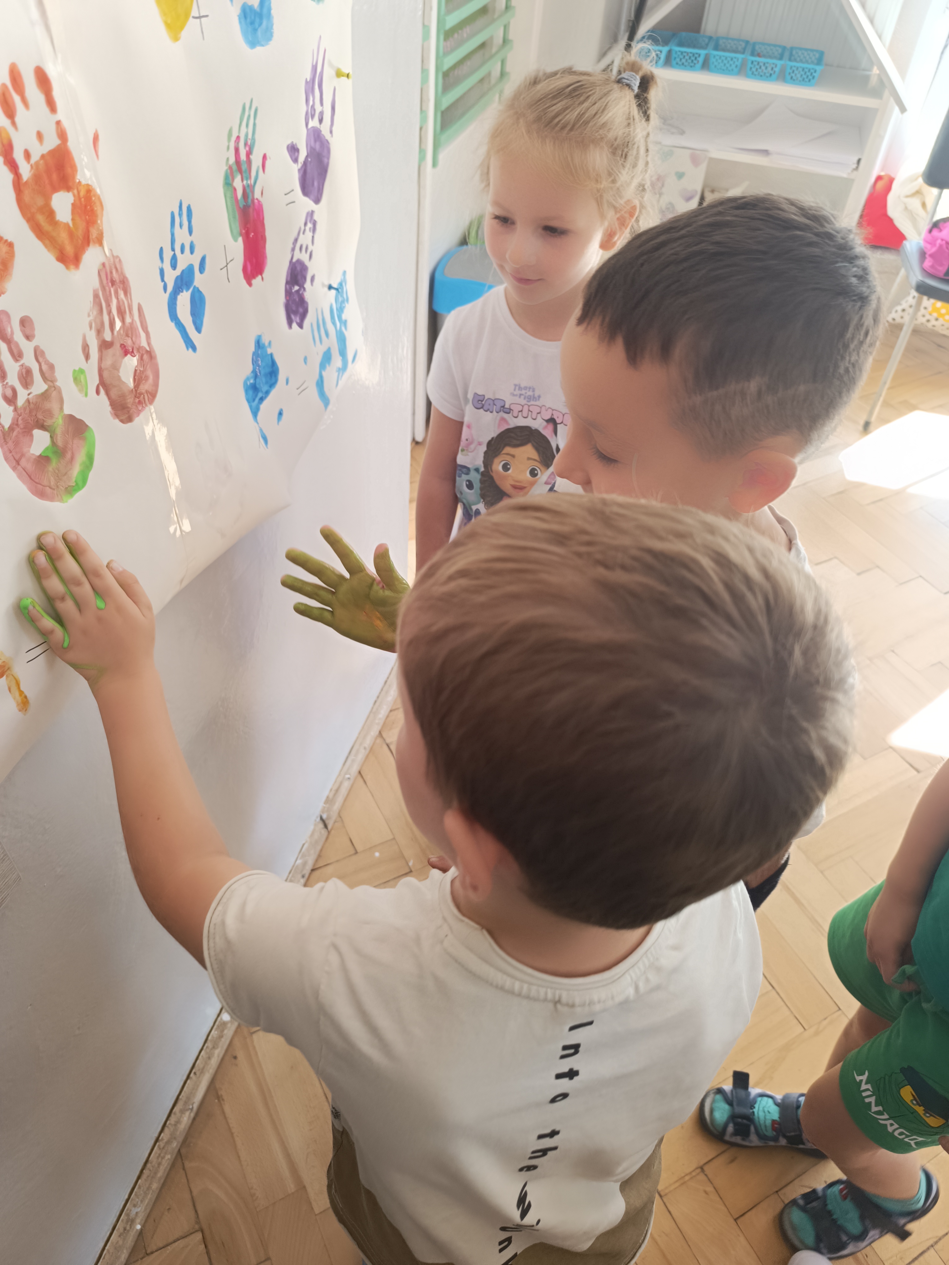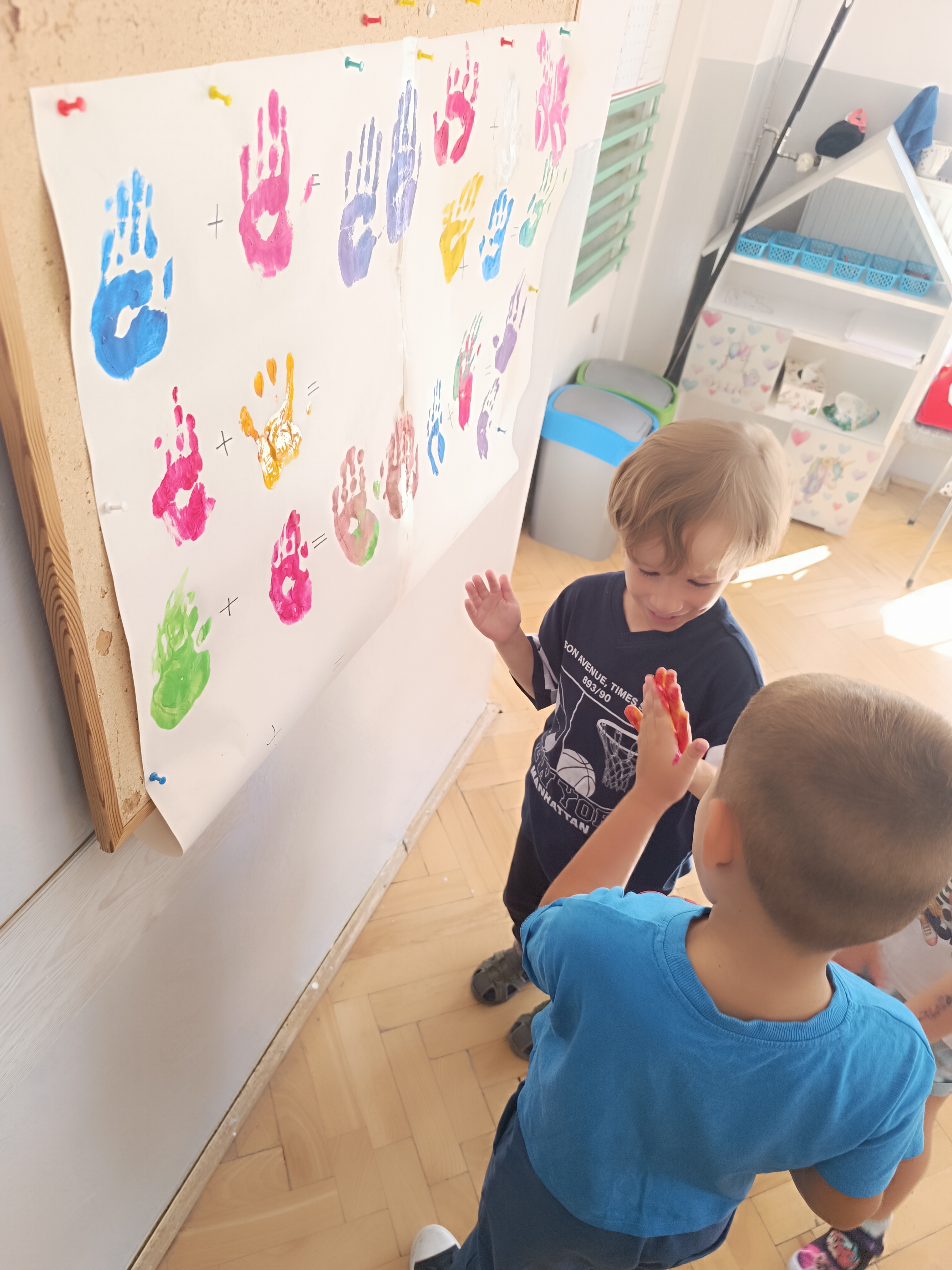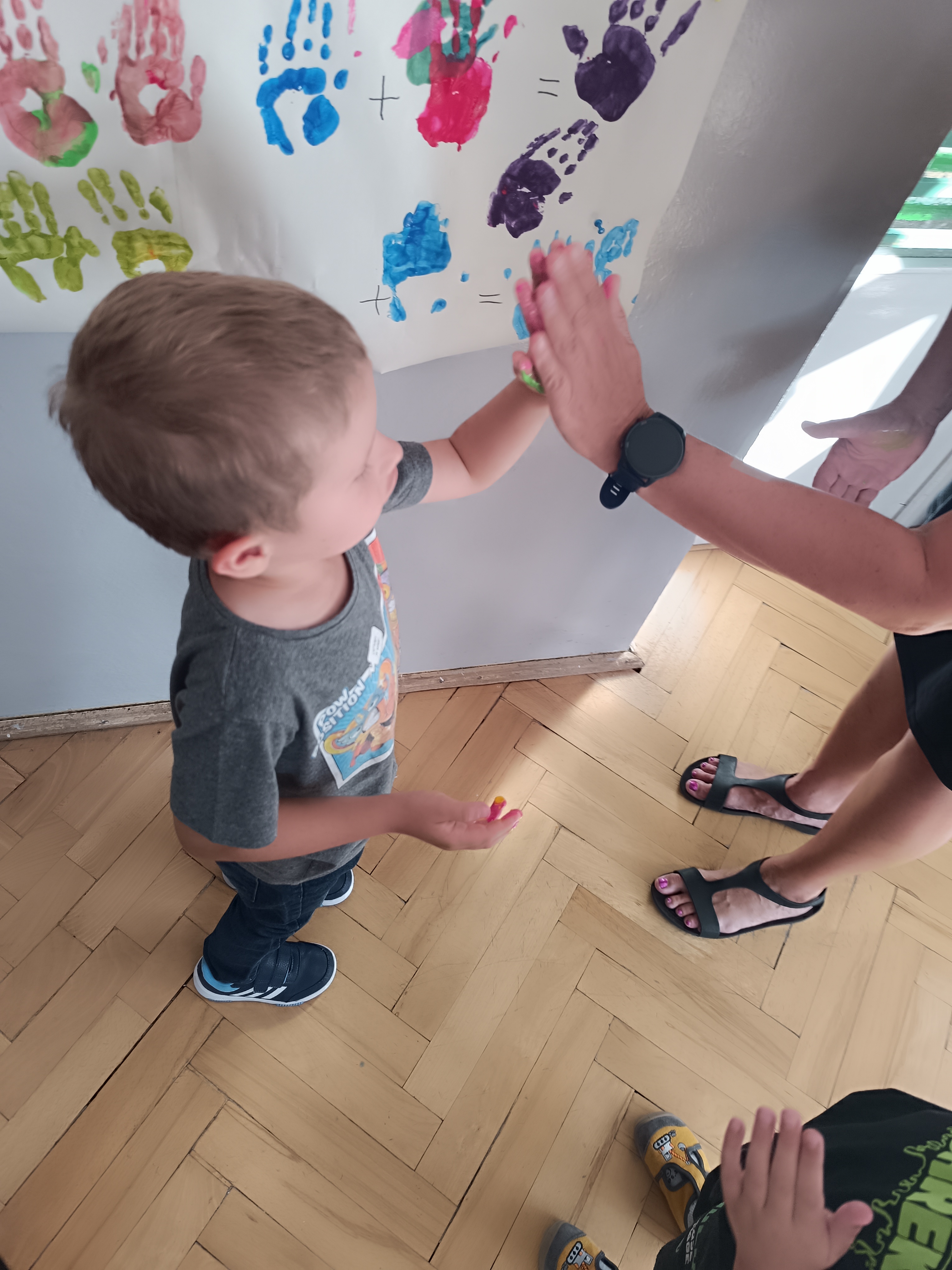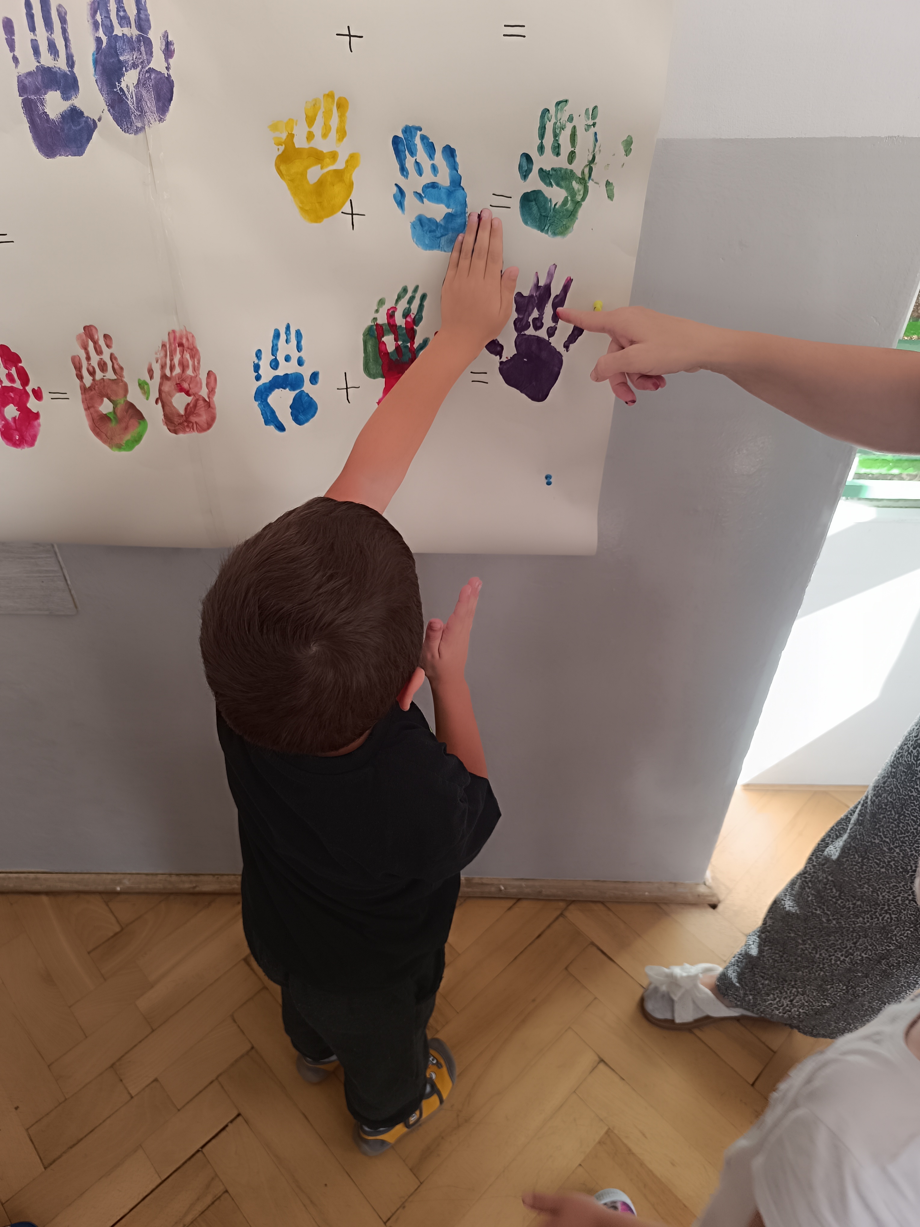 Wykonaliśmy przeróżne prace plastyczne, plastyczno - techniczne. Malowaliśmy rączki farbami, odbijając na kartce, a później mieszając kolory i sprawdzając jaki kolor powstał.