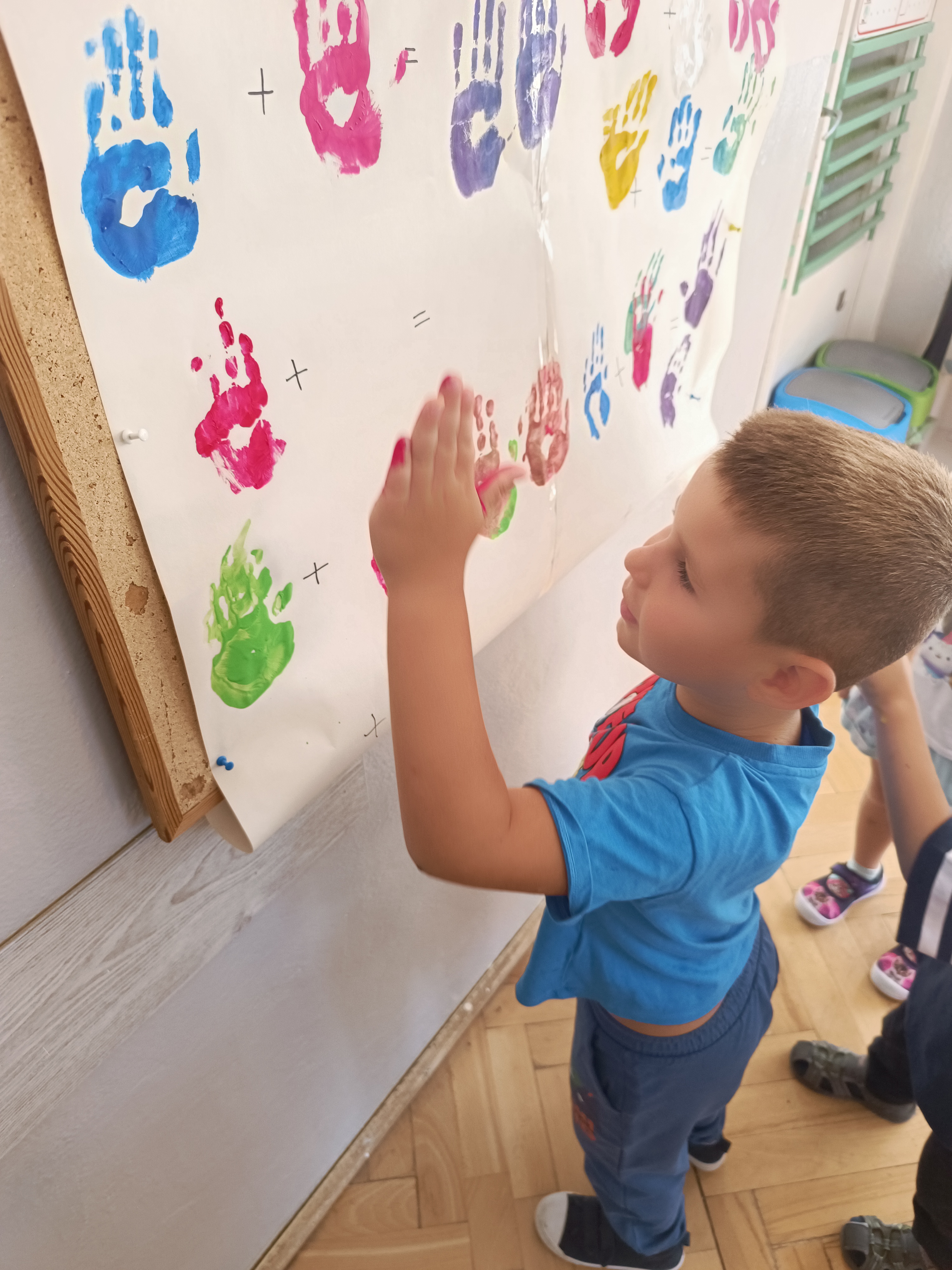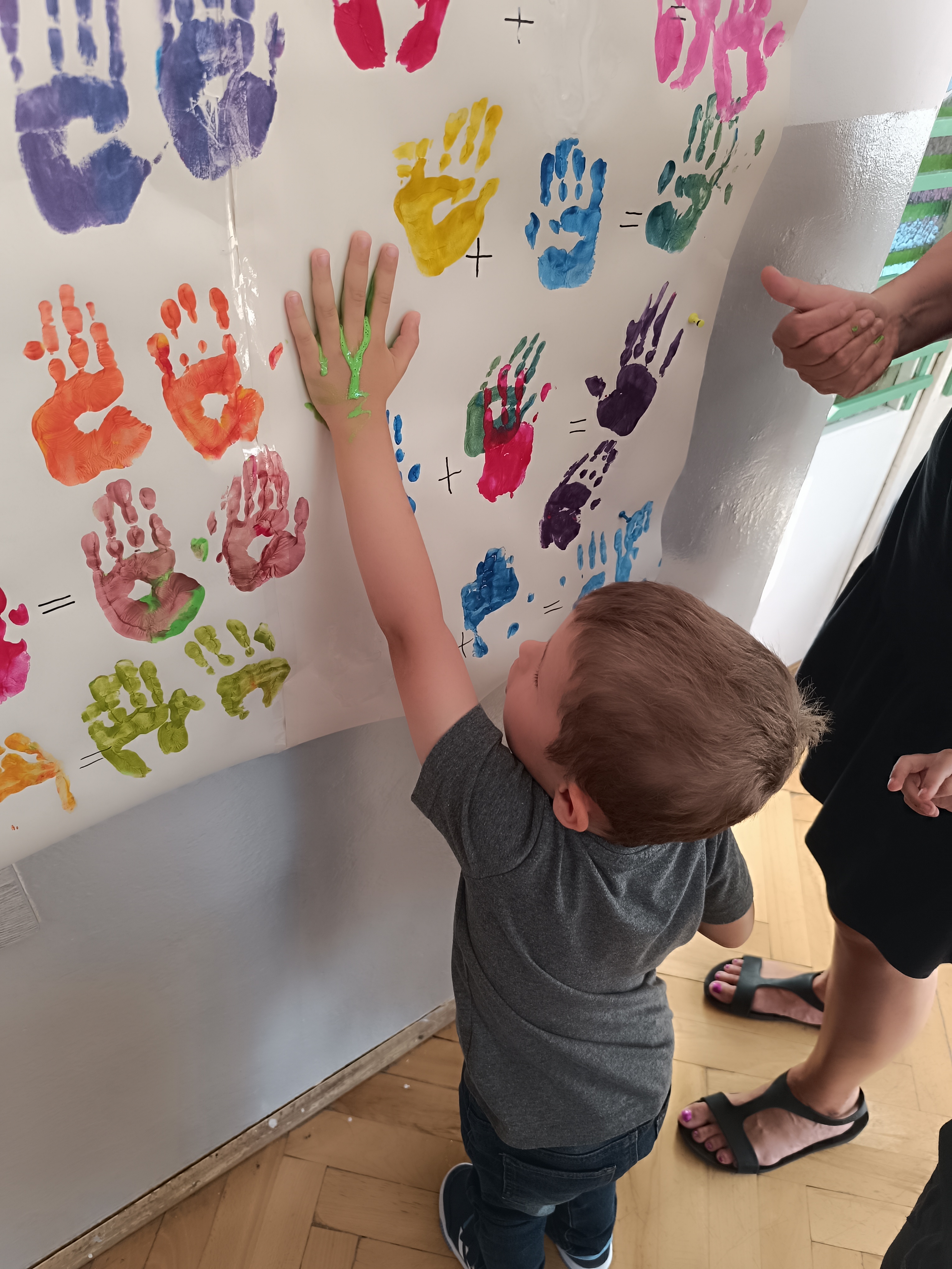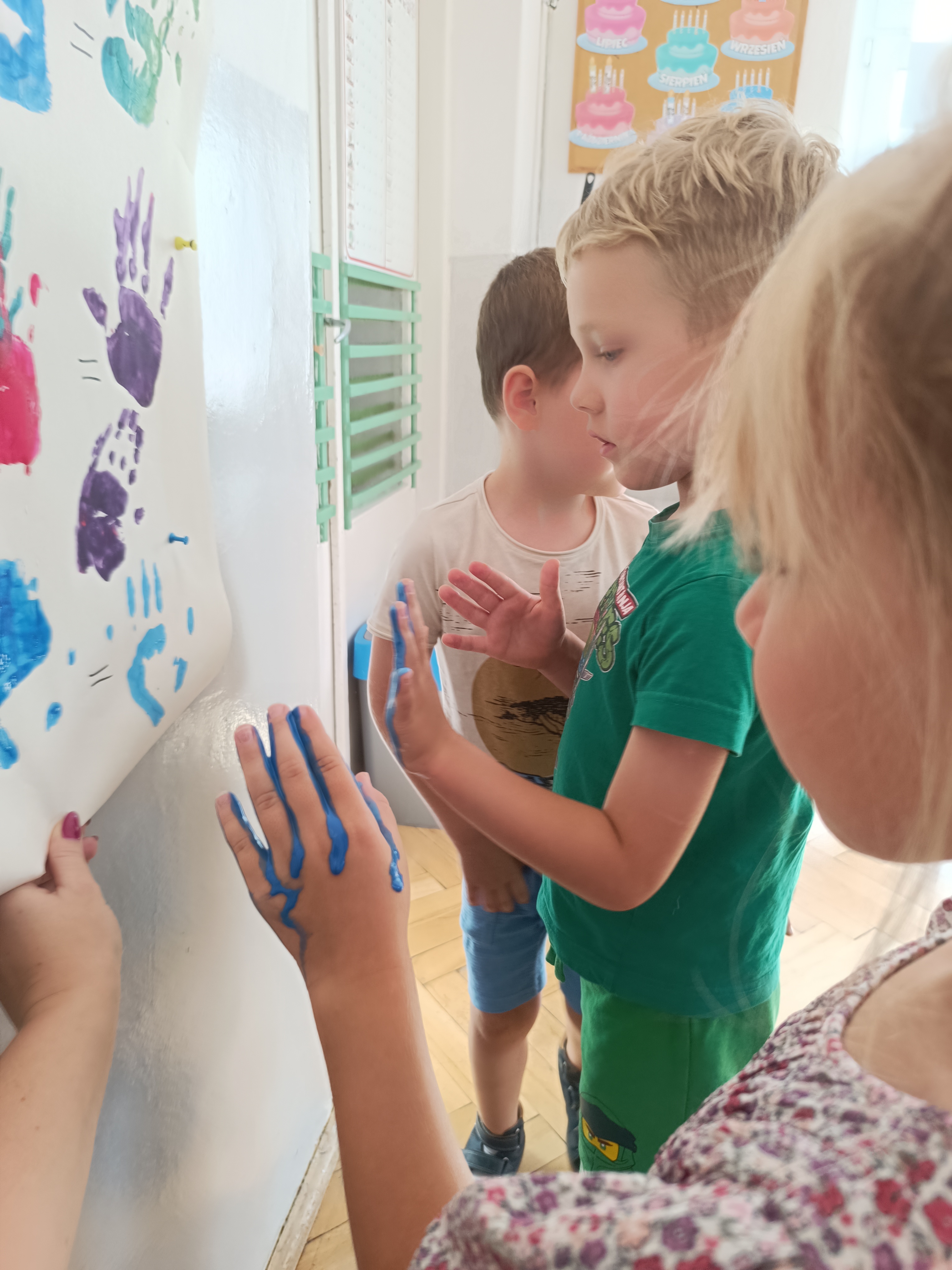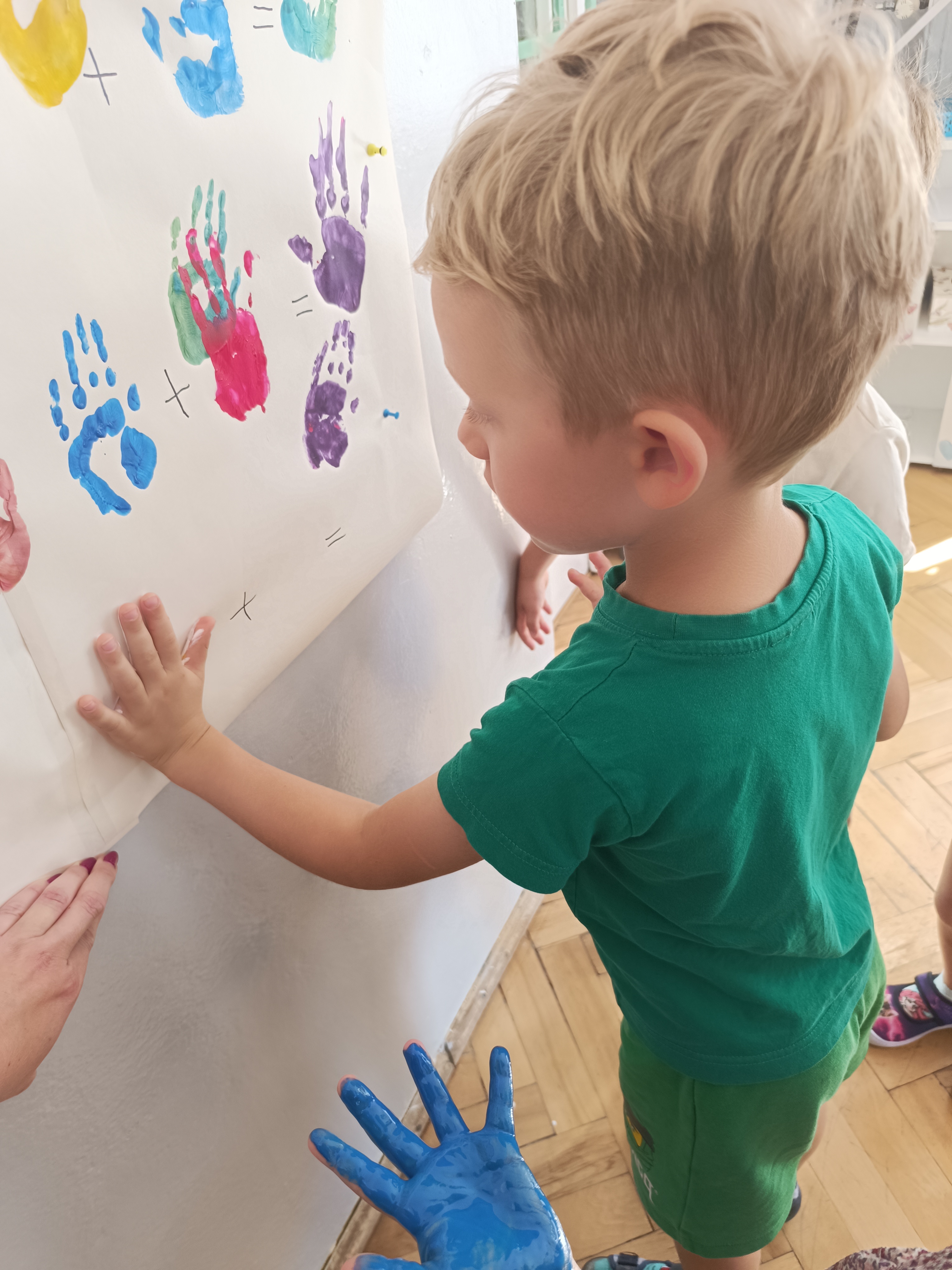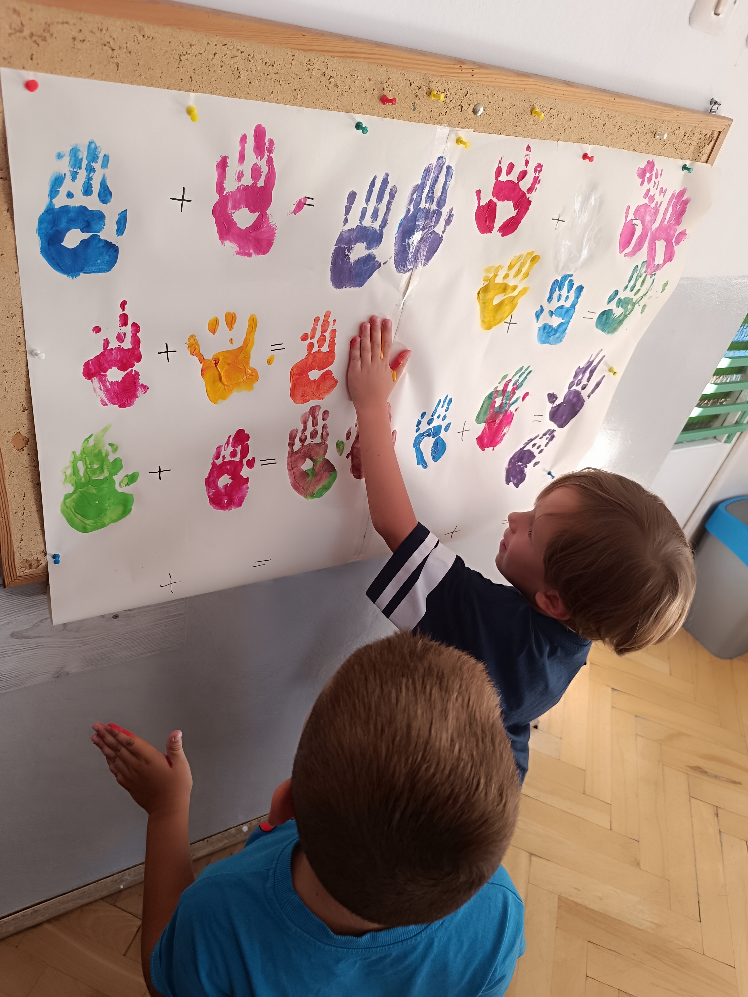 Wykonaliśmy przeróżne prace plastyczne, plastyczno - techniczne. Malowaliśmy rączki farbami, odbijając na kartce, a później mieszając kolory i sprawdzając jaki kolor powstał.