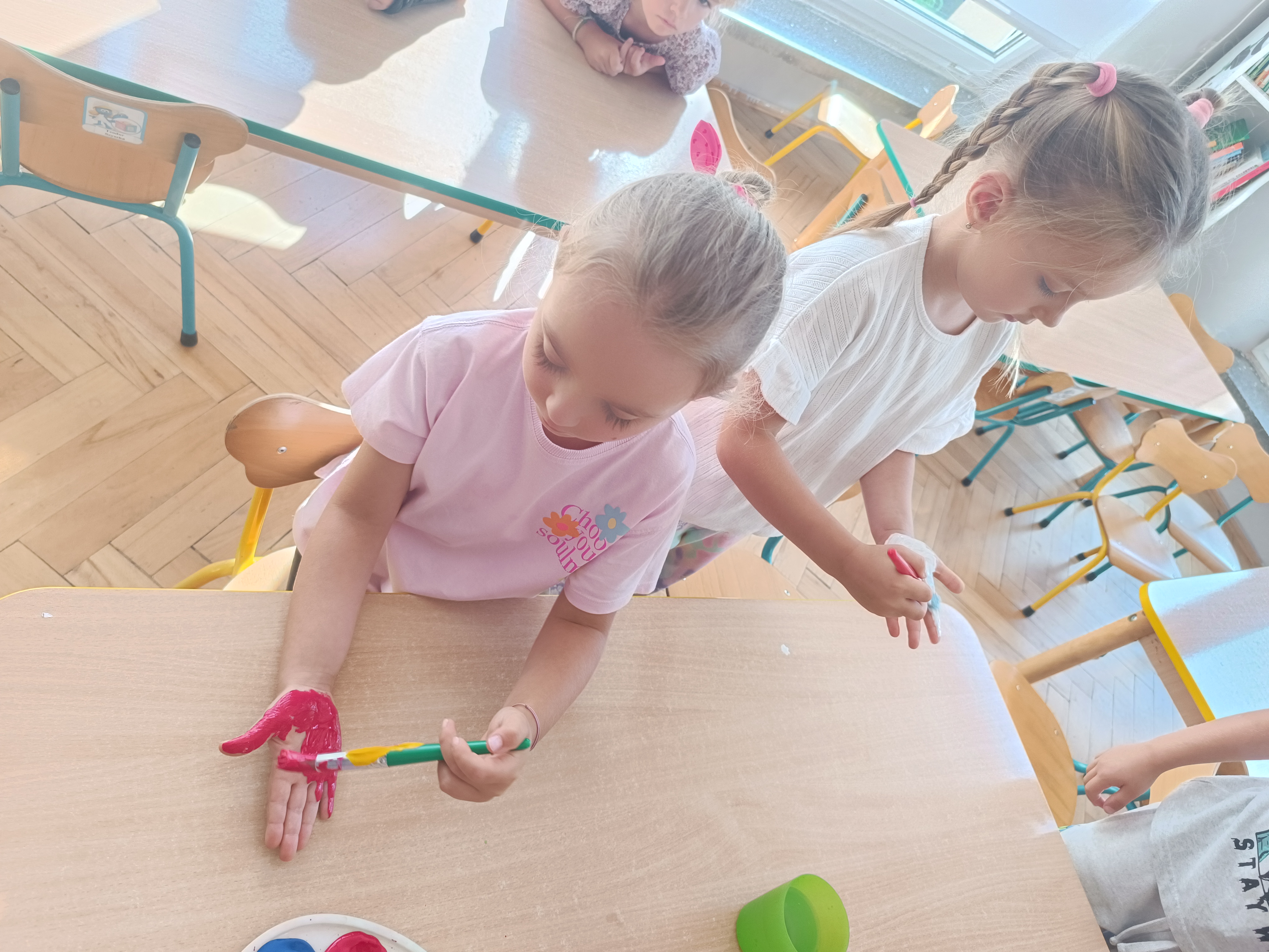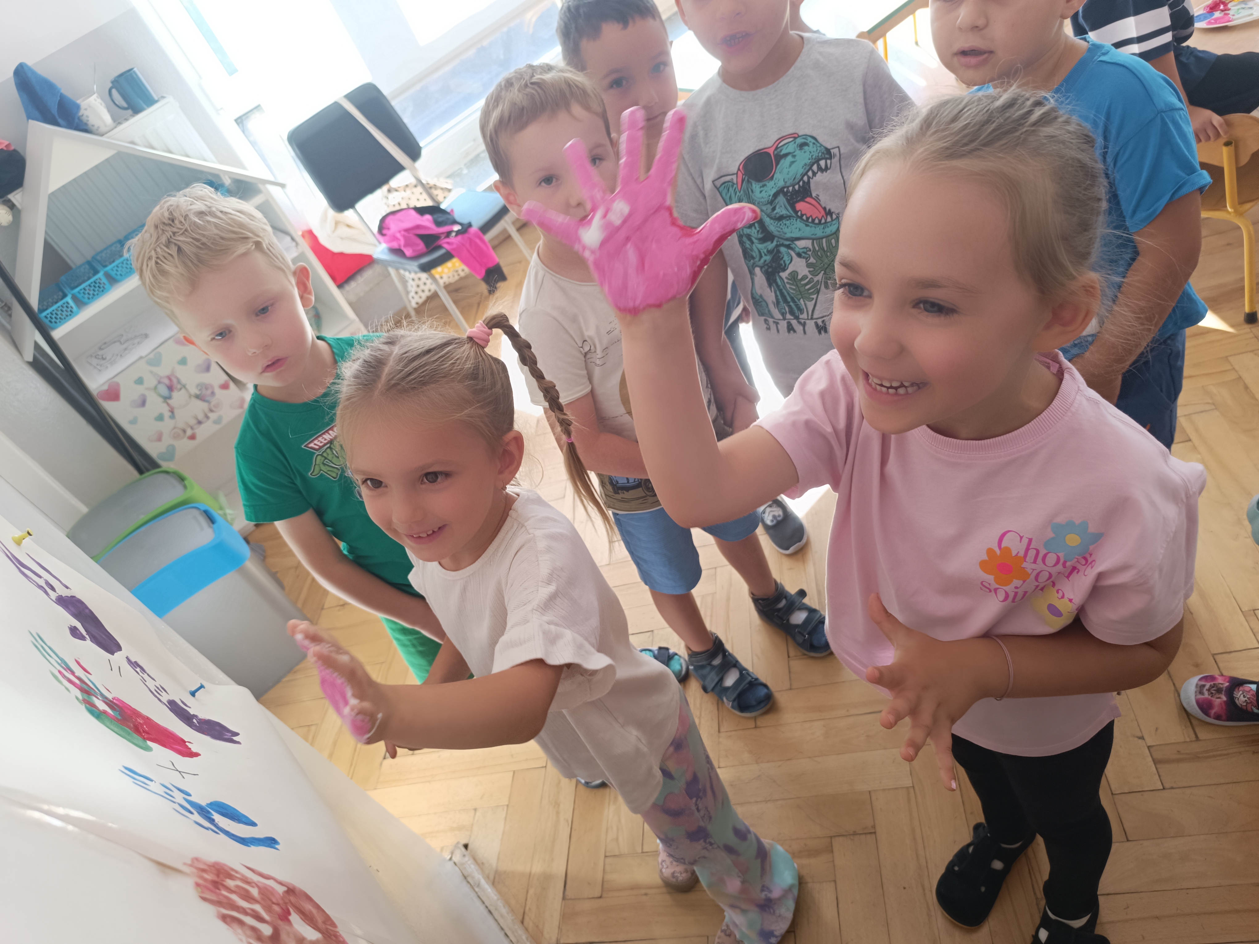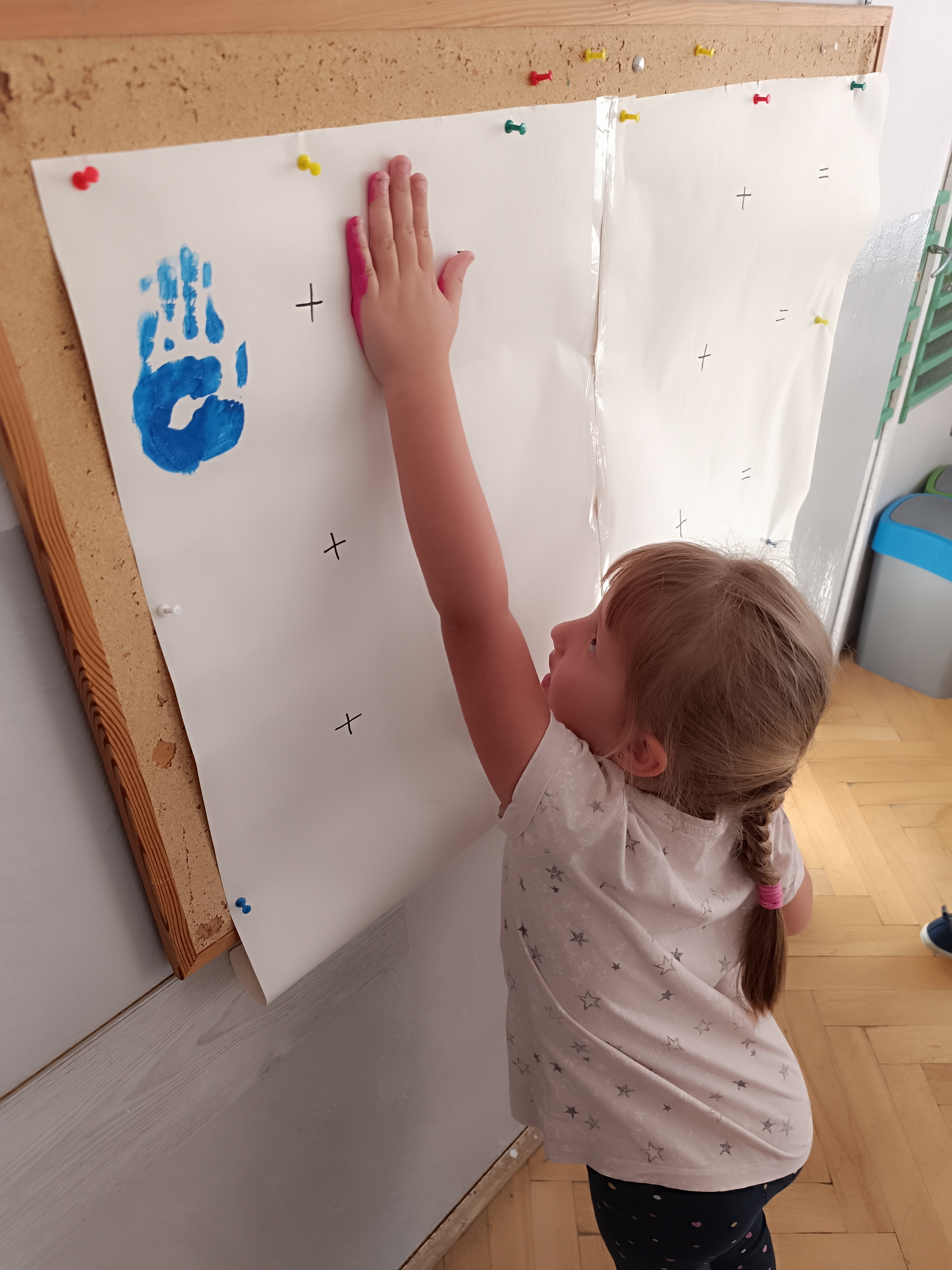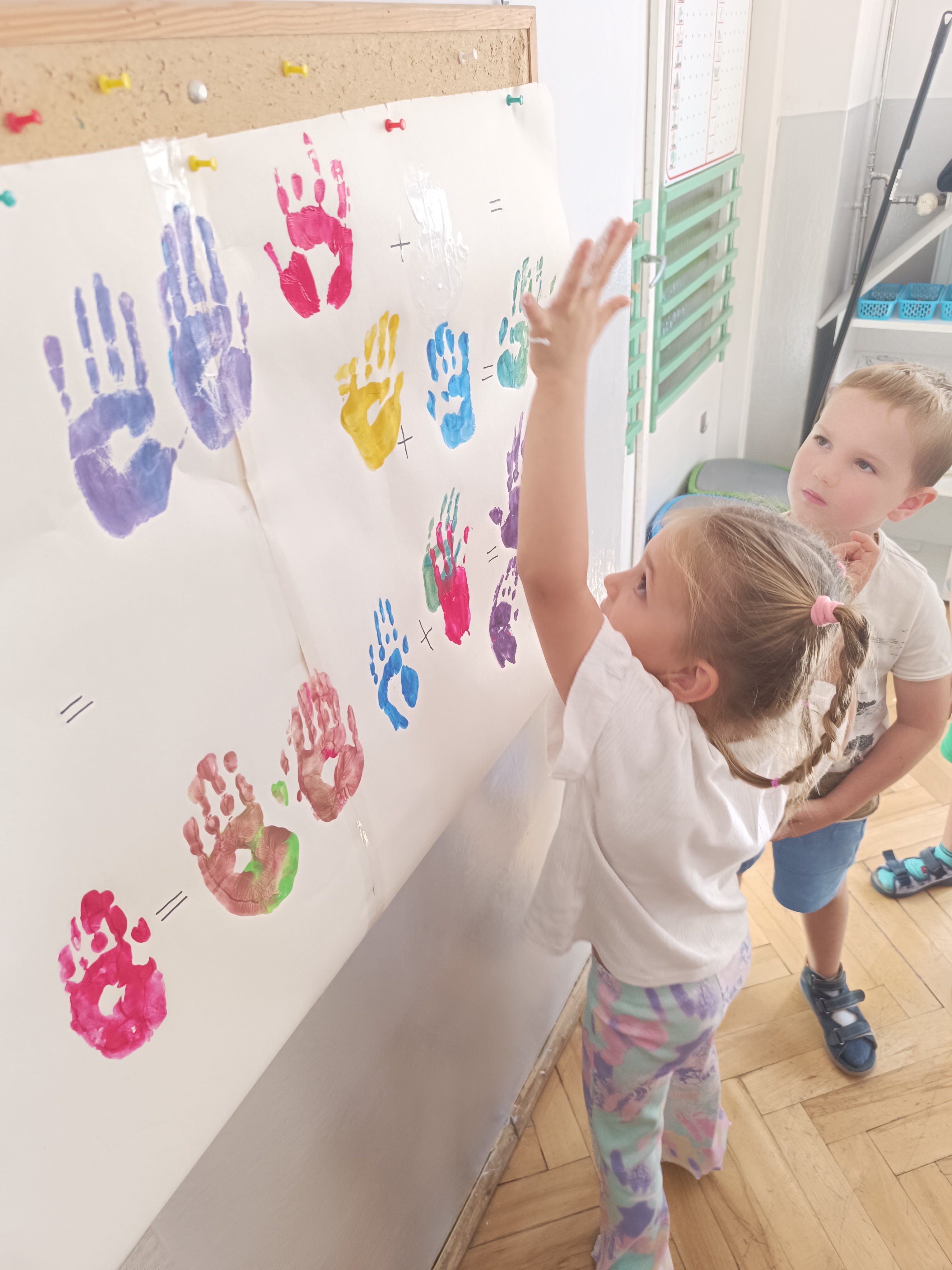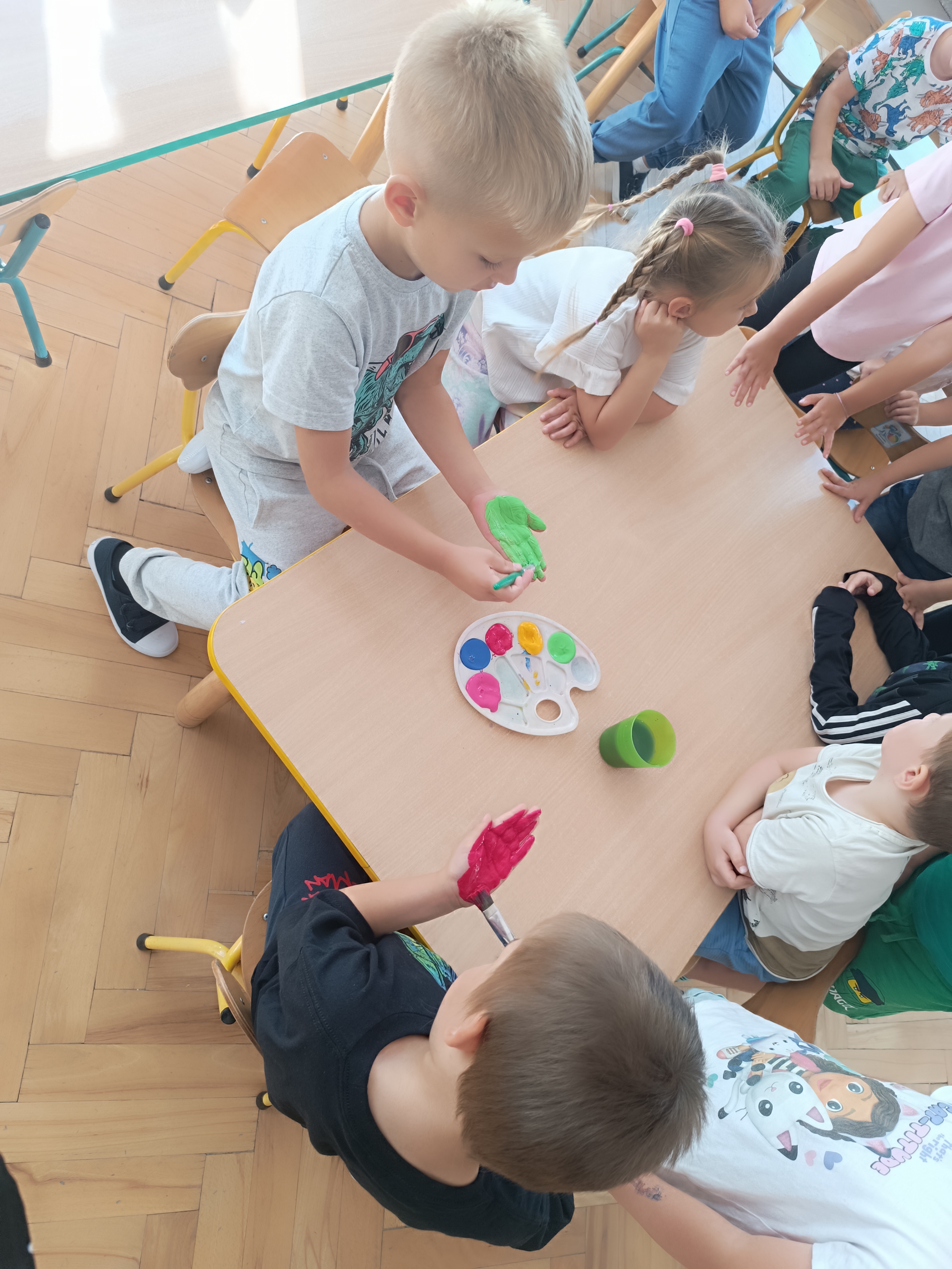Wykonaliśmy przeróżne prace plastyczne, plastyczno - techniczne. Malowaliśmy rączki farbami, odbijając na kartce, a później mieszając kolory i sprawdzając jaki kolor powstał.
