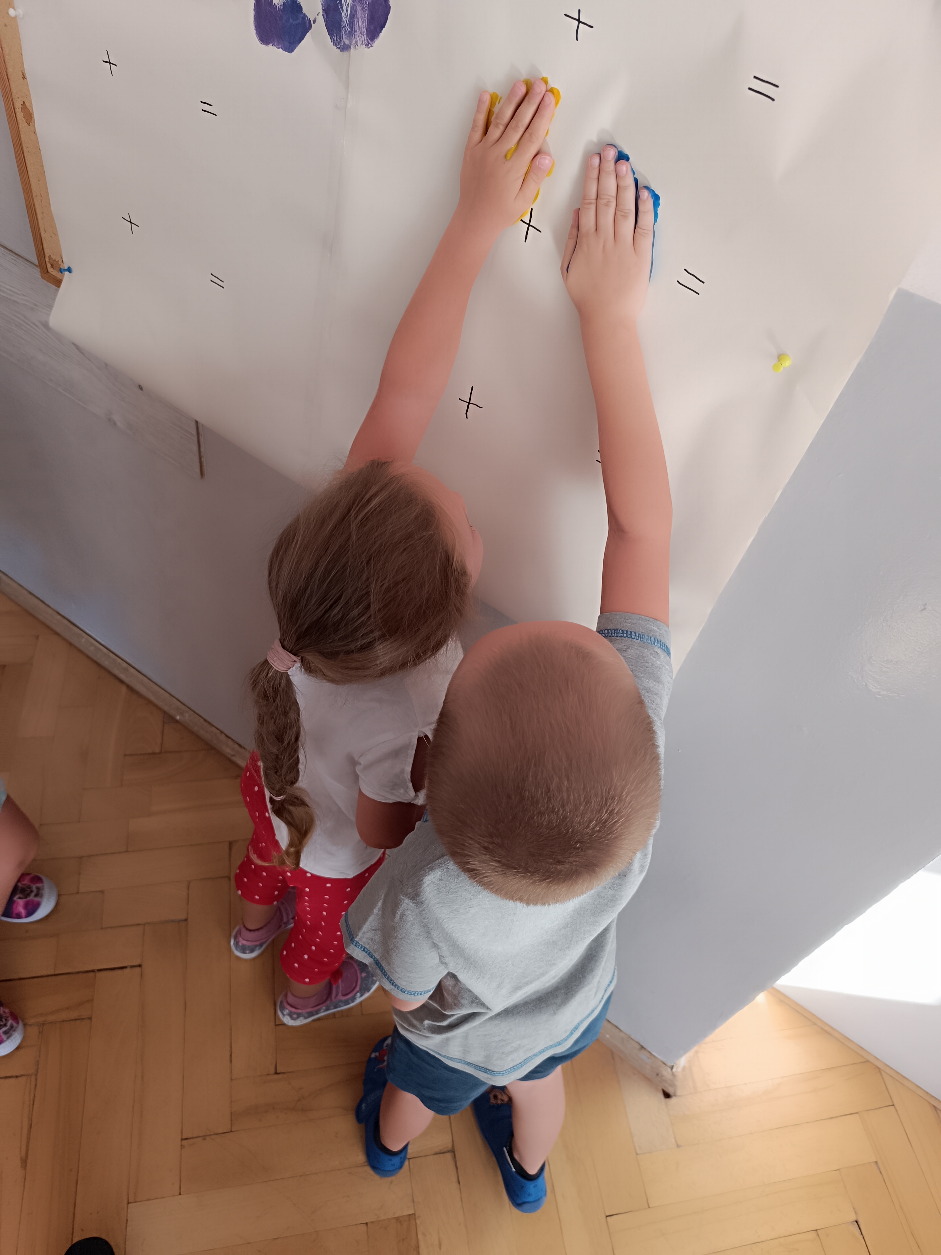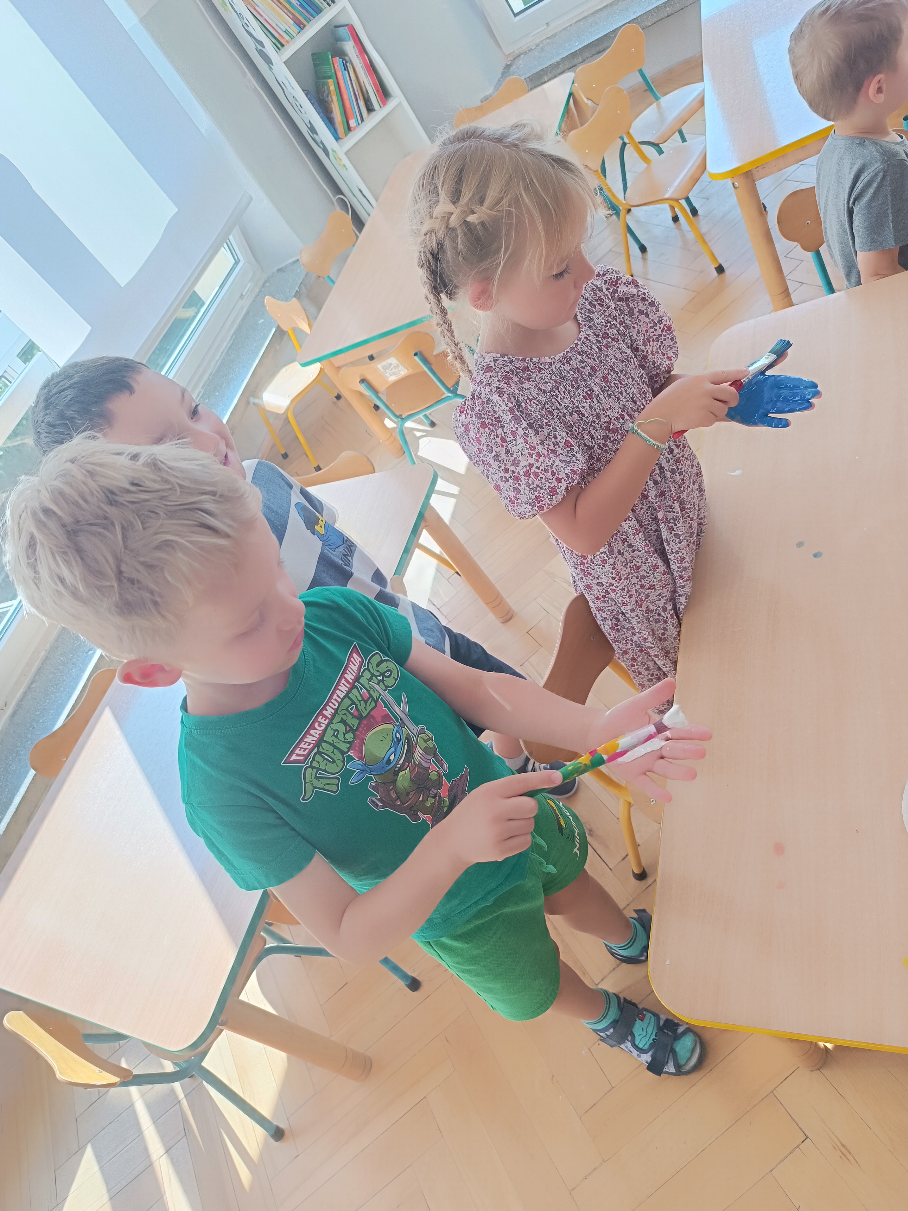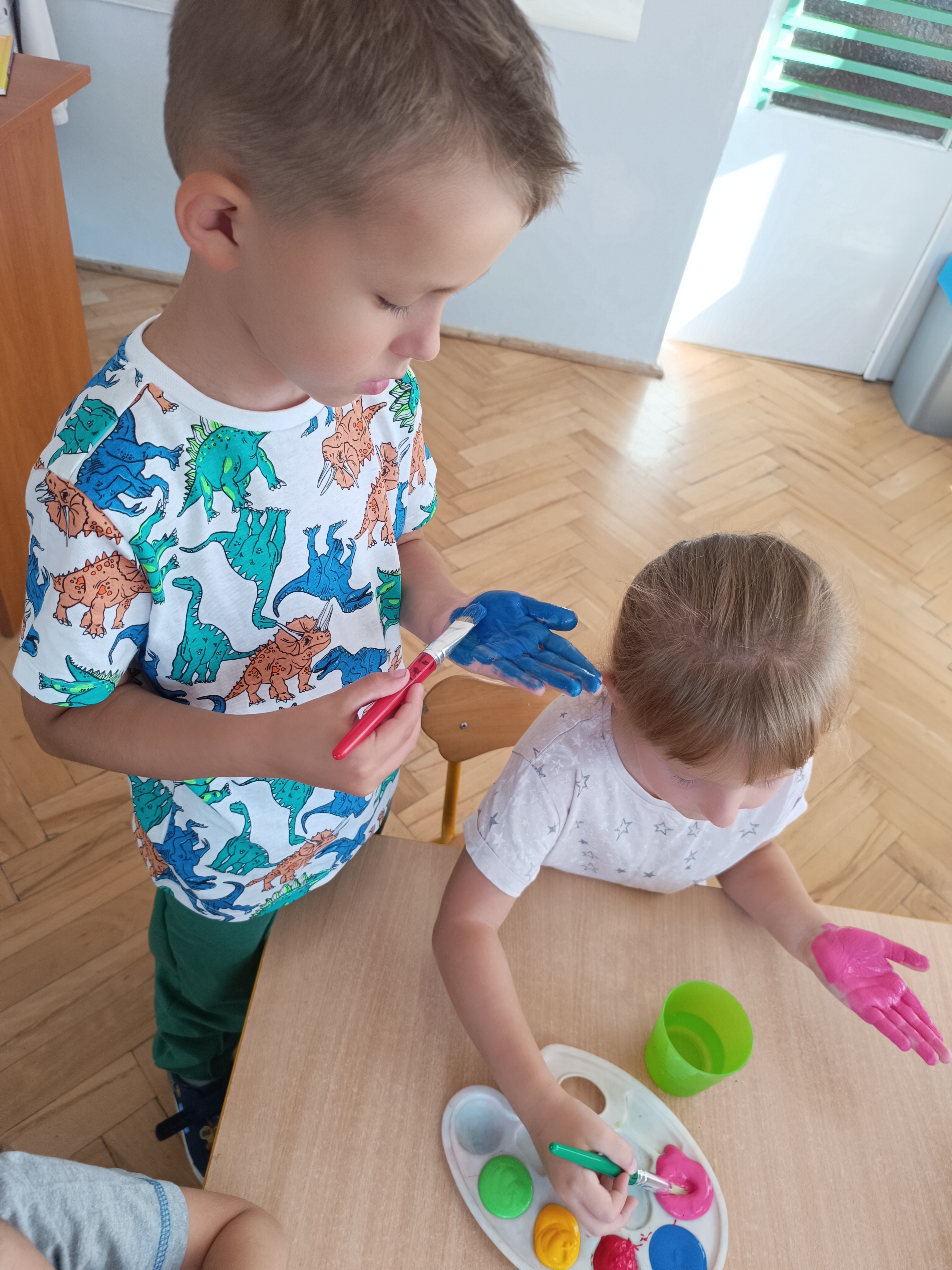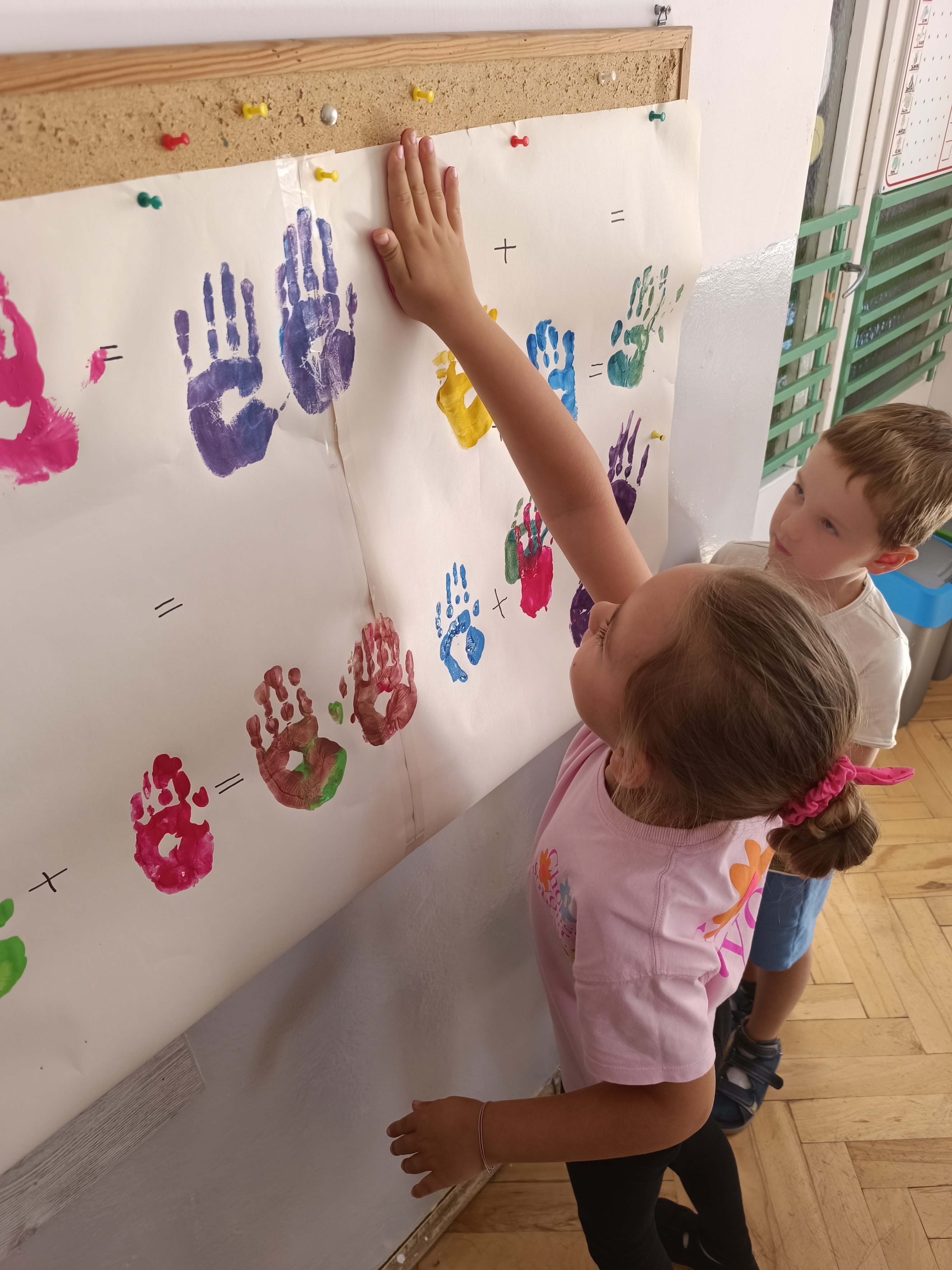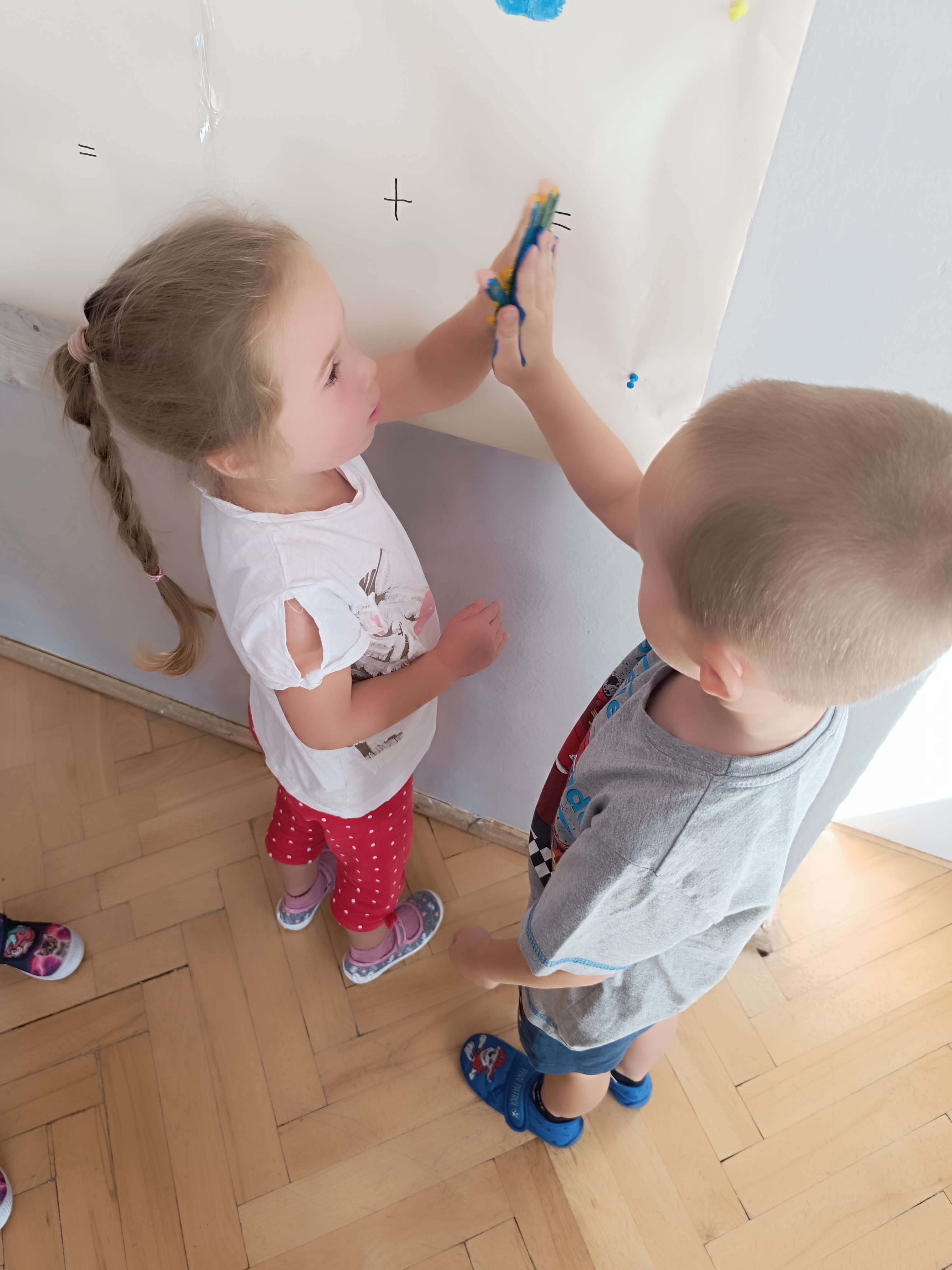 Wykonaliśmy przeróżne prace plastyczne, plastyczno - techniczne. Malowaliśmy rączki farbami, odbijając na kartce, a później mieszając kolory i sprawdzając jaki kolor powstał.