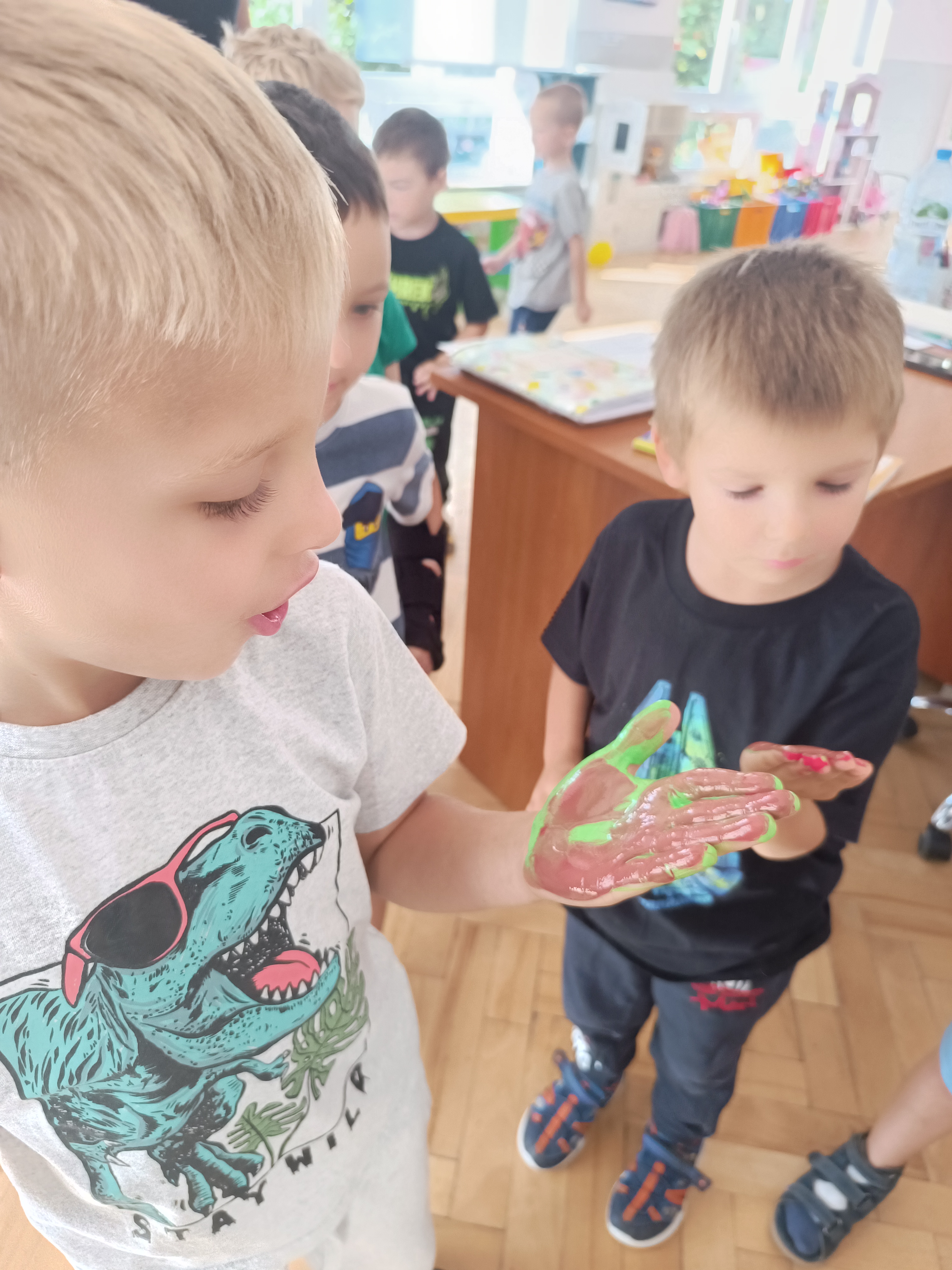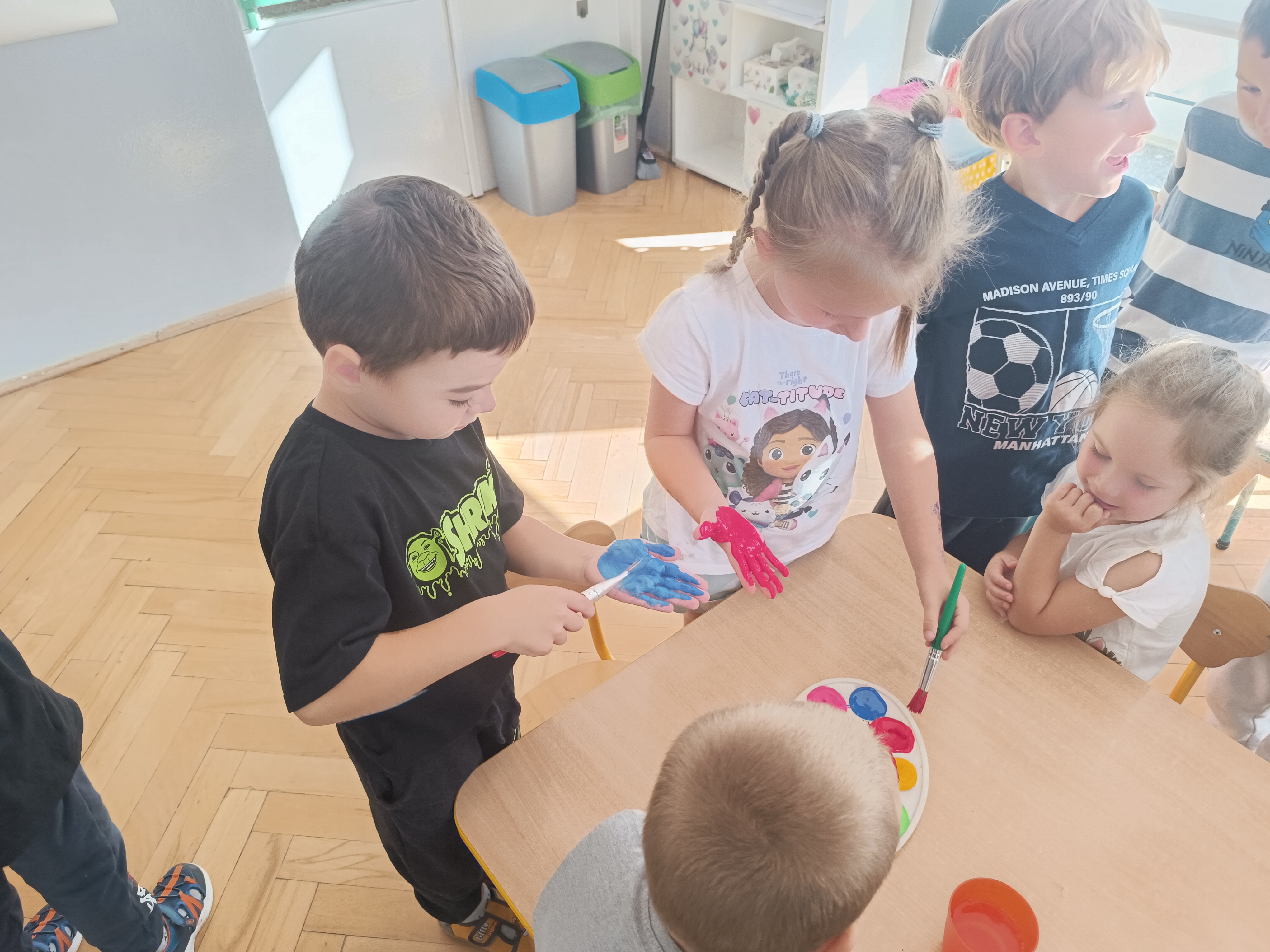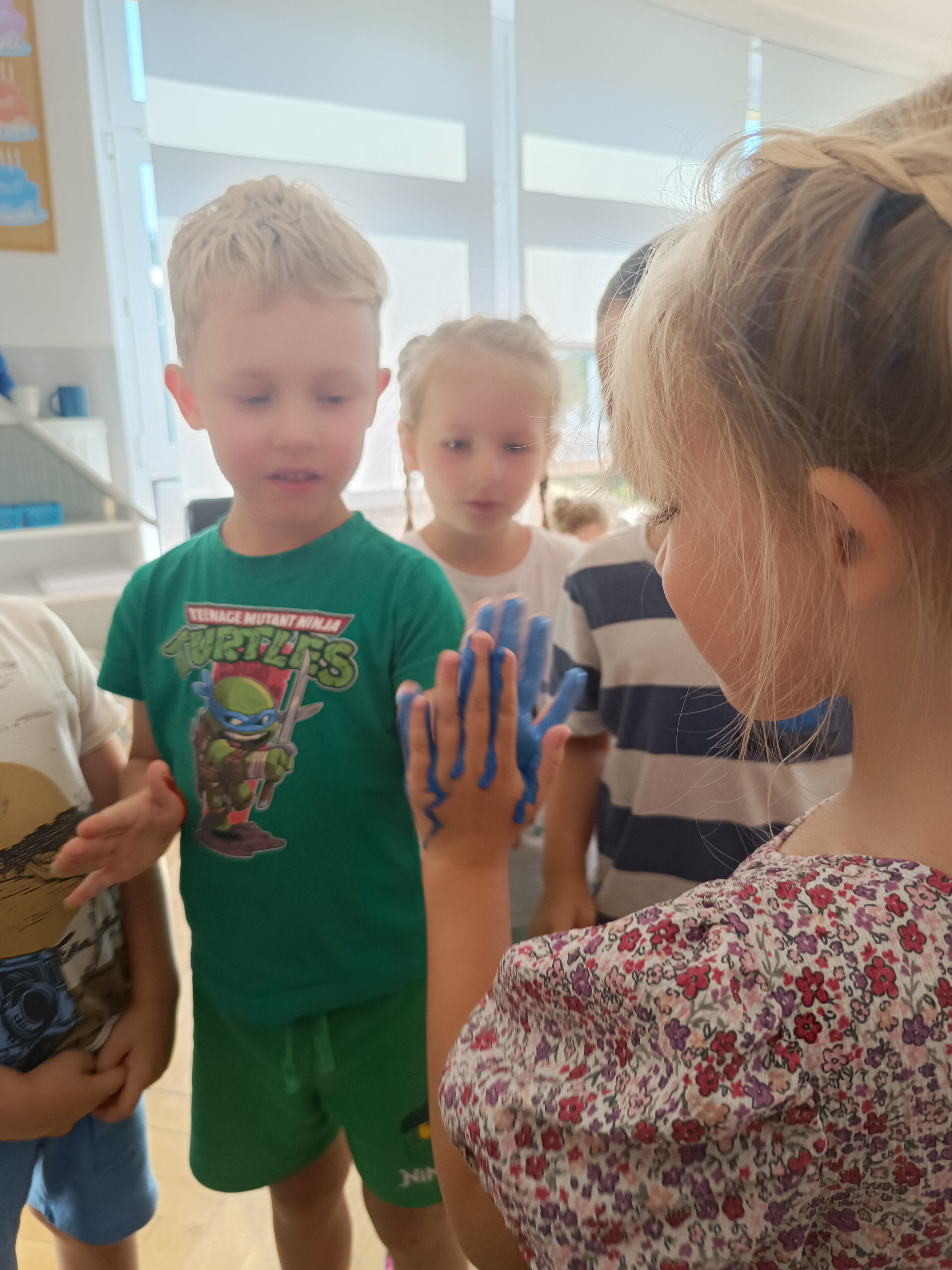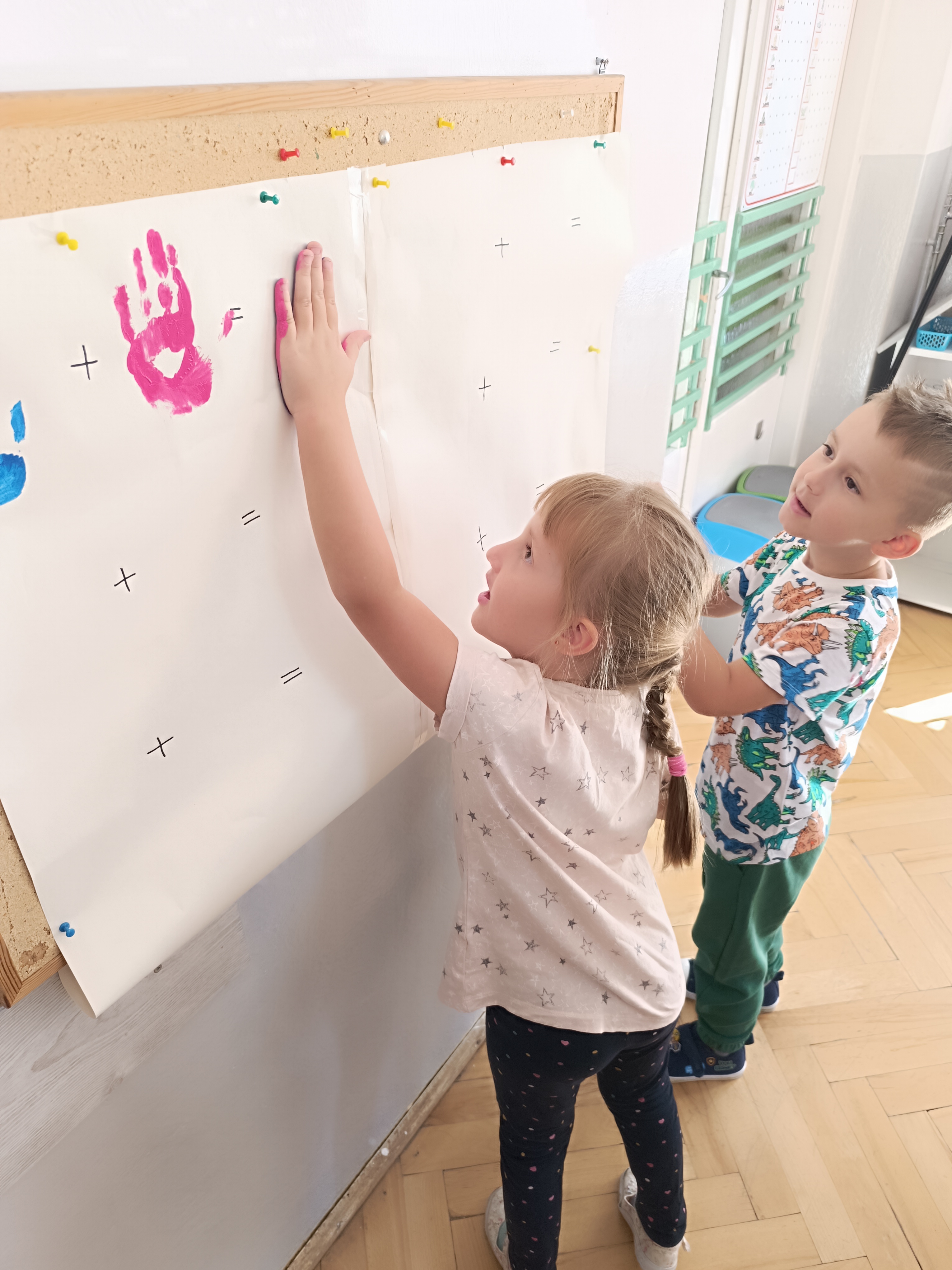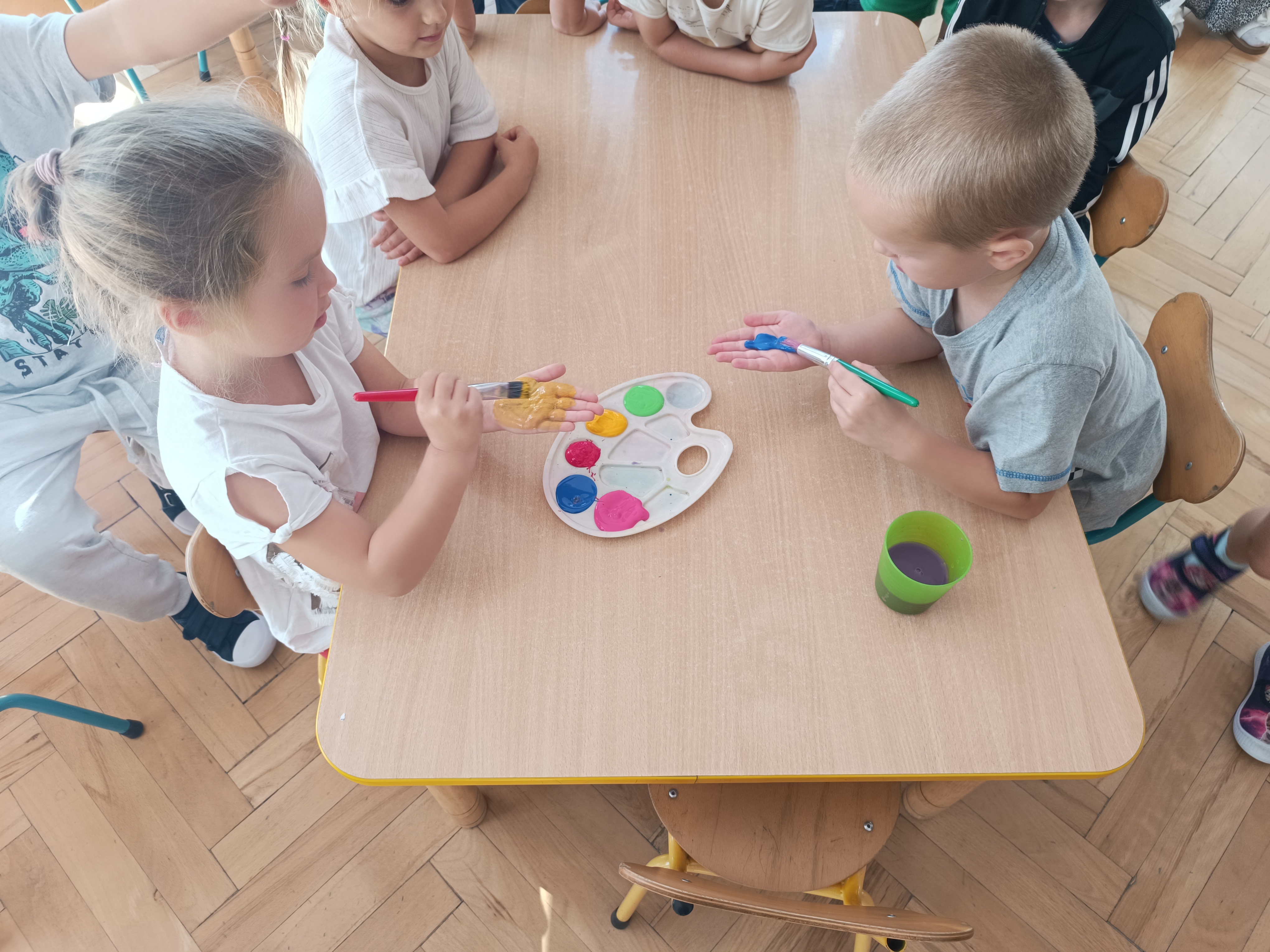 Wykonaliśmy przeróżne prace plastyczne, plastyczno - techniczne. Malowaliśmy rączki farbami, odbijając na kartce, a później mieszając kolory i sprawdzając jaki kolor powstał.