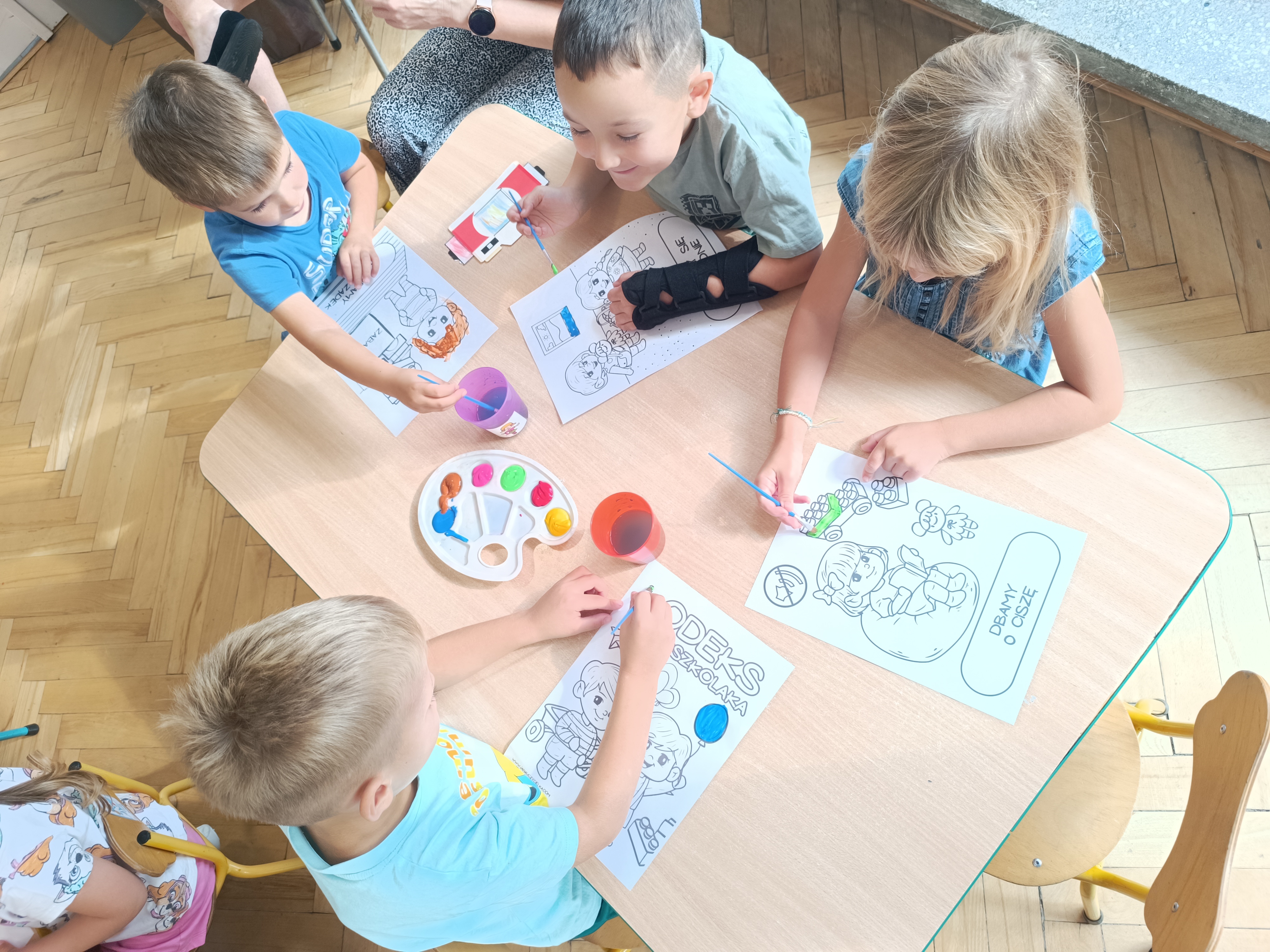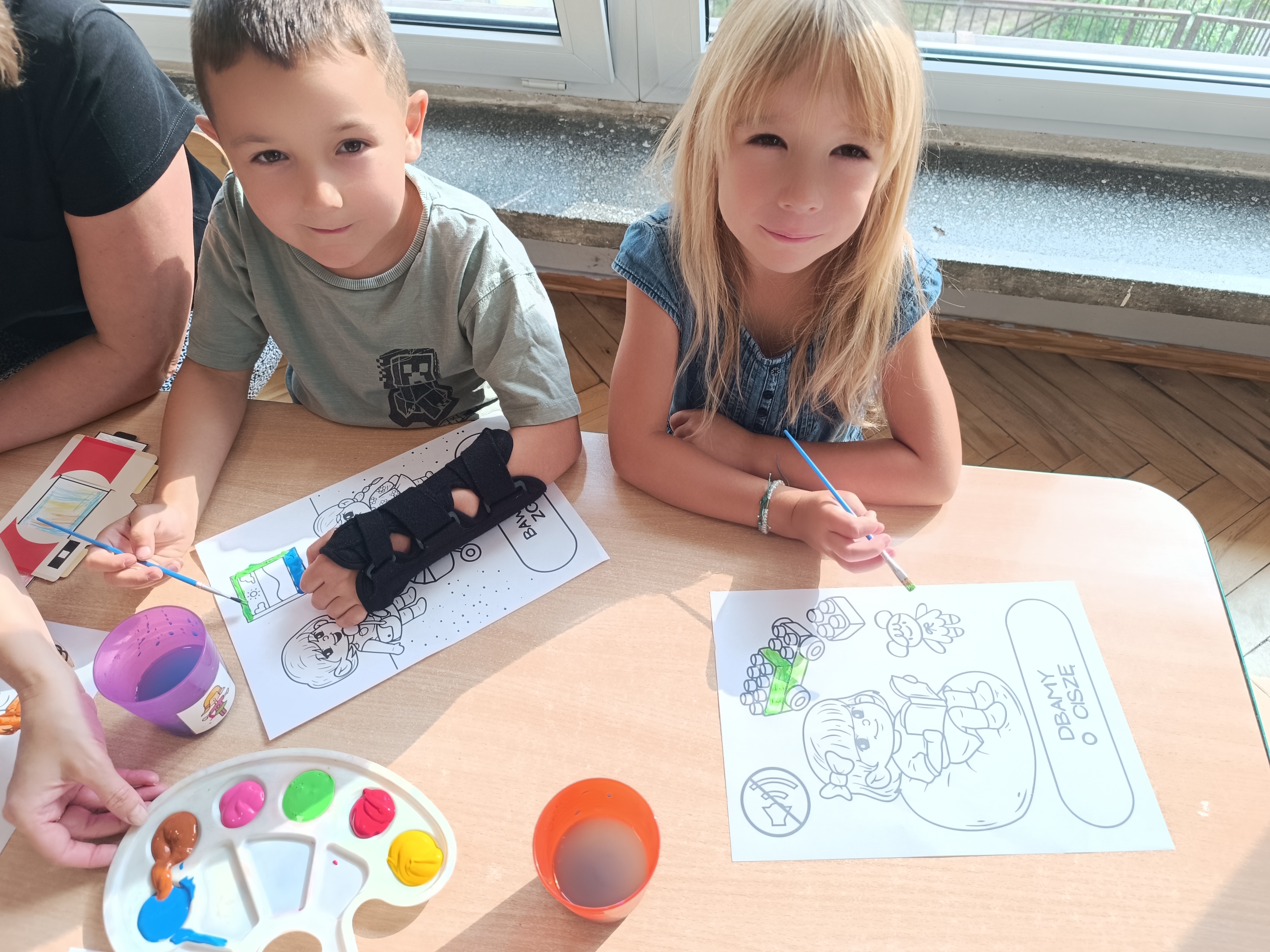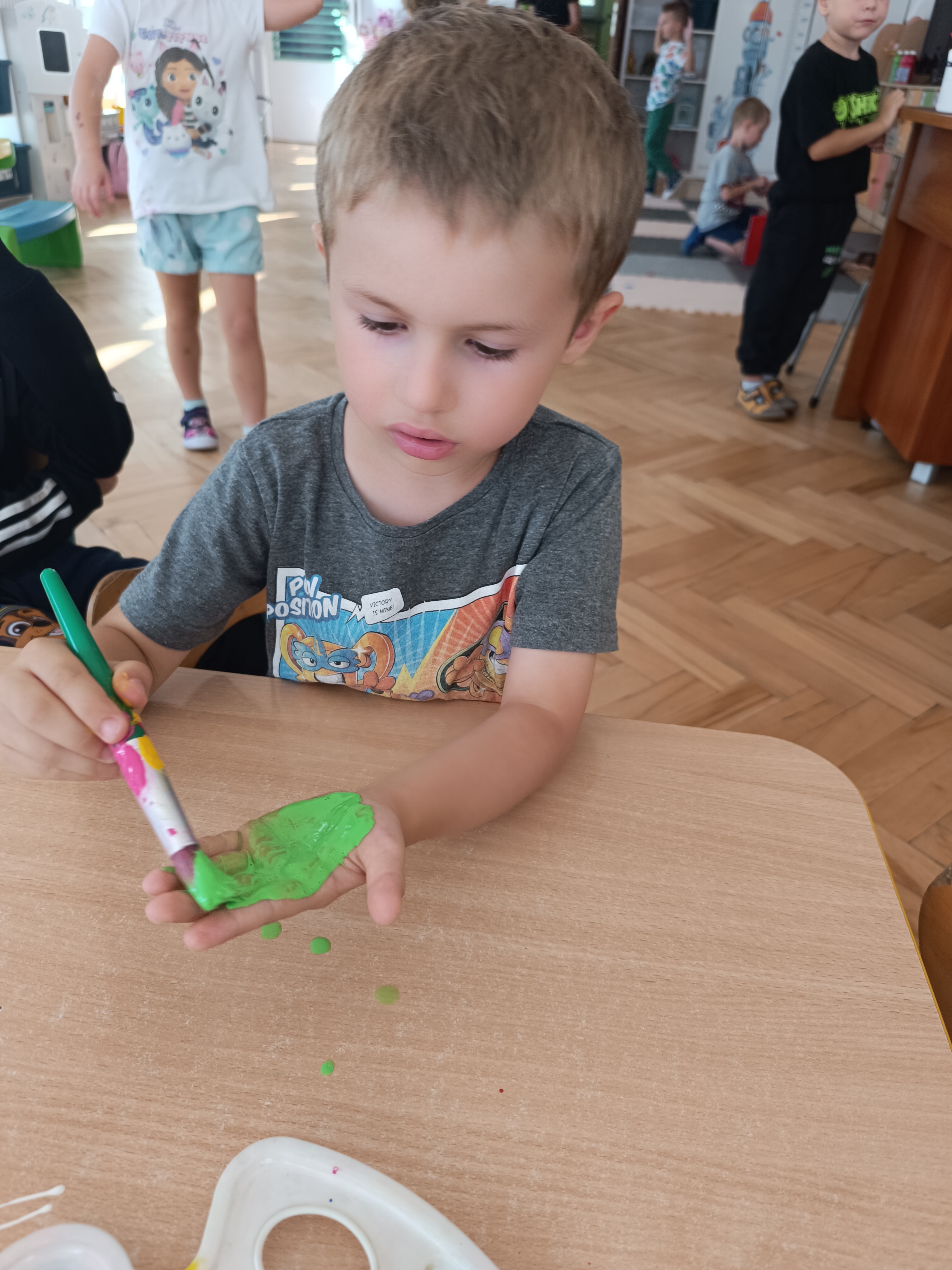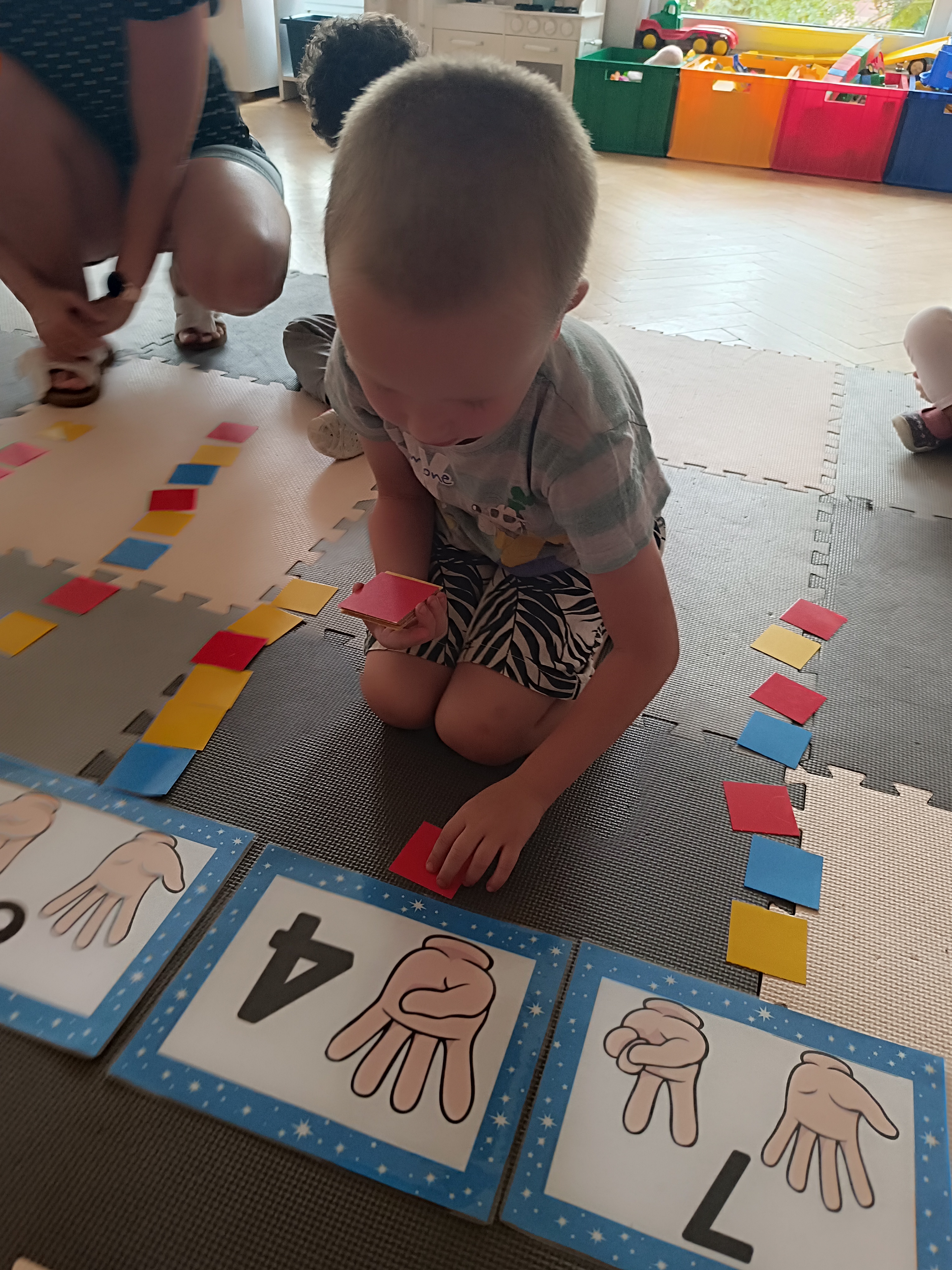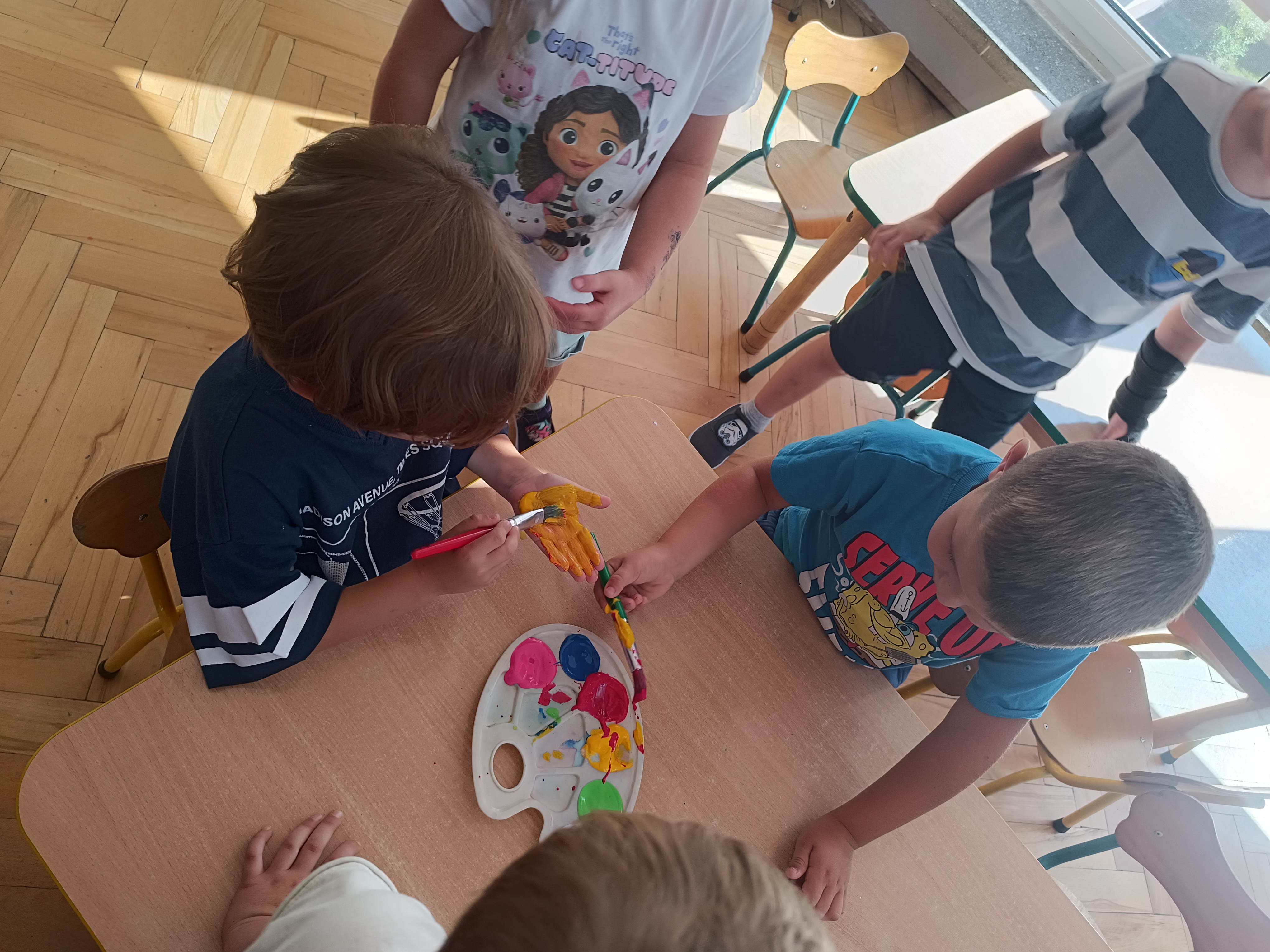 Wykonaliśmy przeróżne prace plastyczne, plastyczno - techniczne. Malowaliśmy rączki farbami, odbijając na kartce, a później mieszając kolory i sprawdzając jaki kolor powstał.