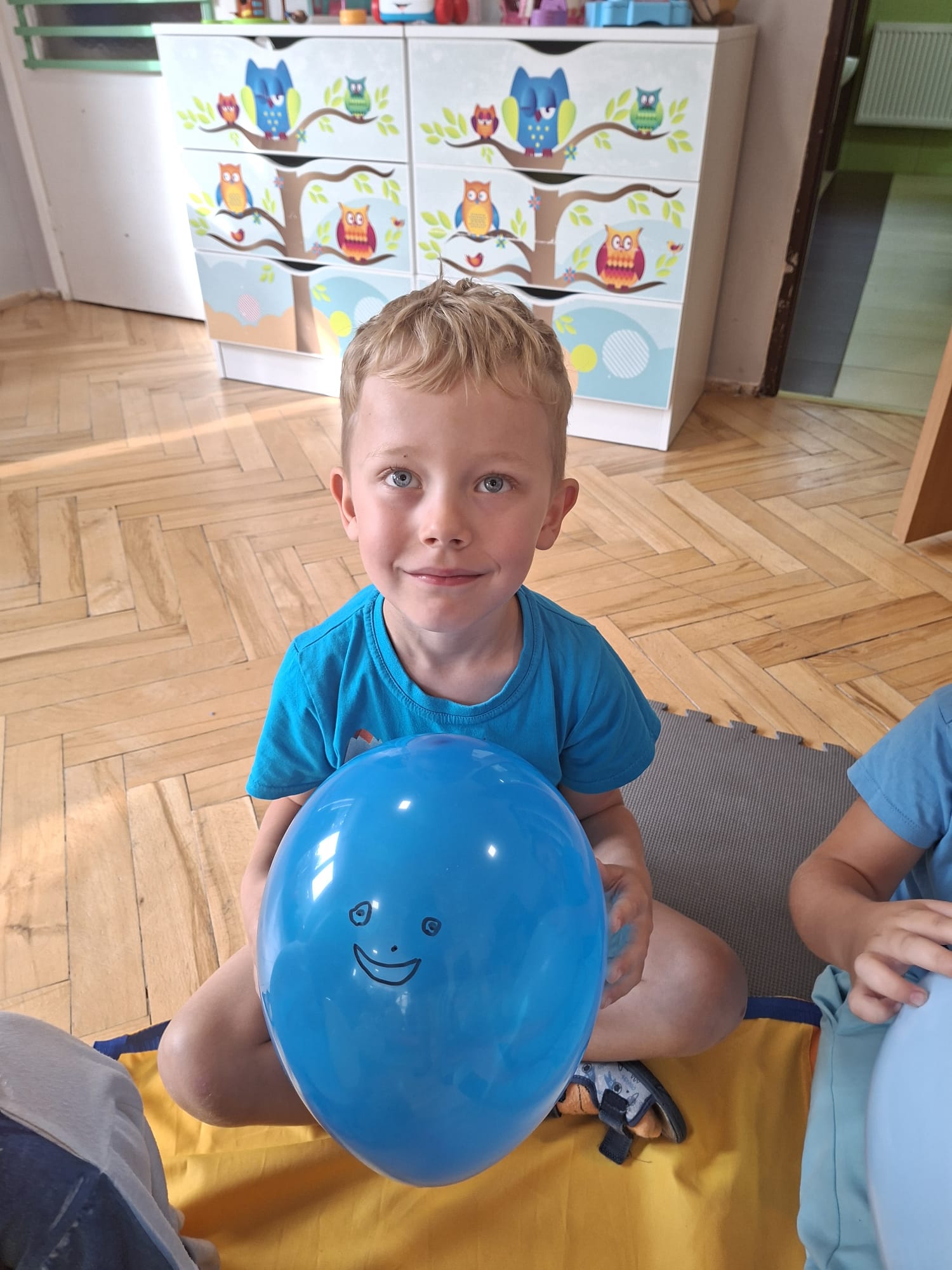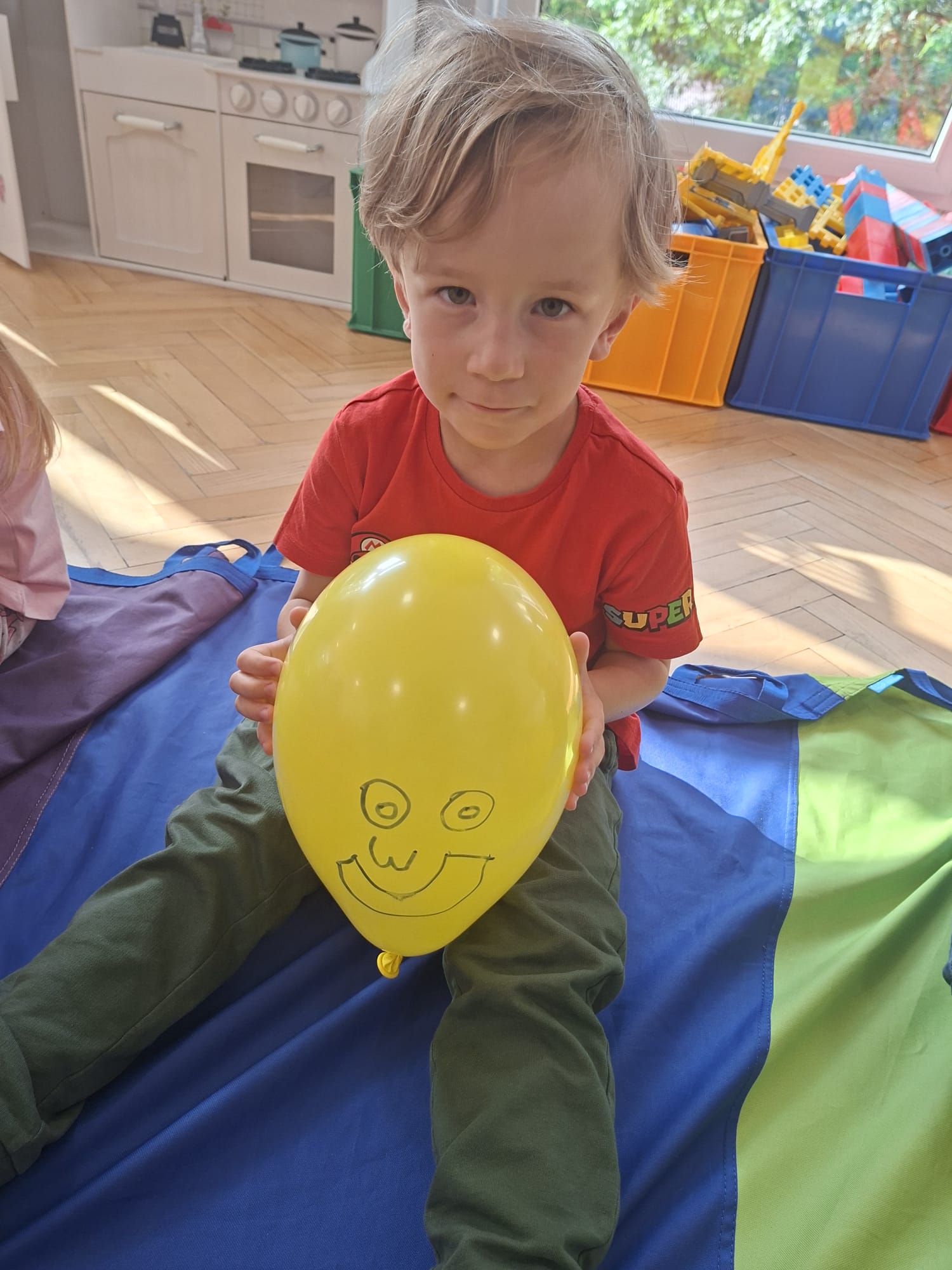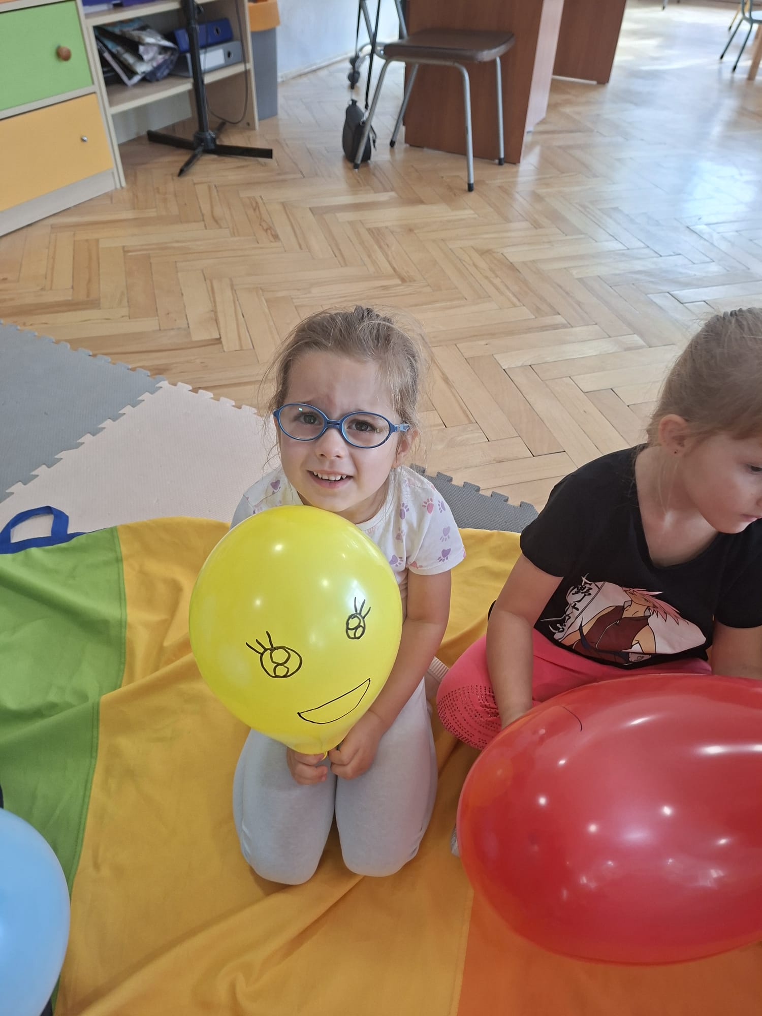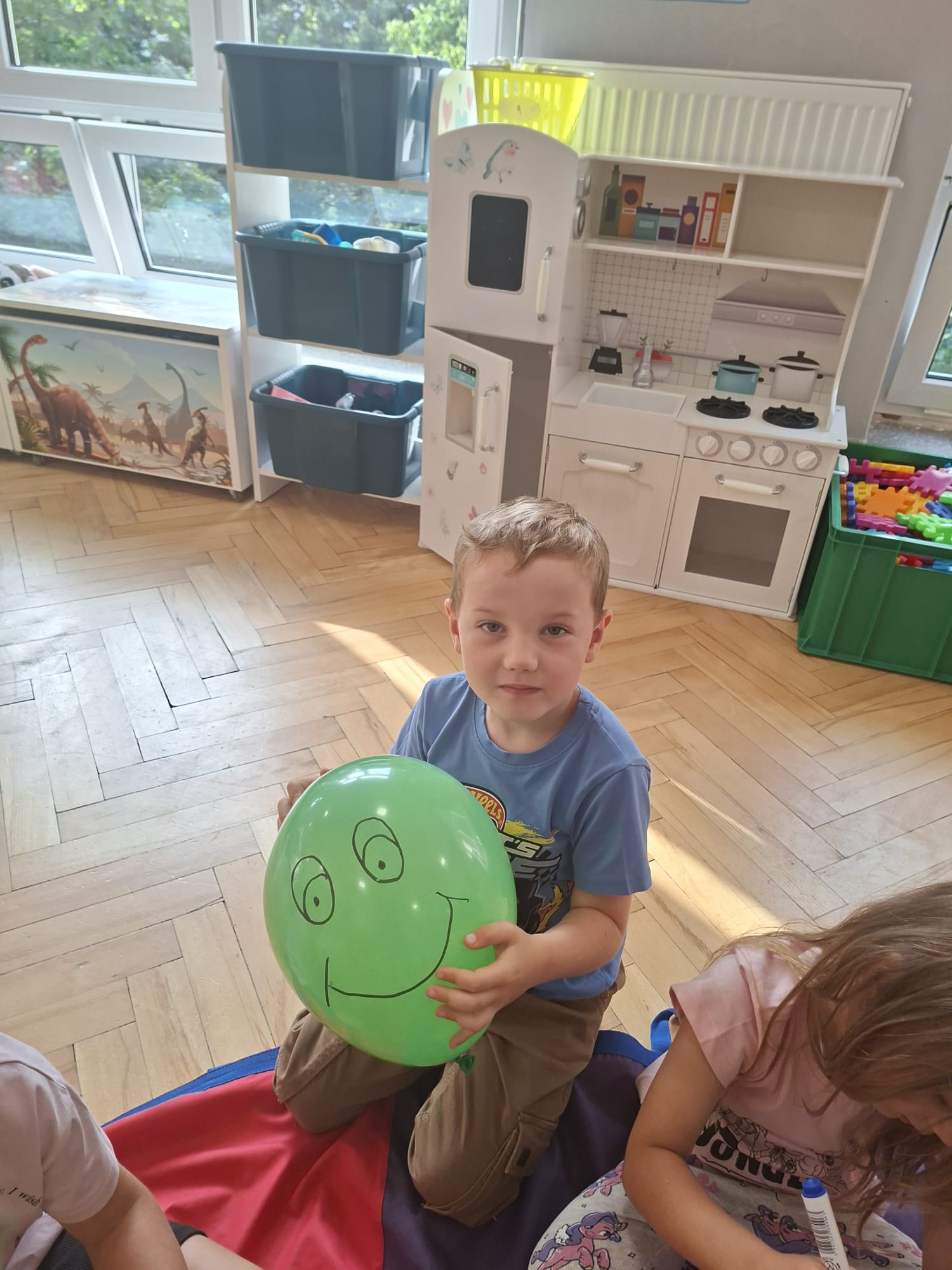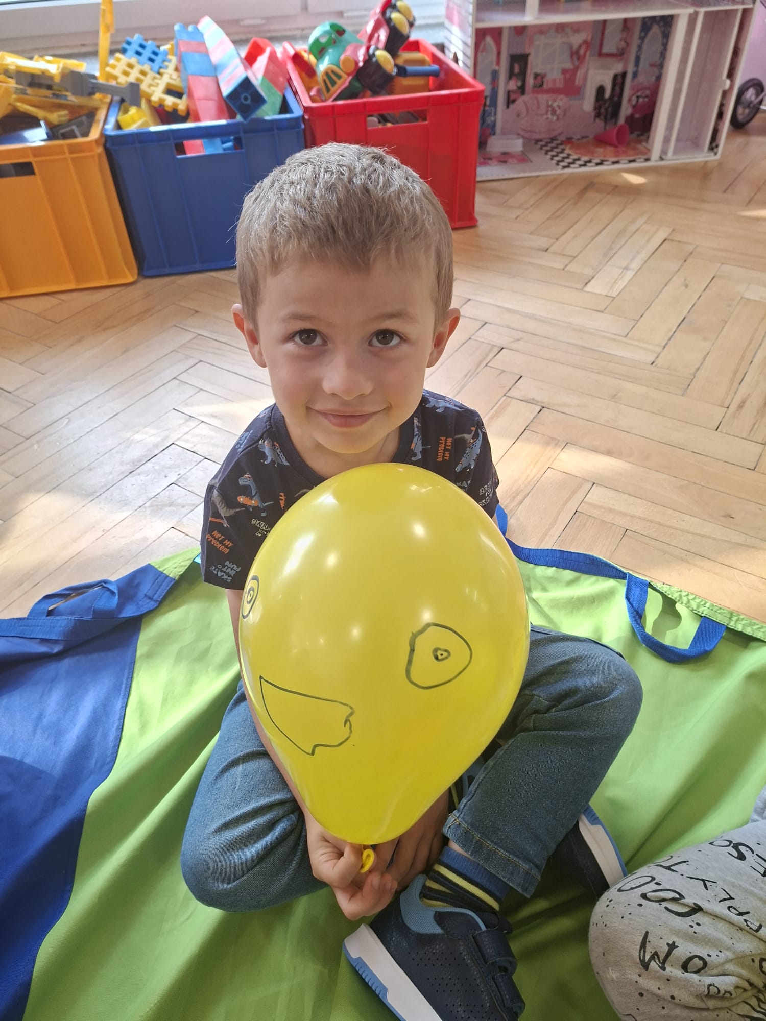 W minionym tygodniu przypominaliśmy sobie kodeks naszej grupy, słuchaliśmy opowiadania M. Pawlisz - "Kodeks - czemu nie" , rozmawiając wspólnie o nim. Rysowaliśmy na balonikach swoje emocje - rozmawiając później o nich , dlaczego dzisiaj tak się czujemy. Rozłożyliśmy balony na chuście animacyjnej szukając swojego balonika, bawiliśmy się z wykorzystaniem chusty.