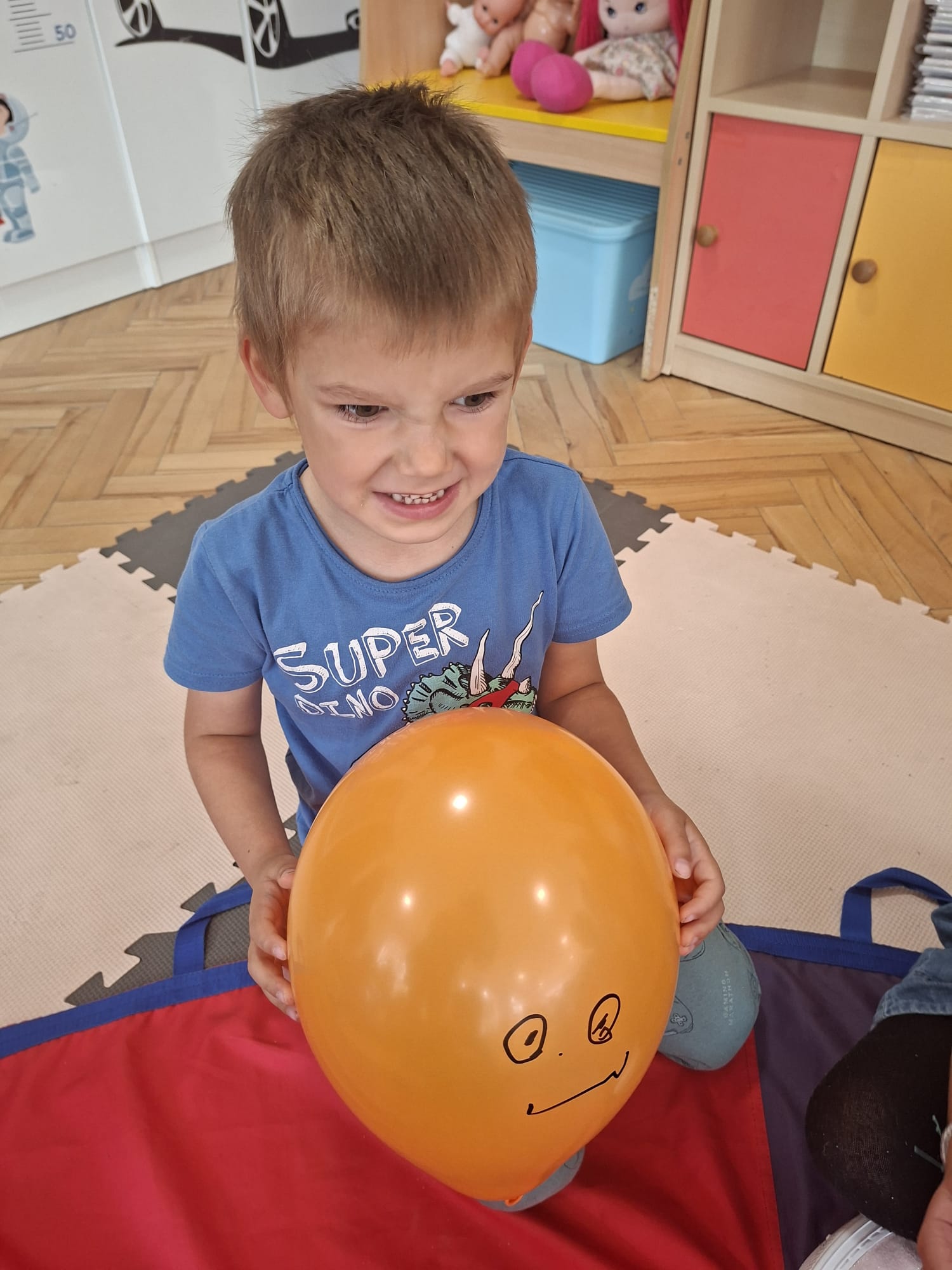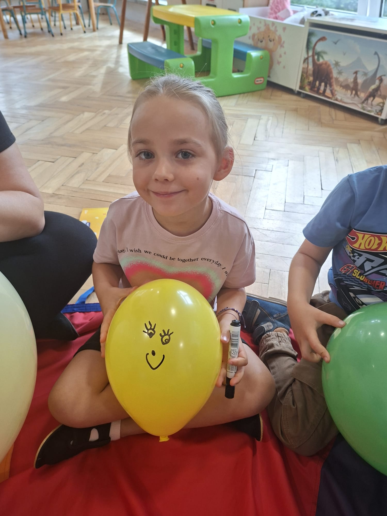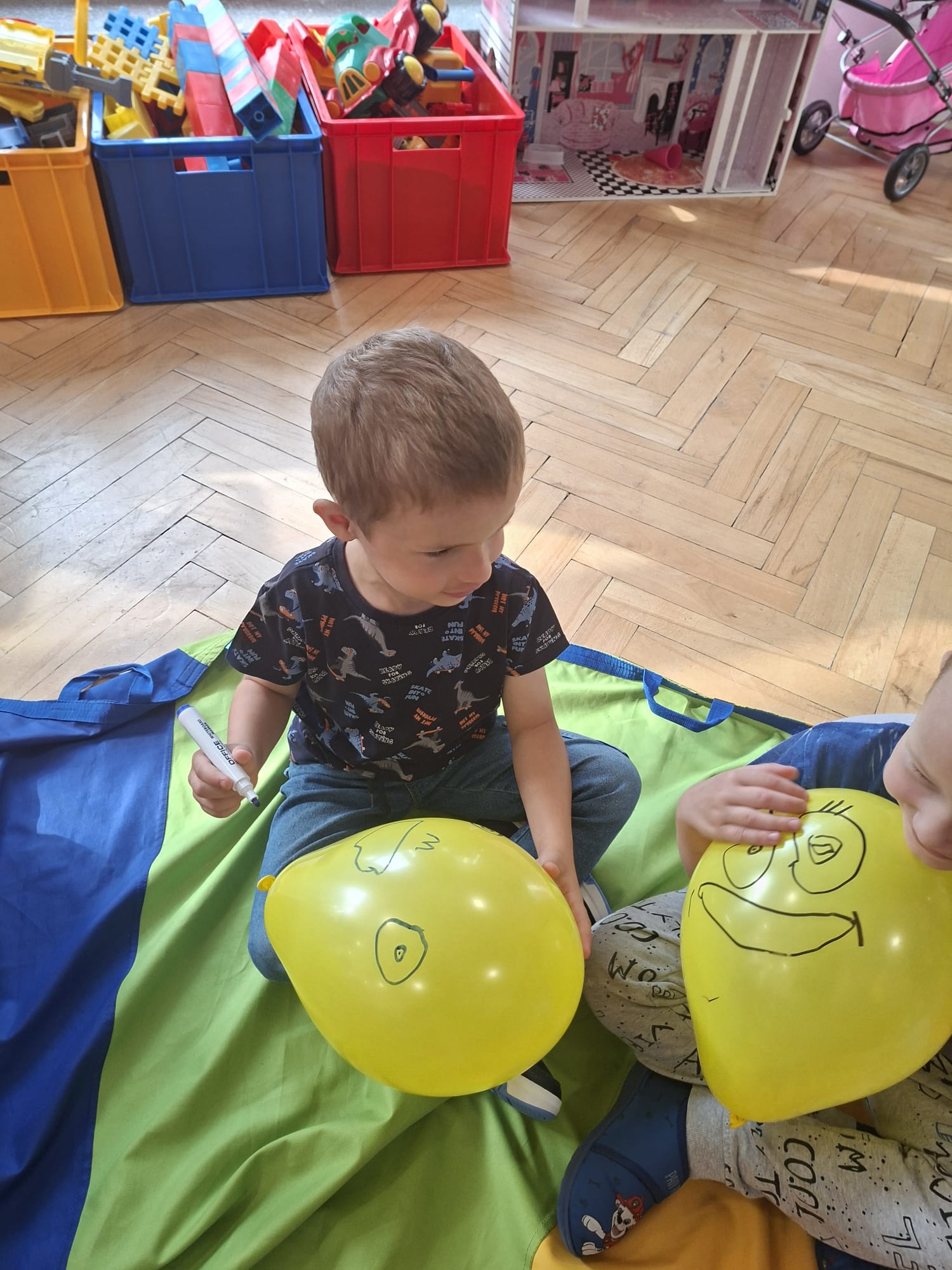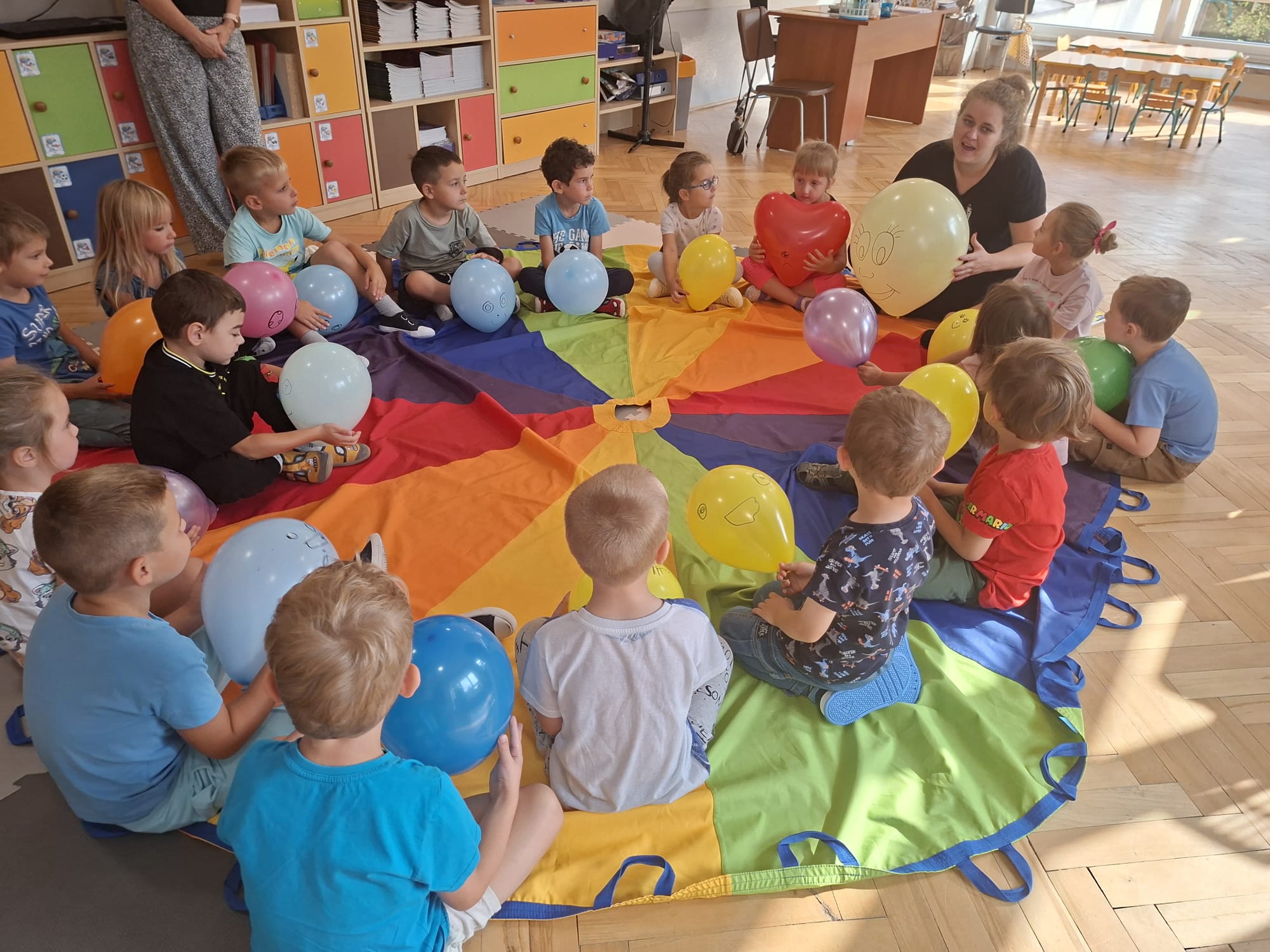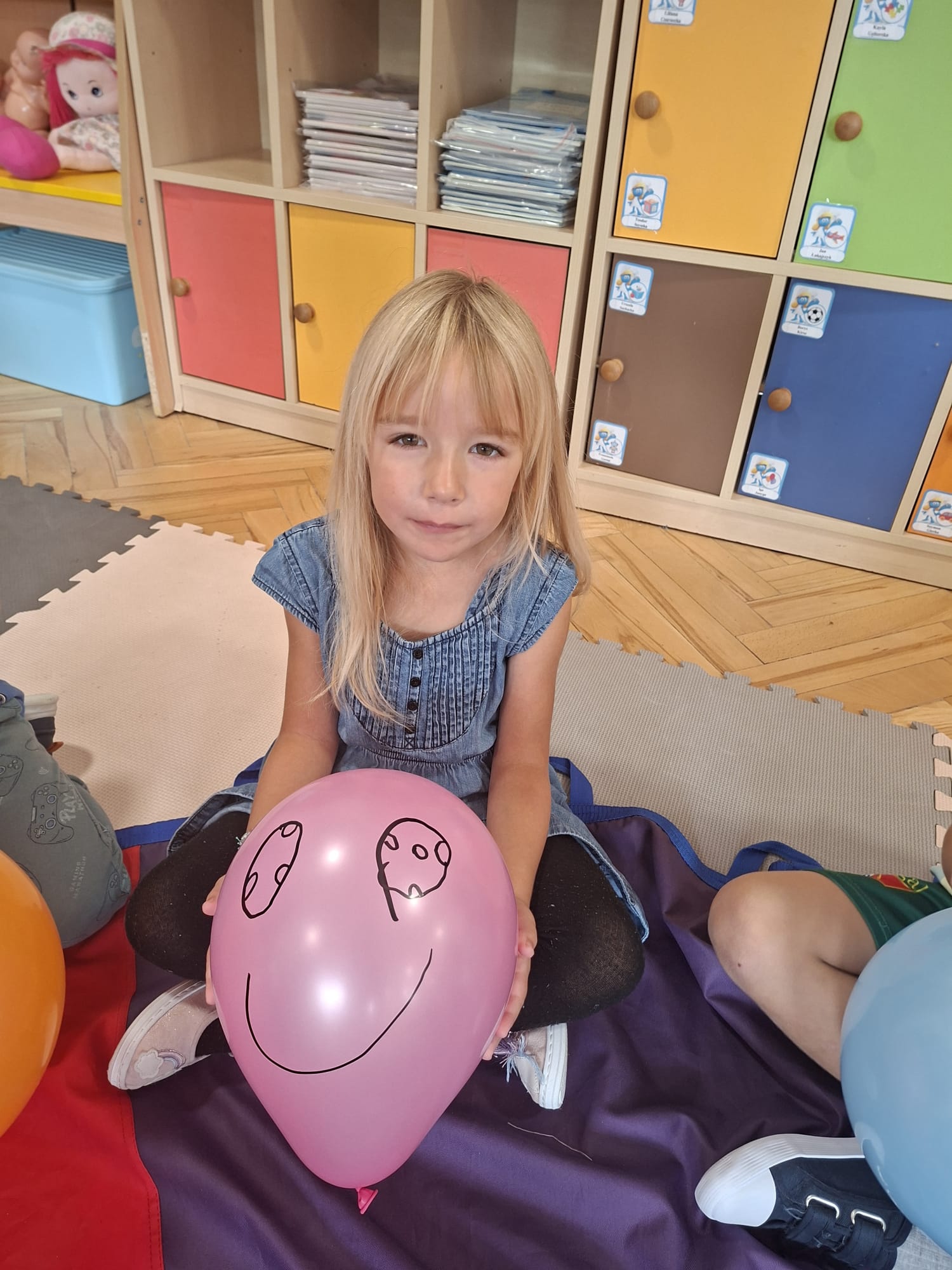 W minionym tygodniu przypominaliśmy sobie kodeks naszej grupy, słuchaliśmy opowiadania M. Pawlisz - "Kodeks - czemu nie" , rozmawiając wspólnie o nim. Rysowaliśmy na balonikach swoje emocje - rozmawiając później o nich , dlaczego dzisiaj tak się czujemy. Rozłożyliśmy balony na chuście animacyjnej szukając swojego balonika, bawiliśmy się z wykorzystaniem chusty.