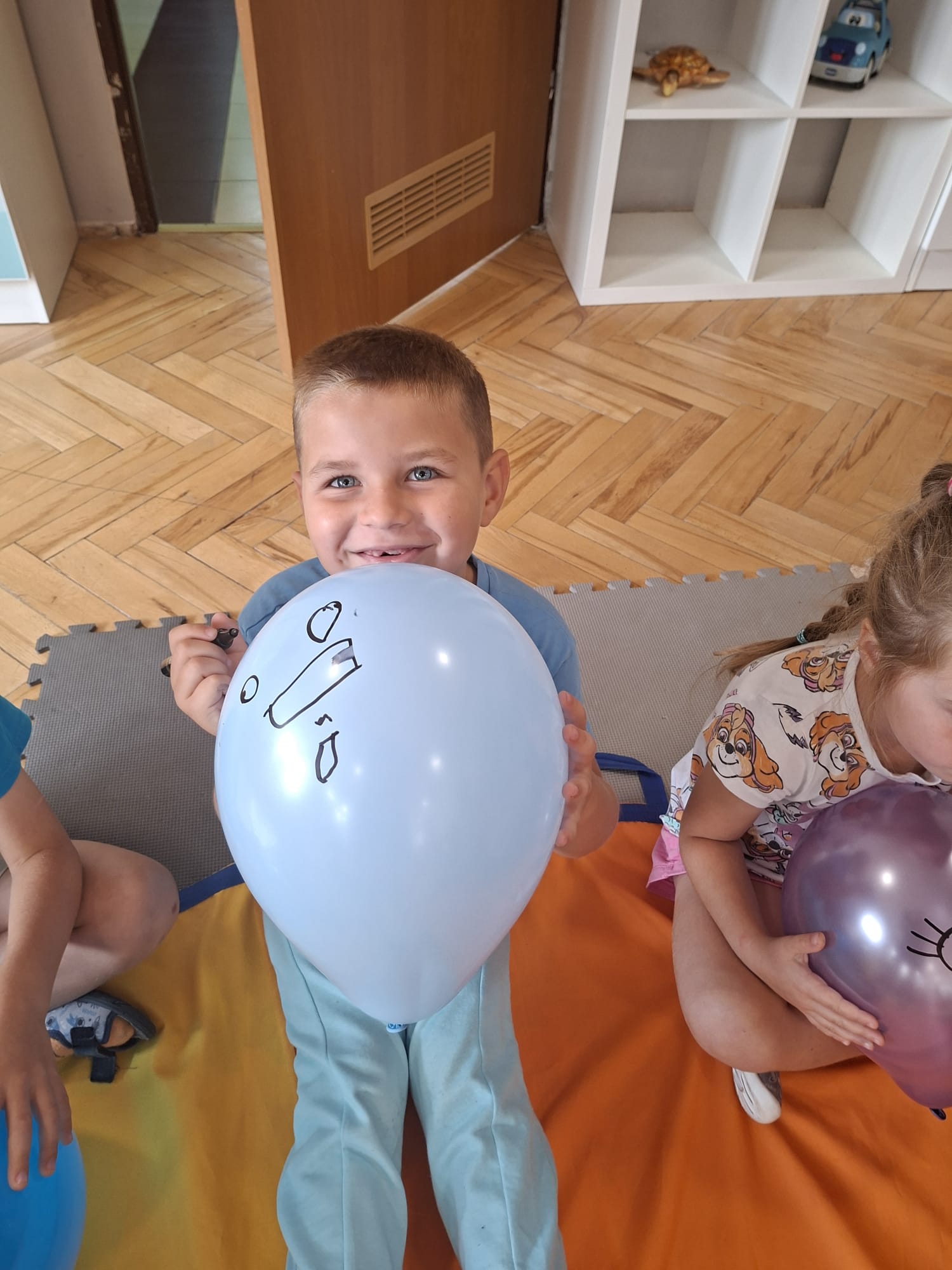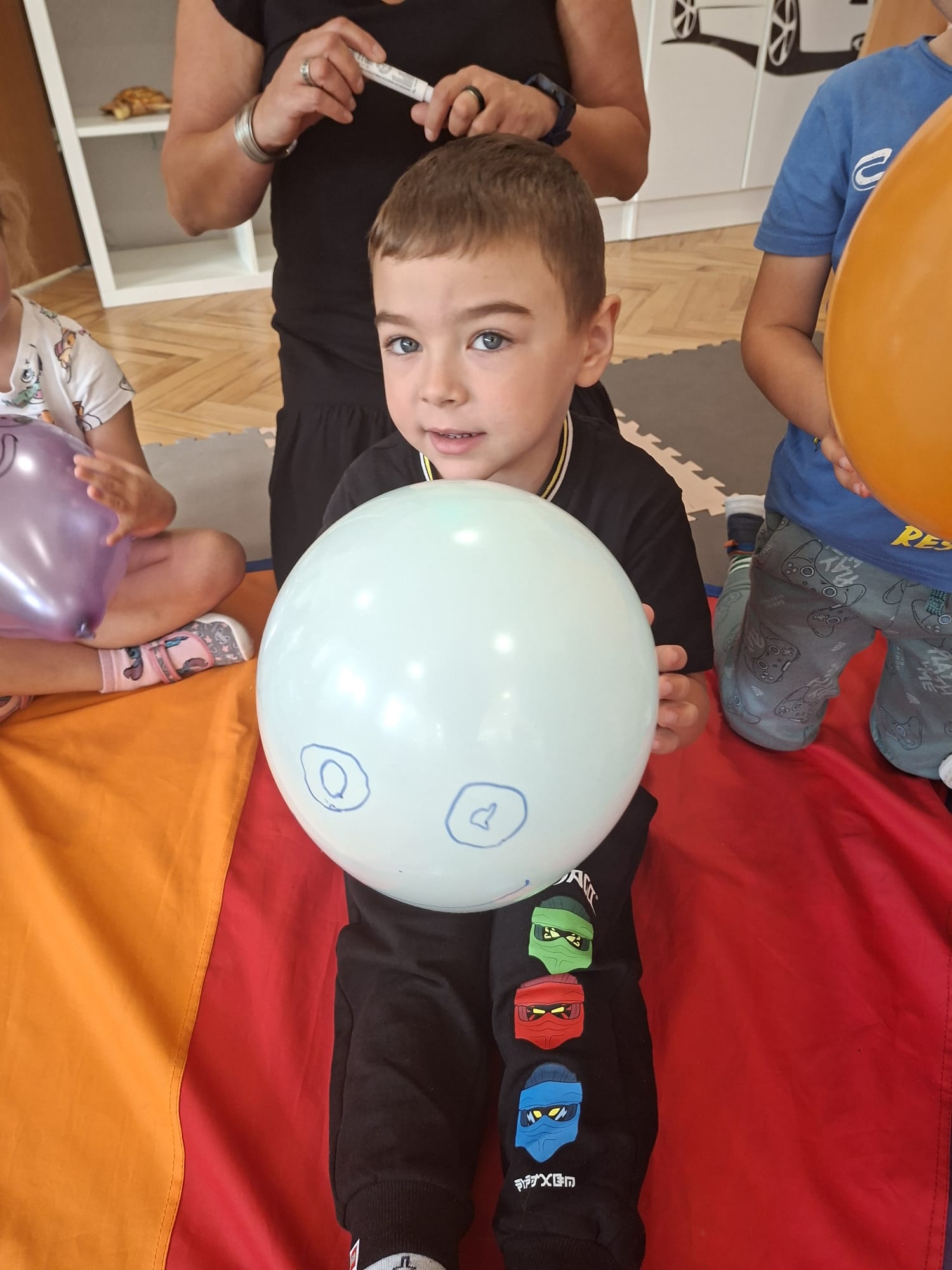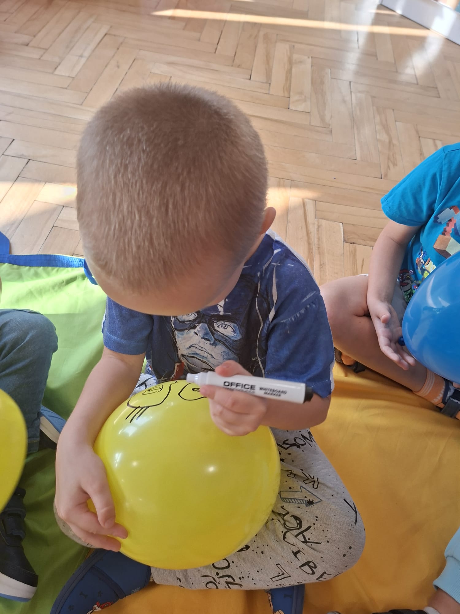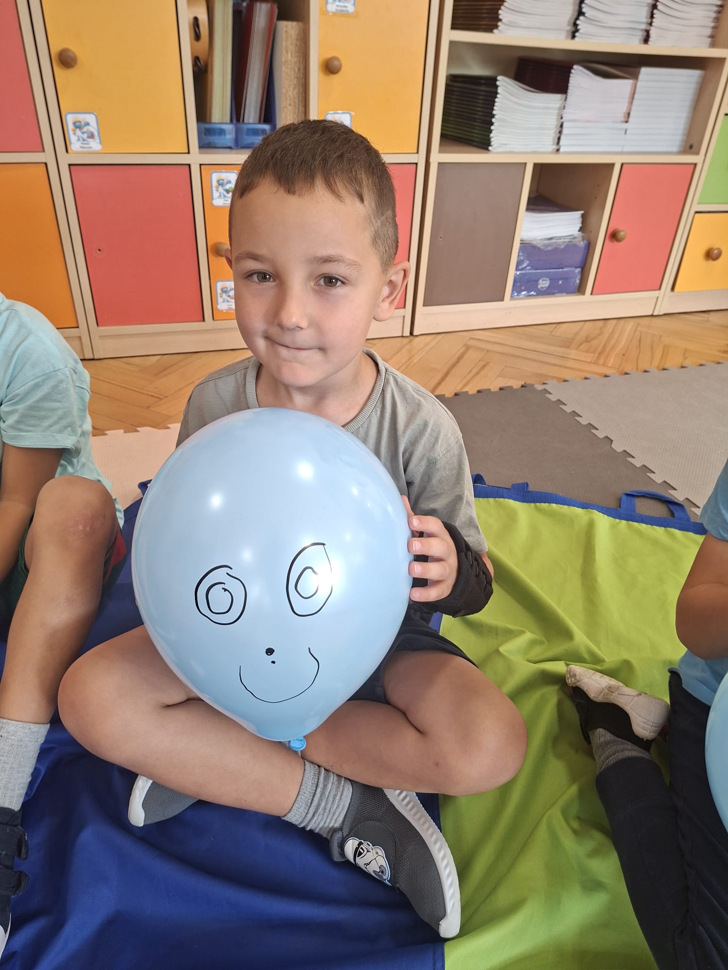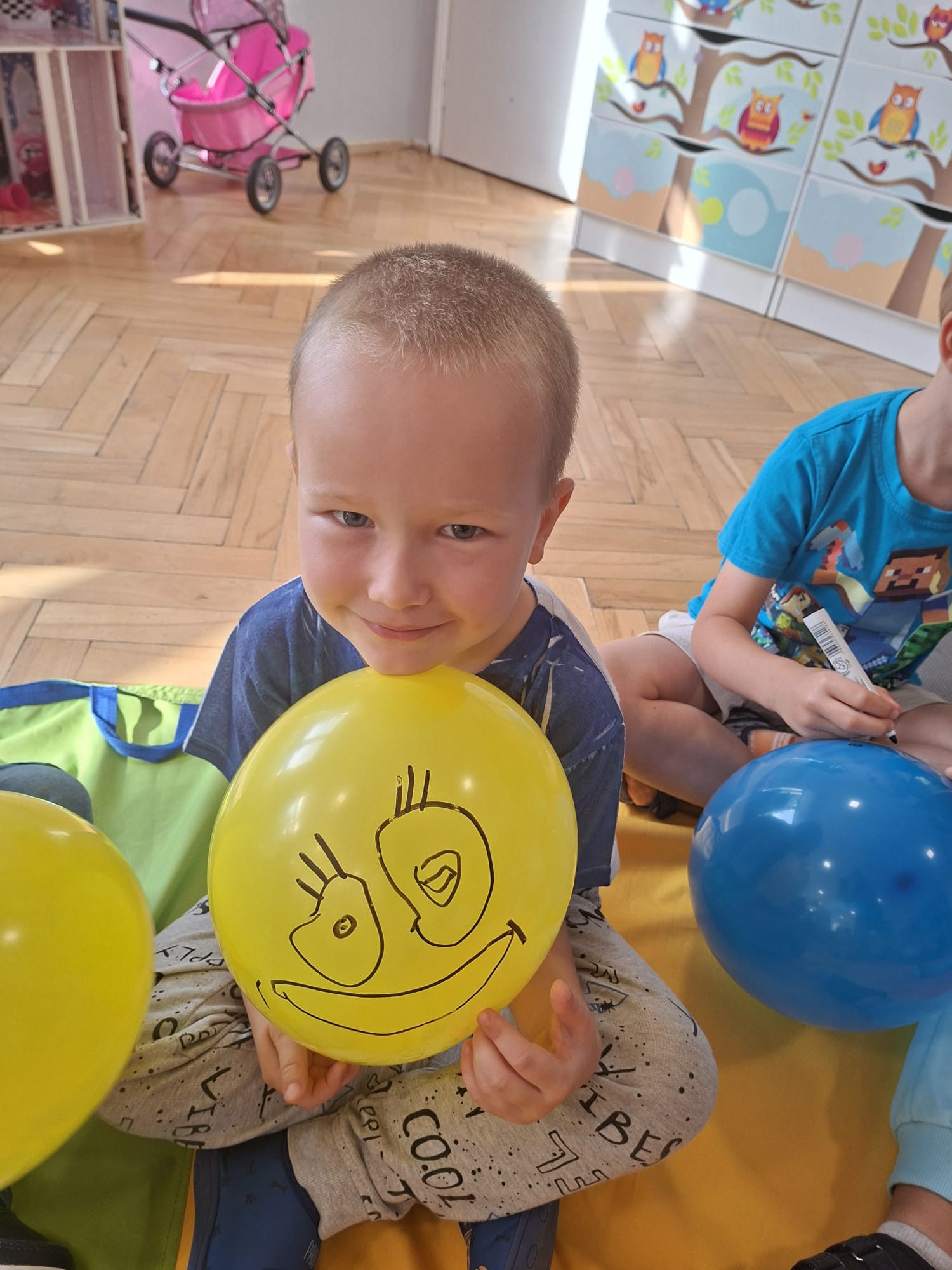 W minionym tygodniu przypominaliśmy sobie kodeks naszej grupy, słuchaliśmy opowiadania M. Pawlisz - "Kodeks - czemu nie" , rozmawiając wspólnie o nim. Rysowaliśmy na balonikach swoje emocje - rozmawiając później o nich , dlaczego dzisiaj tak się czujemy. Rozłożyliśmy balony na chuście animacyjnej szukając swojego balonika, bawiliśmy się z wykorzystaniem chusty.