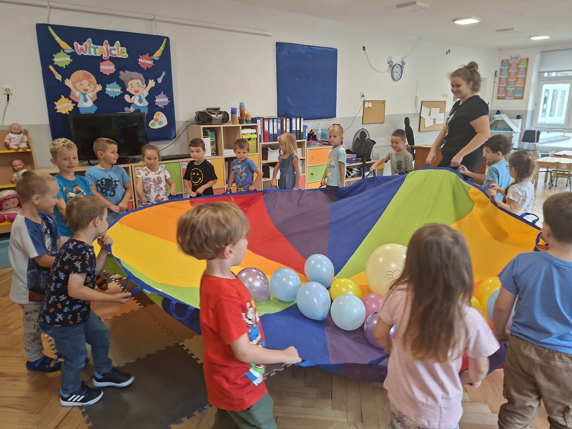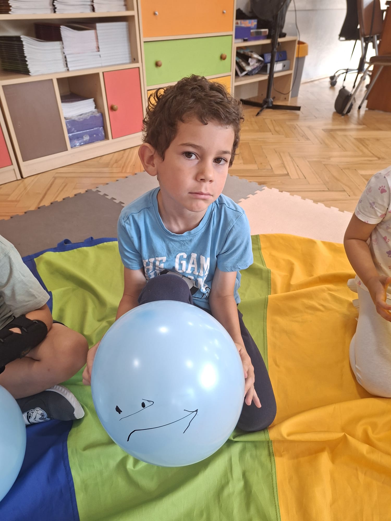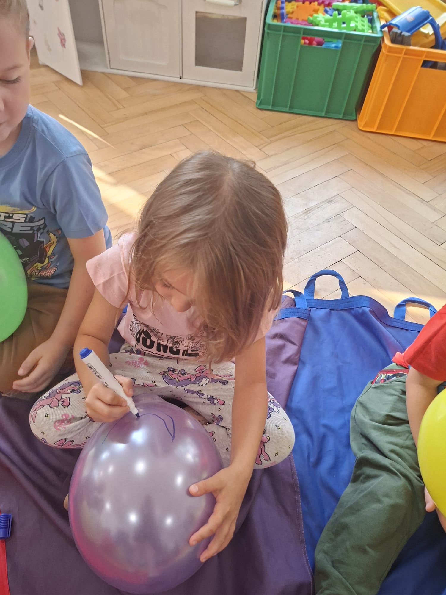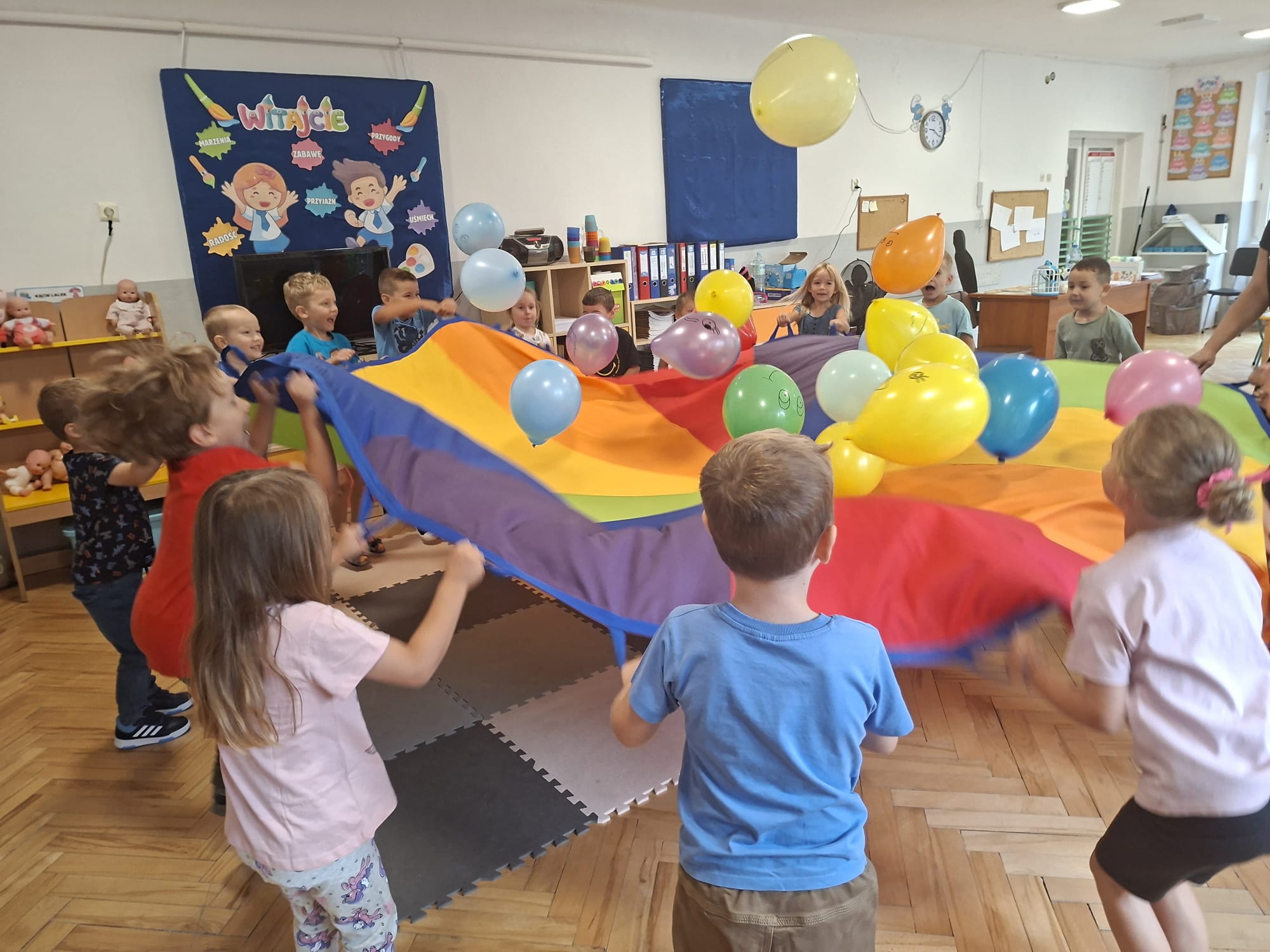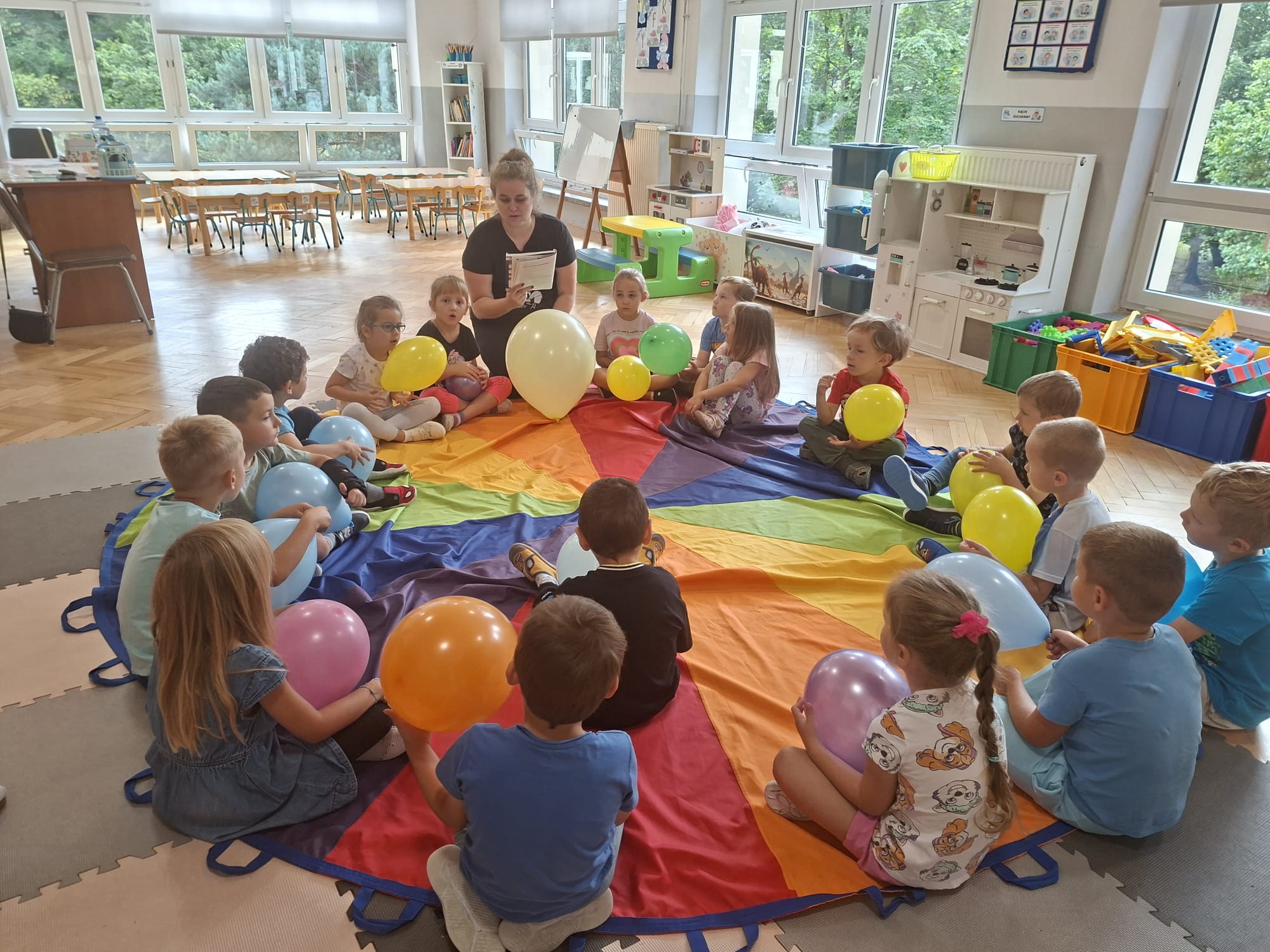 W minionym tygodniu przypominaliśmy sobie kodeks naszej grupy, słuchaliśmy opowiadania M. Pawlisz - "Kodeks - czemu nie" , rozmawiając wspólnie o nim. Rysowaliśmy na balonikach swoje emocje - rozmawiając później o nich , dlaczego dzisiaj tak się czujemy. Rozłożyliśmy balony na chuście animacyjnej szukając swojego balonika, bawiliśmy się z wykorzystaniem chusty.