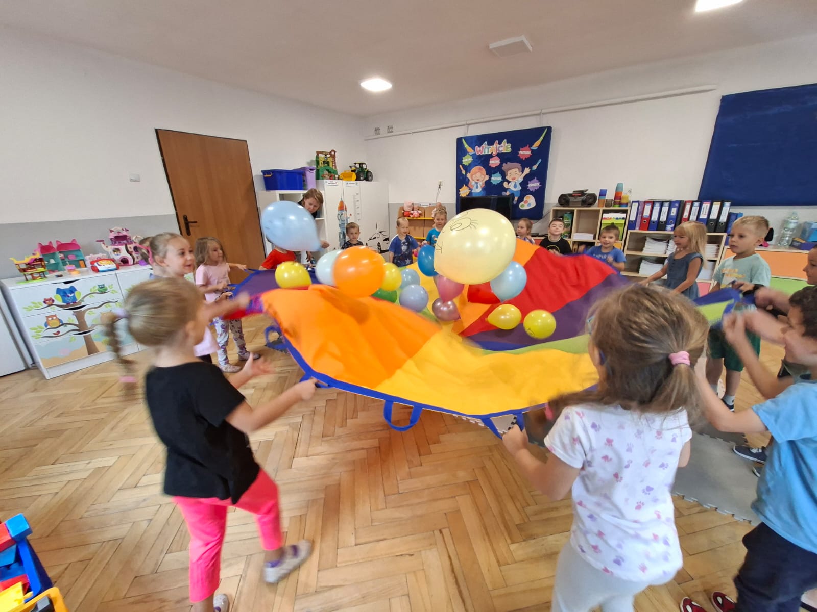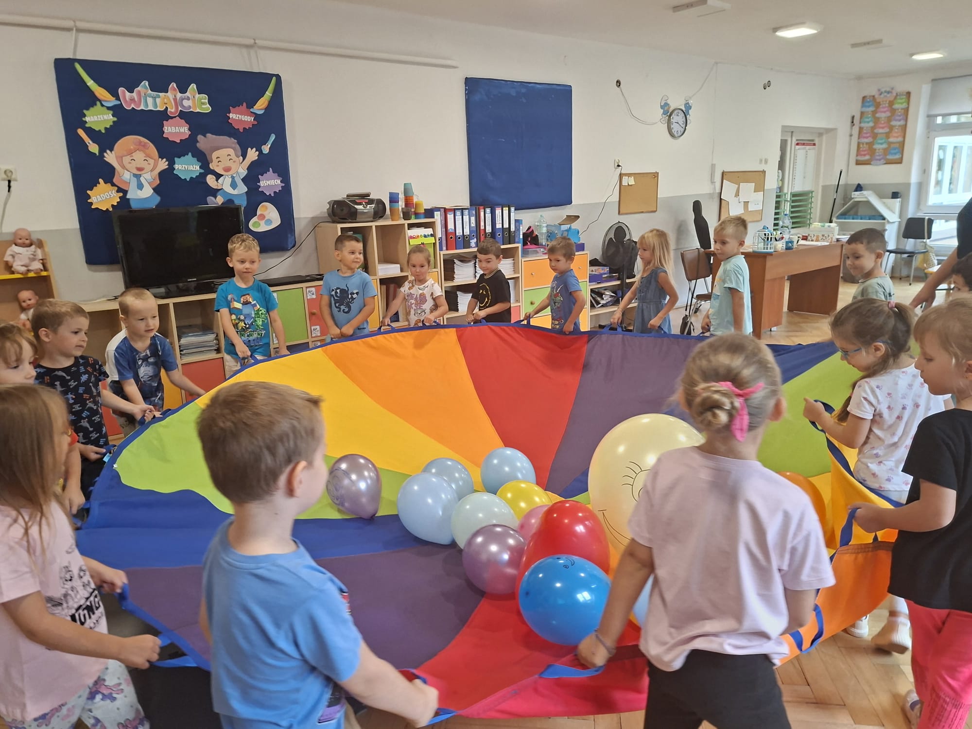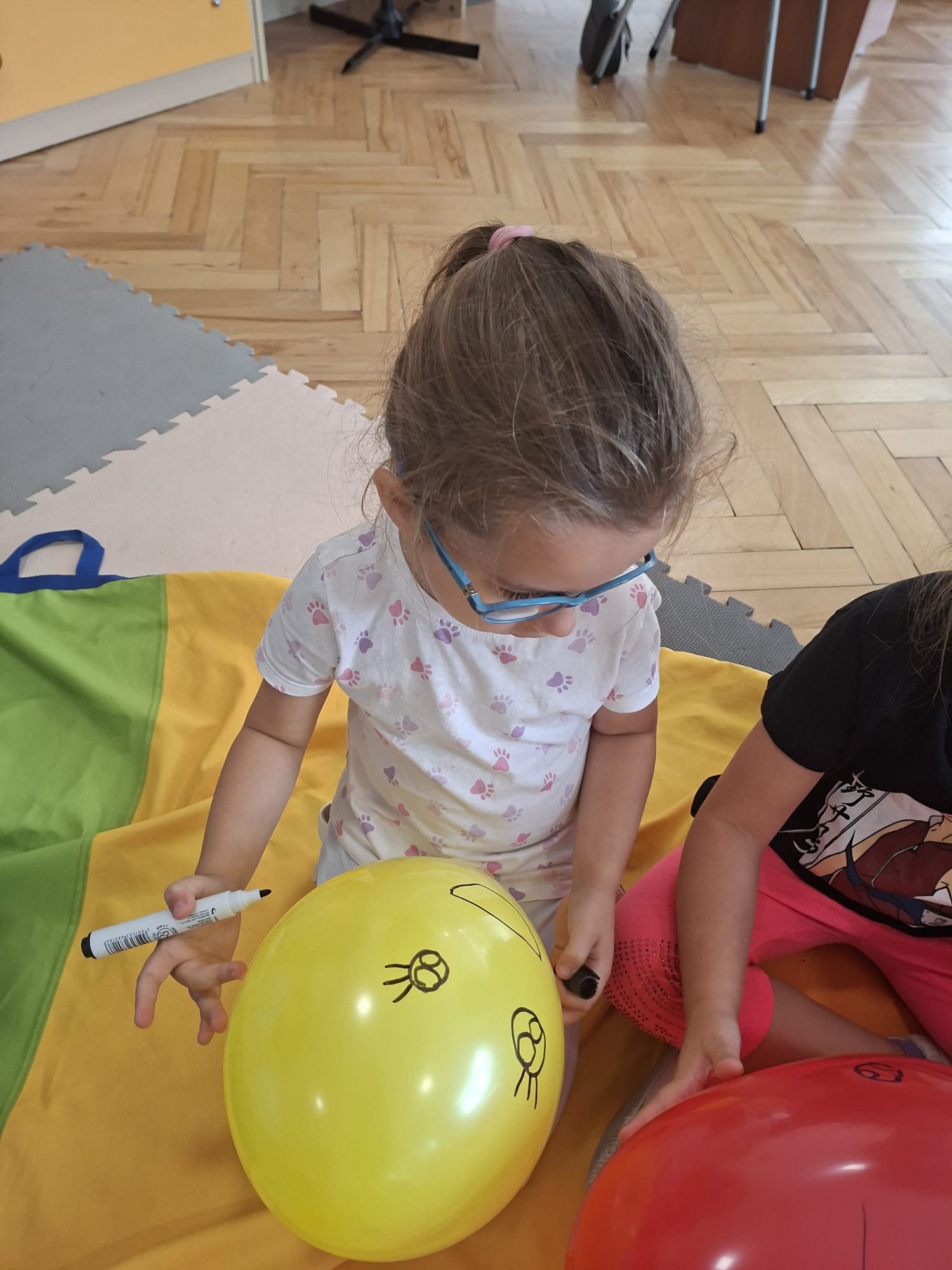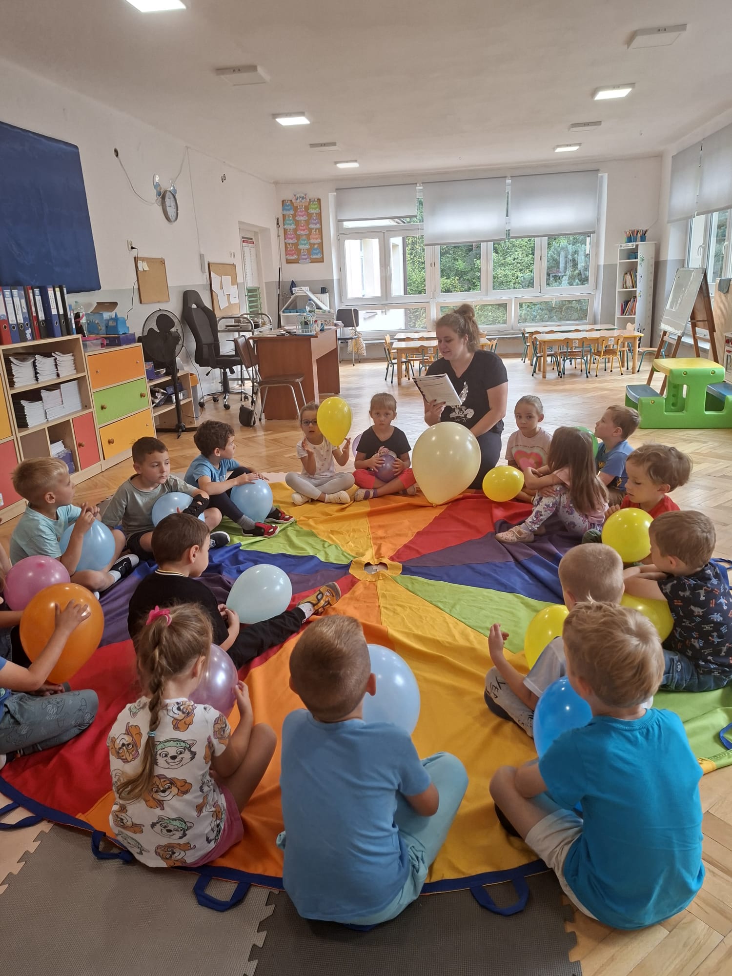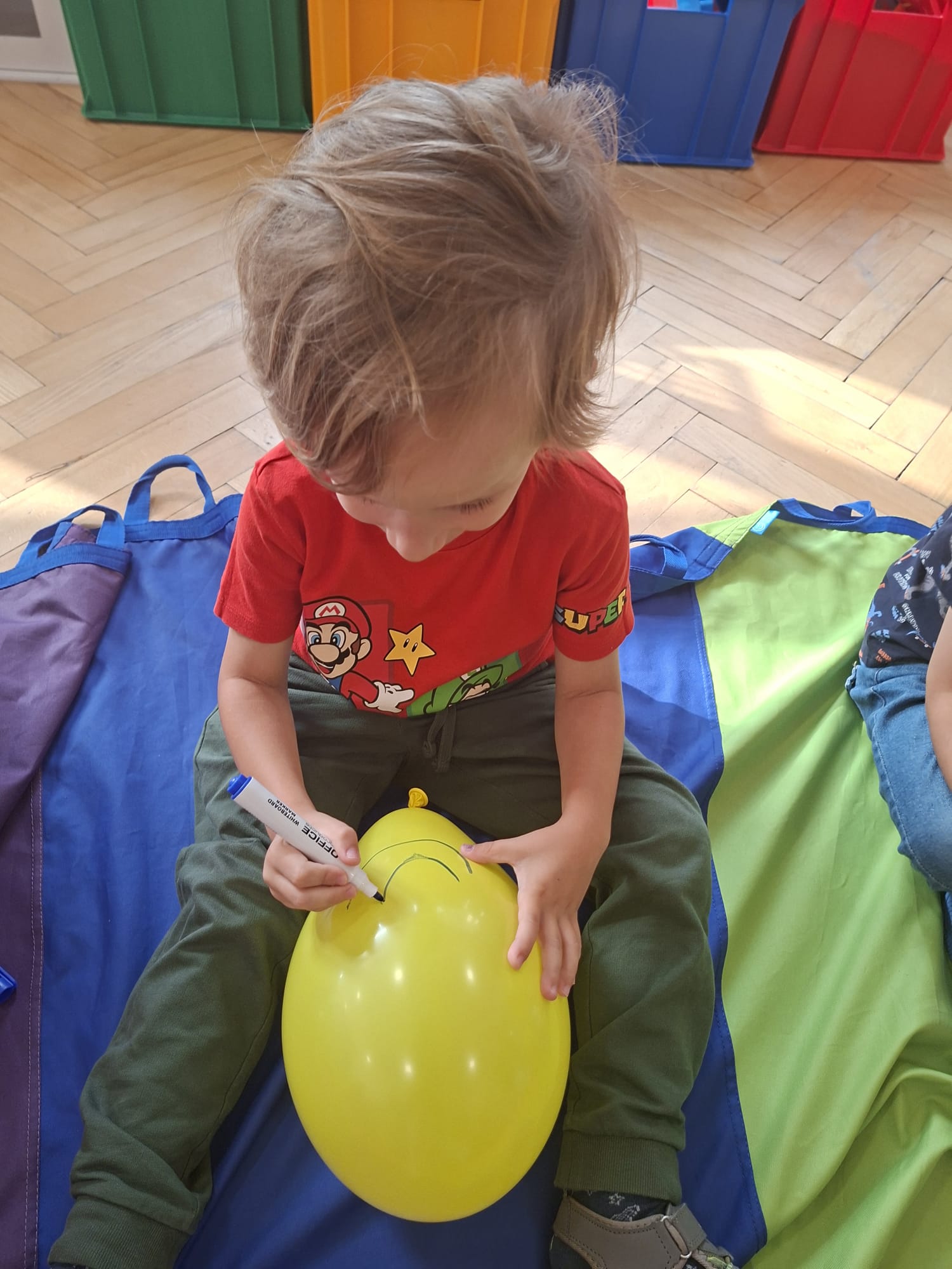 W minionym tygodniu przypominaliśmy sobie kodeks naszej grupy, słuchaliśmy opowiadania M. Pawlisz - "Kodeks - czemu nie" , rozmawiając wspólnie o nim. Rysowaliśmy na balonikach swoje emocje - rozmawiając później o nich , dlaczego dzisiaj tak się czujemy. Rozłożyliśmy balony na chuście animacyjnej szukając swojego balonika, bawiliśmy się z wykorzystaniem chusty.