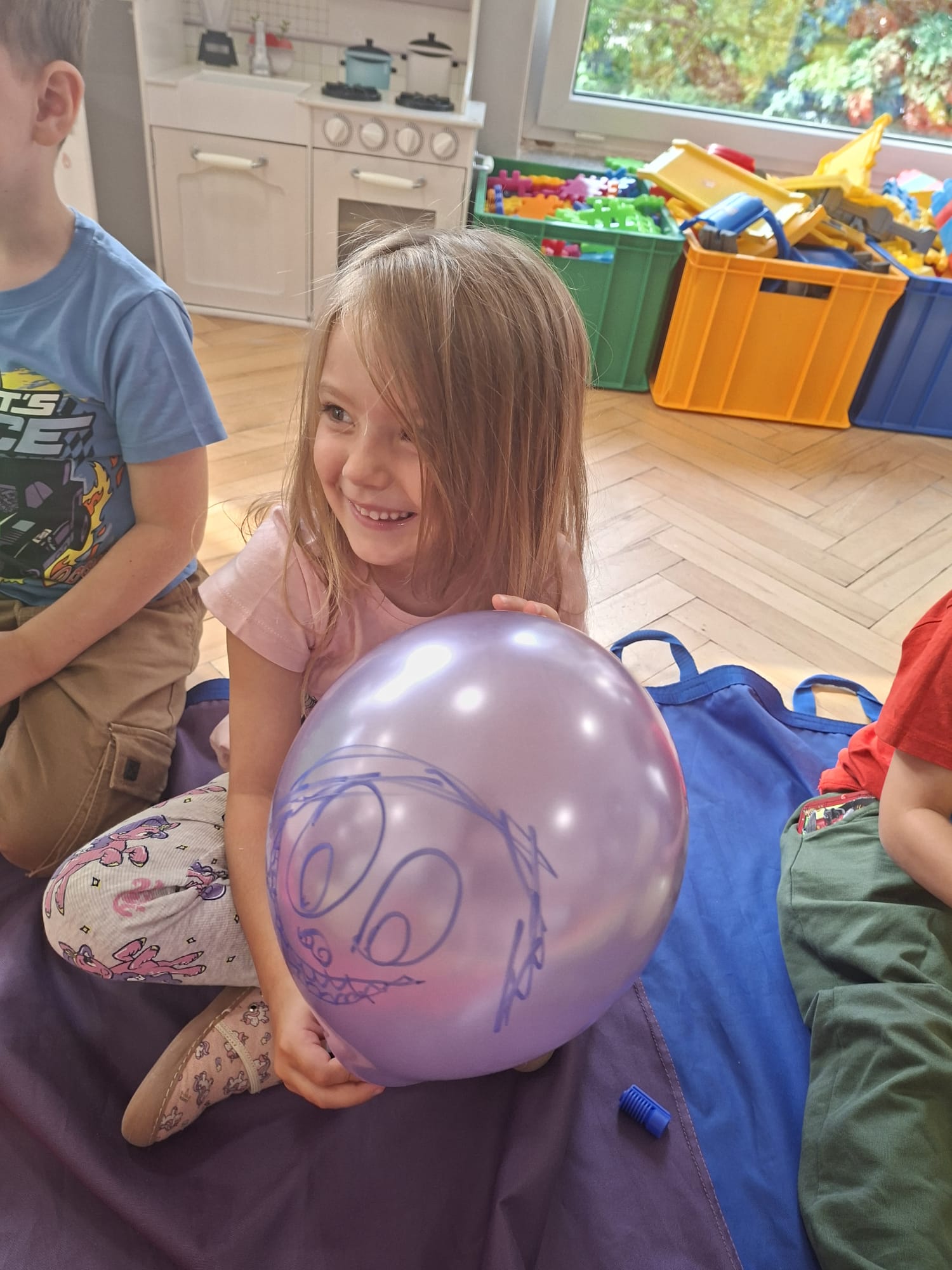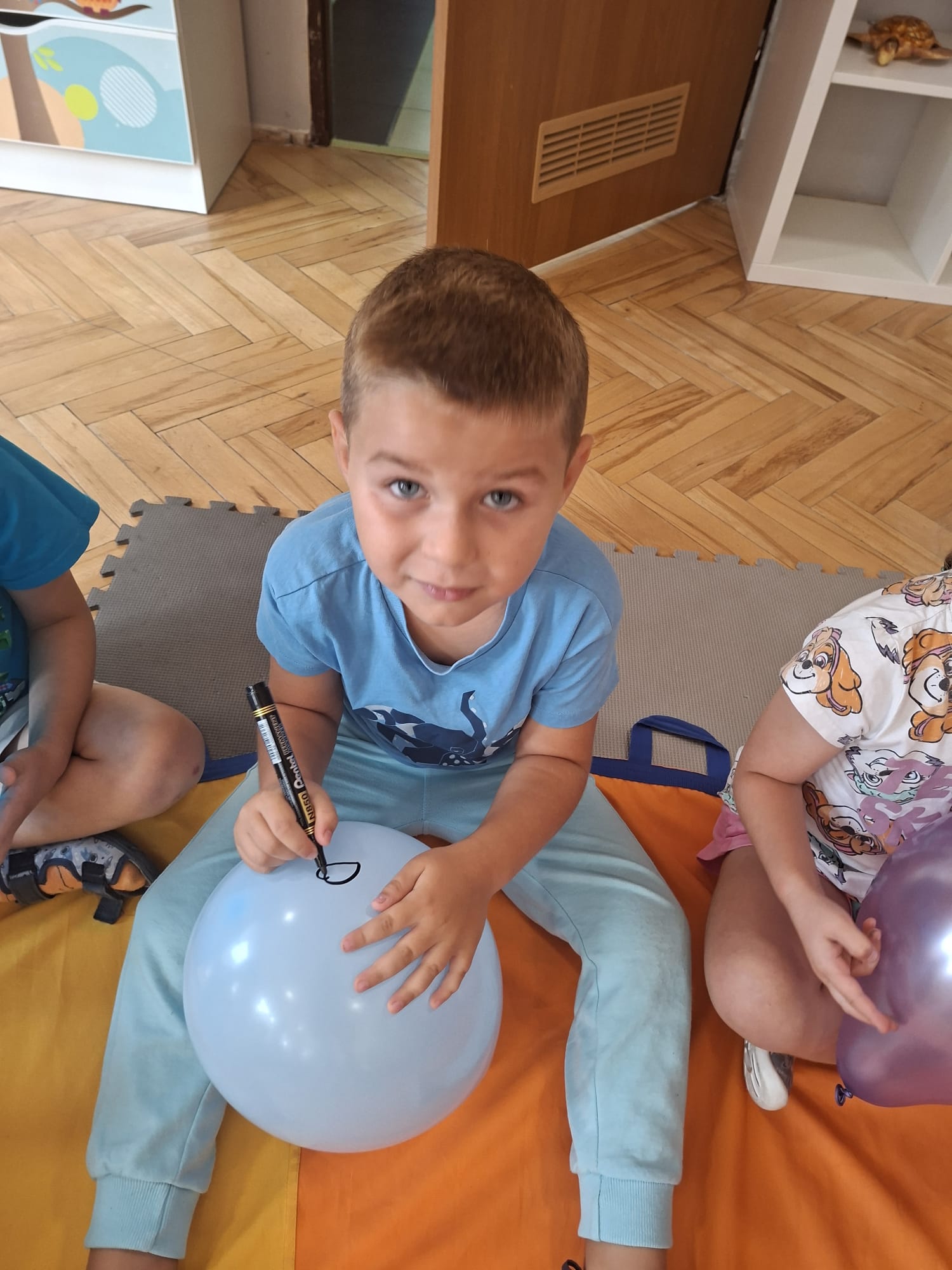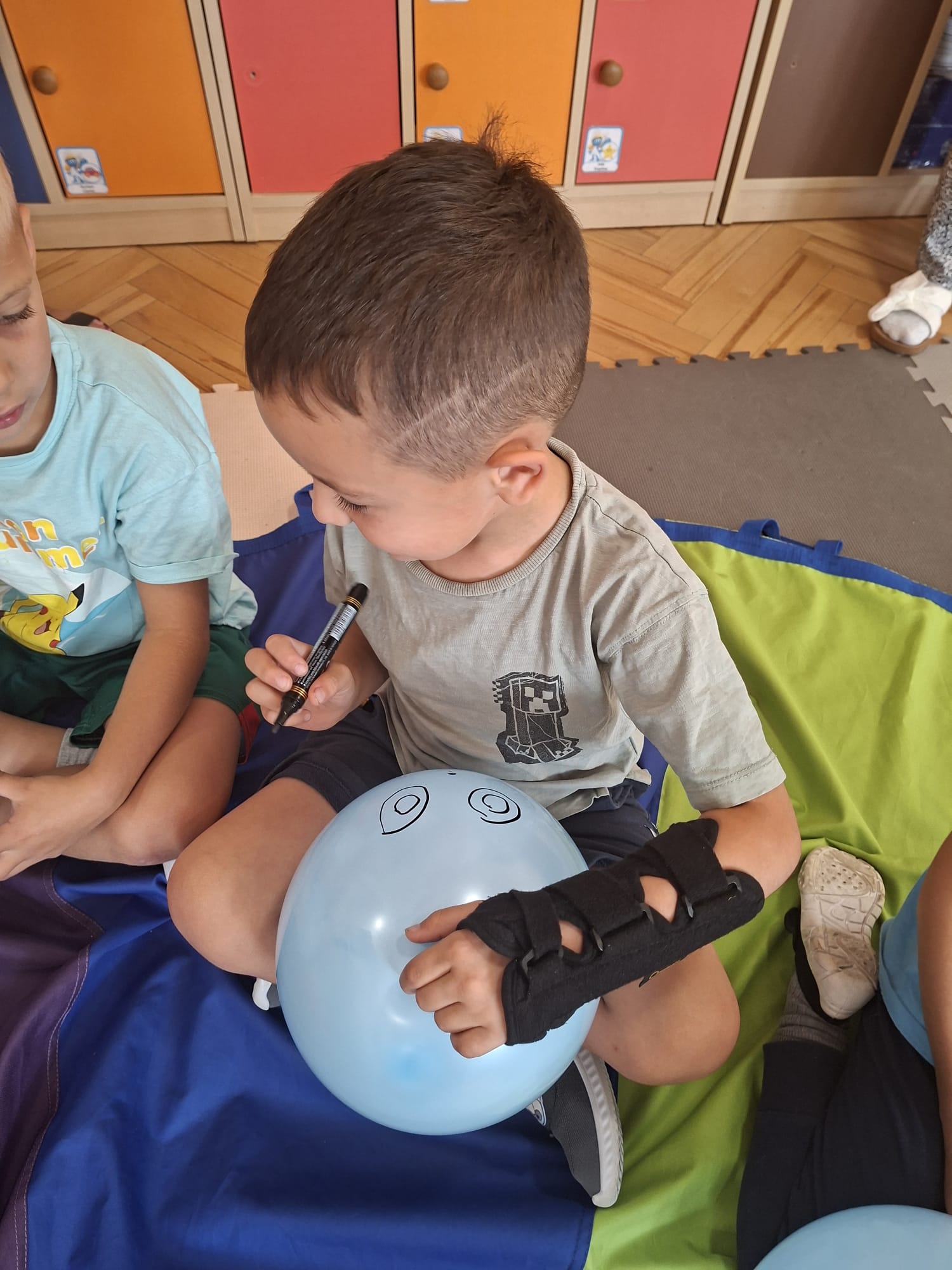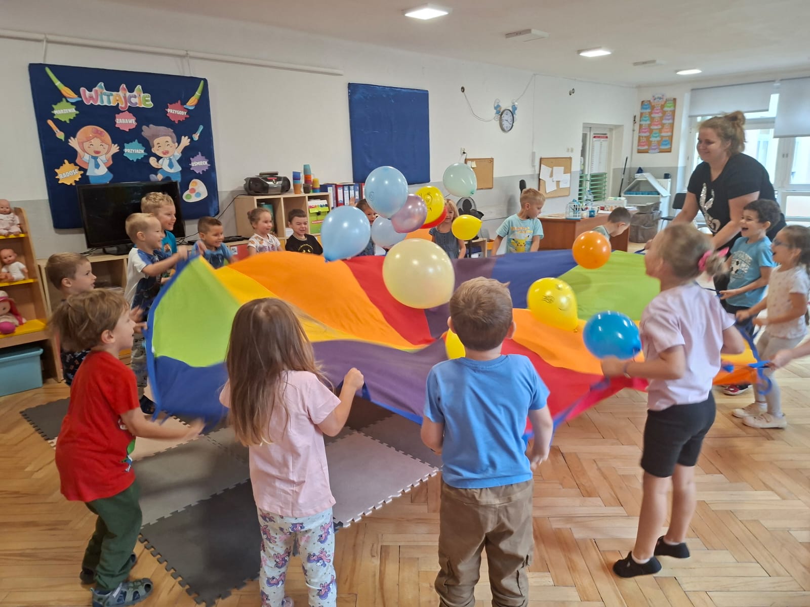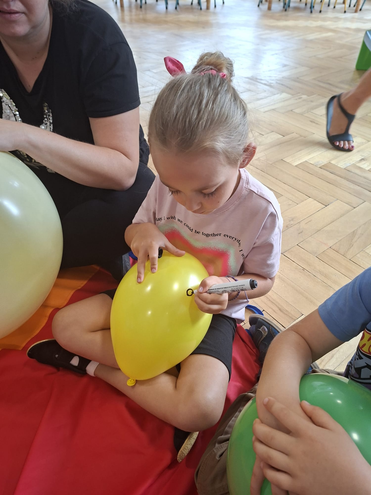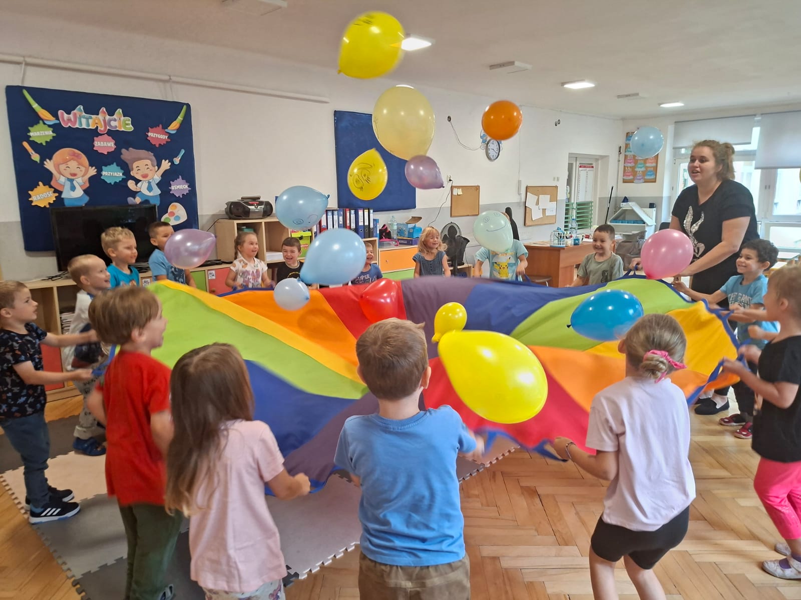 W minionym tygodniu przypominaliśmy sobie kodeks naszej grupy, słuchaliśmy opowiadania M. Pawlisz - "Kodeks - czemu nie" , rozmawiając wspólnie o nim. Rysowaliśmy na balonikach swoje emocje - rozmawiając później o nich , dlaczego dzisiaj tak się czujemy. Rozłożyliśmy balony na chuście animacyjnej szukając swojego balonika, bawiliśmy się z wykorzystaniem chusty.
