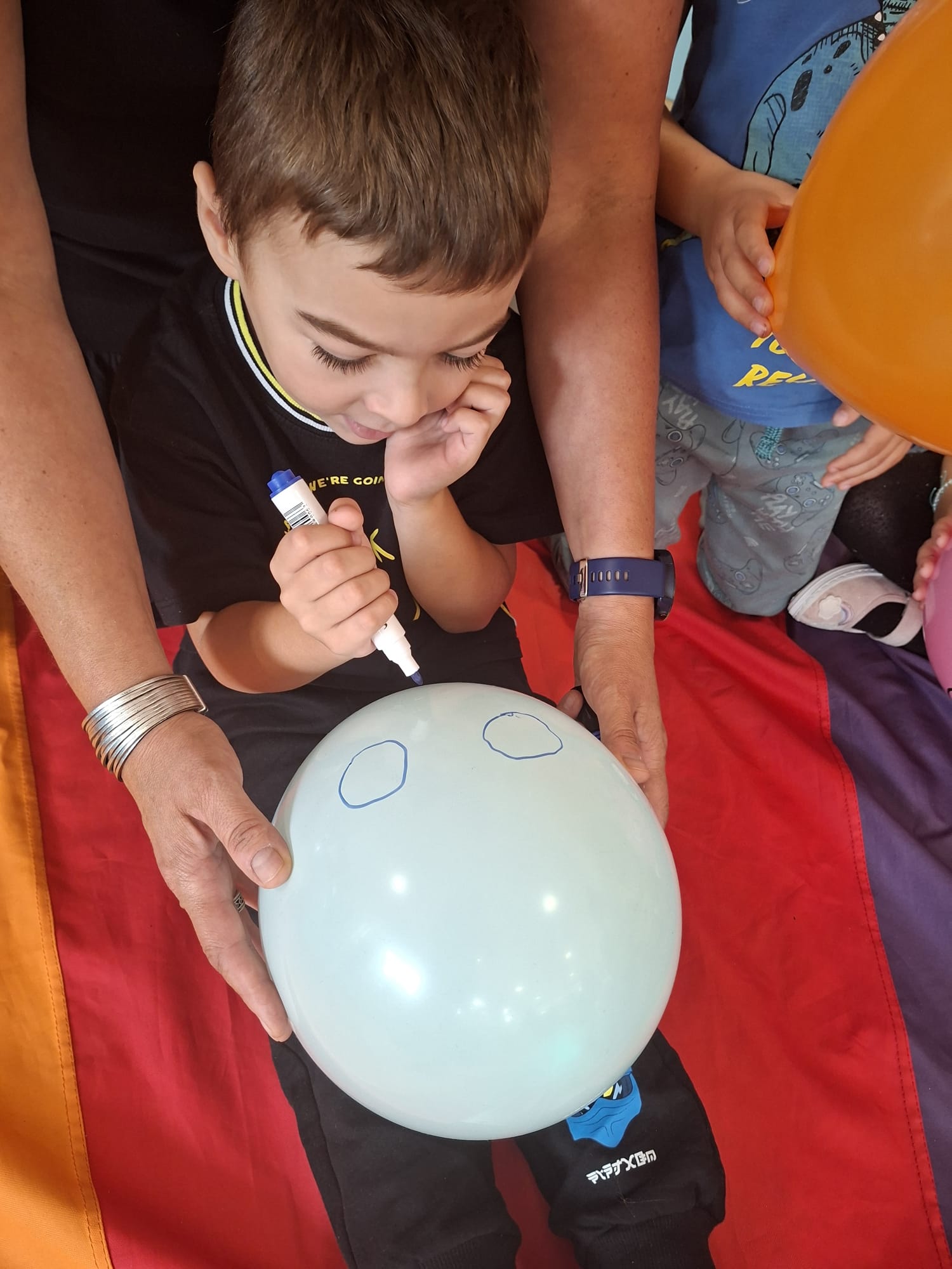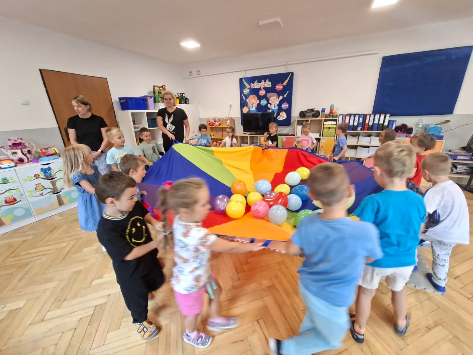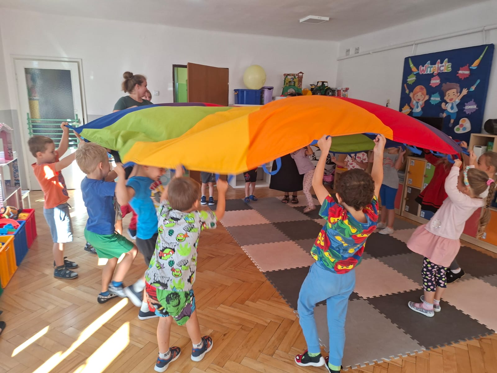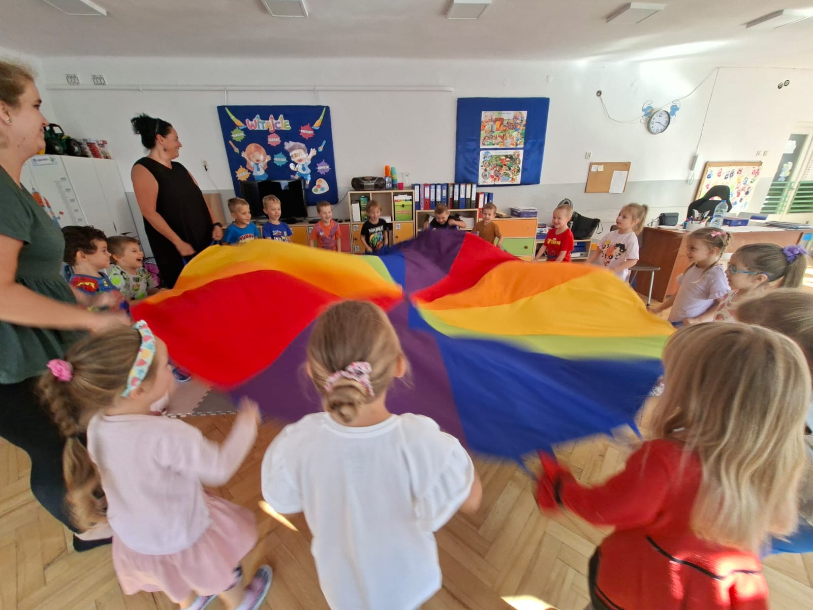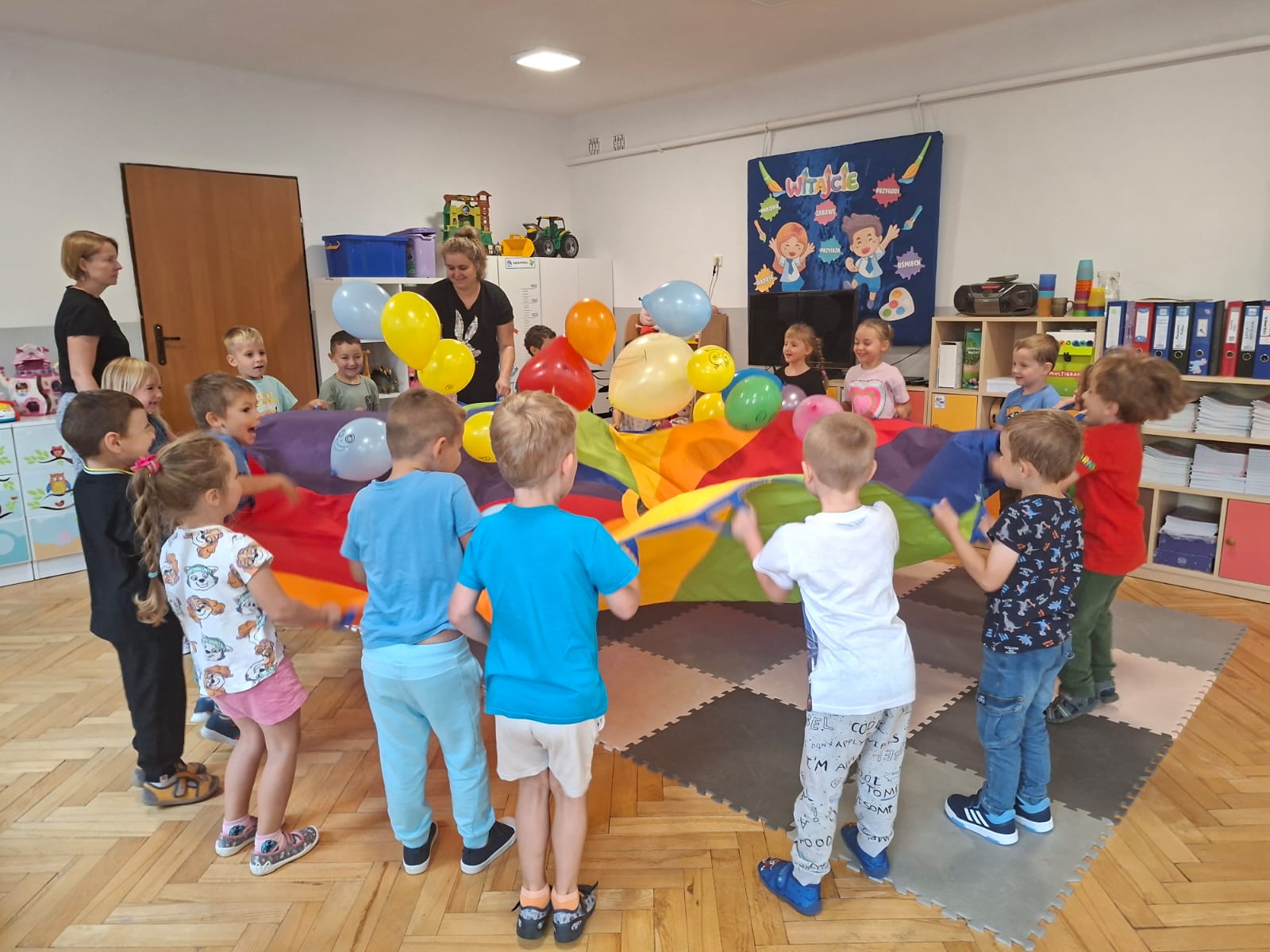 W minionym tygodniu przypominaliśmy sobie kodeks naszej grupy, słuchaliśmy opowiadania M. Pawlisz - "Kodeks - czemu nie" , rozmawiając wspólnie o nim. Rysowaliśmy na balonikach swoje emocje - rozmawiając później o nich , dlaczego dzisiaj tak się czujemy. Rozłożyliśmy balony na chuście animacyjnej szukając swojego balonika, bawiliśmy się z wykorzystaniem chusty.