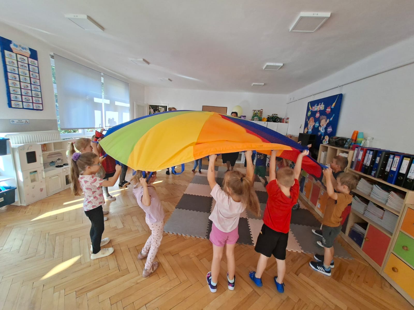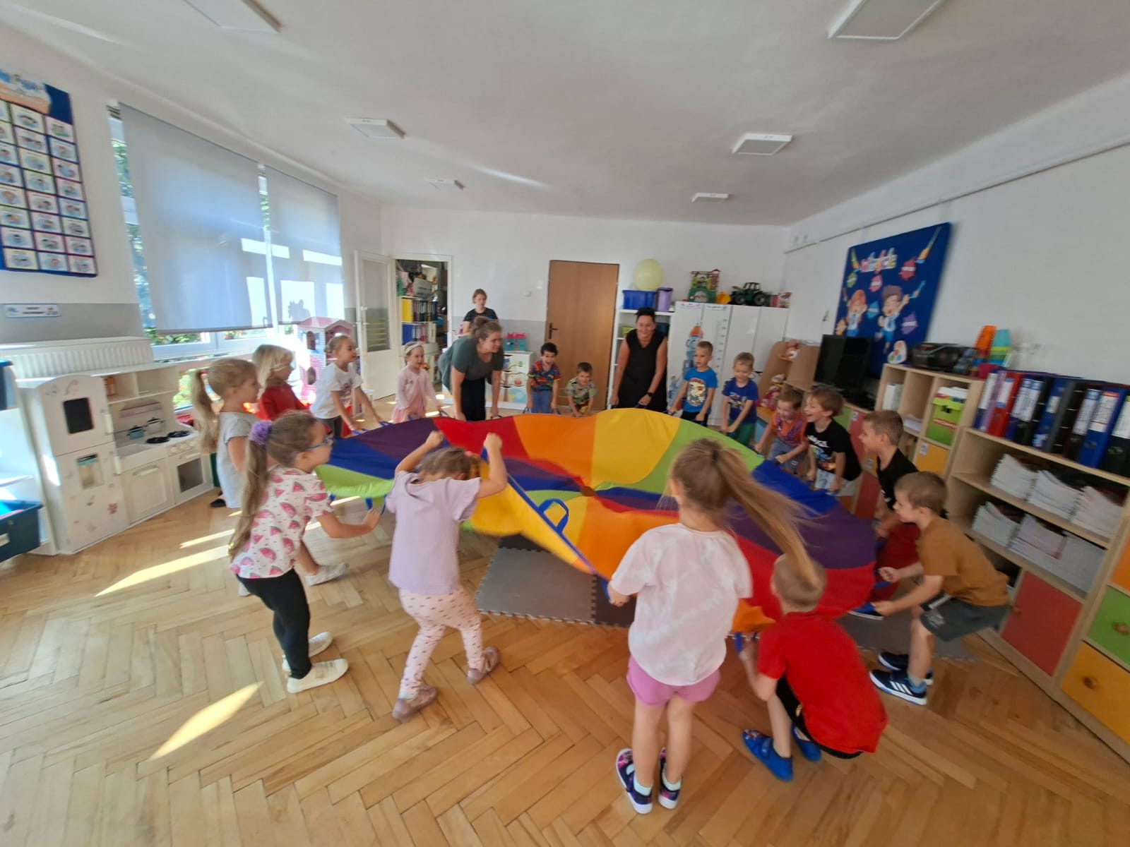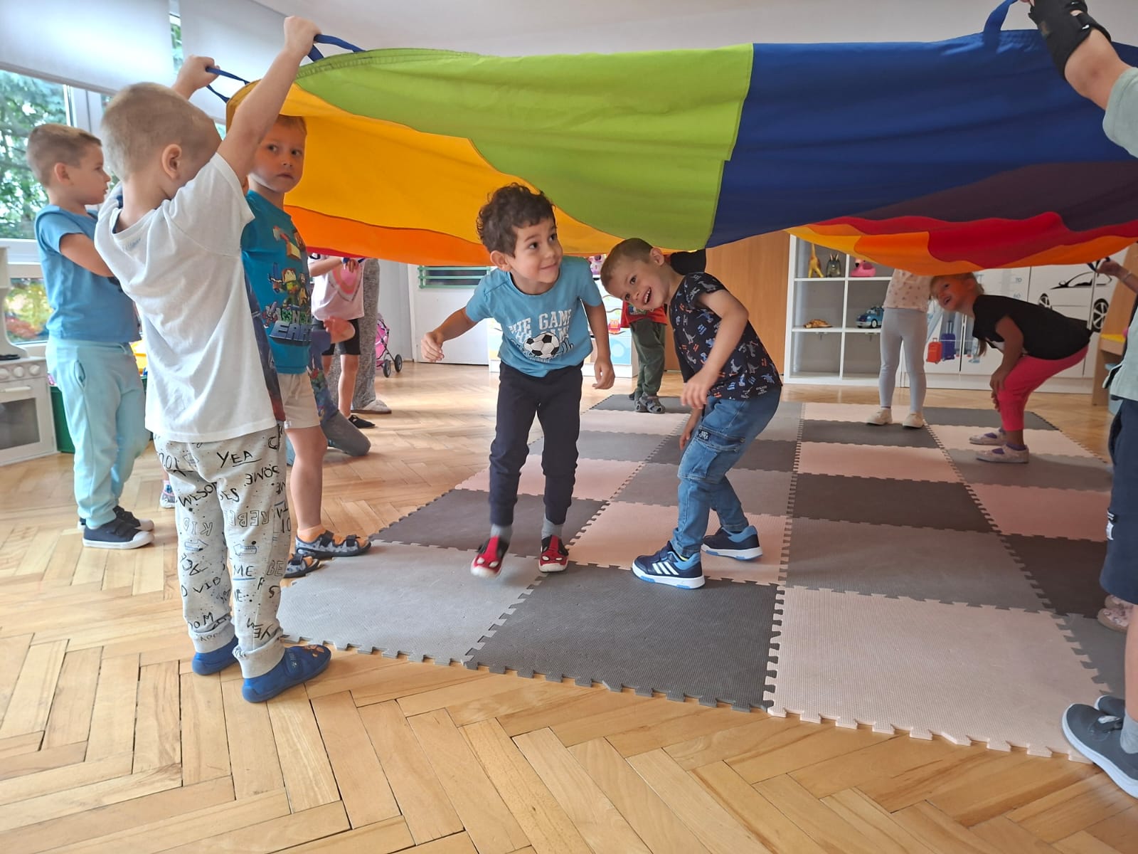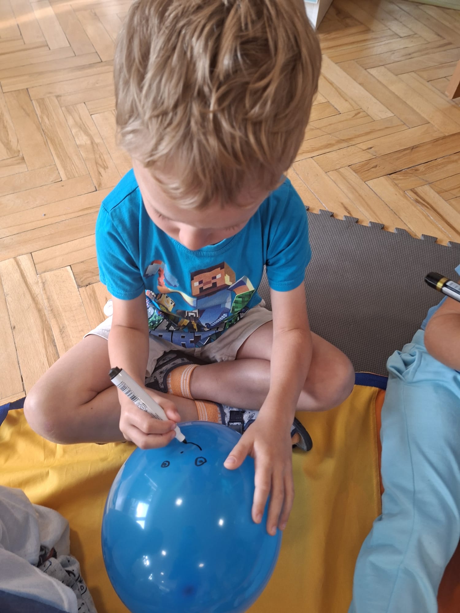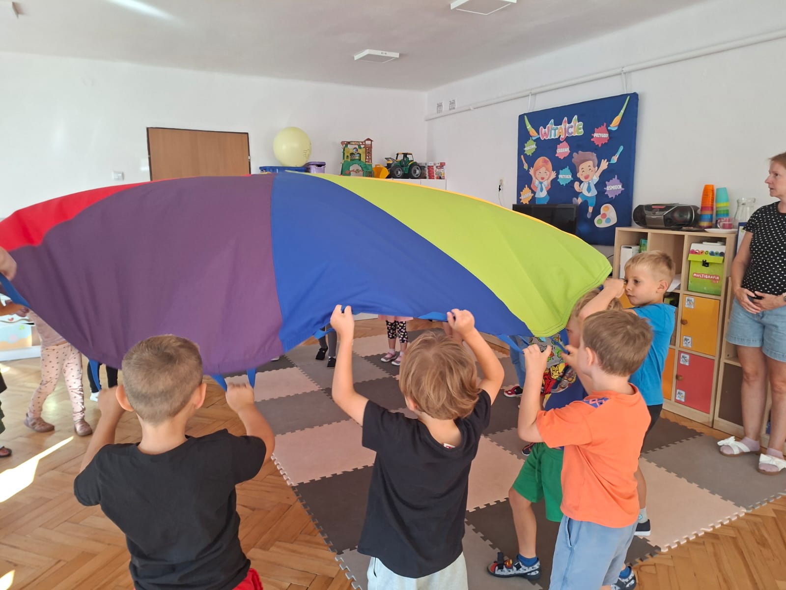 W minionym tygodniu przypominaliśmy sobie kodeks naszej grupy, słuchaliśmy opowiadania M. Pawlisz - "Kodeks - czemu nie" , rozmawiając wspólnie o nim. Rysowaliśmy na balonikach swoje emocje - rozmawiając później o nich , dlaczego dzisiaj tak się czujemy. Rozłożyliśmy balony na chuście animacyjnej szukając swojego balonika, bawiliśmy się z wykorzystaniem chusty.