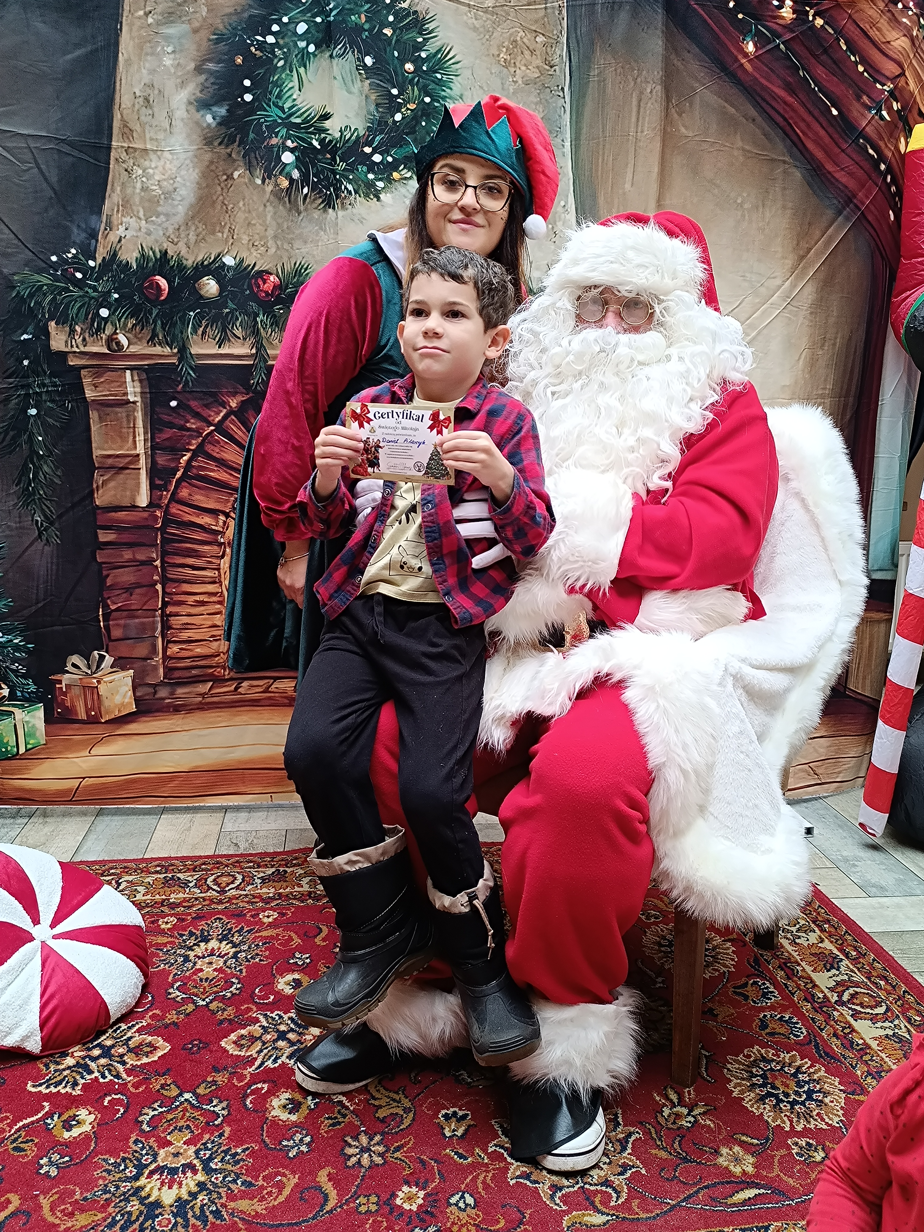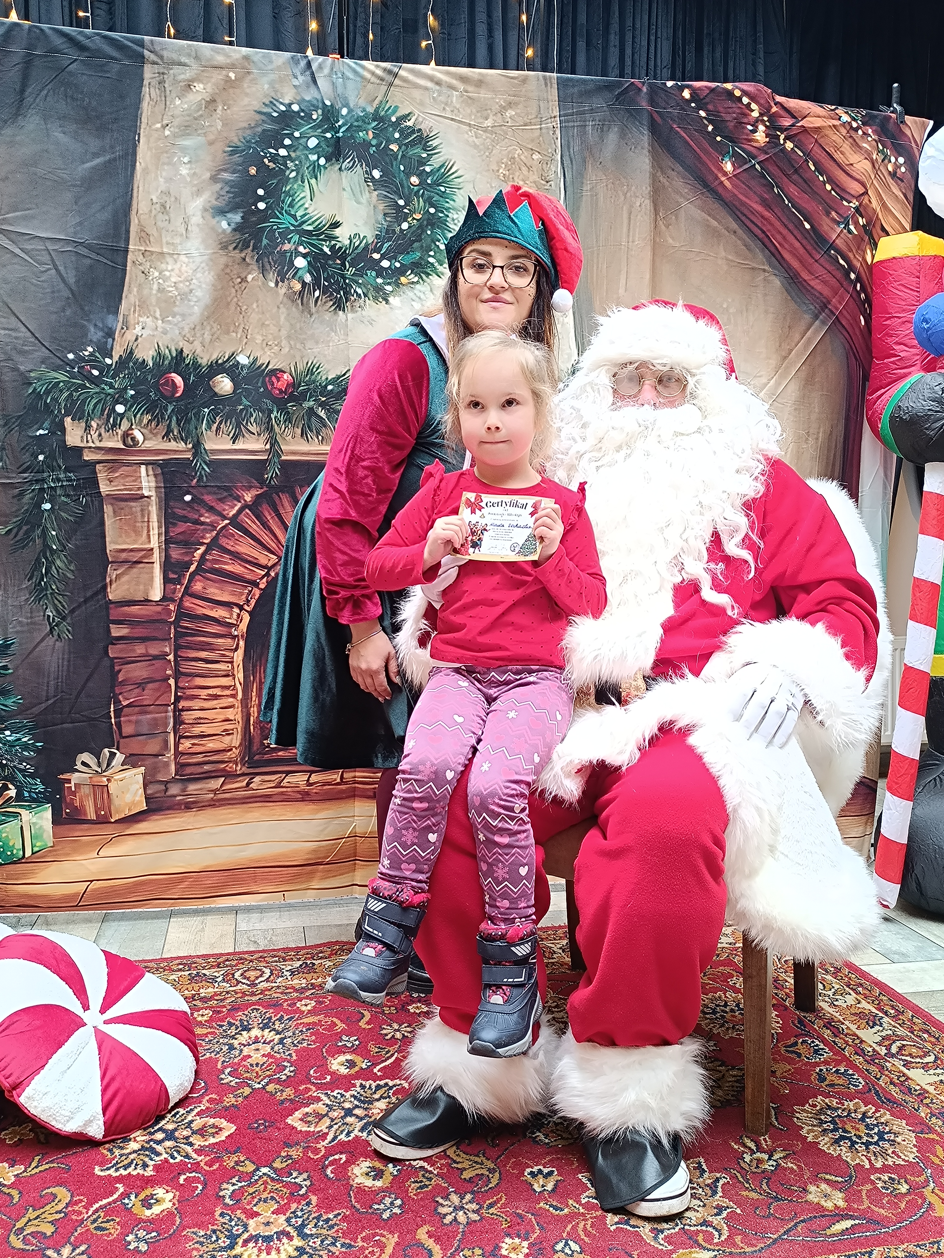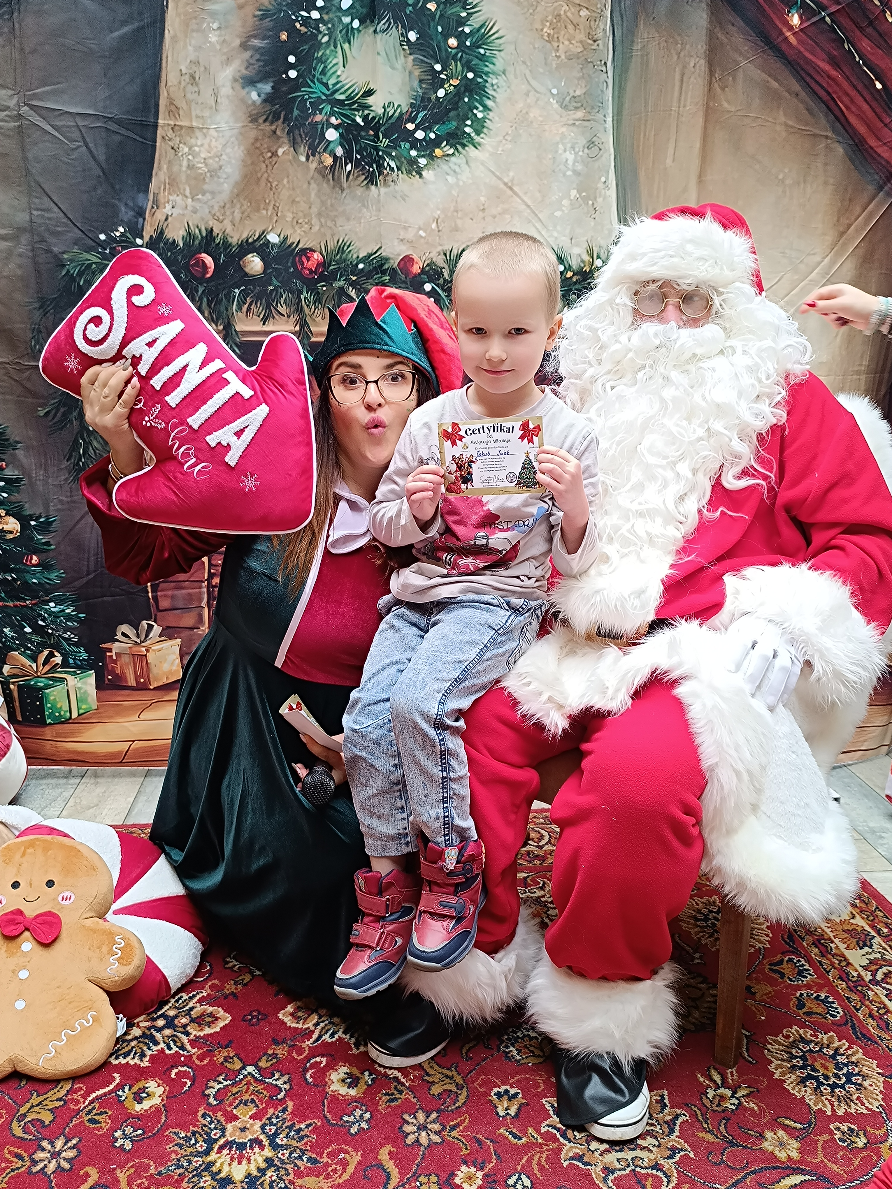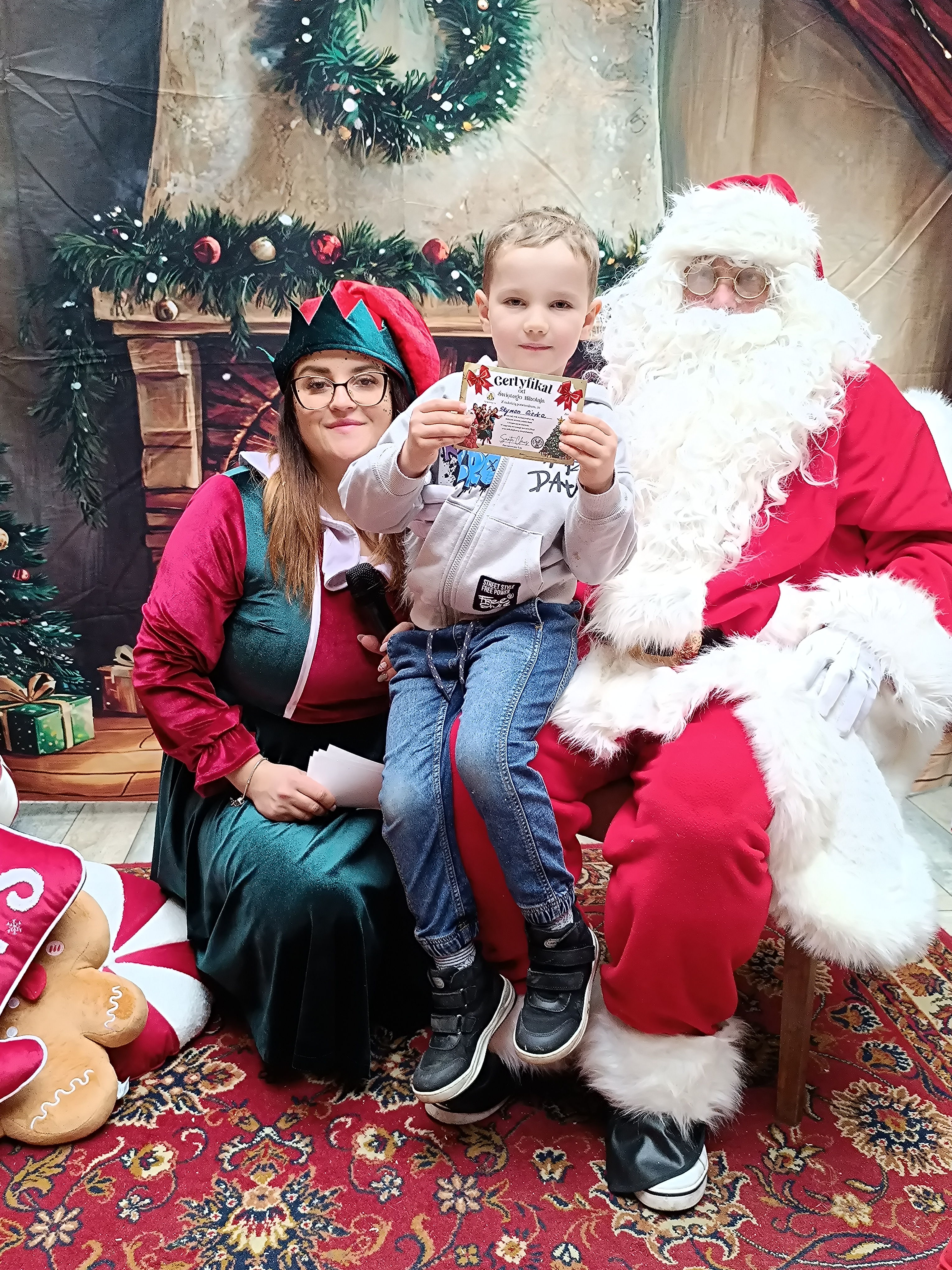 Następnie przedszkolaki przeszły do sali, gdzie panowała magiczna mikołajkowa atmosfera, tam dzieci uczestniczyły w zabawach ruchowo - muzycznych. Spotkały tam maskotkę Olafa. Głównym punktem wizyty w Fabryce Świątecznych Cudów , było spotkanie z Świętym Mikołajem, od którego każde dziecko otrzymało pamiątkowy certyfikt.