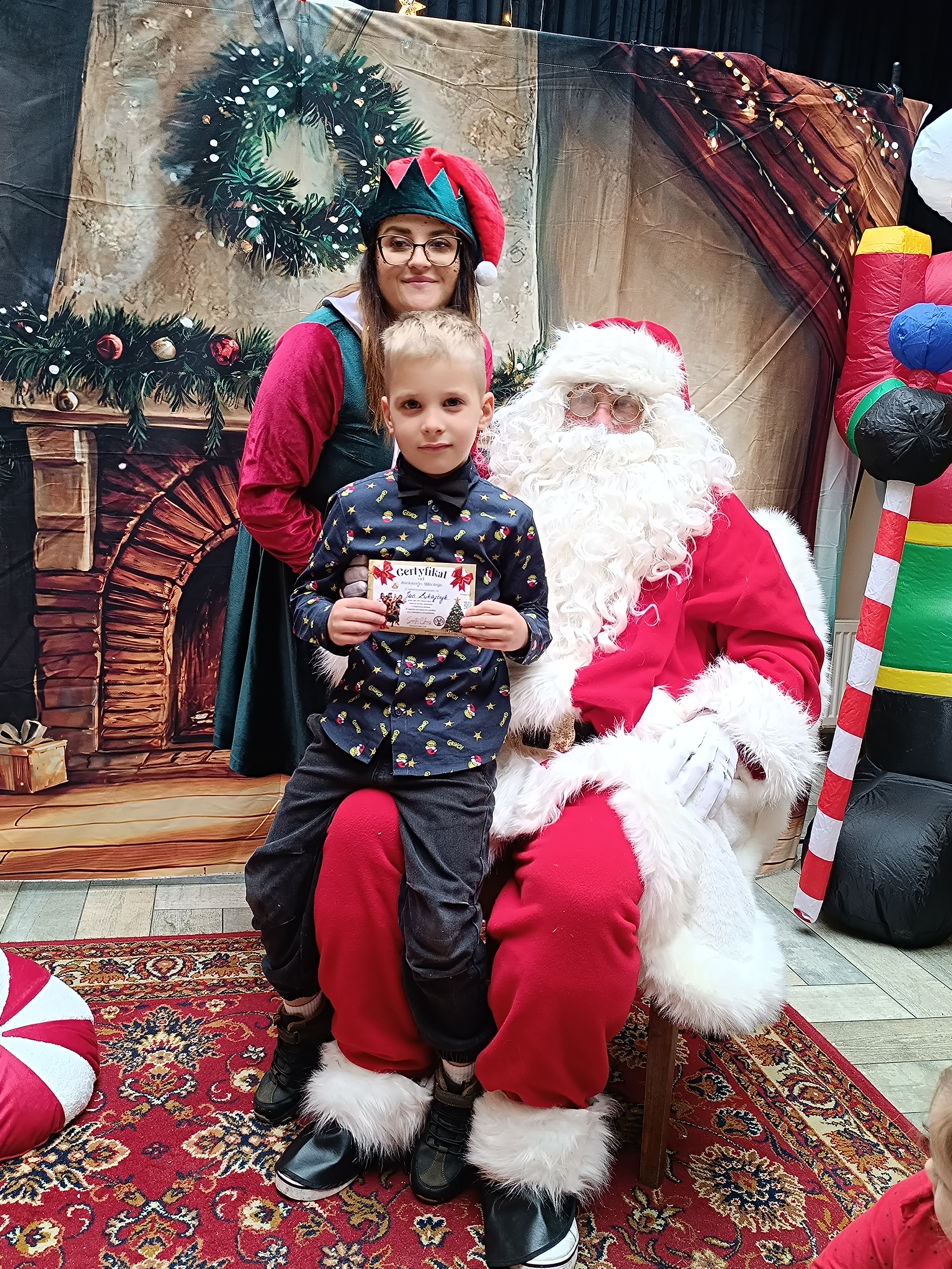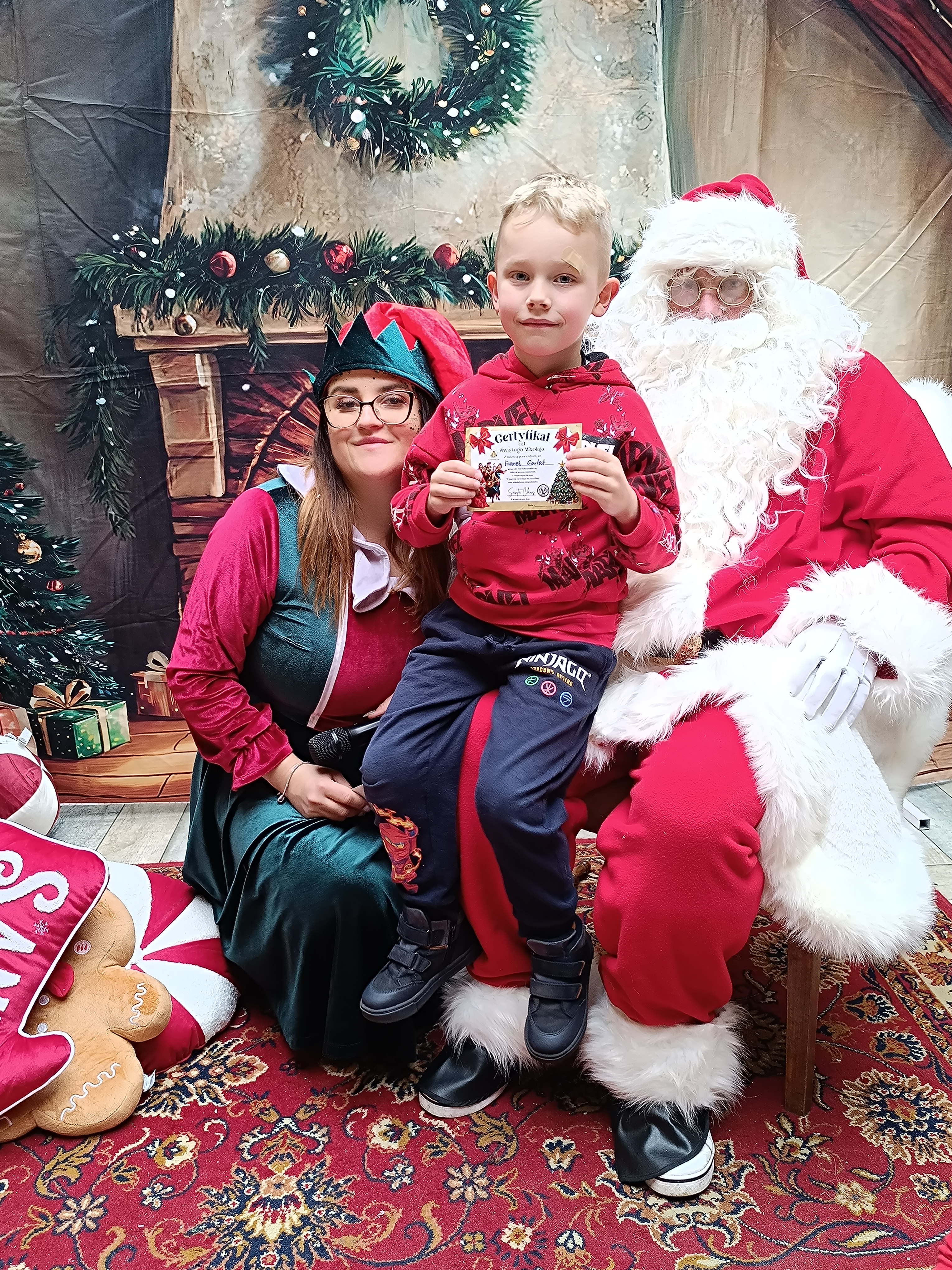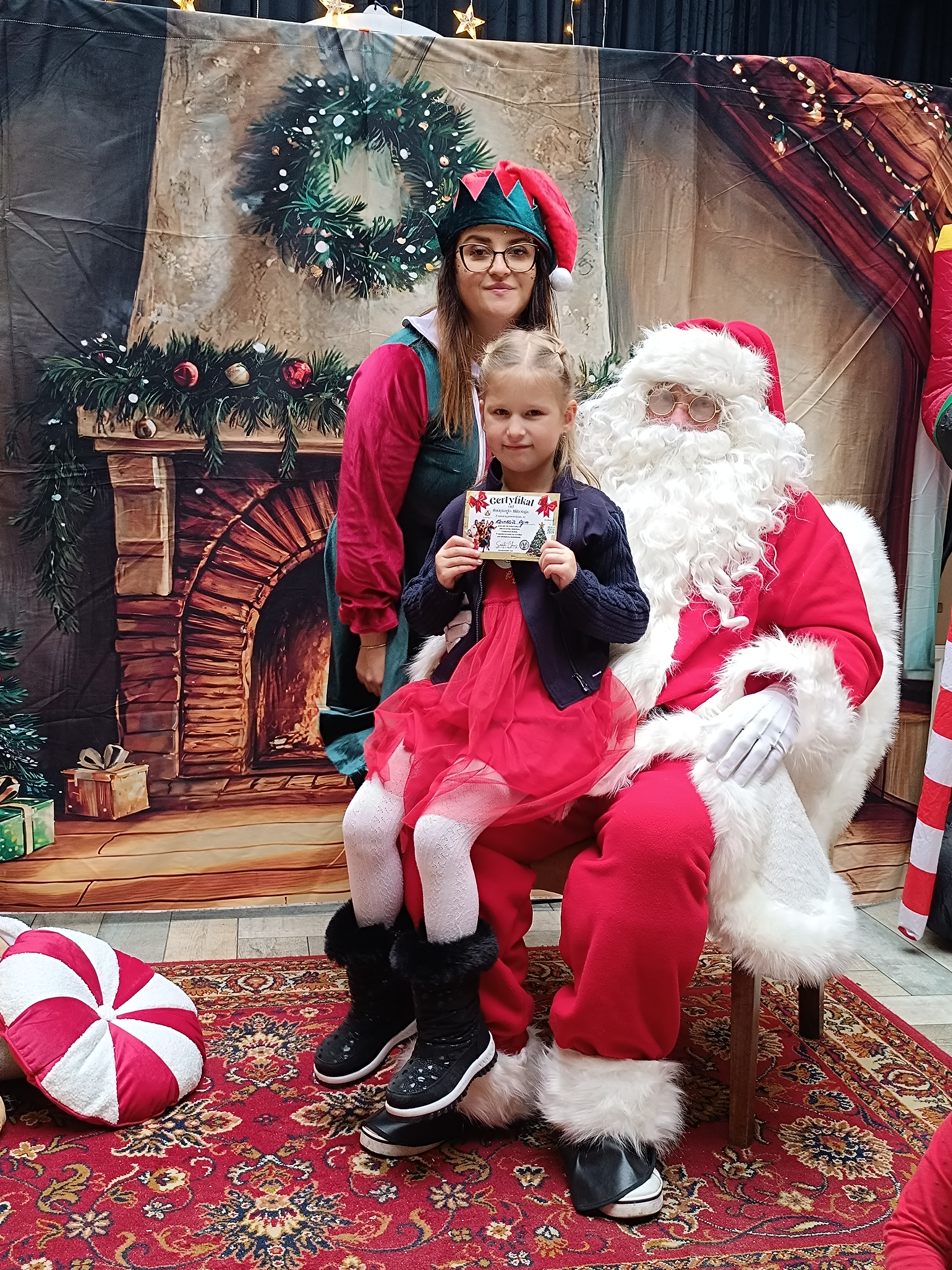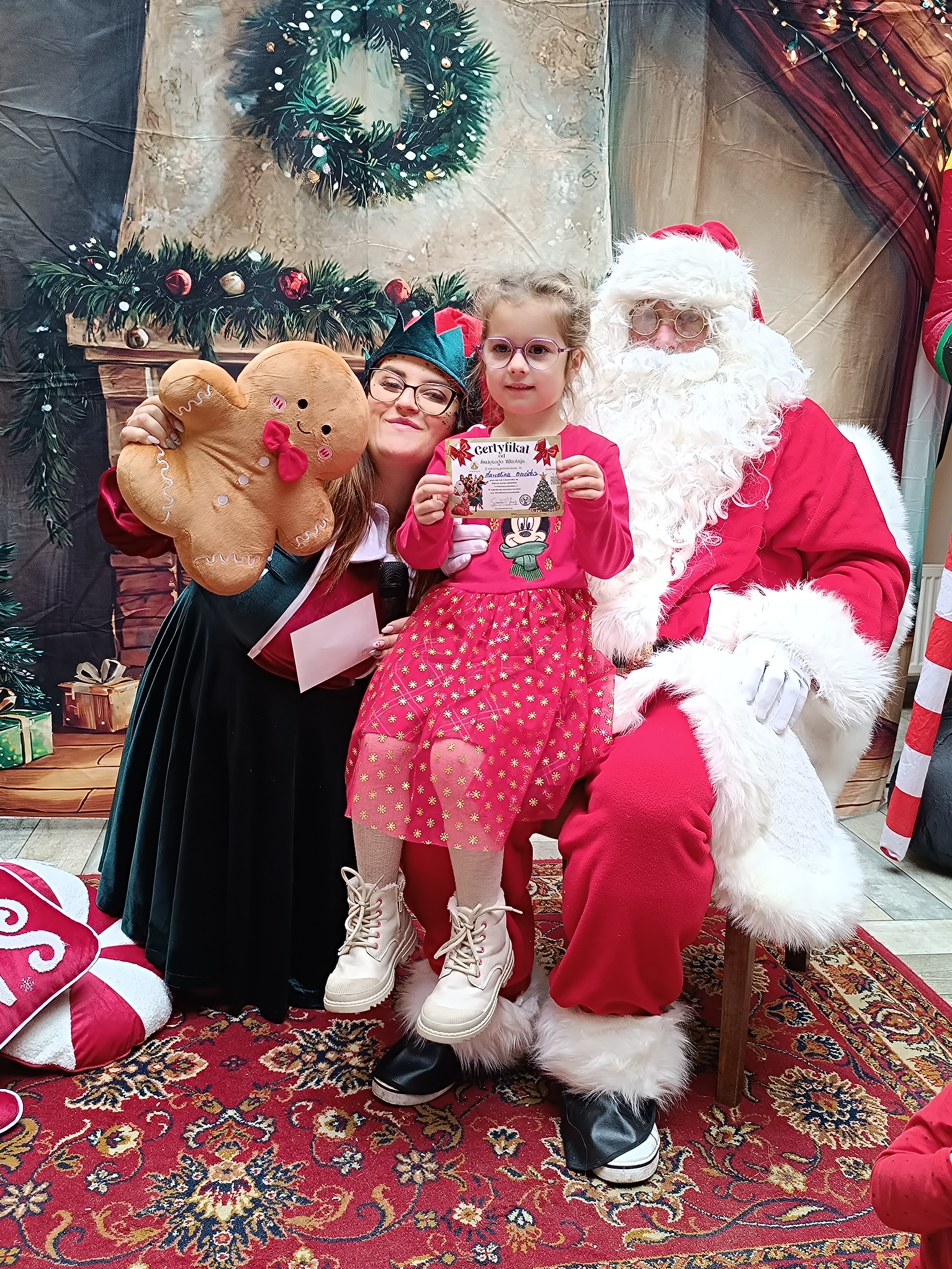 Następnie przedszkolaki przeszły do sali, gdzie panowała magiczna mikołajkowa atmosfera, tam dzieci uczestniczyły w zabawach ruchowo - muzycznych. Spotkały tam maskotkę Olafa. Głównym punktem wizyty w Fabryce Świątecznych Cudów , było spotkanie z Świętym Mikołajem, od którego każde dziecko otrzymało pamiątkowy certyfikt.