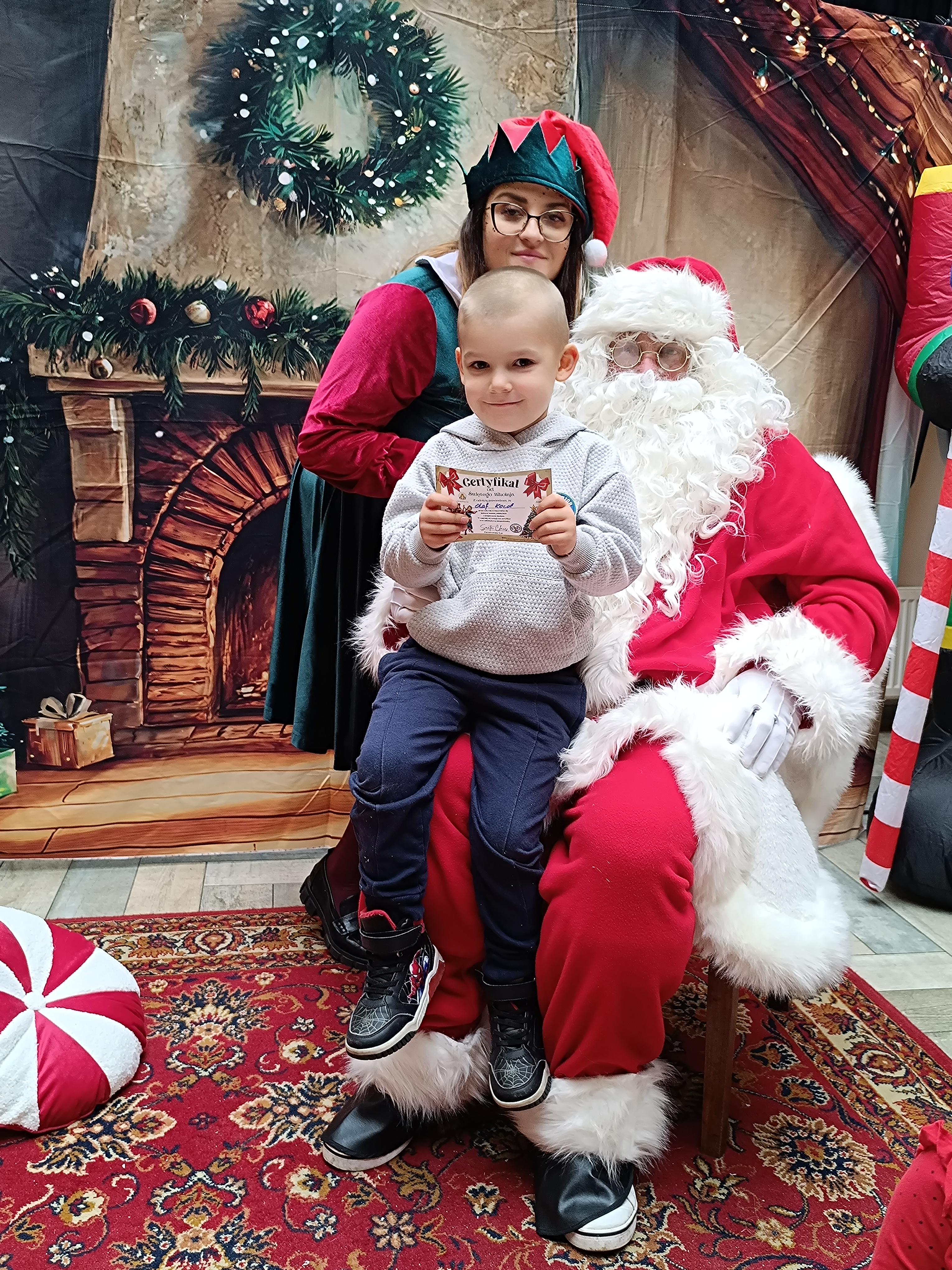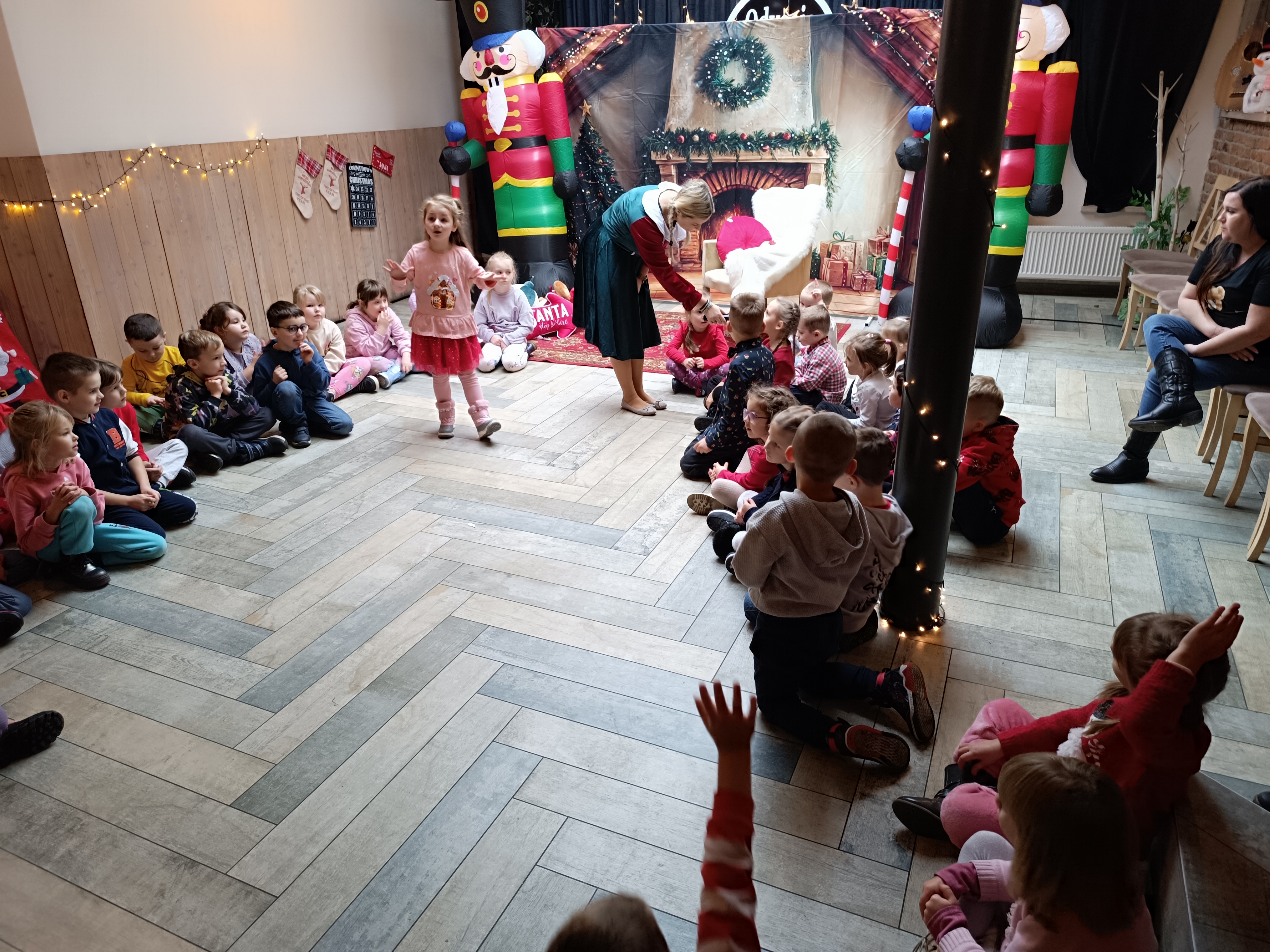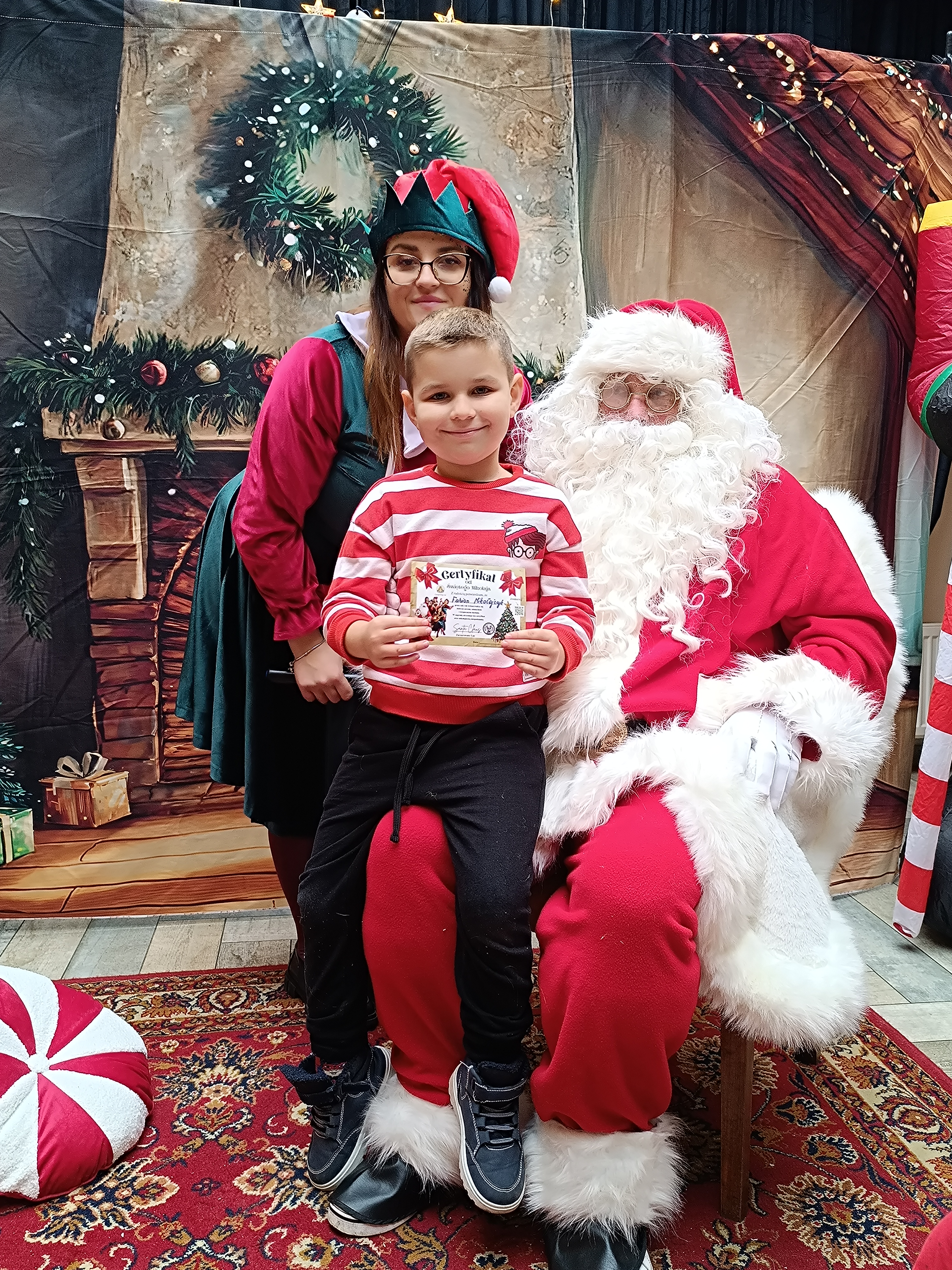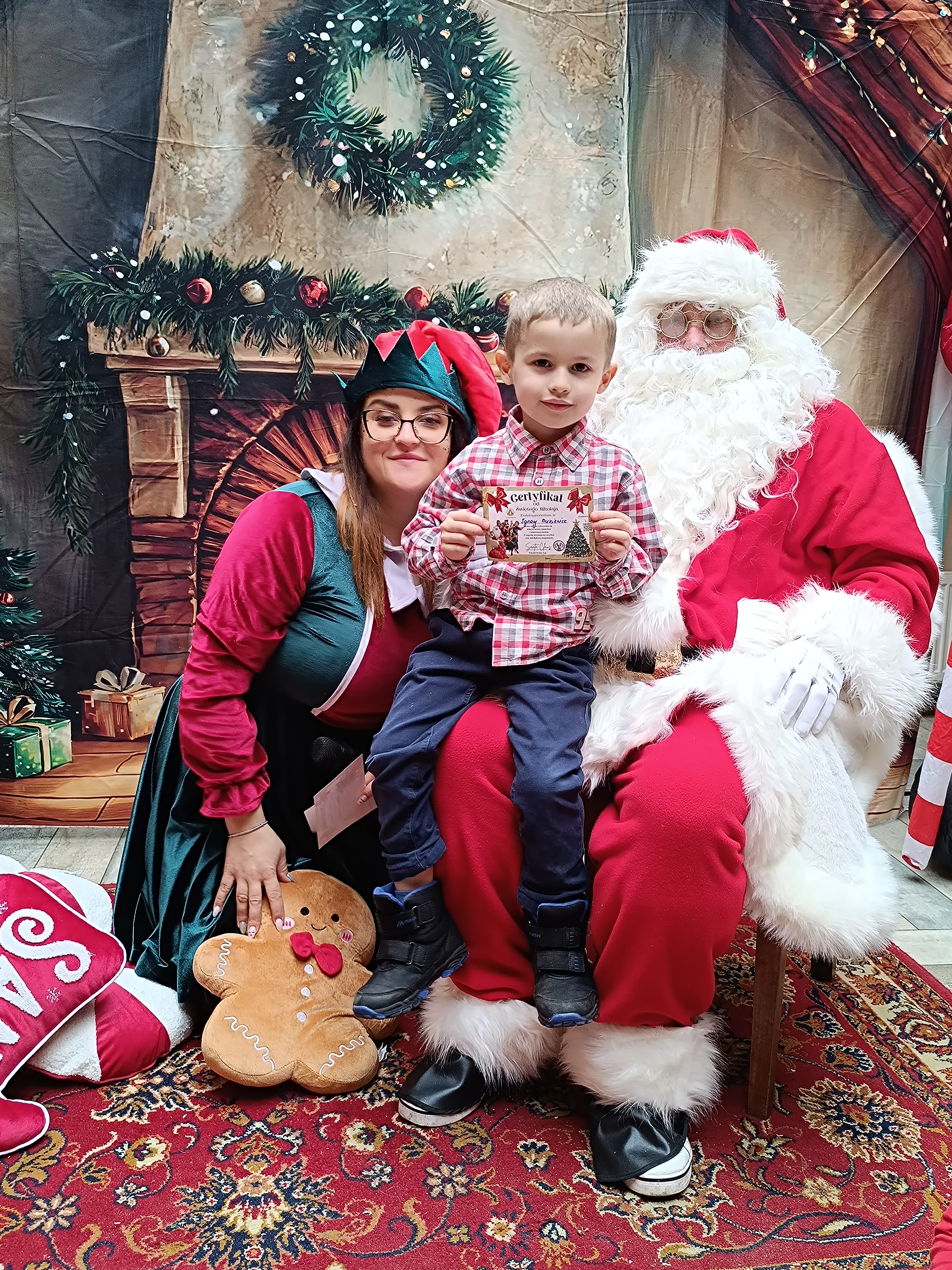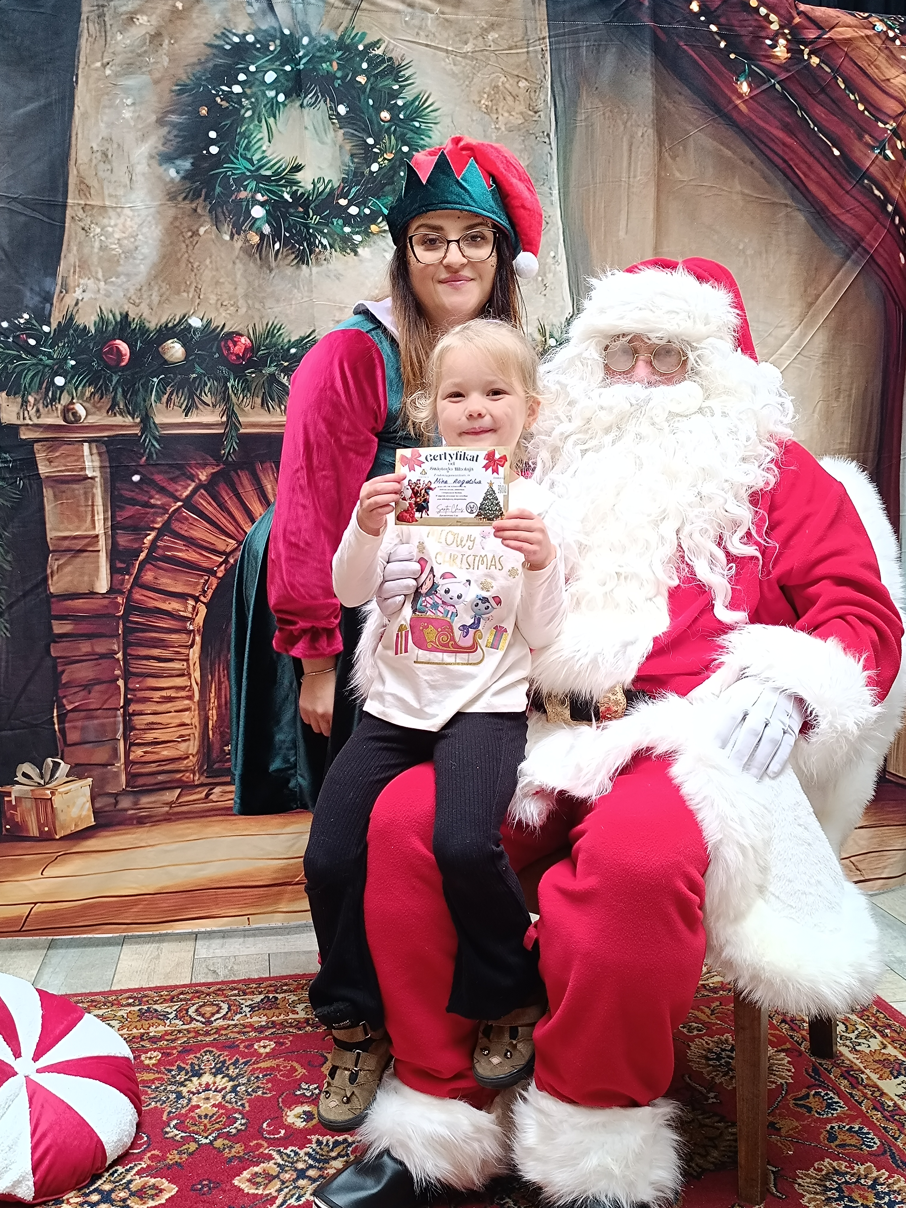 Następnie przedszkolaki przeszły do sali, gdzie panowała magiczna mikołajkowa atmosfera, tam dzieci uczestniczyły w zabawach ruchowo - muzycznych. Spotkały tam maskotkę Olafa. Głównym punktem wizyty w Fabryce Świątecznych Cudów , było spotkanie z Świętym Mikołajem, od którego każde dziecko otrzymało pamiątkowy certyfikt.