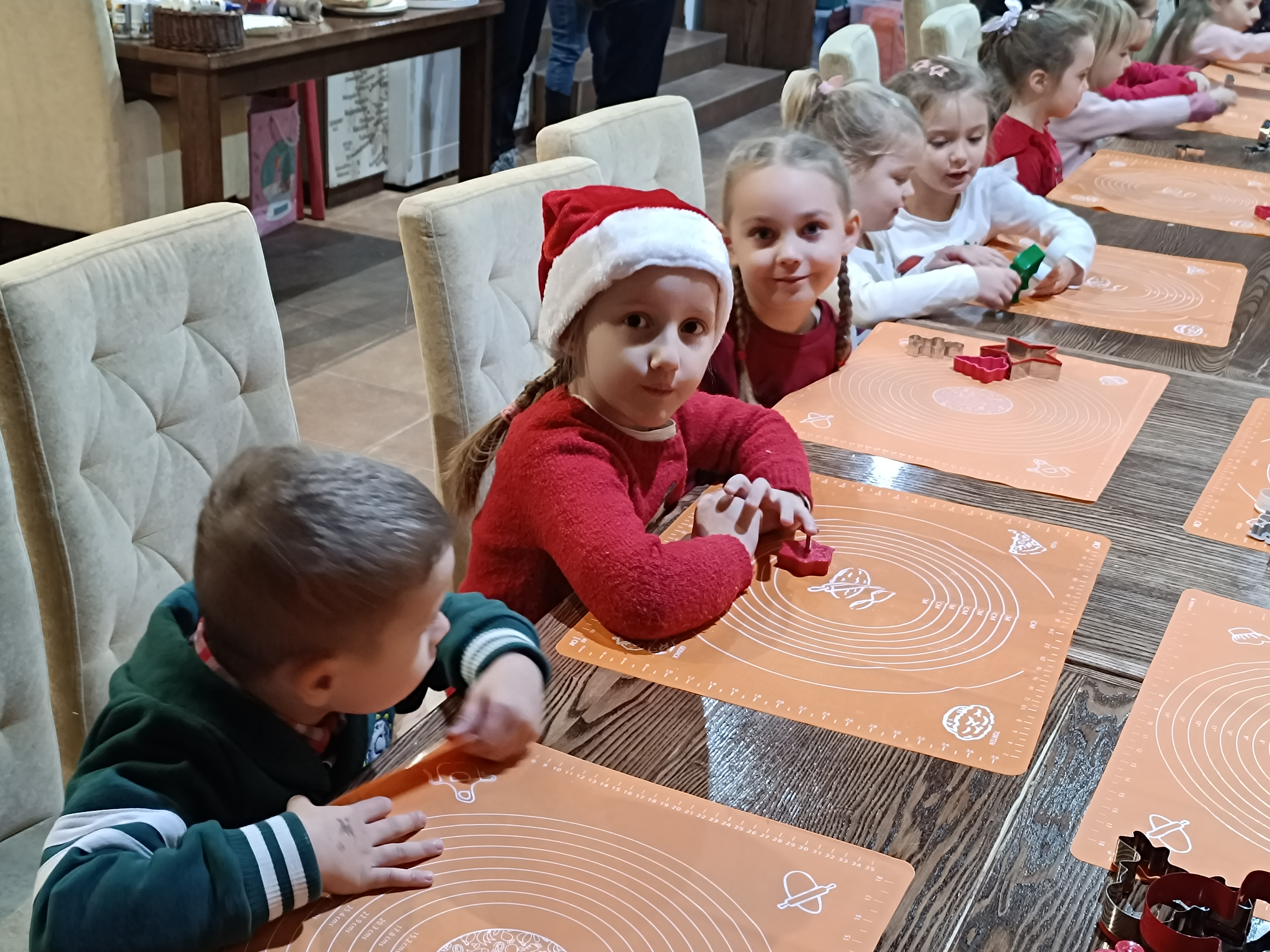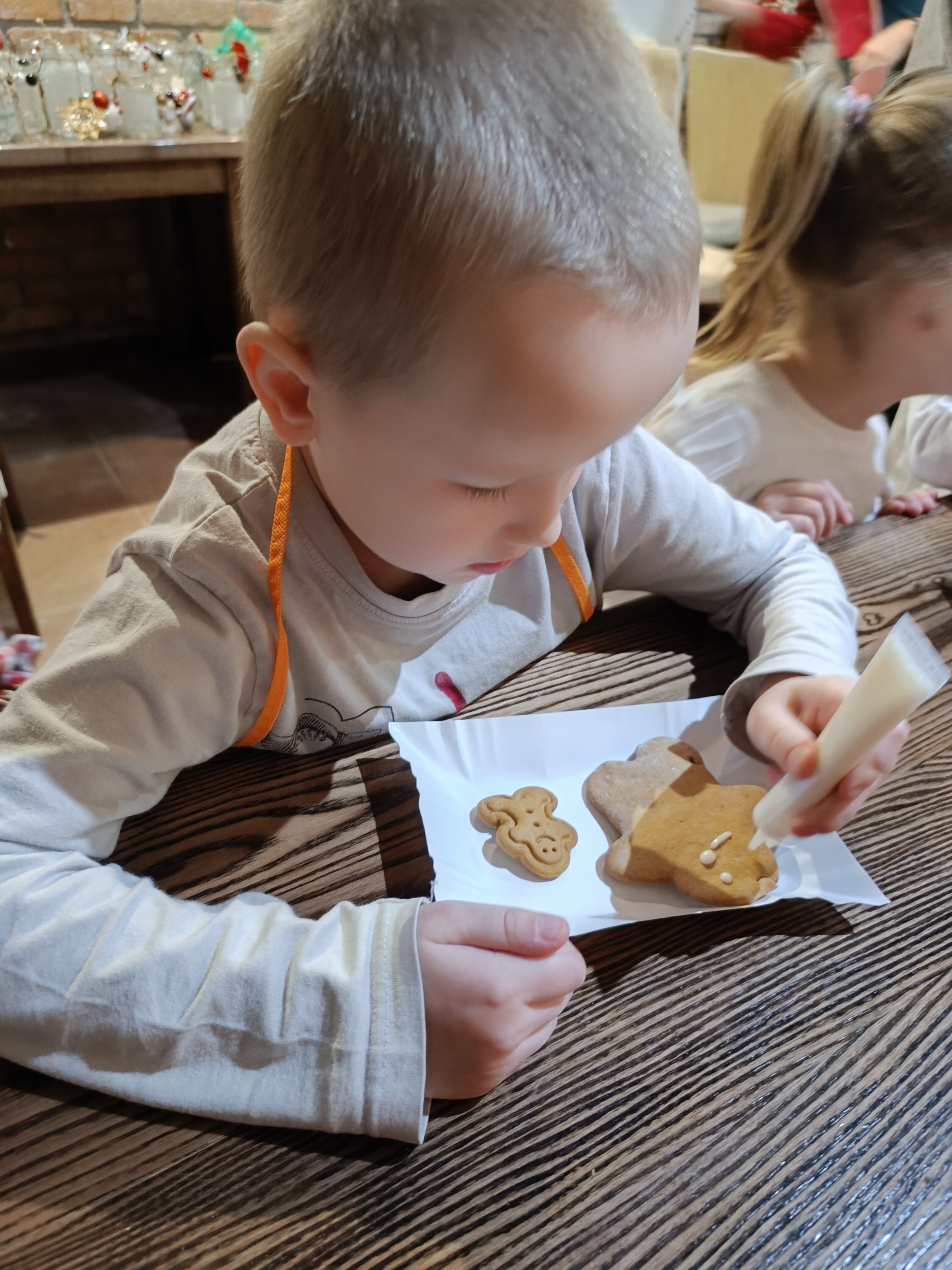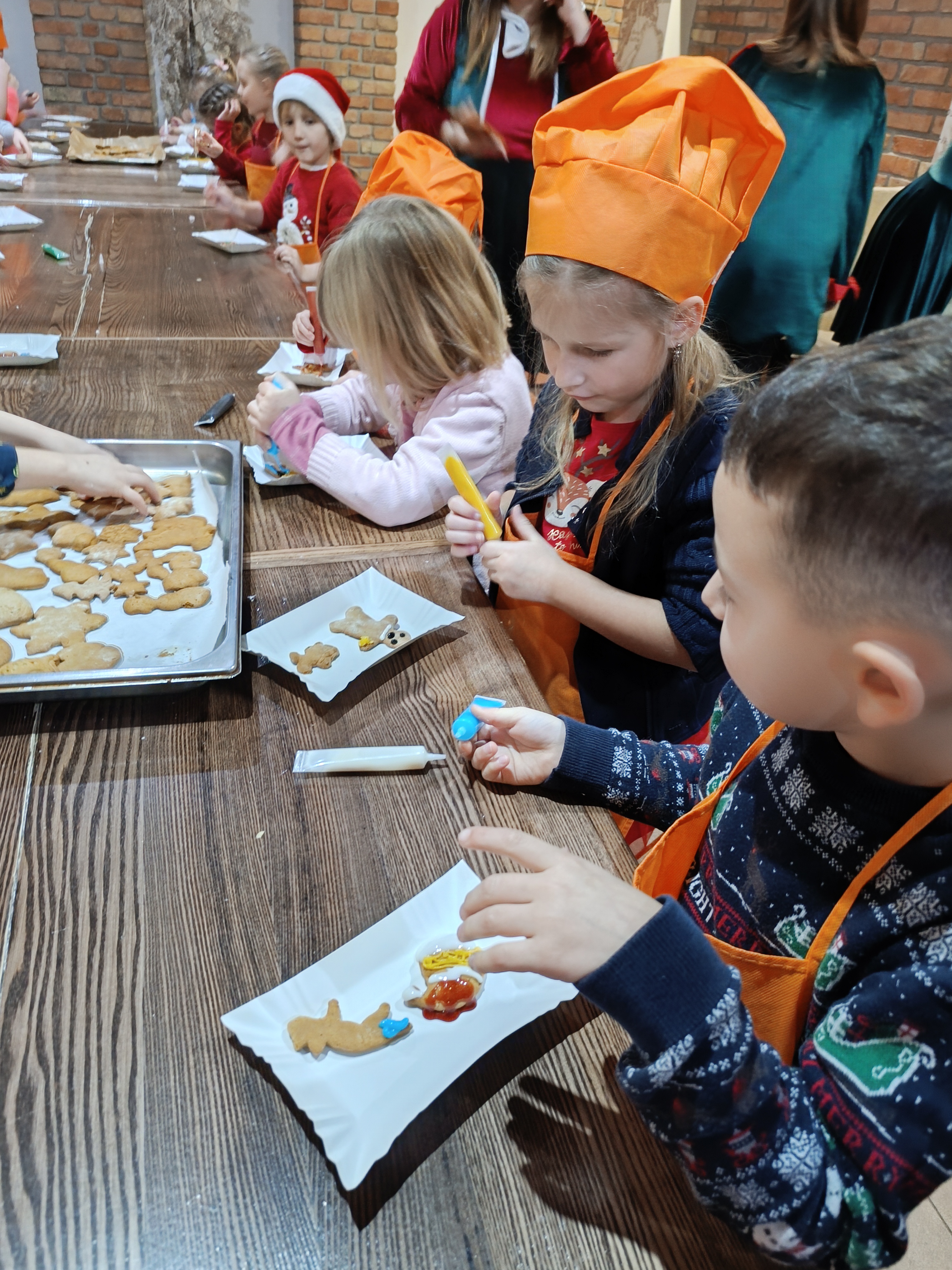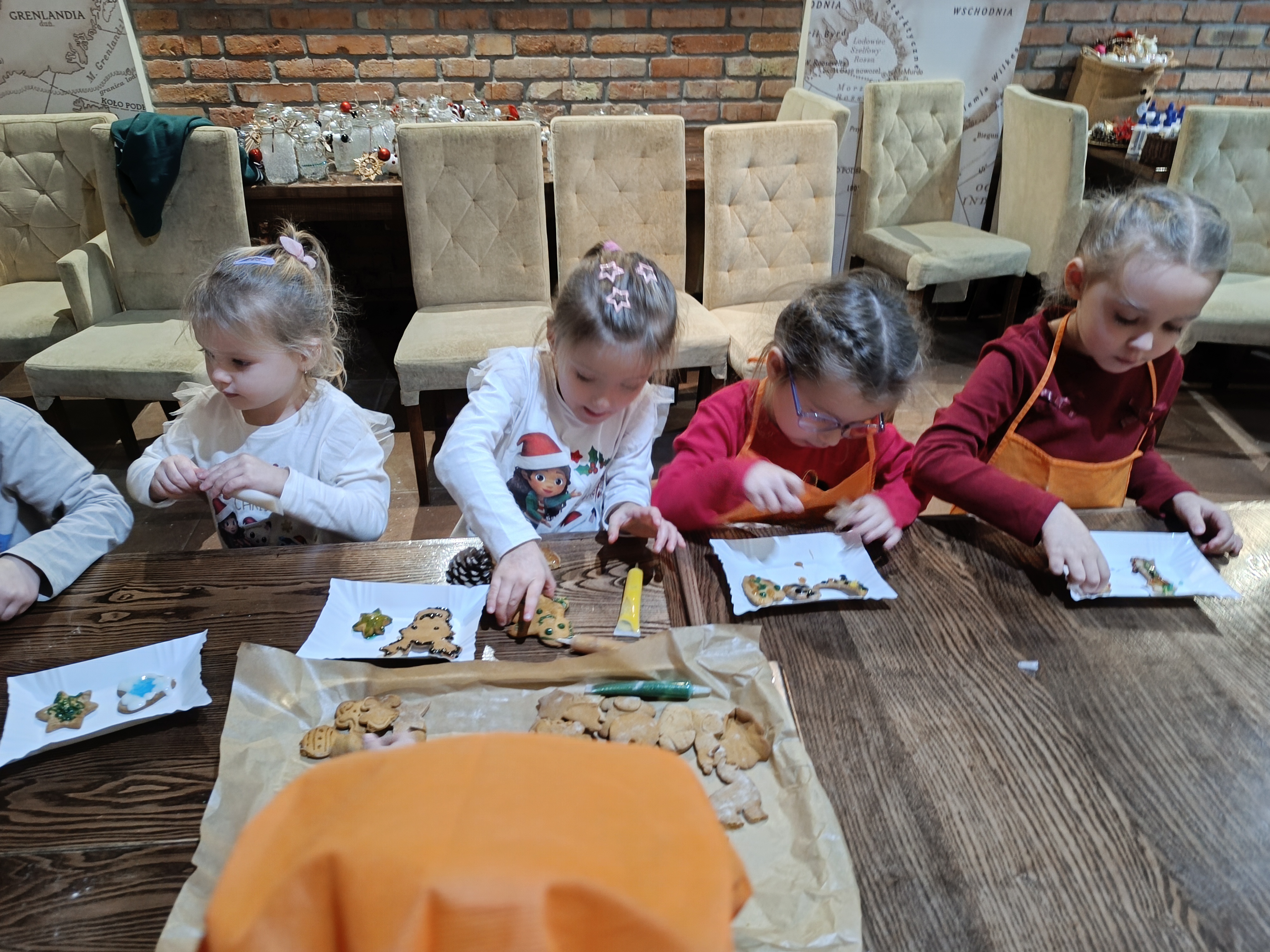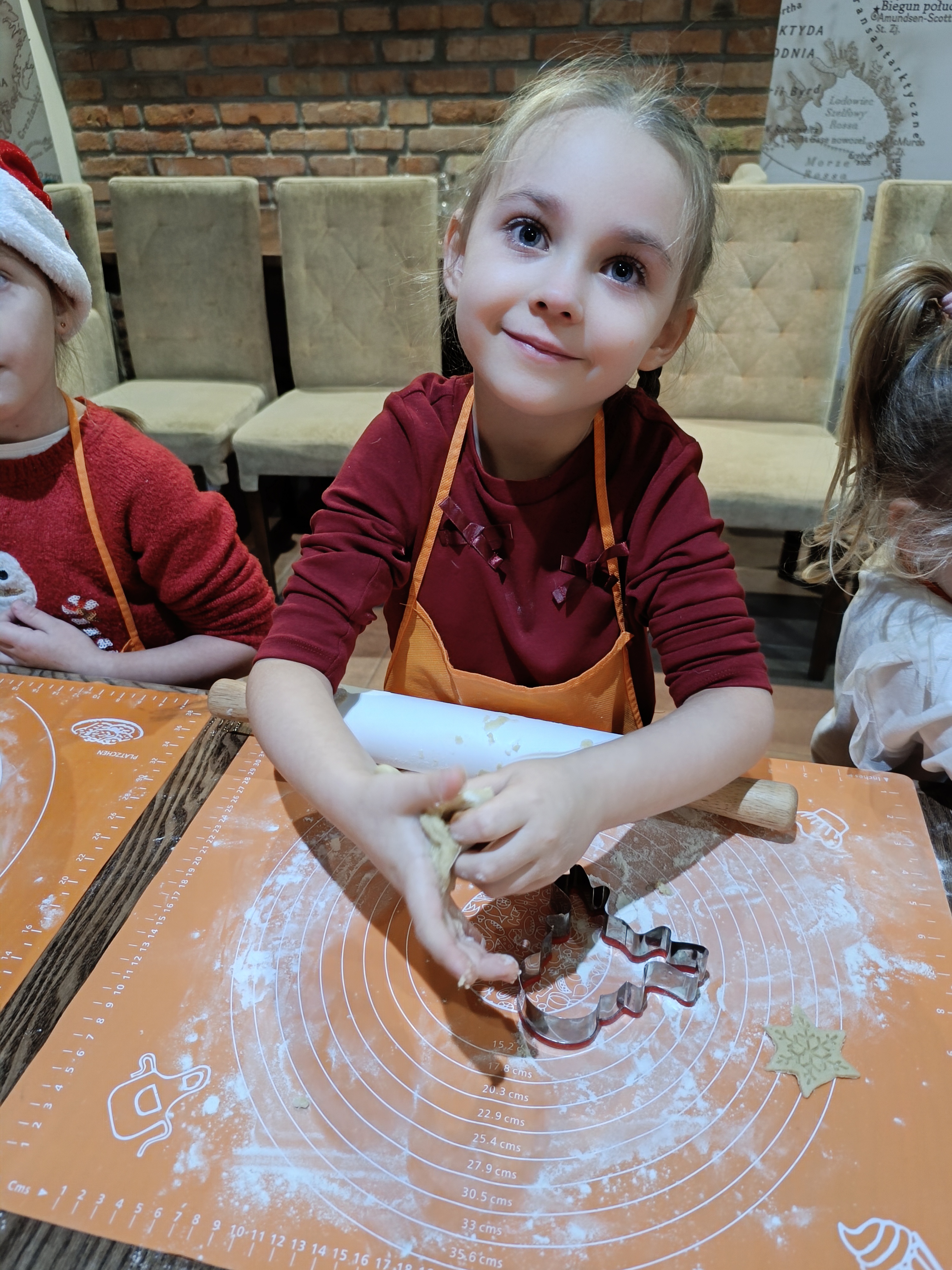Samodzielnie piekły pierniczki, dostały ciasto, wałkowały je, wykrajały różne kształty świąteczne, a następnie zostały upieczone i ozdobione przez dzieci według własnych pomysłów.