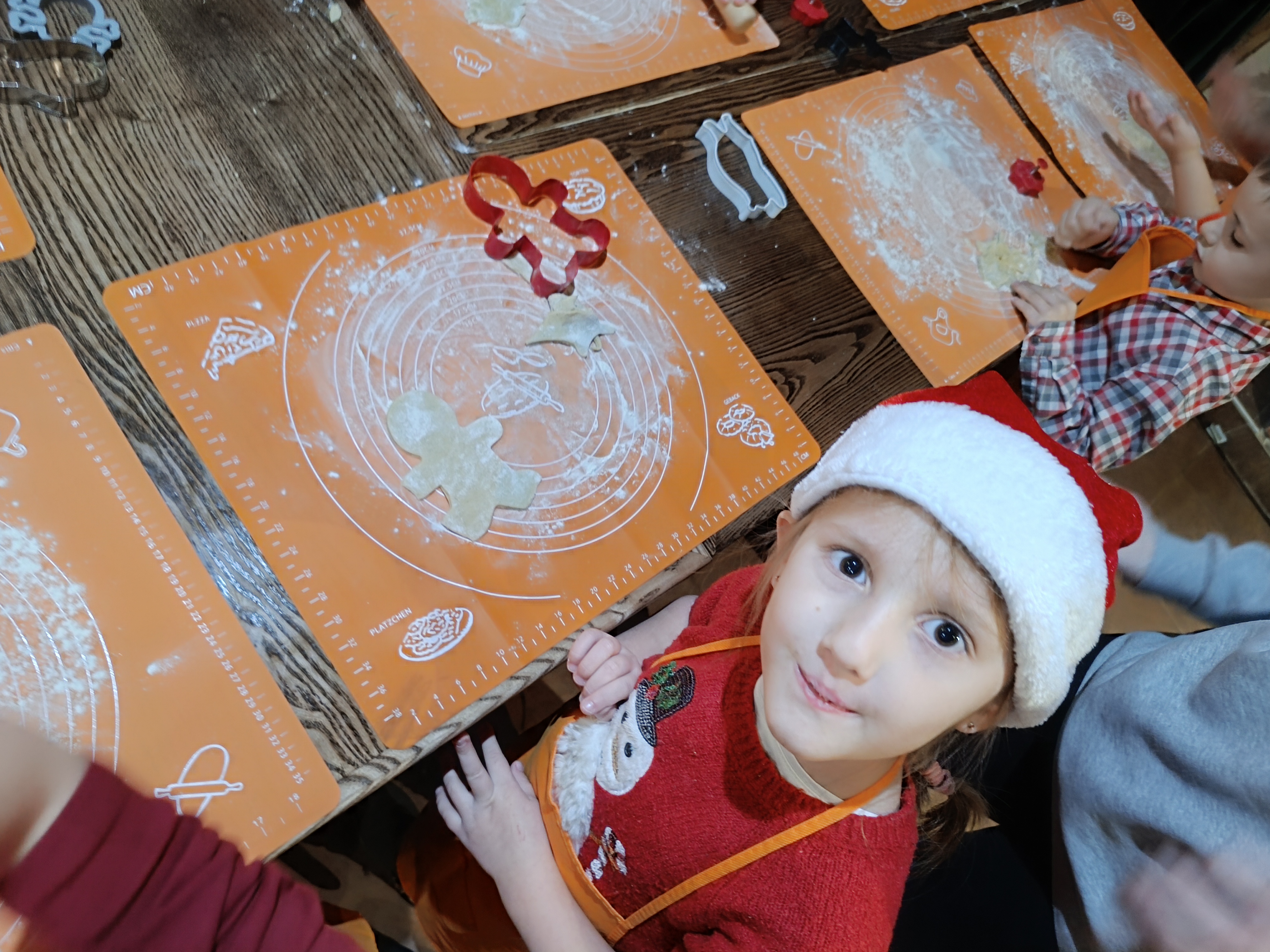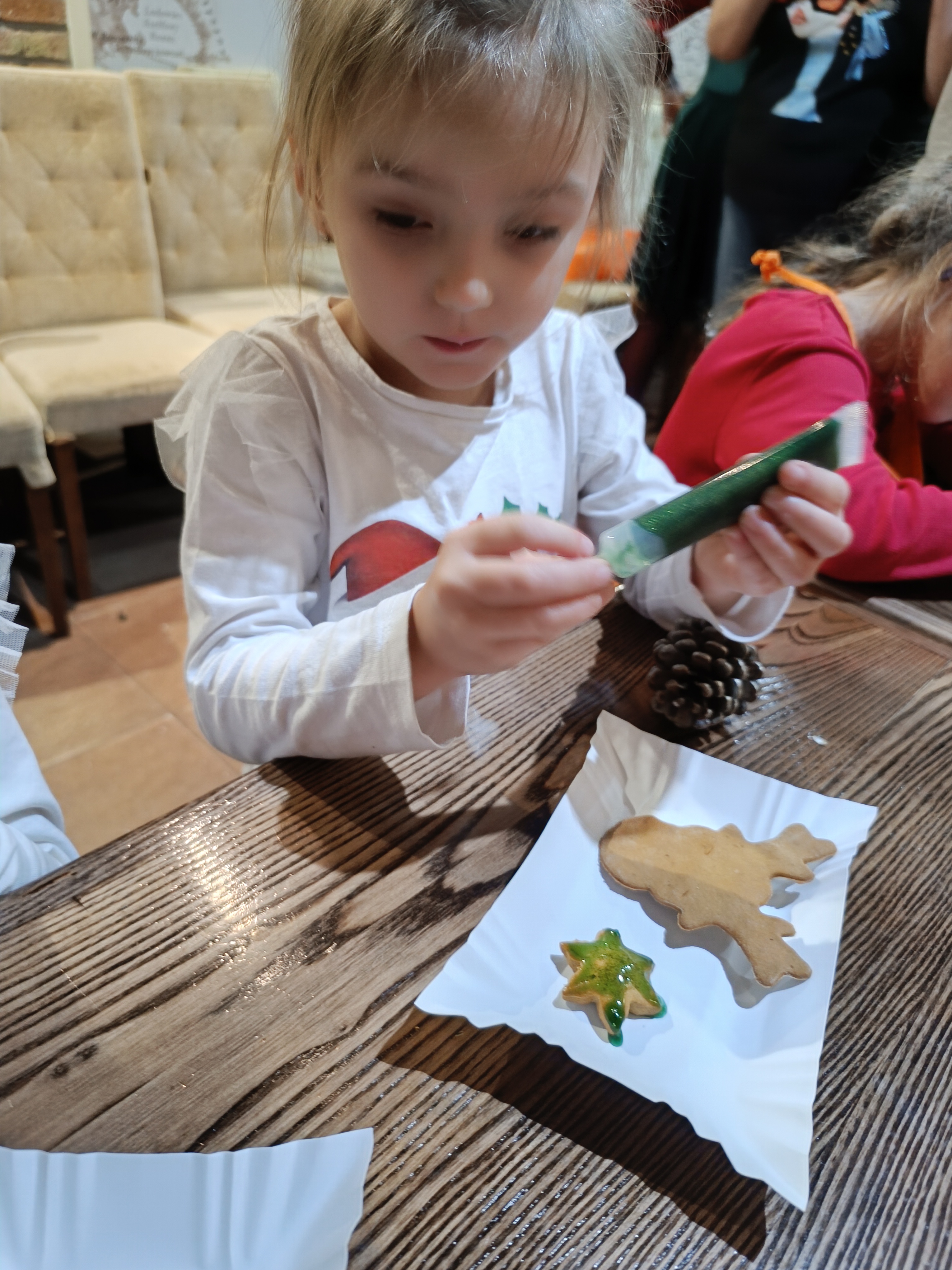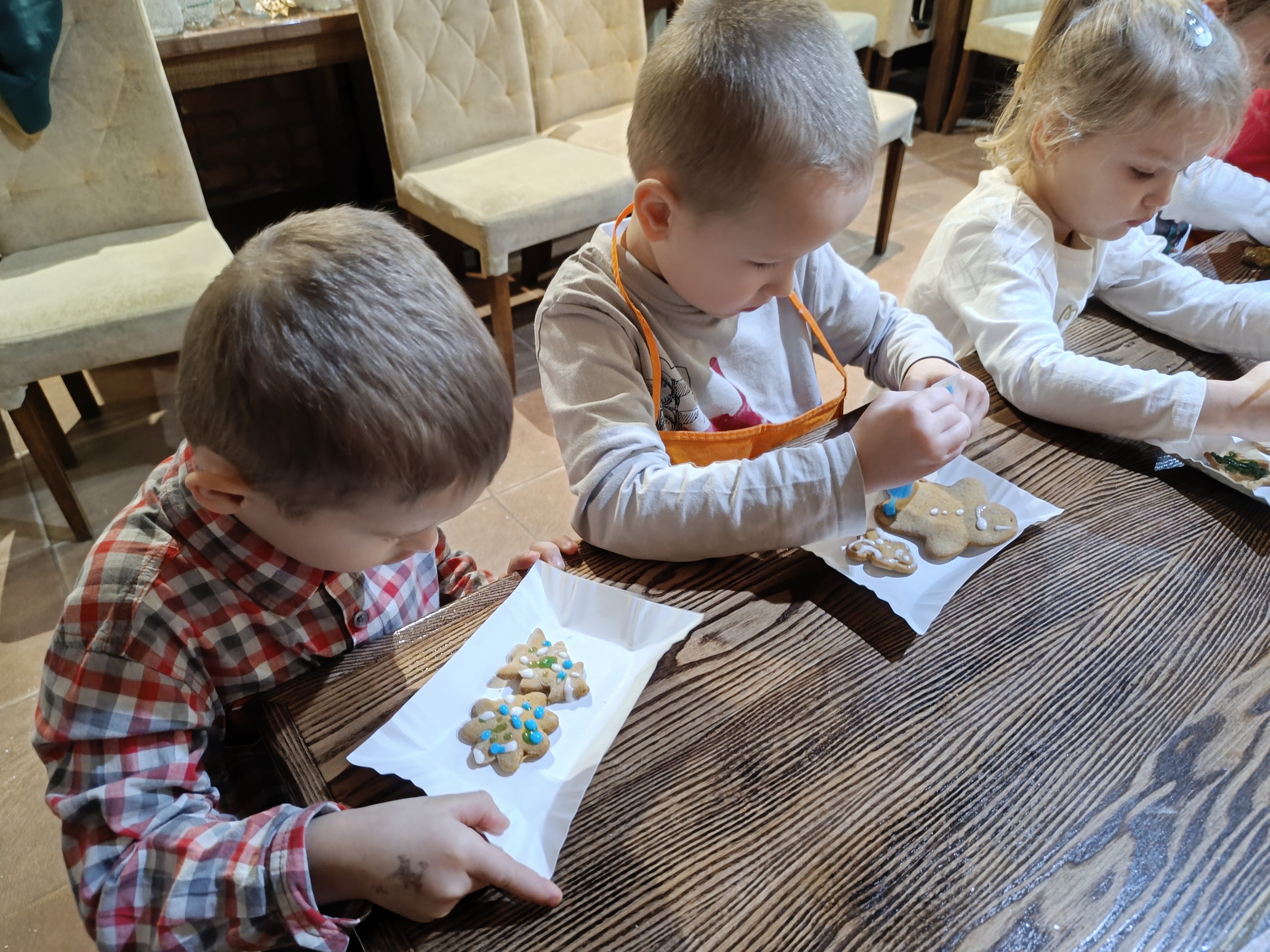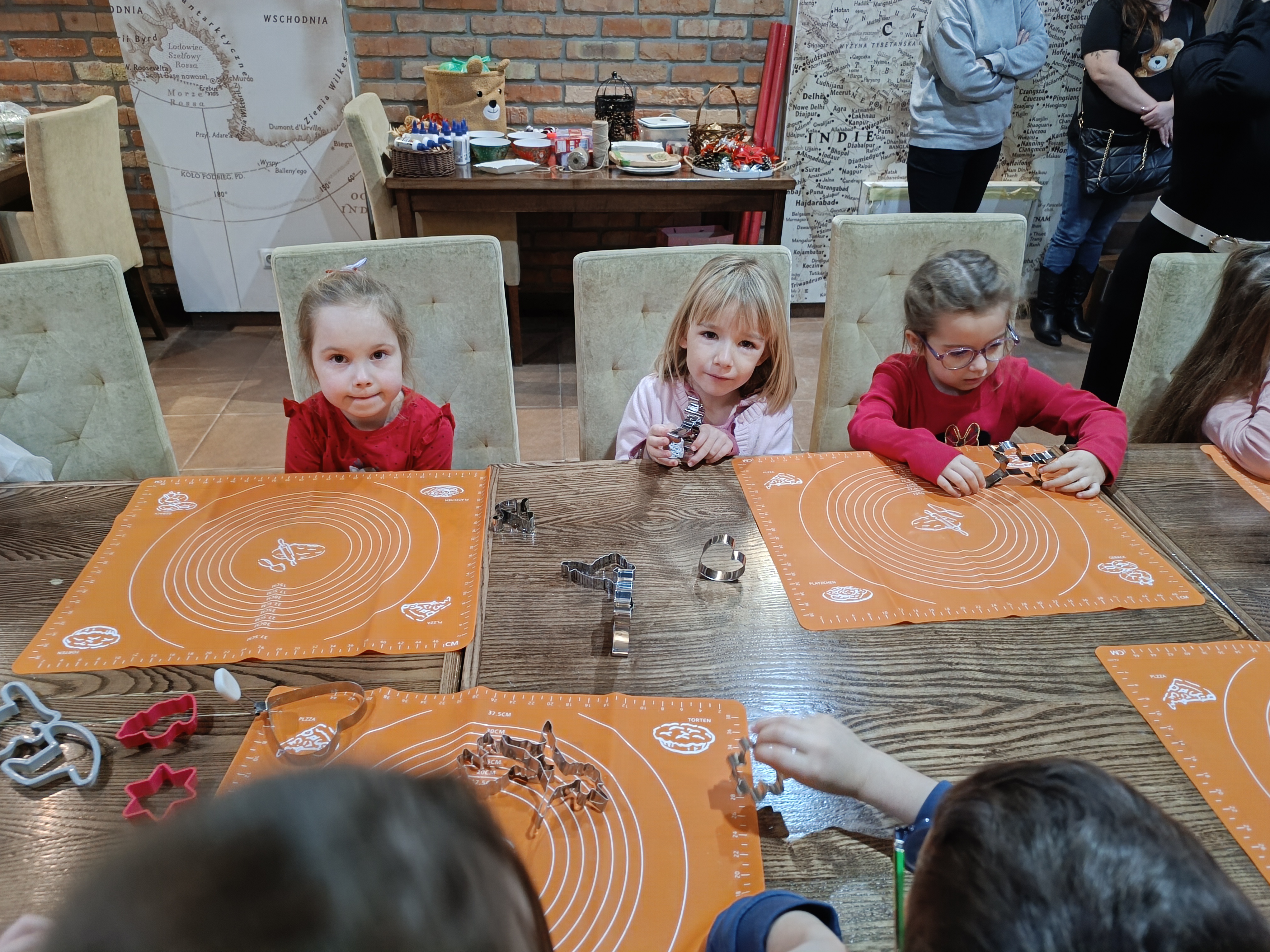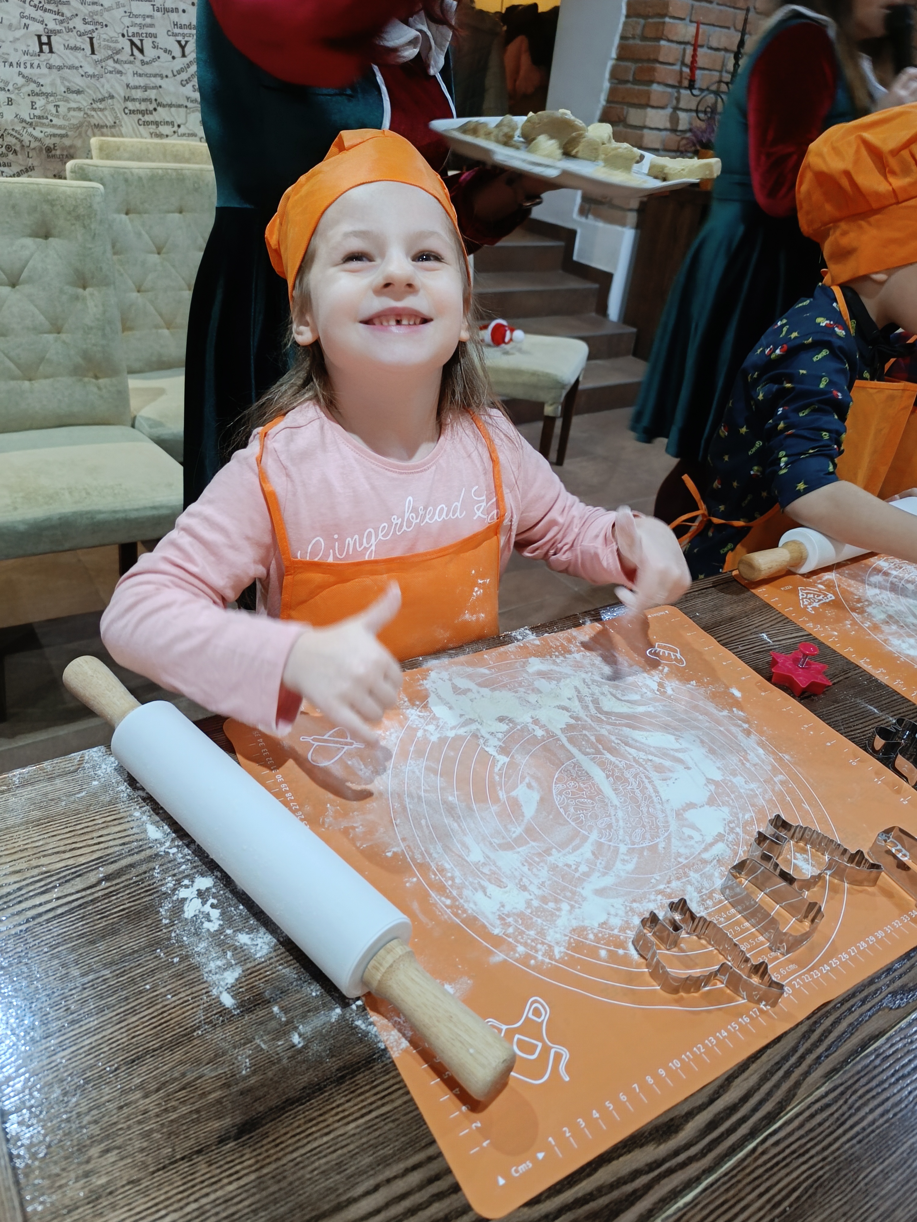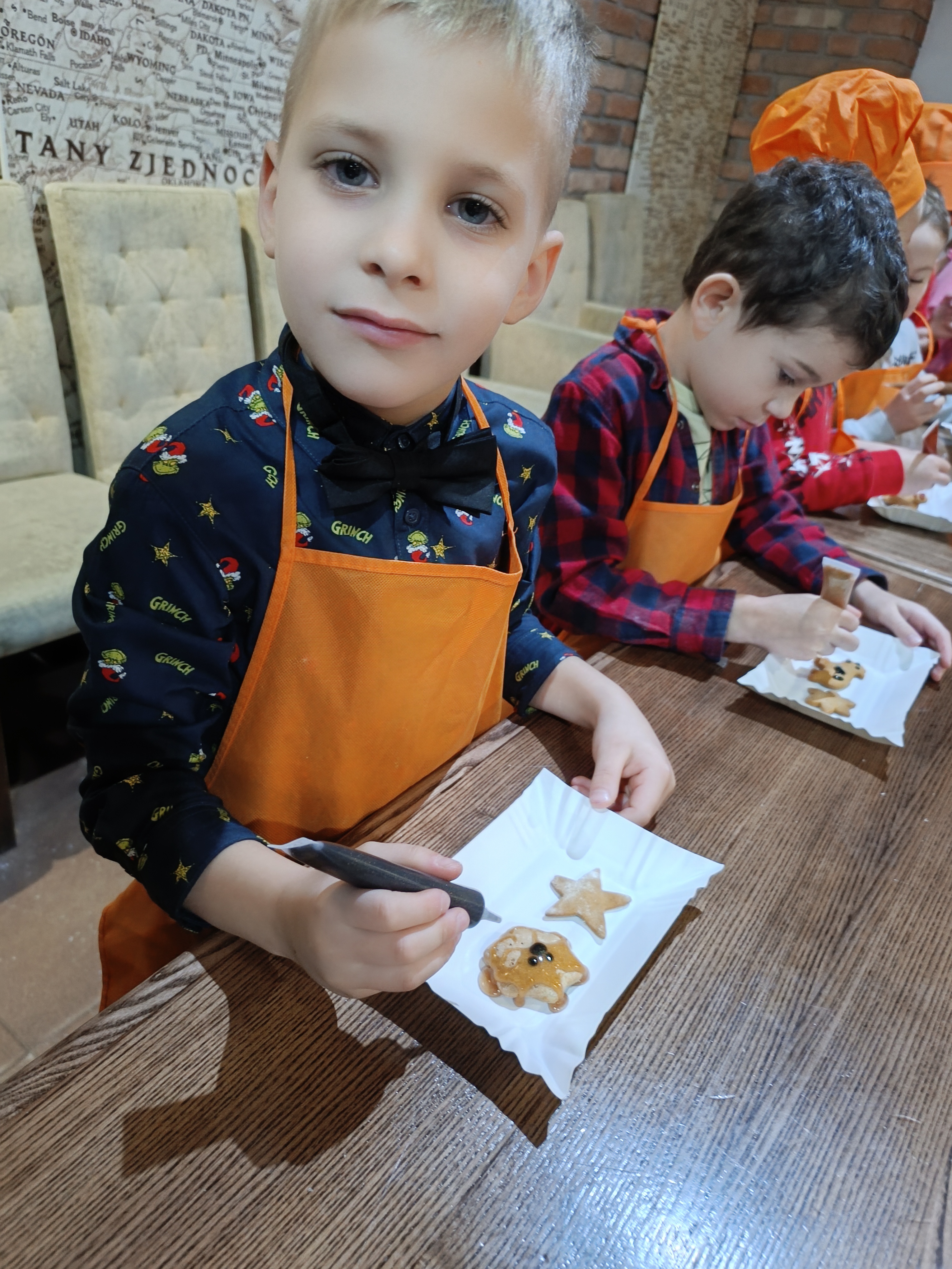 Samodzielnie piekły pierniczki, dostały ciasto, wałkowały je, wykrajały różne kształty świąteczne, a następnie zostały upieczone i ozdobione przez dzieci według własnych pomysłów.