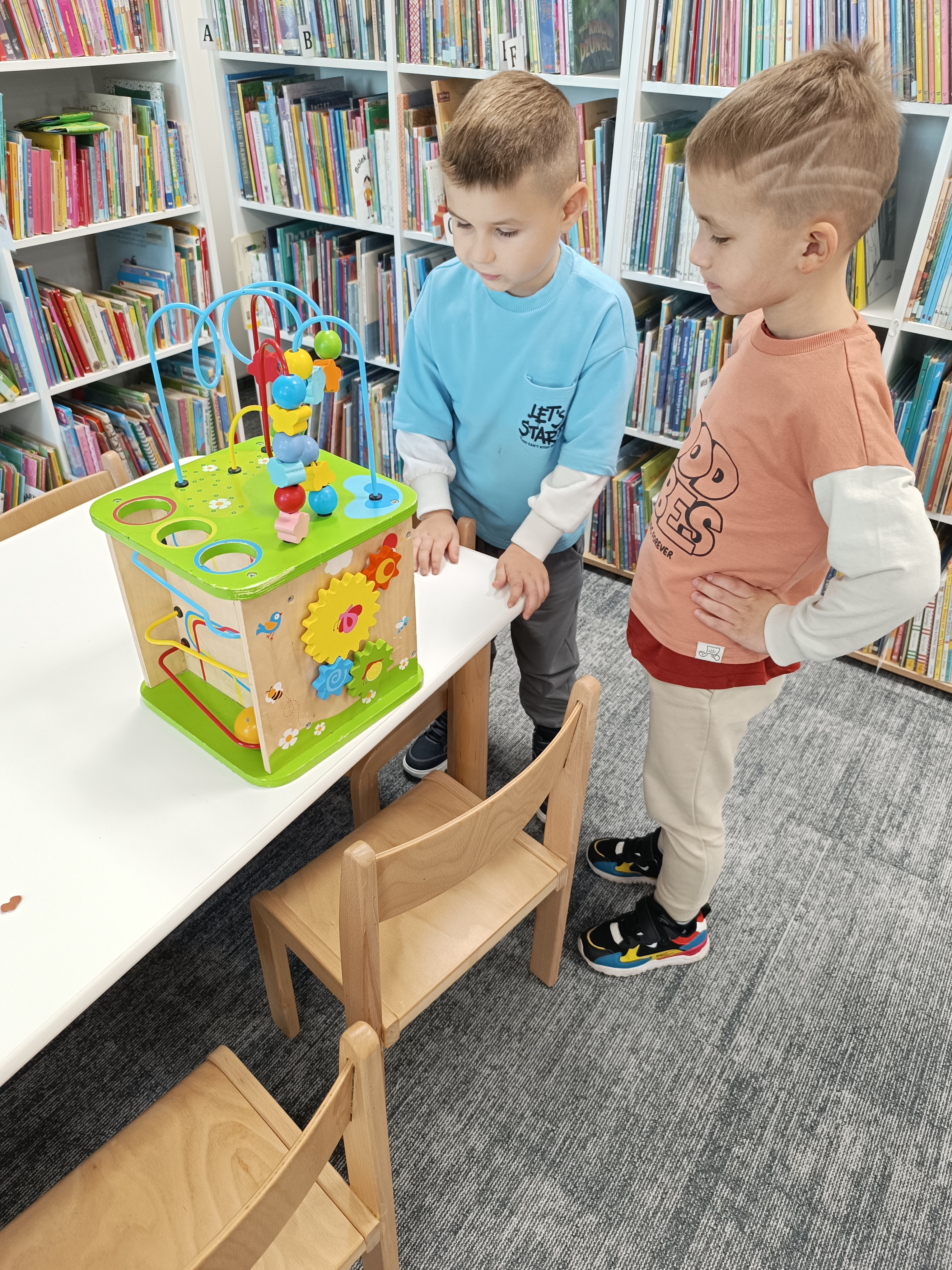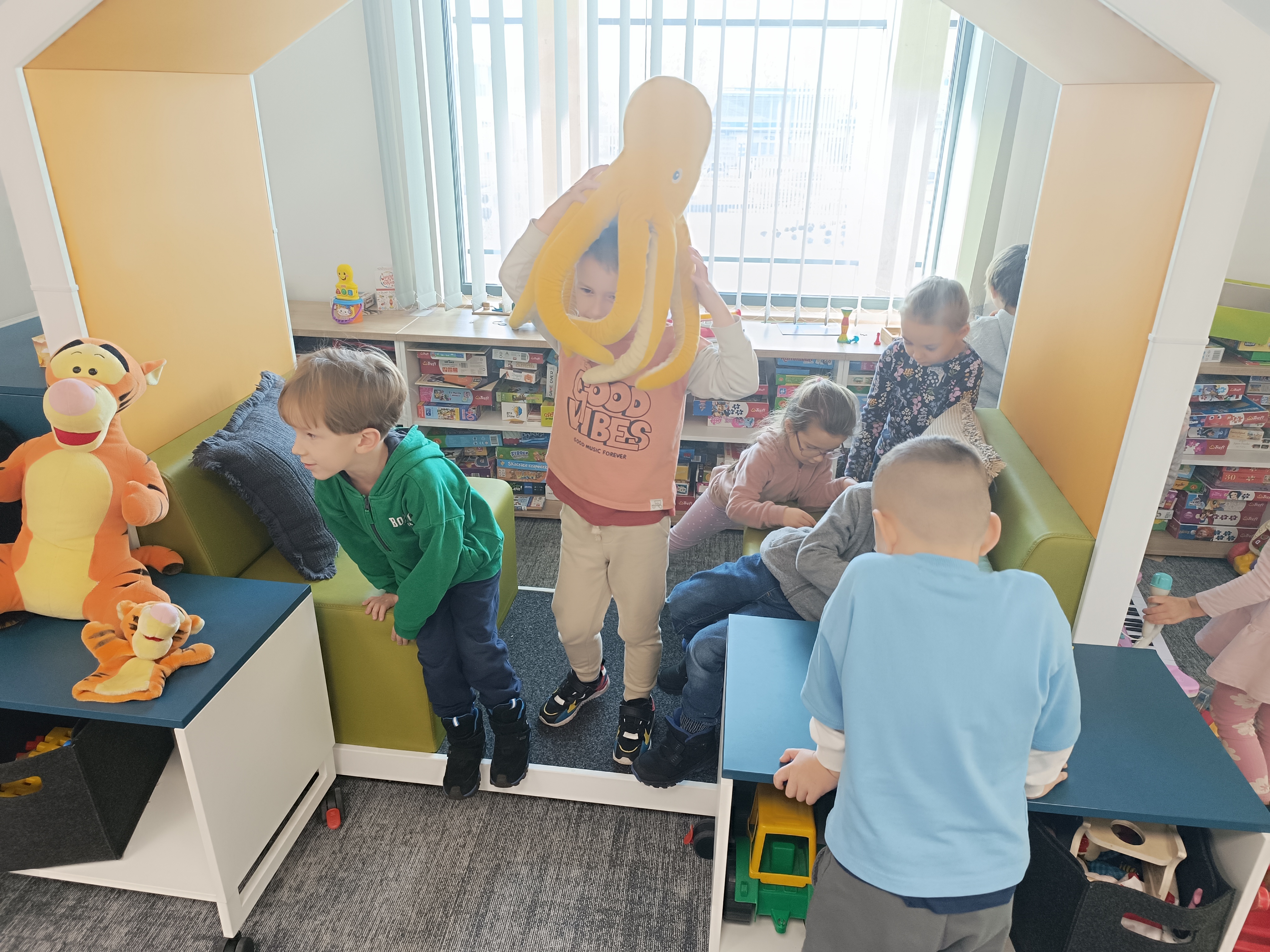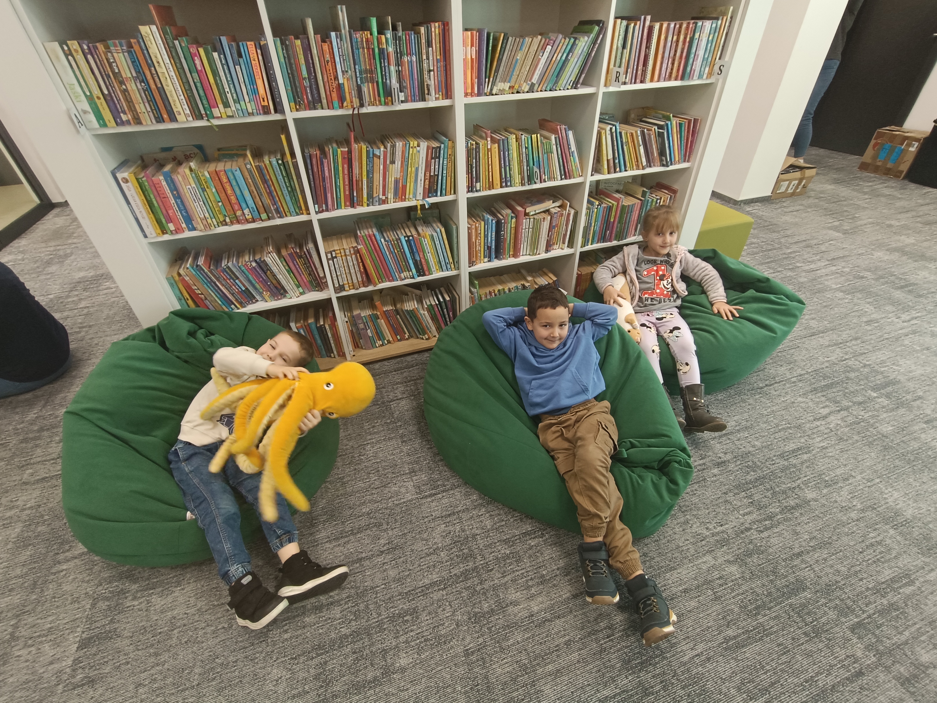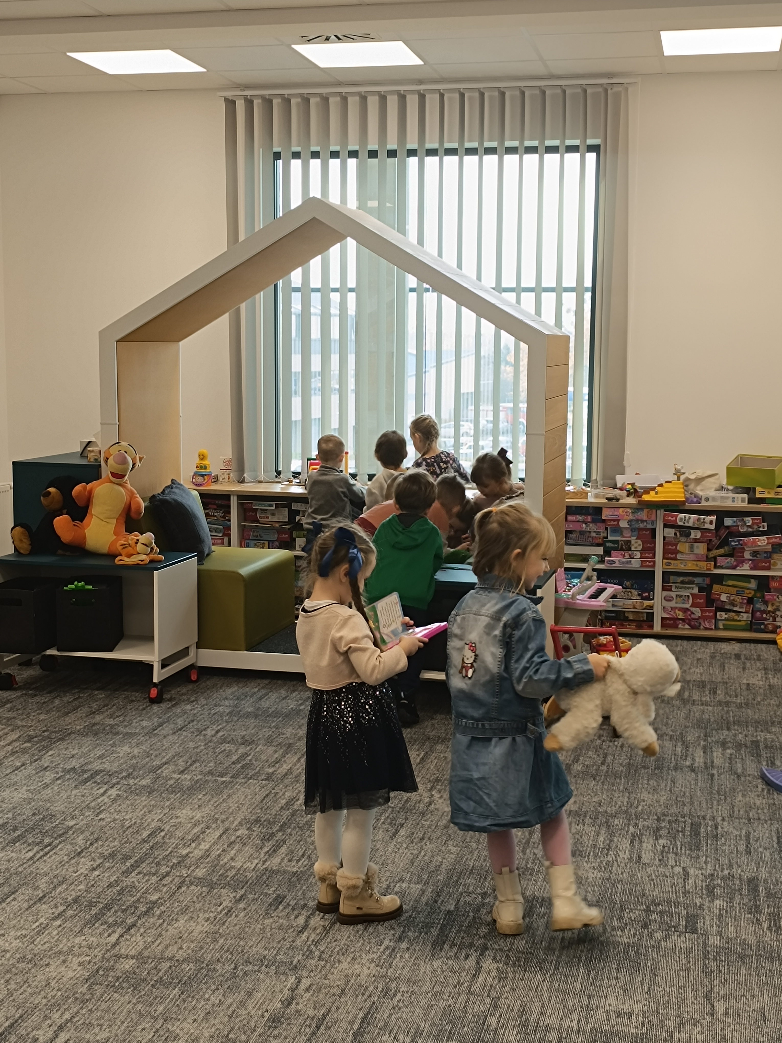 Smerfy później zwiedziły w bibliotece dział dziecięcy,w którym oglądały książki, bawiły się w wyznaczonej strefie zabawy.