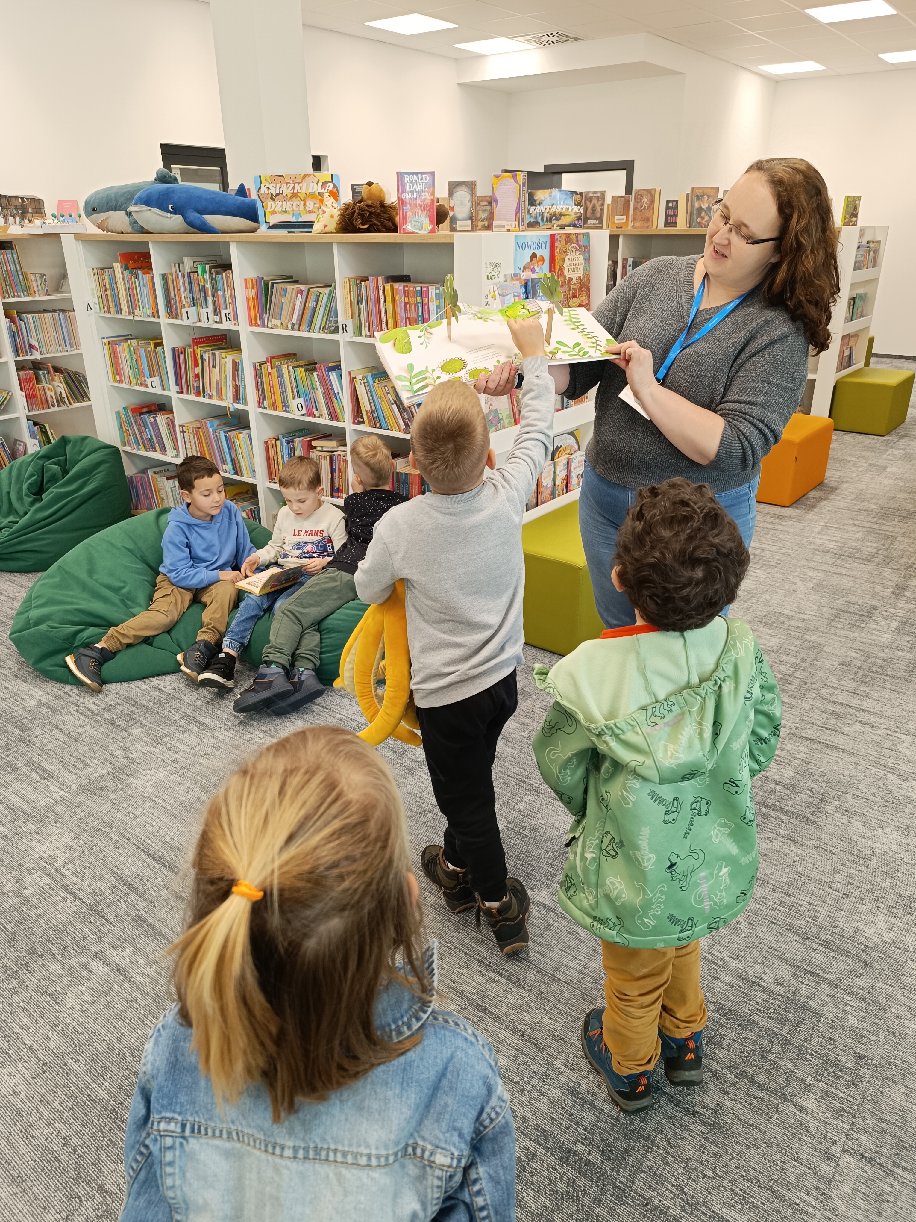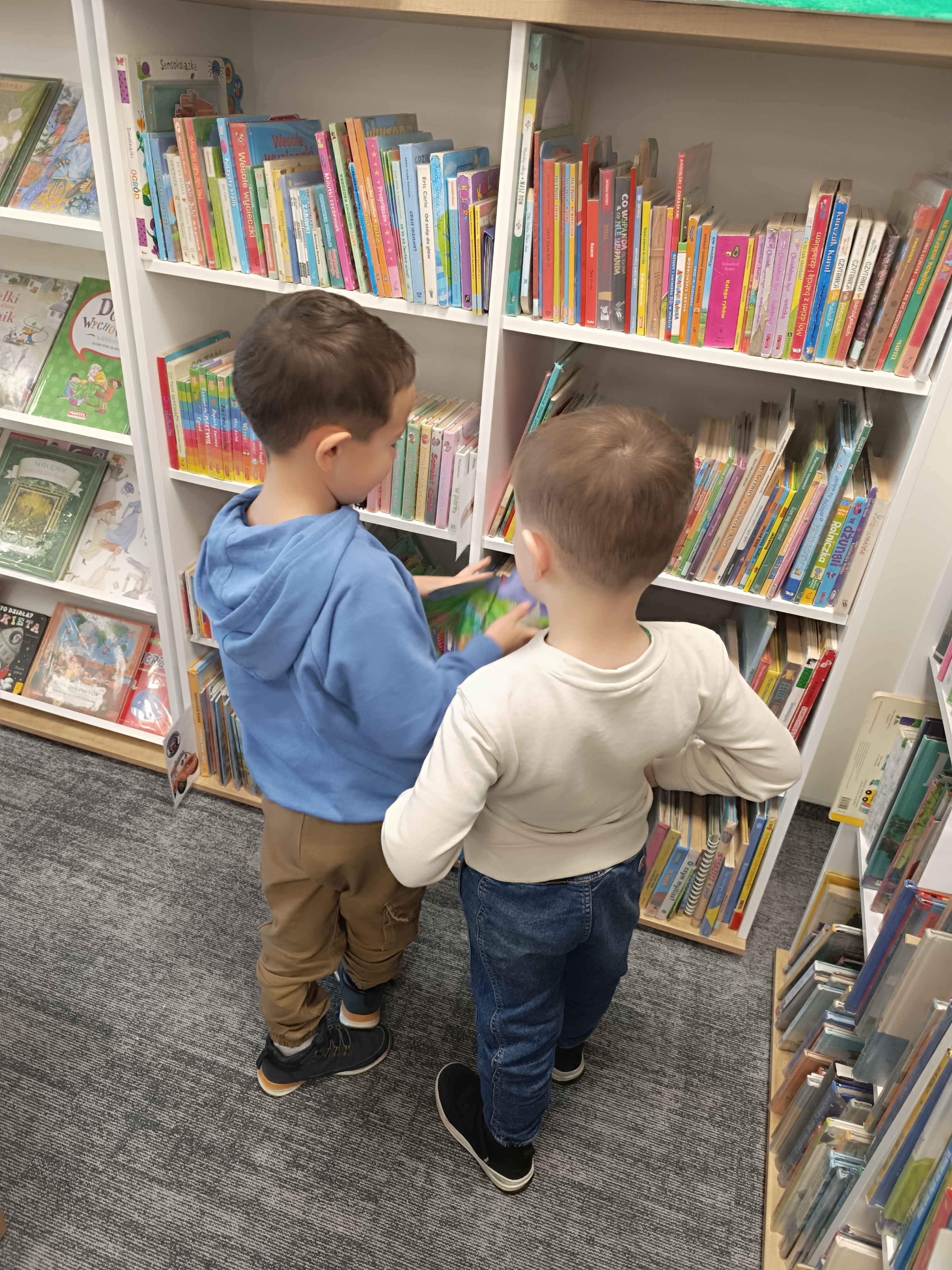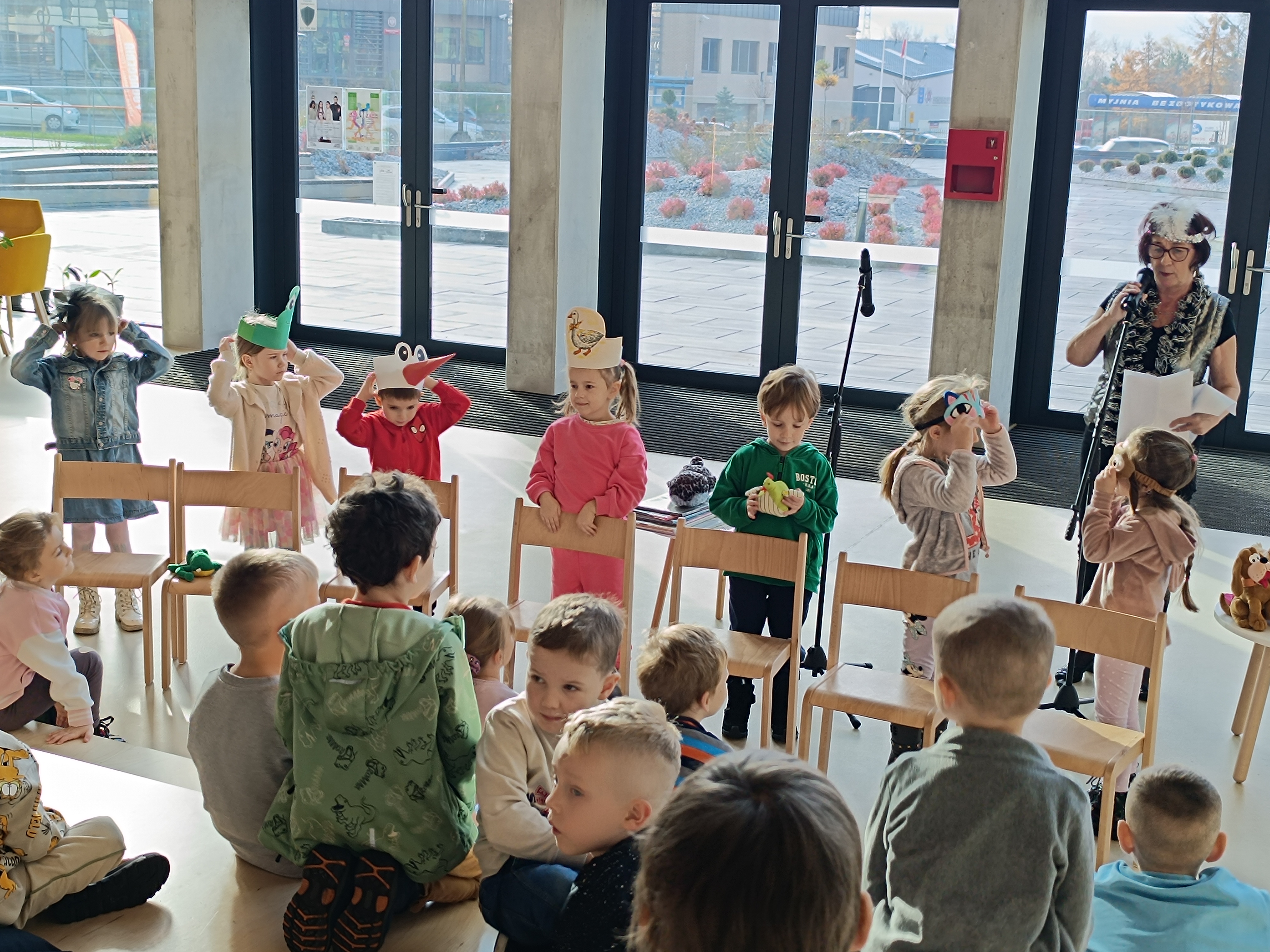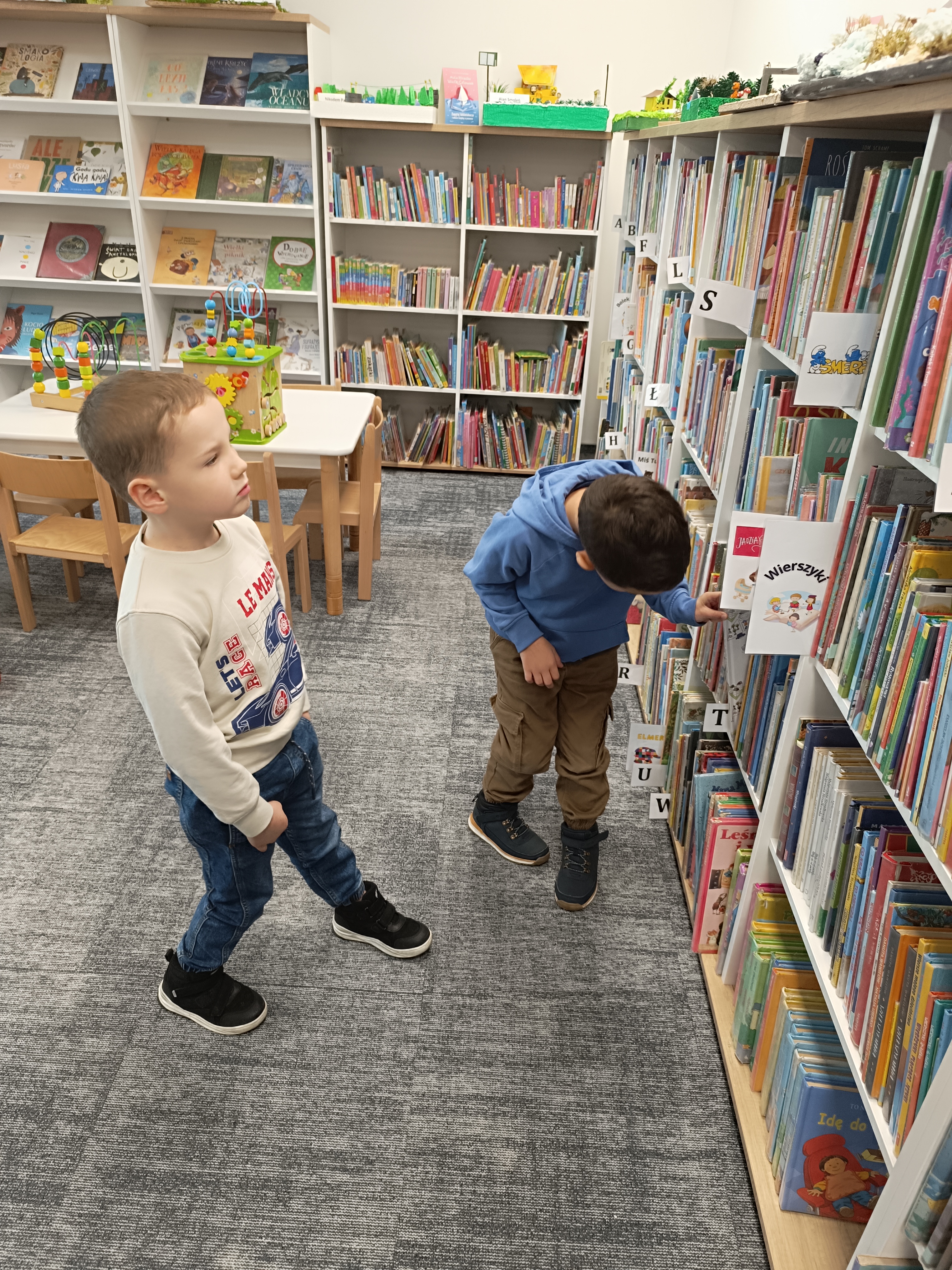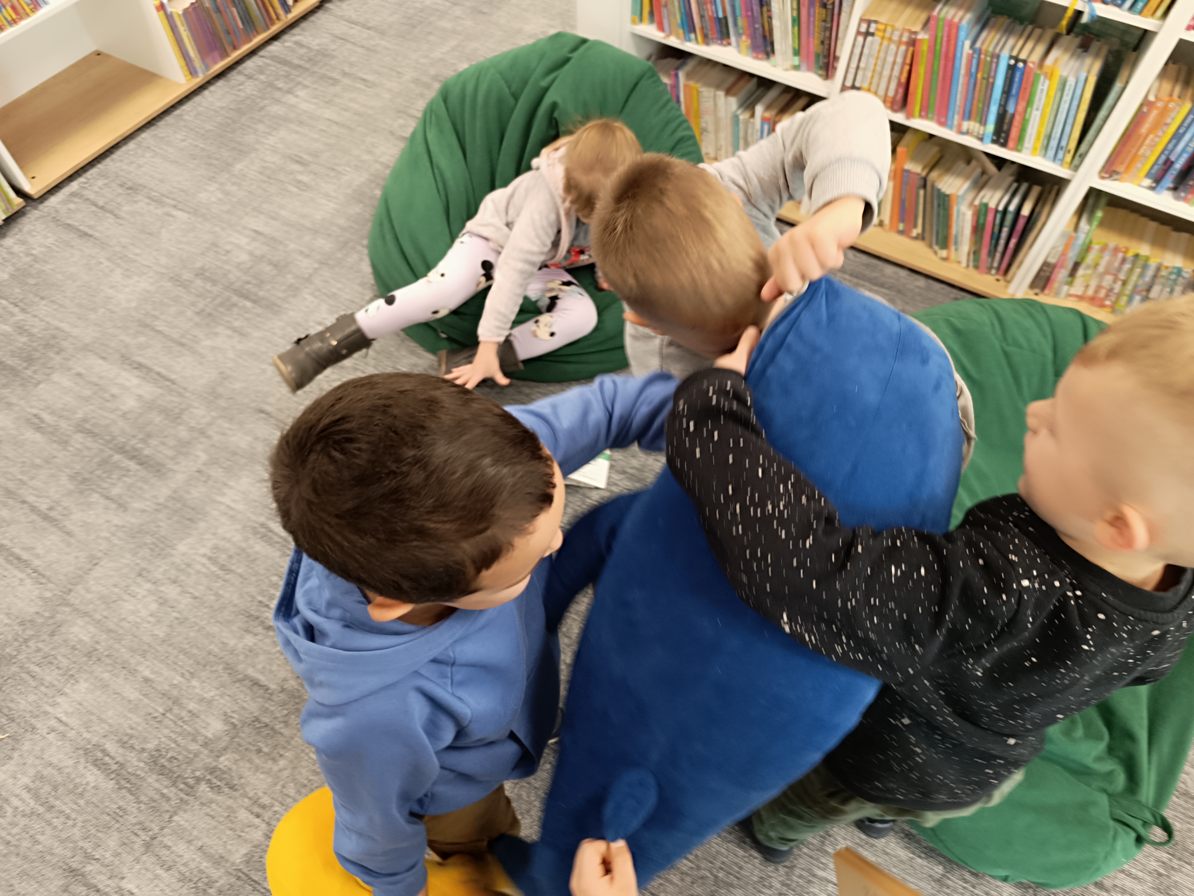 Smerfy później zwiedziły w bibliotece dział dziecięcy,w którym oglądały książki, bawiły się w wyznaczonej strefie zabawy.