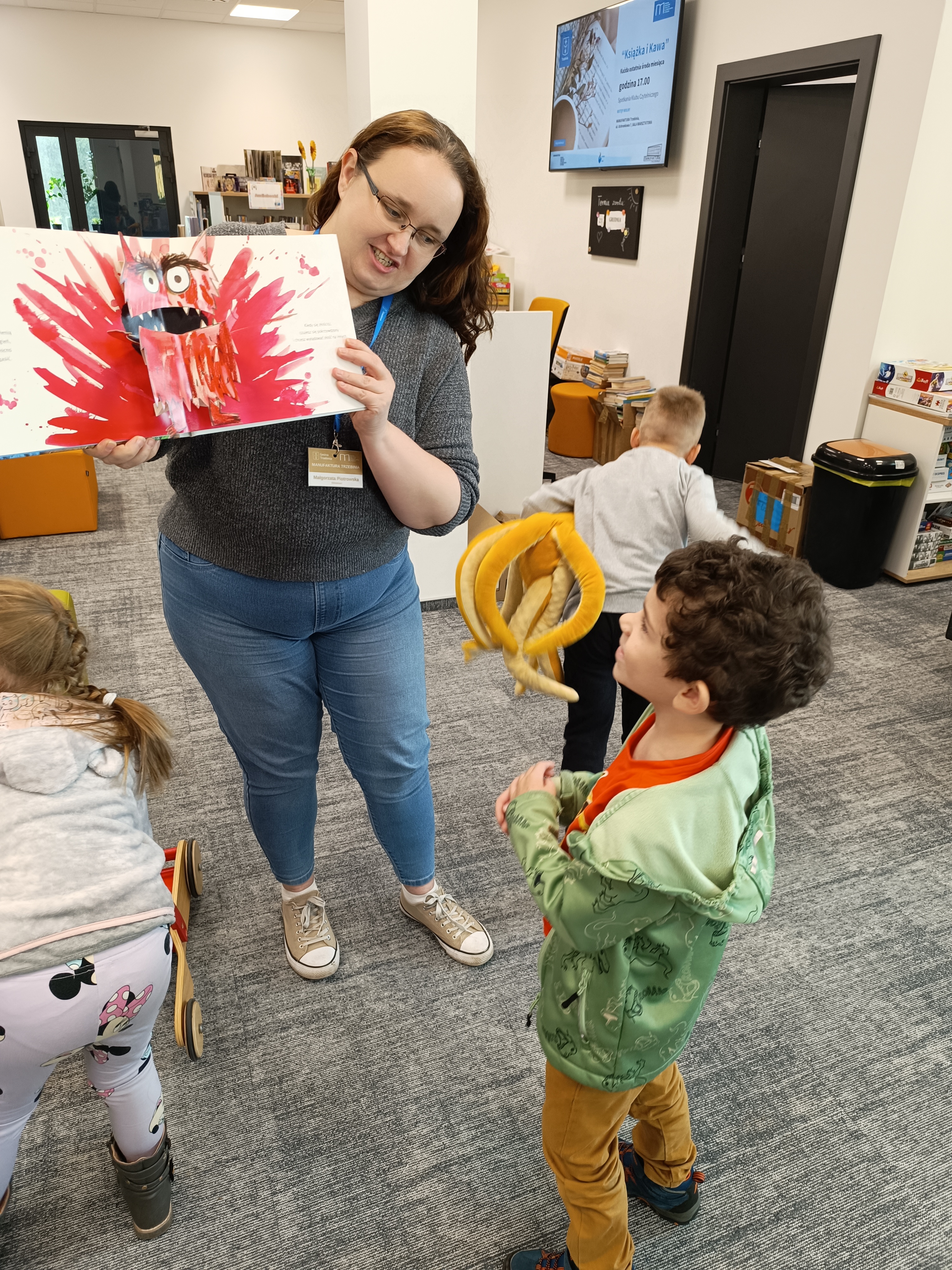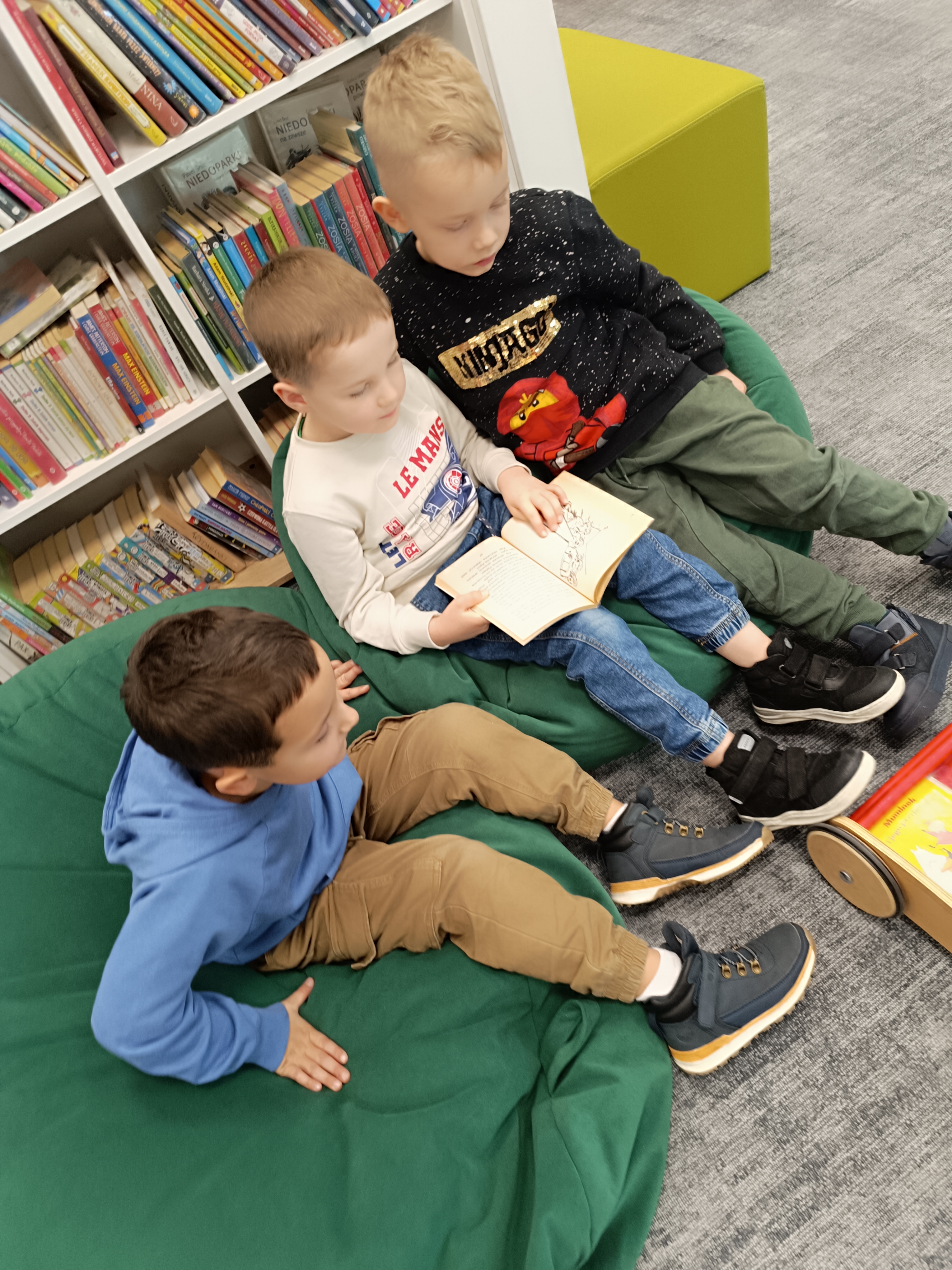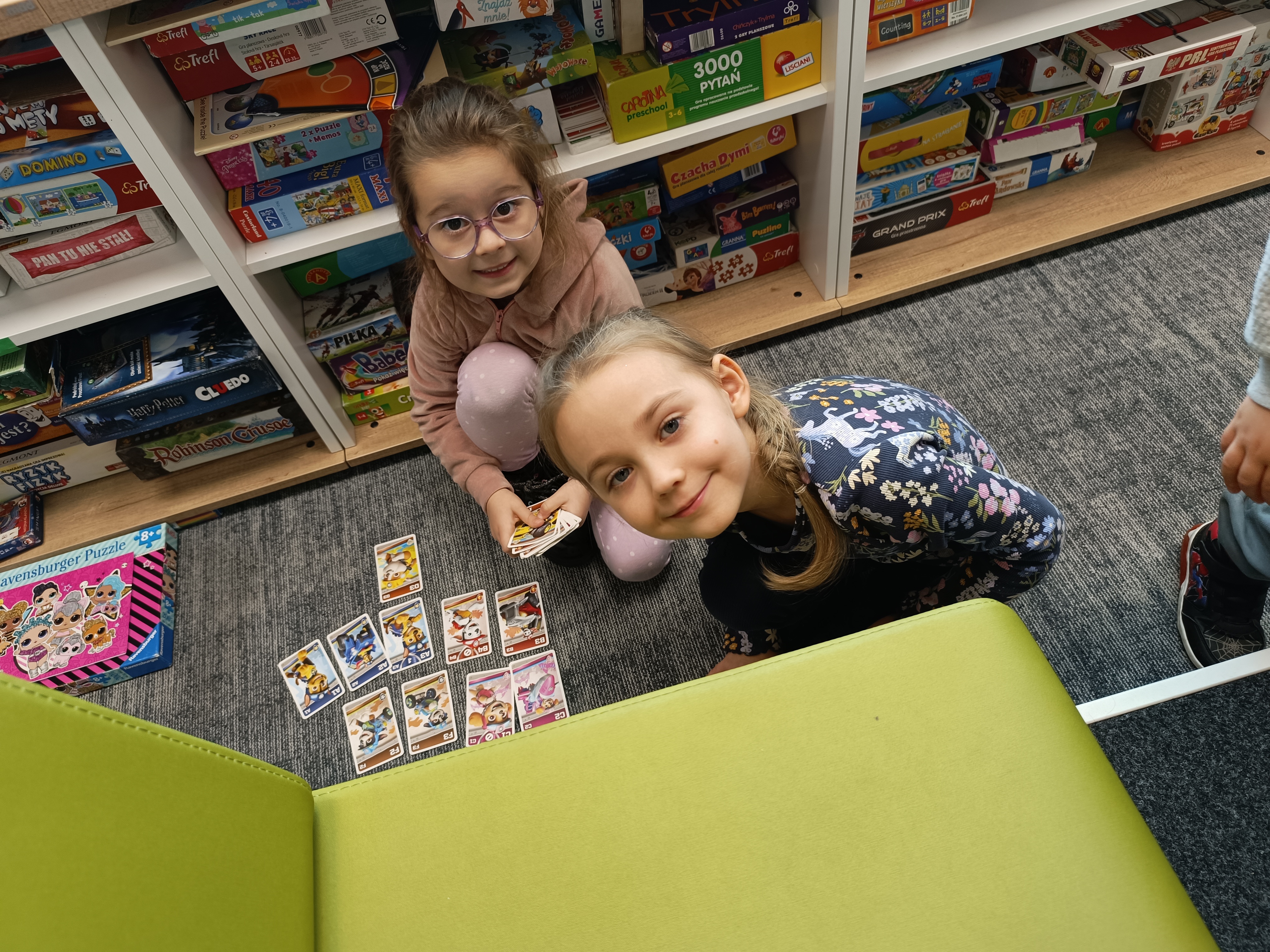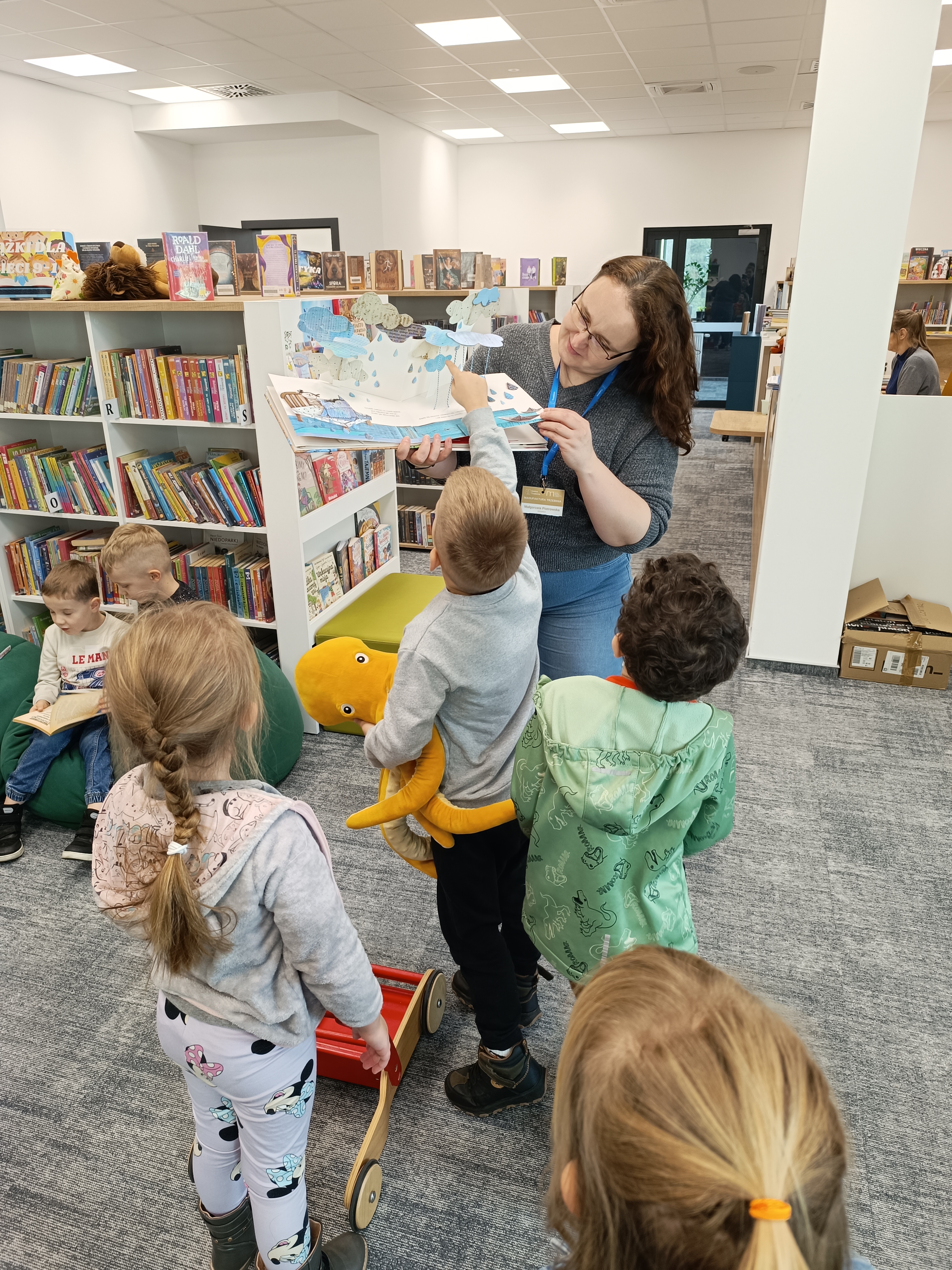 Smerfy później zwiedziły w bibliotece dział dziecięcy,w którym oglądały książki, bawiły się w wyznaczonej strefie zabawy.