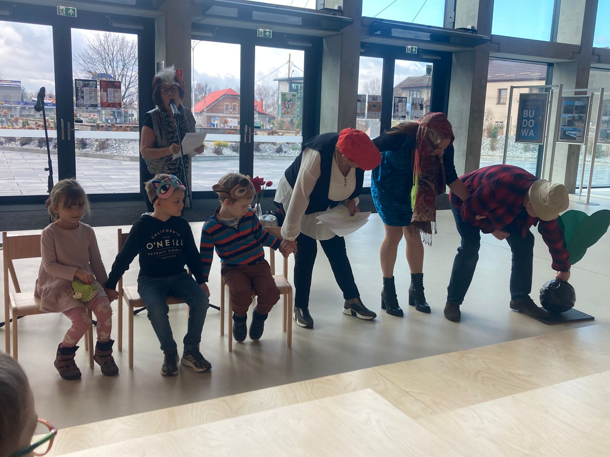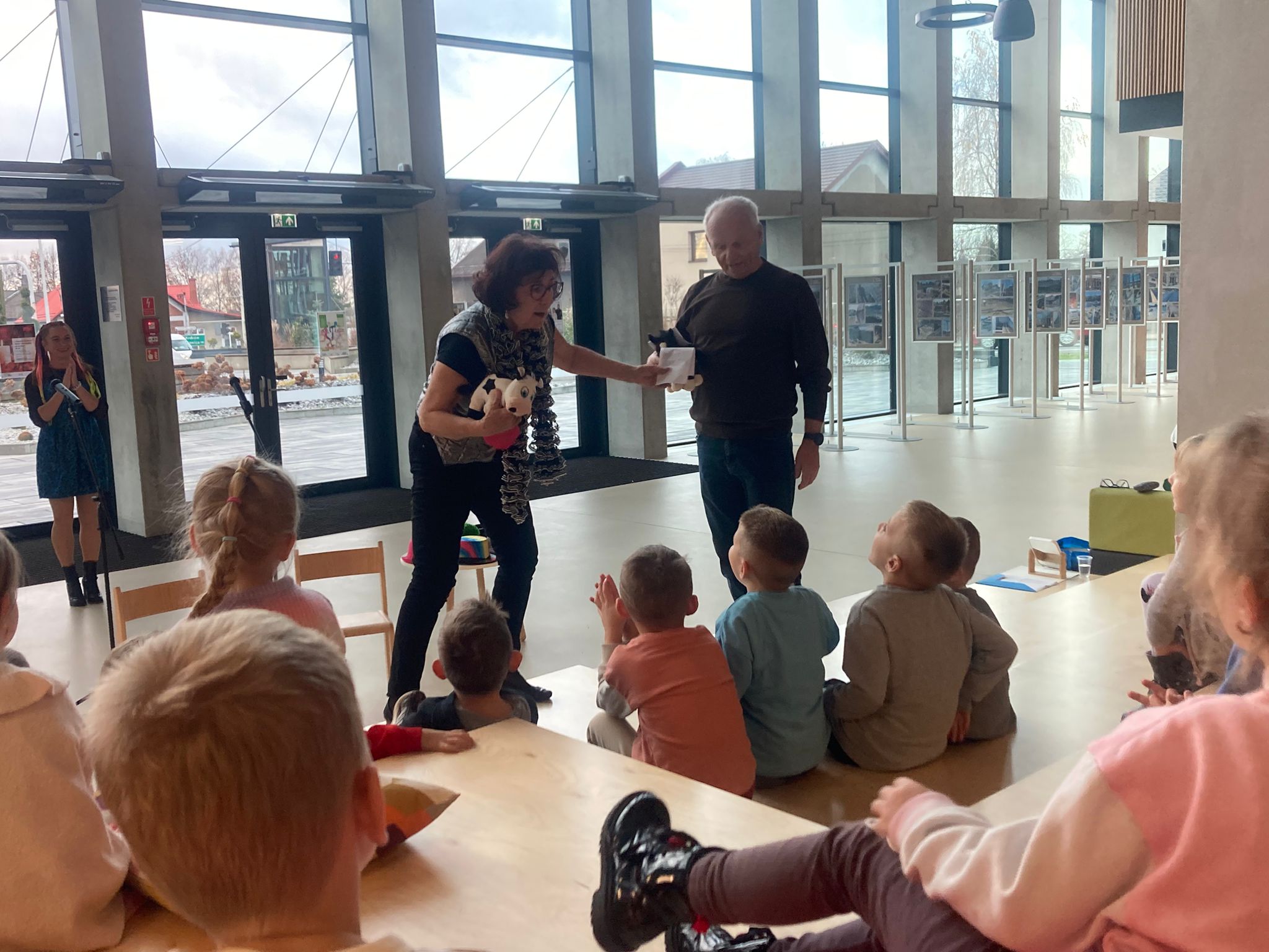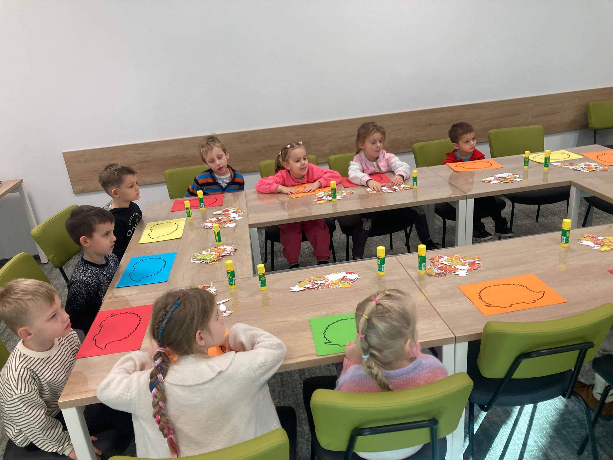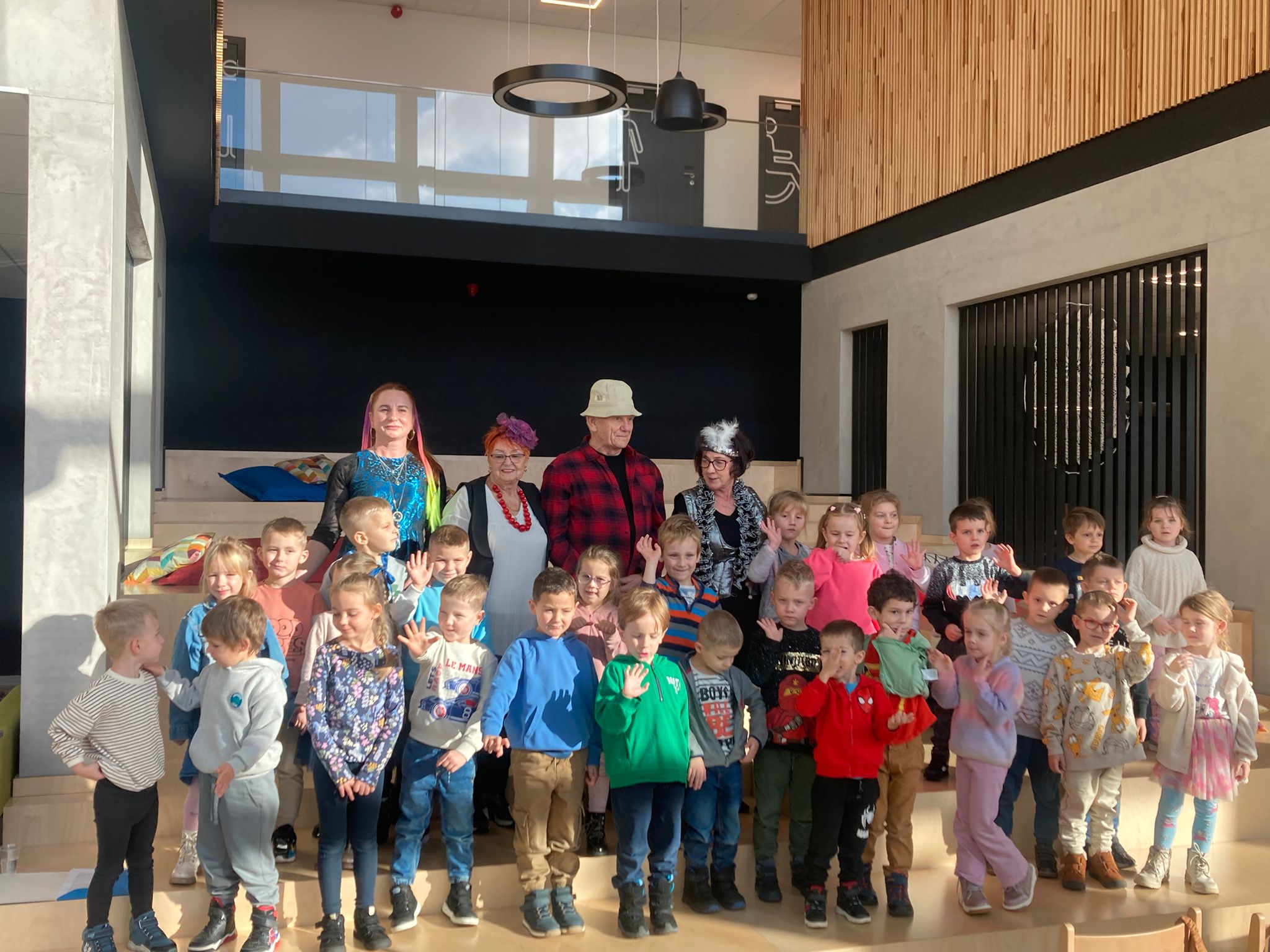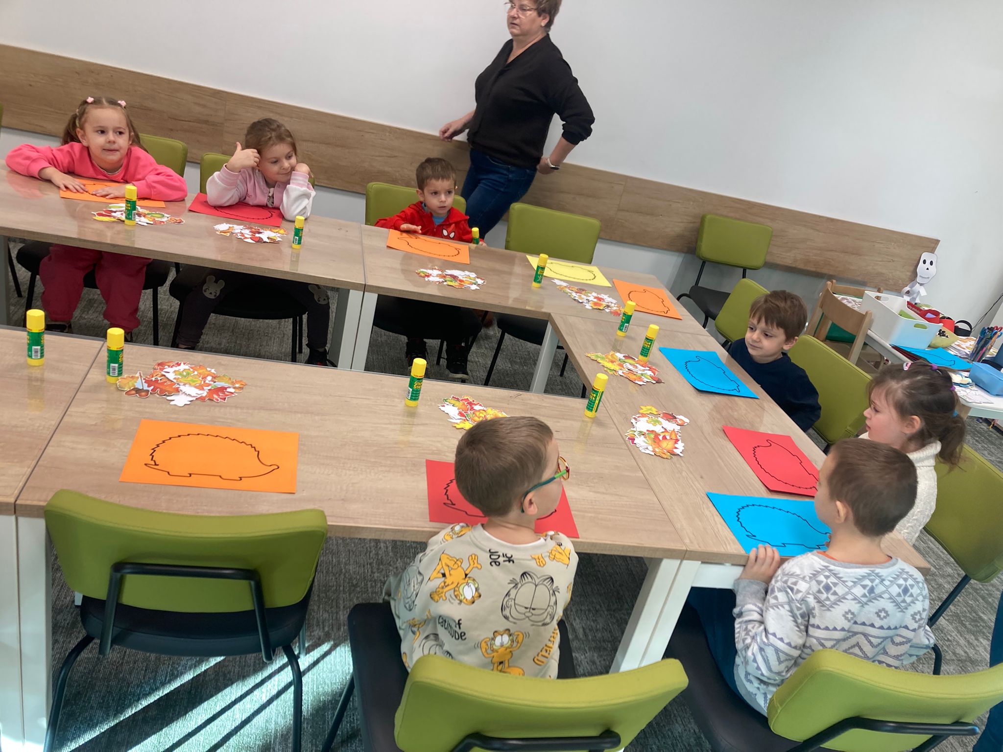 Wizytę rozpoczęliśmy od spotkania z seniorami,ktorzy przygotowali dla dzieciaków inscenizacje wierszy dziecięcych.Najbardziej spodobała się "Rzepka" Juliana Tuwima Dzieciaki z zaangażowaniem wcieliły się w rolę bohaterów i pomagały "wyrwać" rzepkę.Zabawa tak spodobała się dzieciakom że musiał być bis! Przedszkolaki zwiedziły bibliotekę - dział dziecięcy, bawiły się w strefie zabaw a także wzięły udział w warsztatach plastycznych , wykonały jesiennego jeżyka.