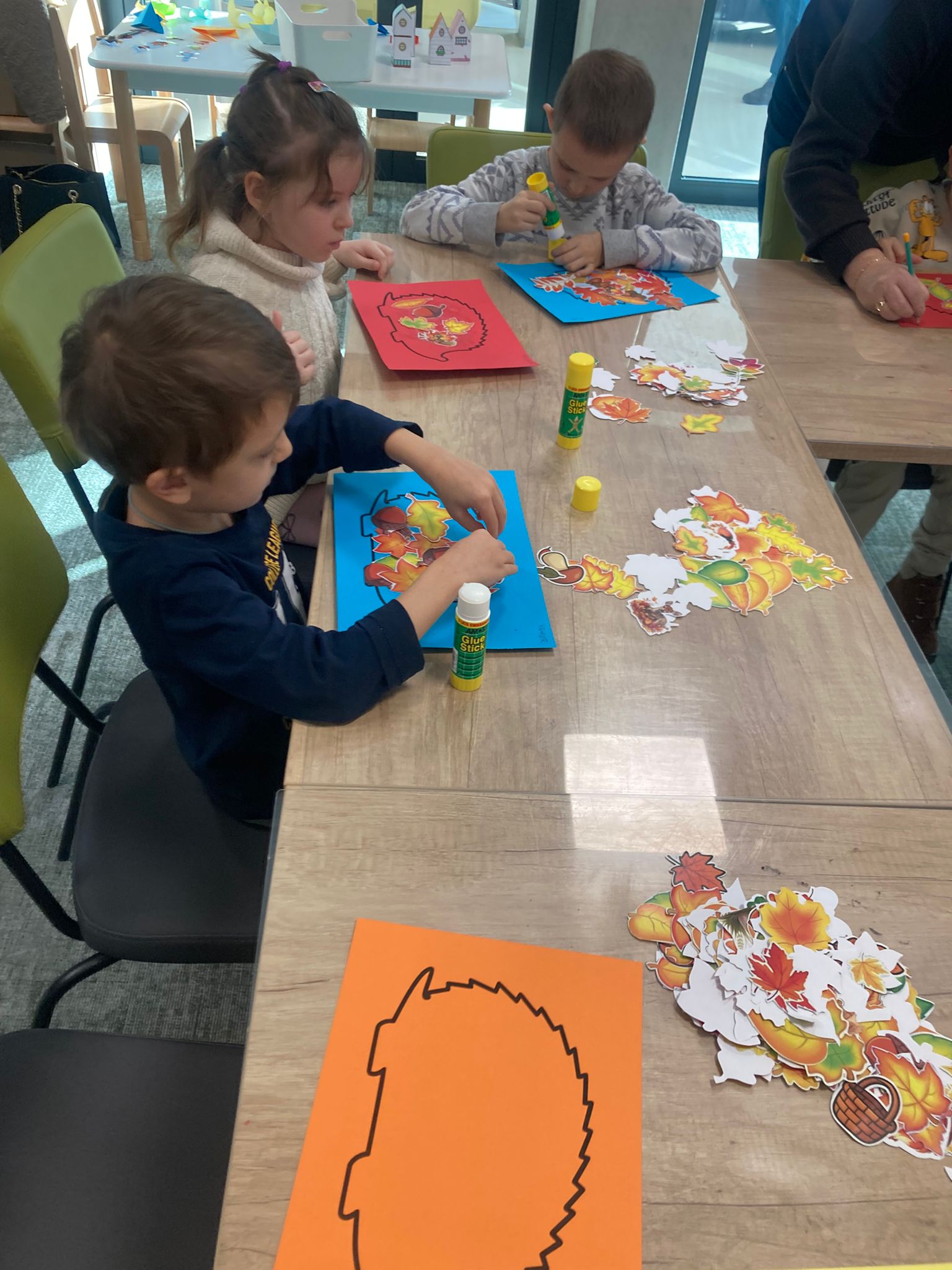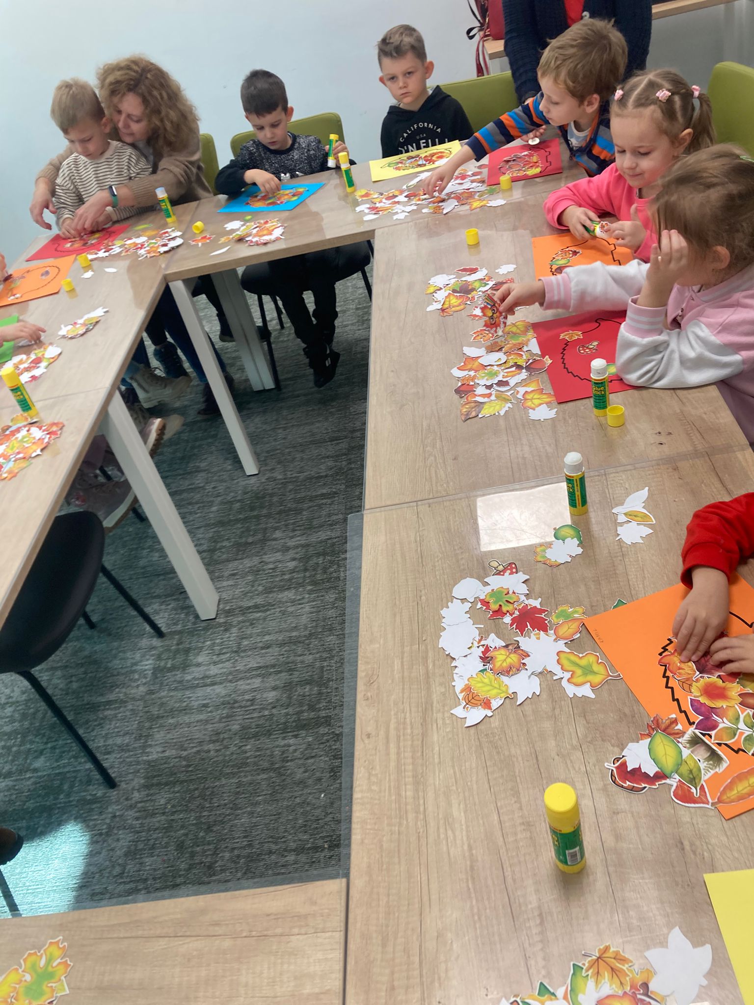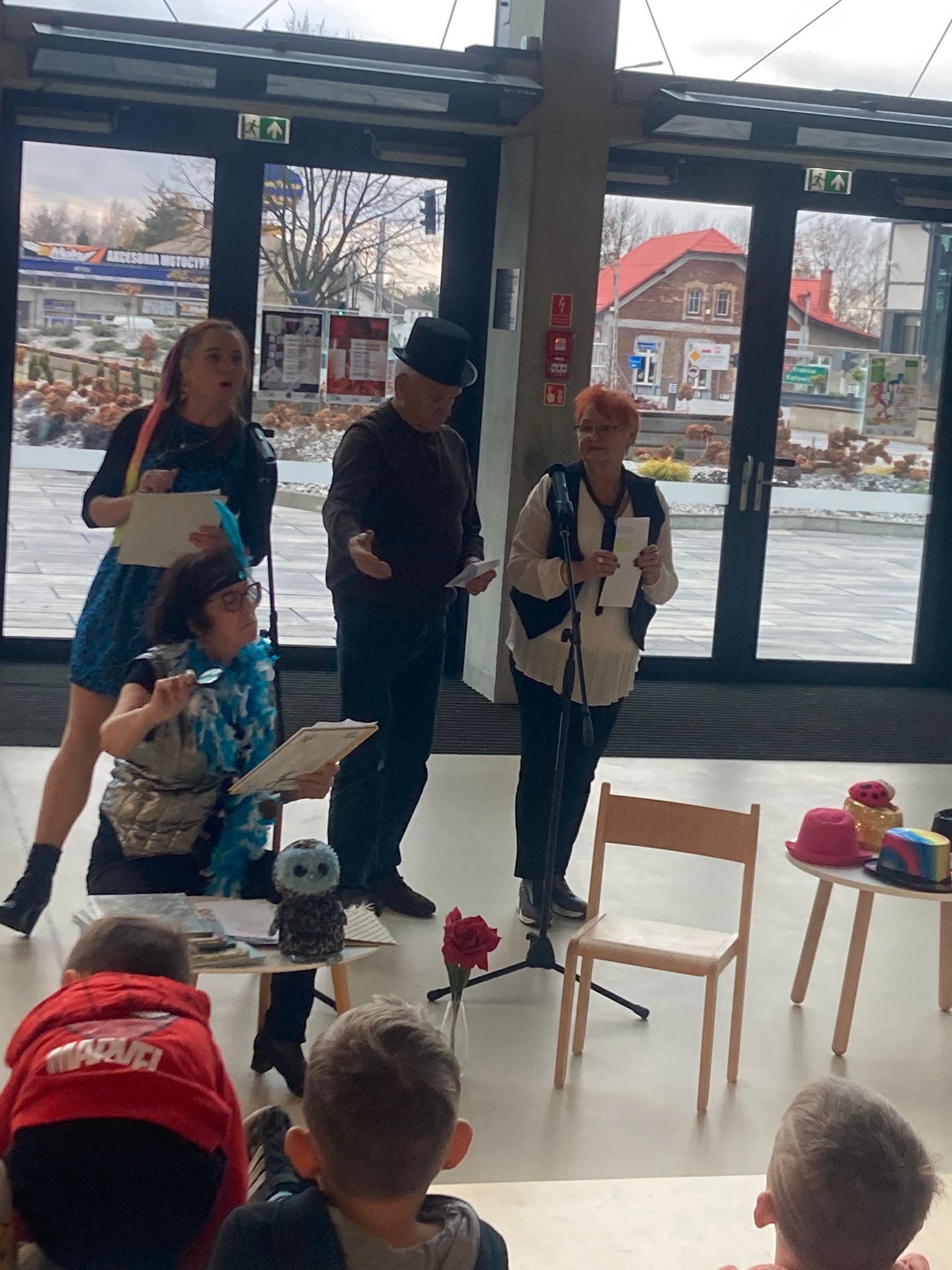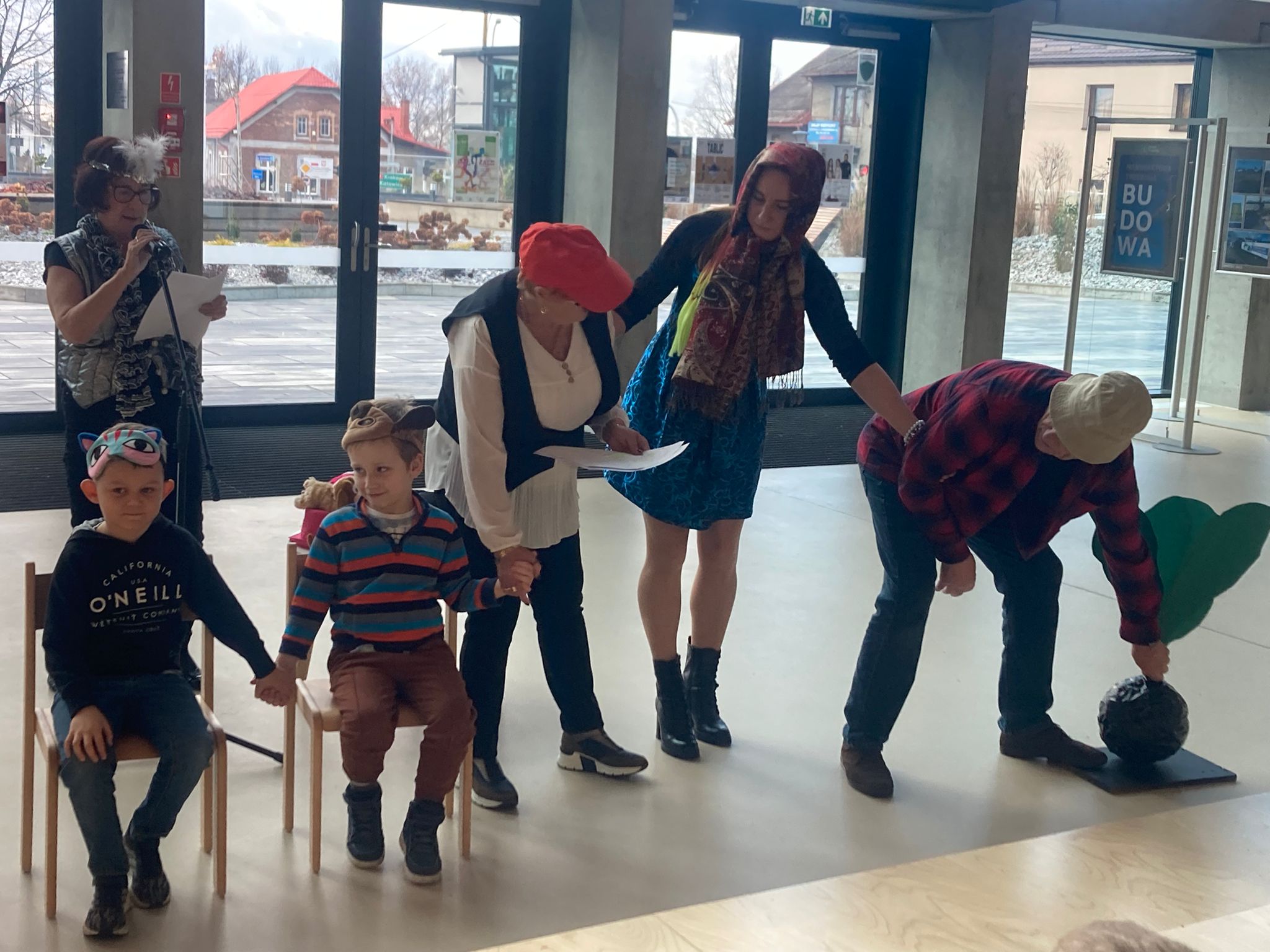 Wizytę rozpoczęliśmy od spotkania z seniorami,ktorzy przygotowali dla dzieciaków inscenizacje wierszy dziecięcych.Najbardziej spodobała się "Rzepka" Juliana Tuwima Dzieciaki z zaangażowaniem wcieliły się w rolę bohaterów i pomagały "wyrwać" rzepkę.Zabawa tak spodobała się dzieciakom że musiał być bis! Przedszkolaki zwiedziły bibliotekę - dział dziecięcy, bawiły się w strefie zabaw a także wzięły udział w warsztatach plastycznych , wykonały jesiennego jeżyka.