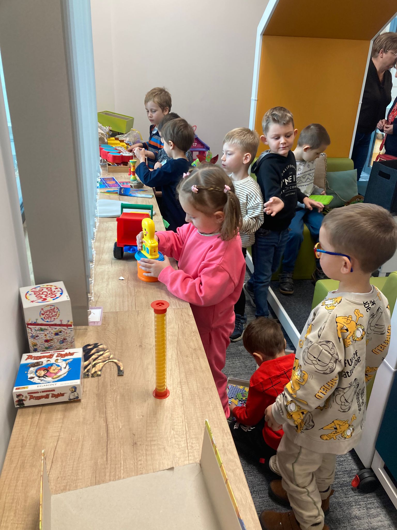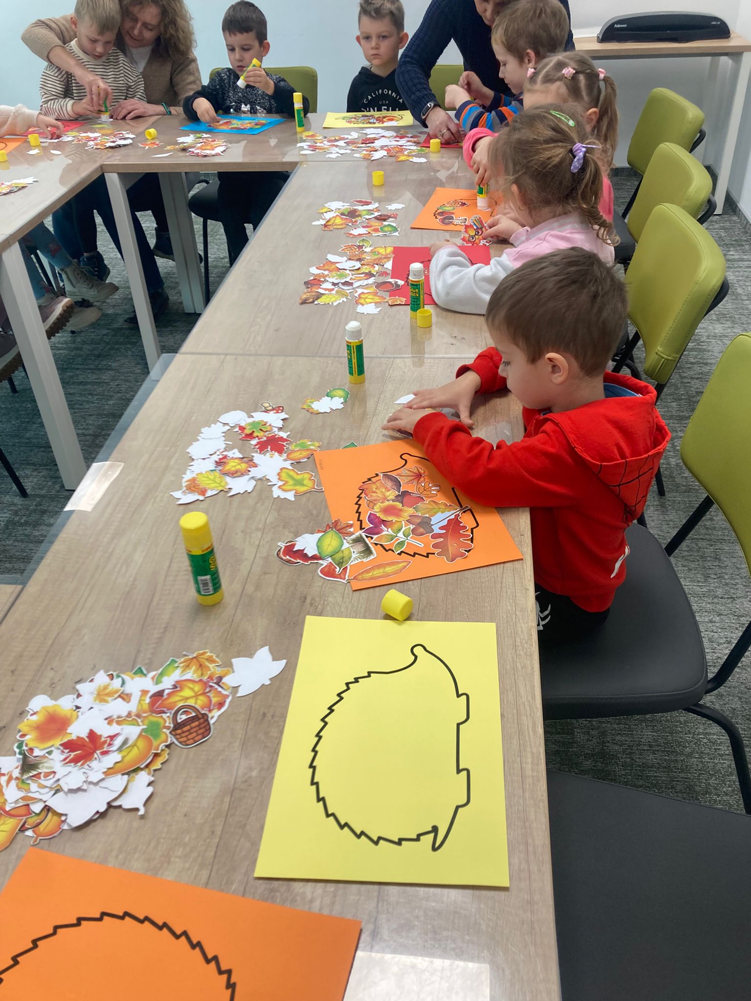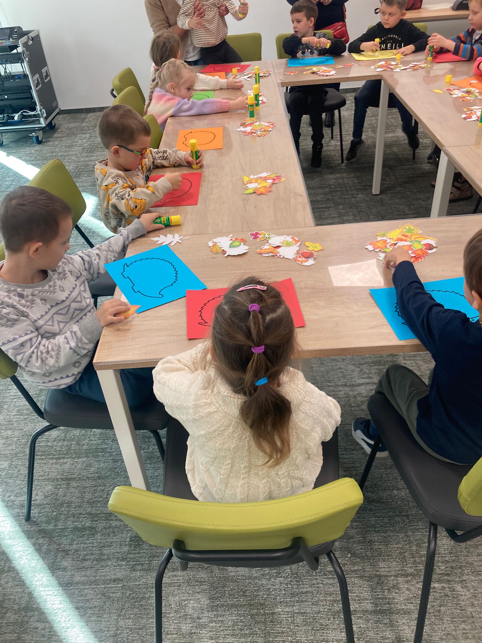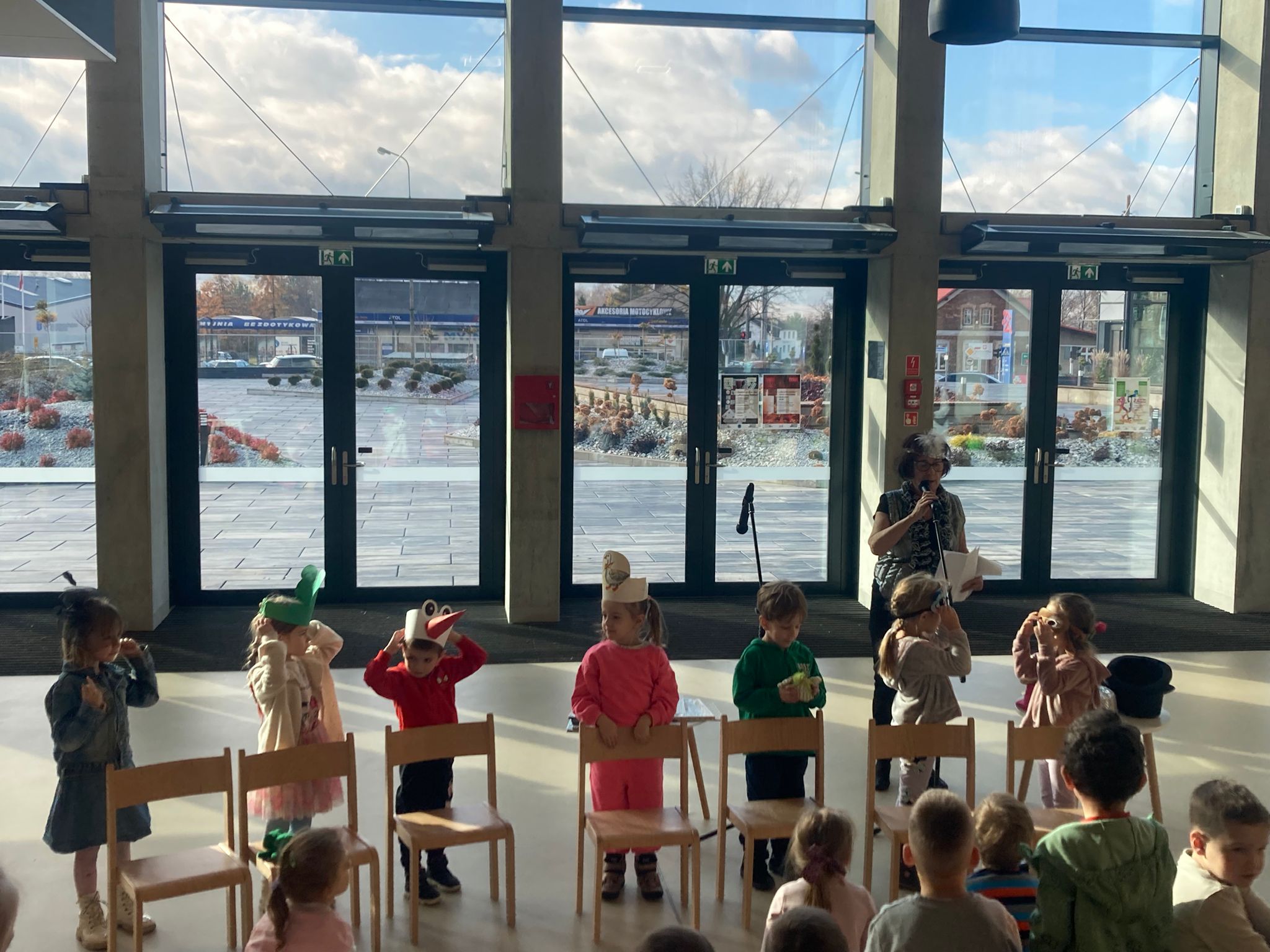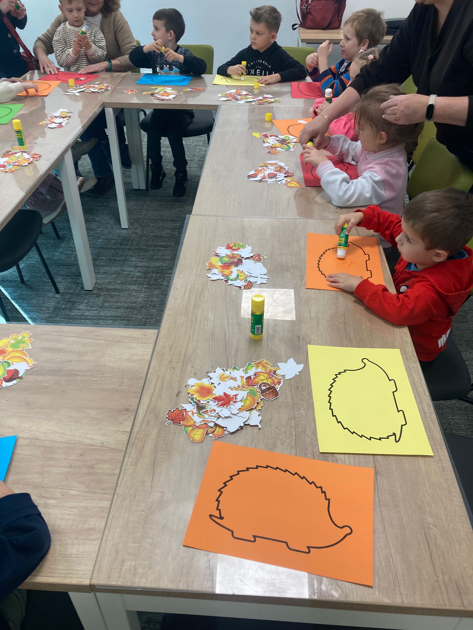 Wizytę rozpoczęliśmy od spotkania z seniorami,ktorzy przygotowali dla dzieciaków inscenizacje wierszy dziecięcych.Najbardziej spodobała się "Rzepka" Juliana Tuwima Dzieciaki z zaangażowaniem wcieliły się w rolę bohaterów i pomagały "wyrwać" rzepkę.Zabawa tak spodobała się dzieciakom że musiał być bis! Przedszkolaki zwiedziły bibliotekę - dział dziecięcy, bawiły się w strefie zabaw a także wzięły udział w warsztatach plastycznych , wykonały jesiennego jeżyka.