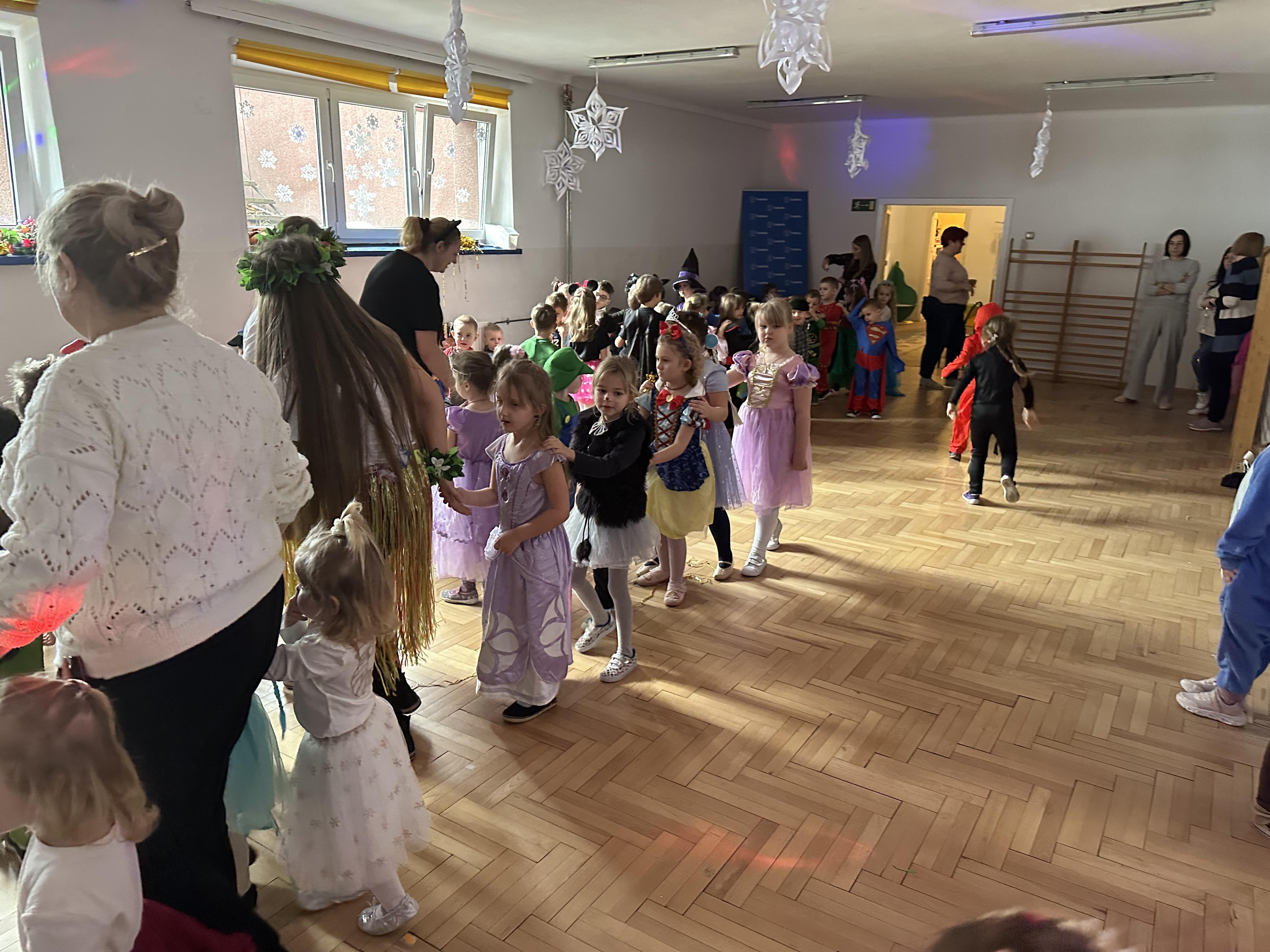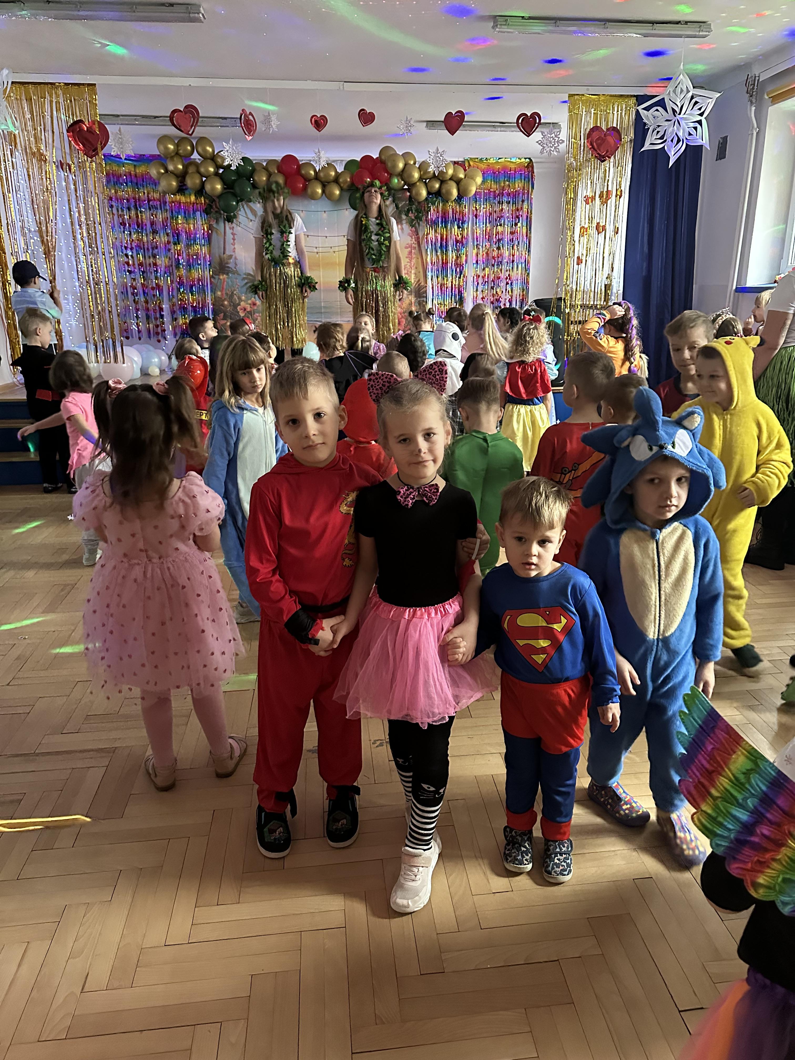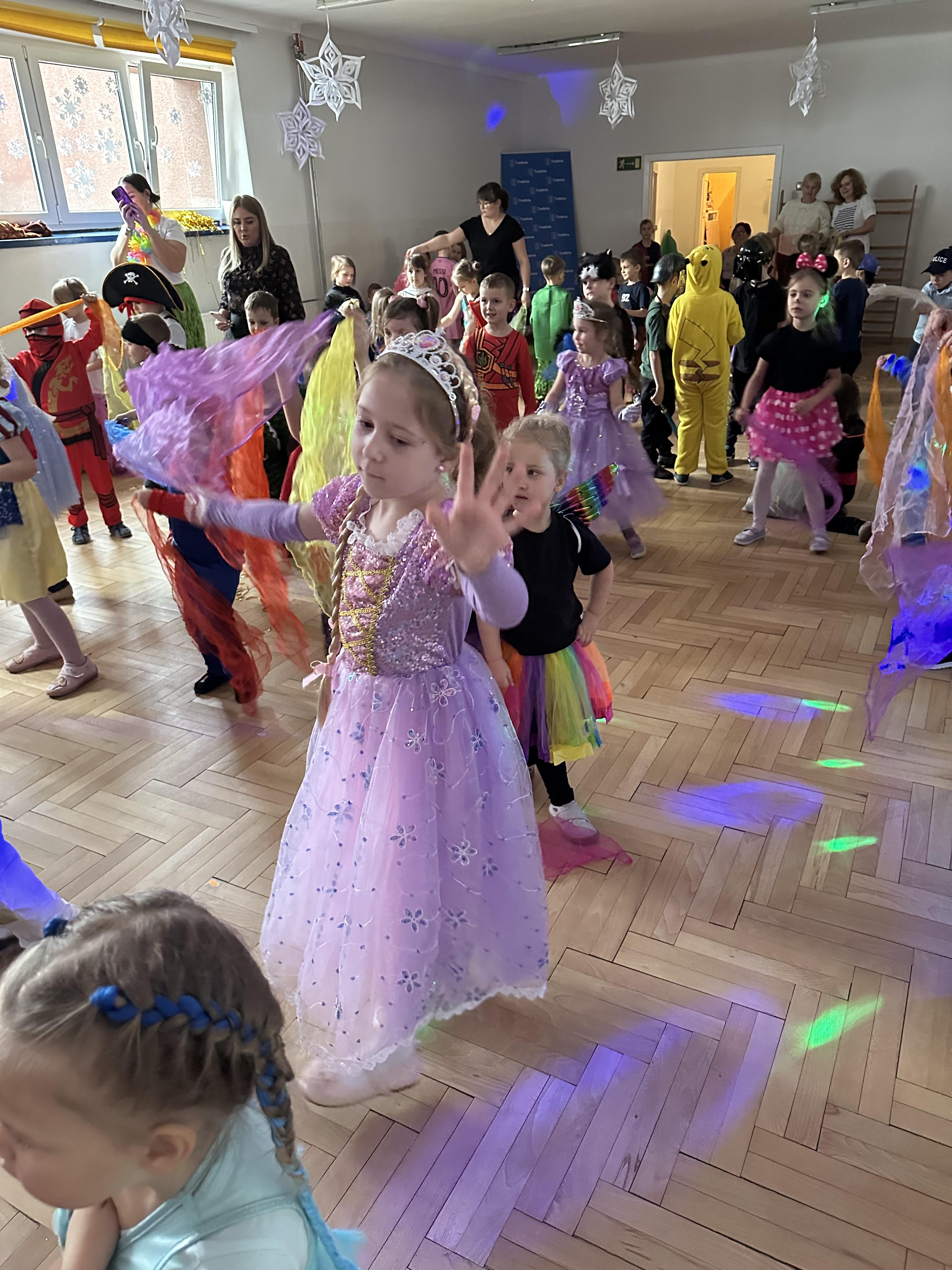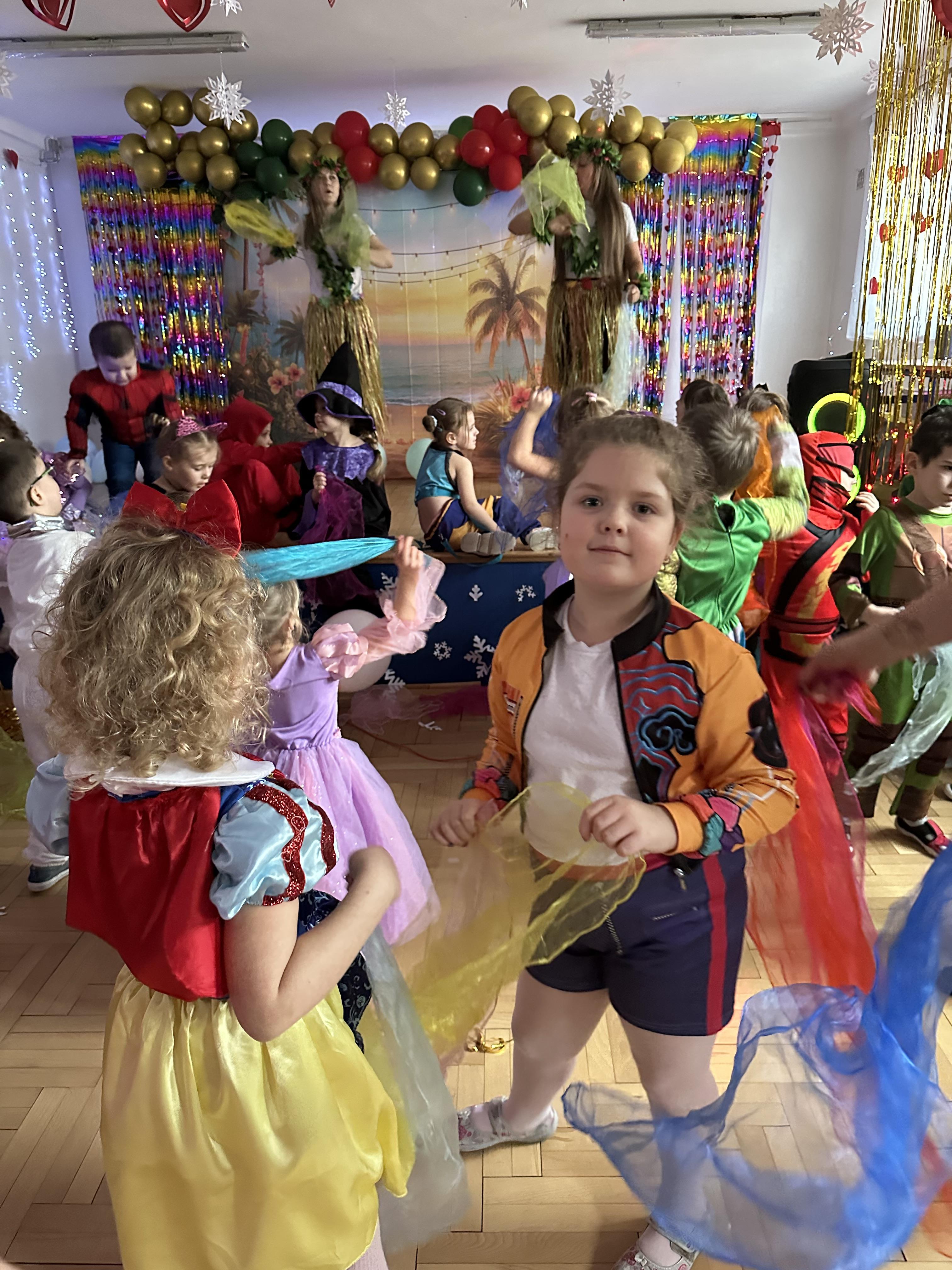 W dalszej części odbyły się tańce , wesołe pląsy oraz liczne konkursy i zabawy ruchowe. Wszystkie aktywności przebiegały w radosnej, serdecznej i przyjaznej atmosferze, sprzyjającej integracji dzieci z różnych grup. Bal dostarczył przedszkolakom wielu niezapomnianych wrażeń oraz był okazją do wspólnej zabawy i rozwijania relacji rówieśniczych.
