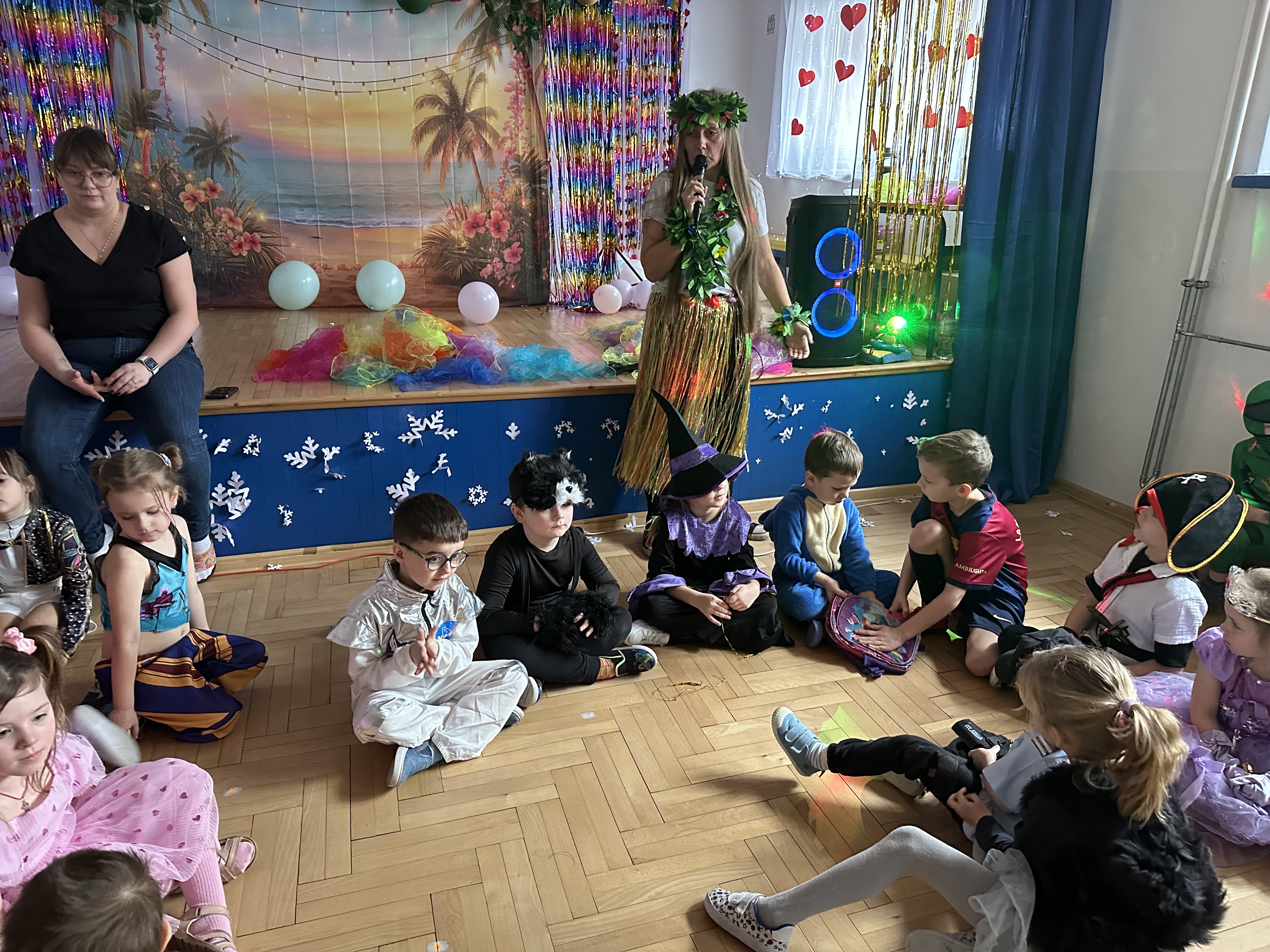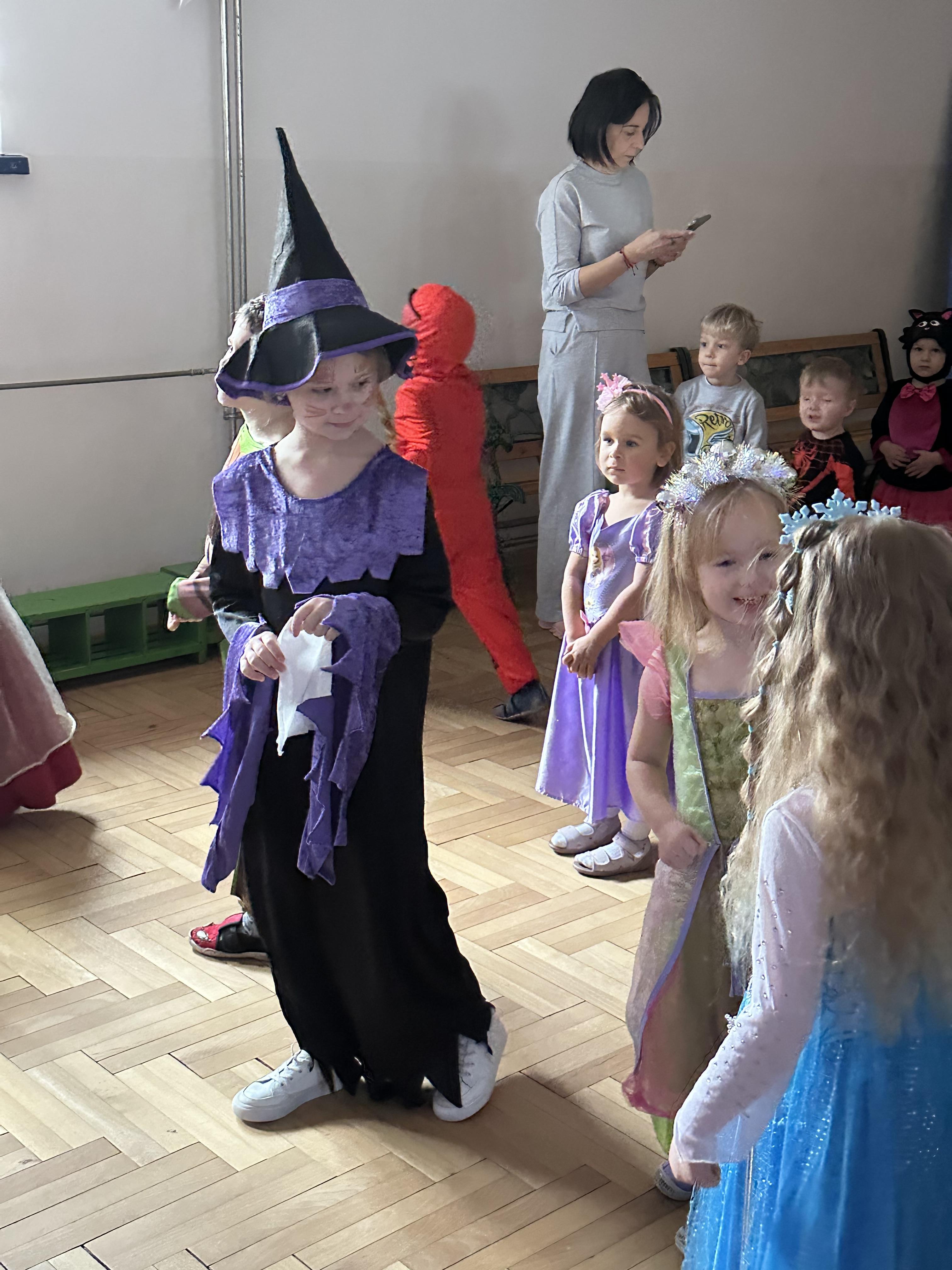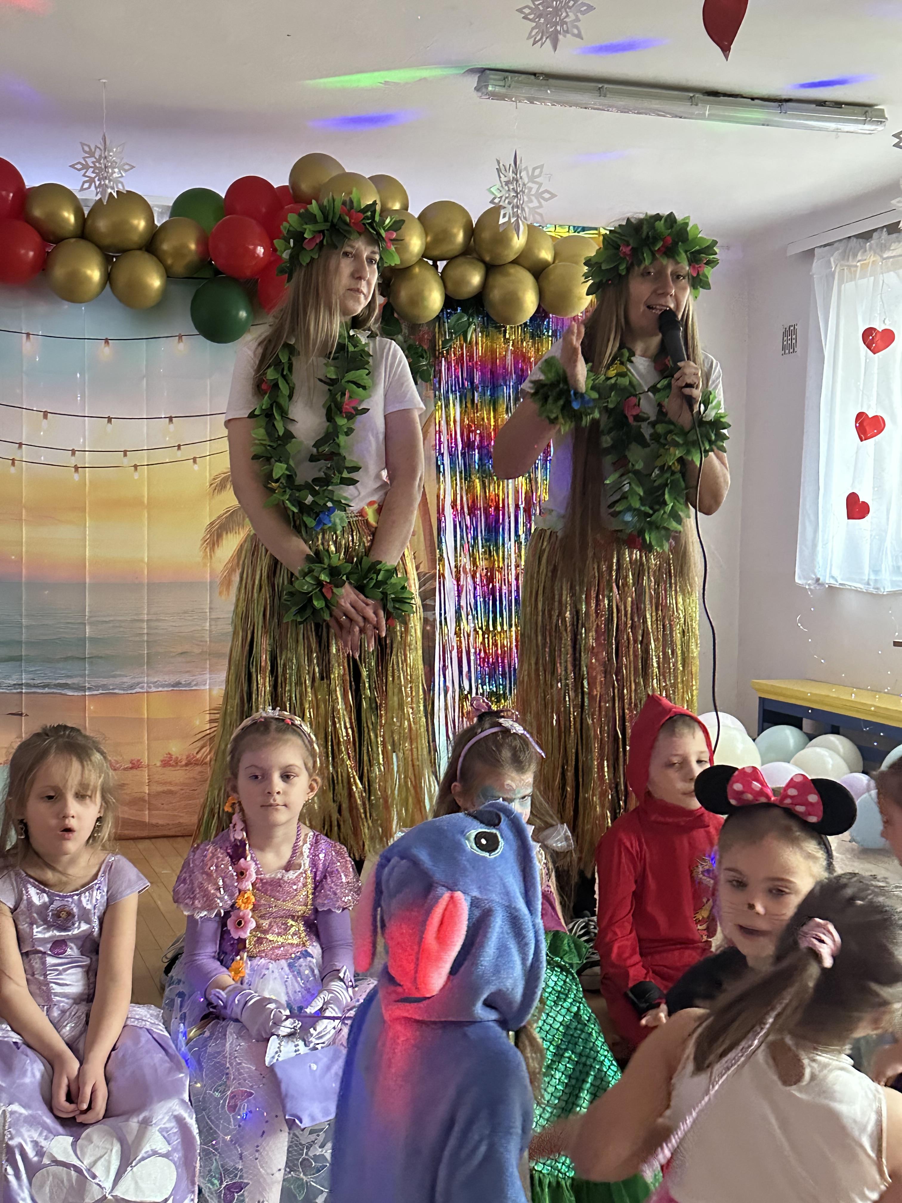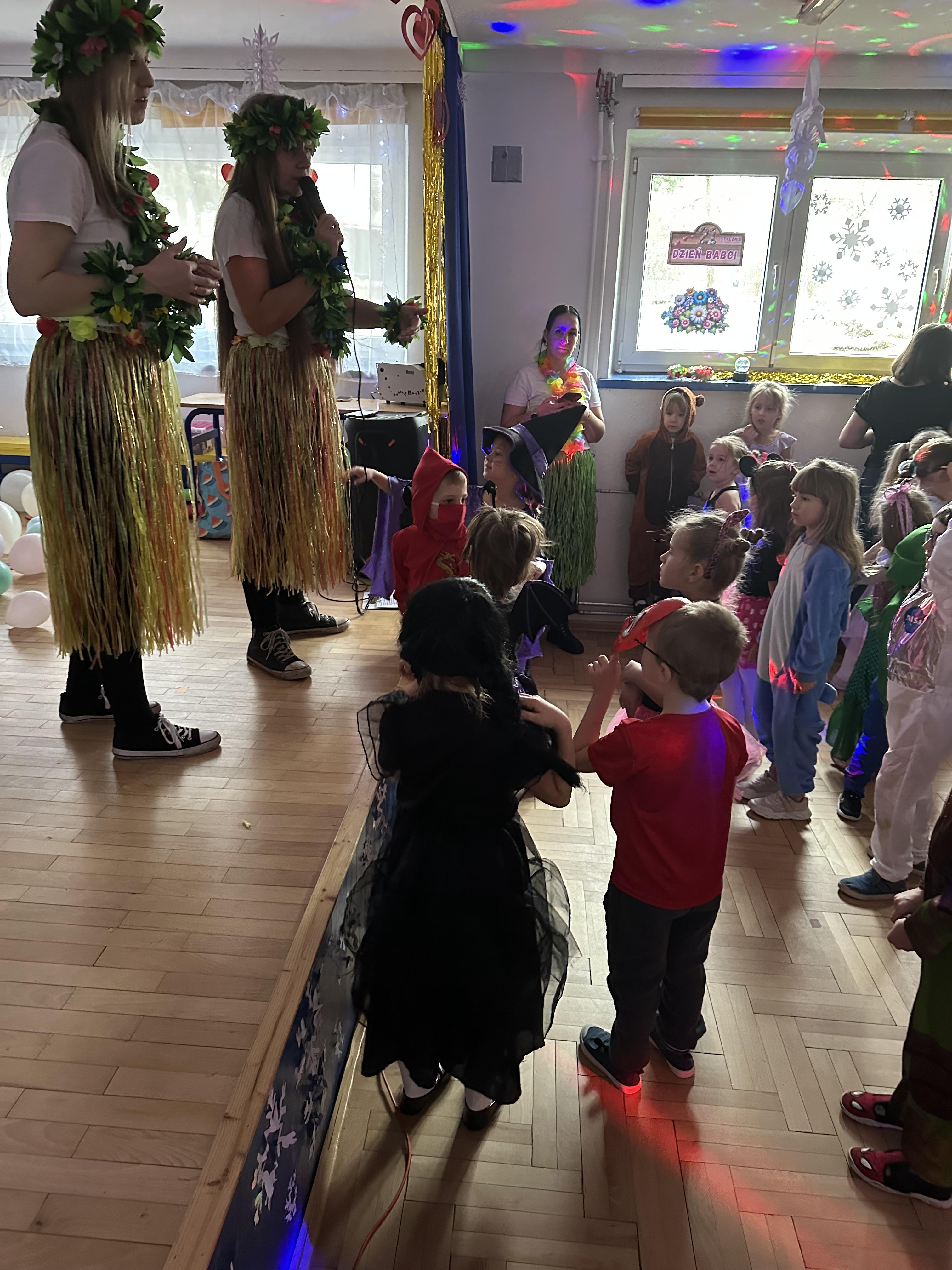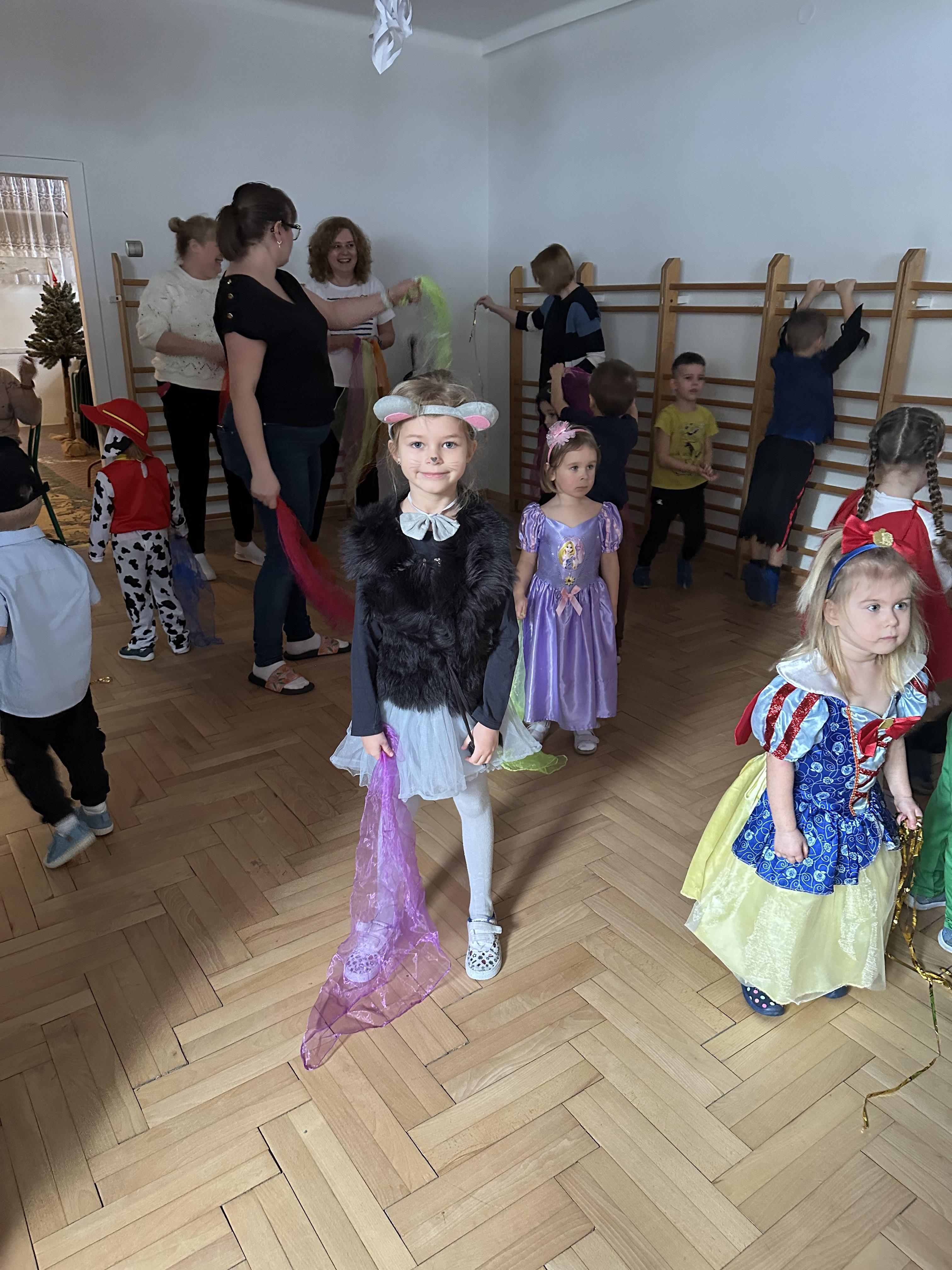 Po przybyciu przedszkolaków sala wypełniła się barwnymi postaciami z różnych bajek i opowieści. Dzieci wystąpiły w pomysłowych i starannie przygotowanych strojach, co nadało wydarzeniu wyjątkowego charakteru. Zabawa rozpoczęła się wspólnym zaśpiewaniem piosenki powitalnej o naszym przedszkolu, którą napisała pani animatorka.