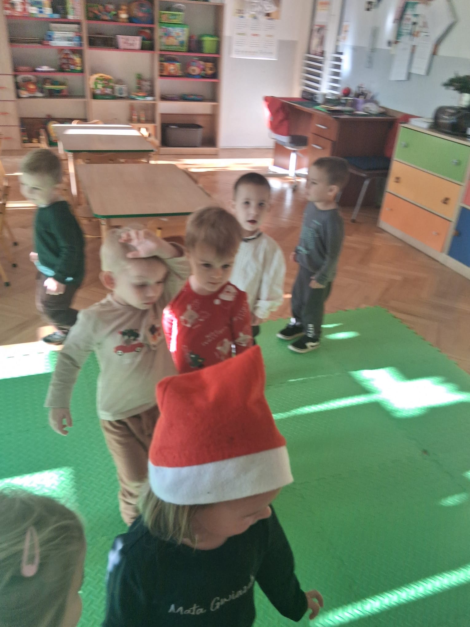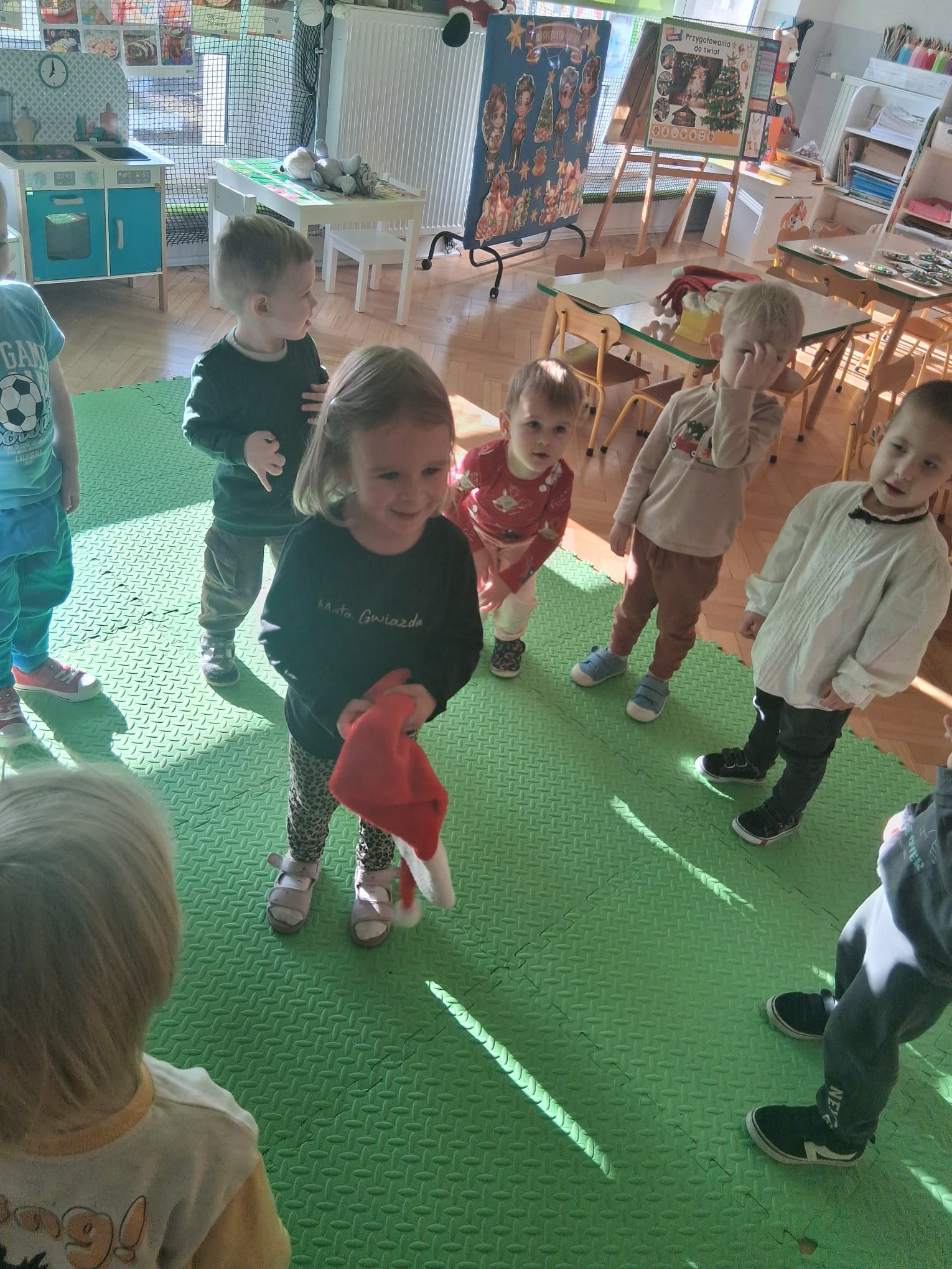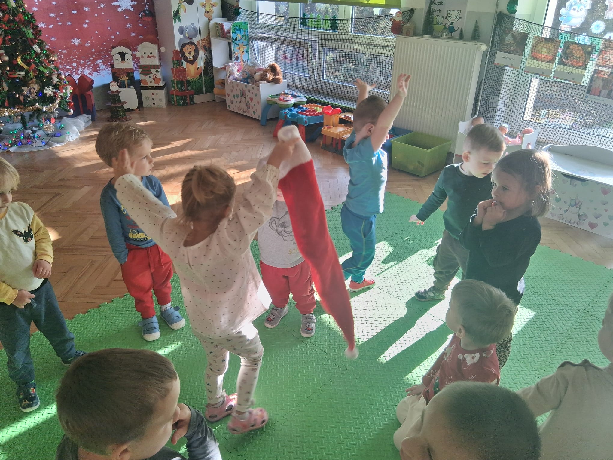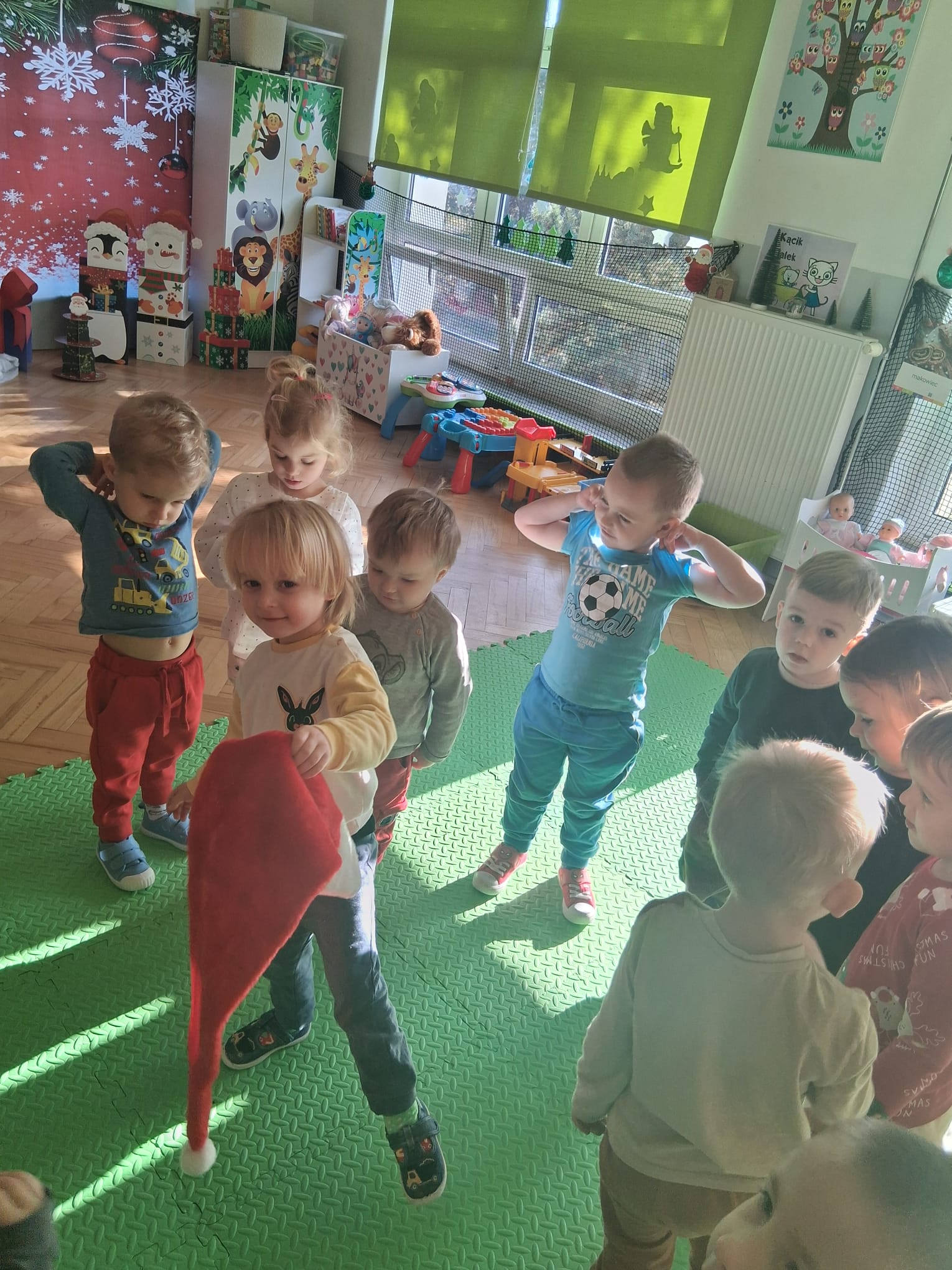 Krasnoludki zrealizowały kolejne zadania z Programu Edukacyjnego ,, W zdrowym ciele zdrowy duch, wie to każdy mały zuch''. W zabawach pomagały nam czapeczki mikołajowe.