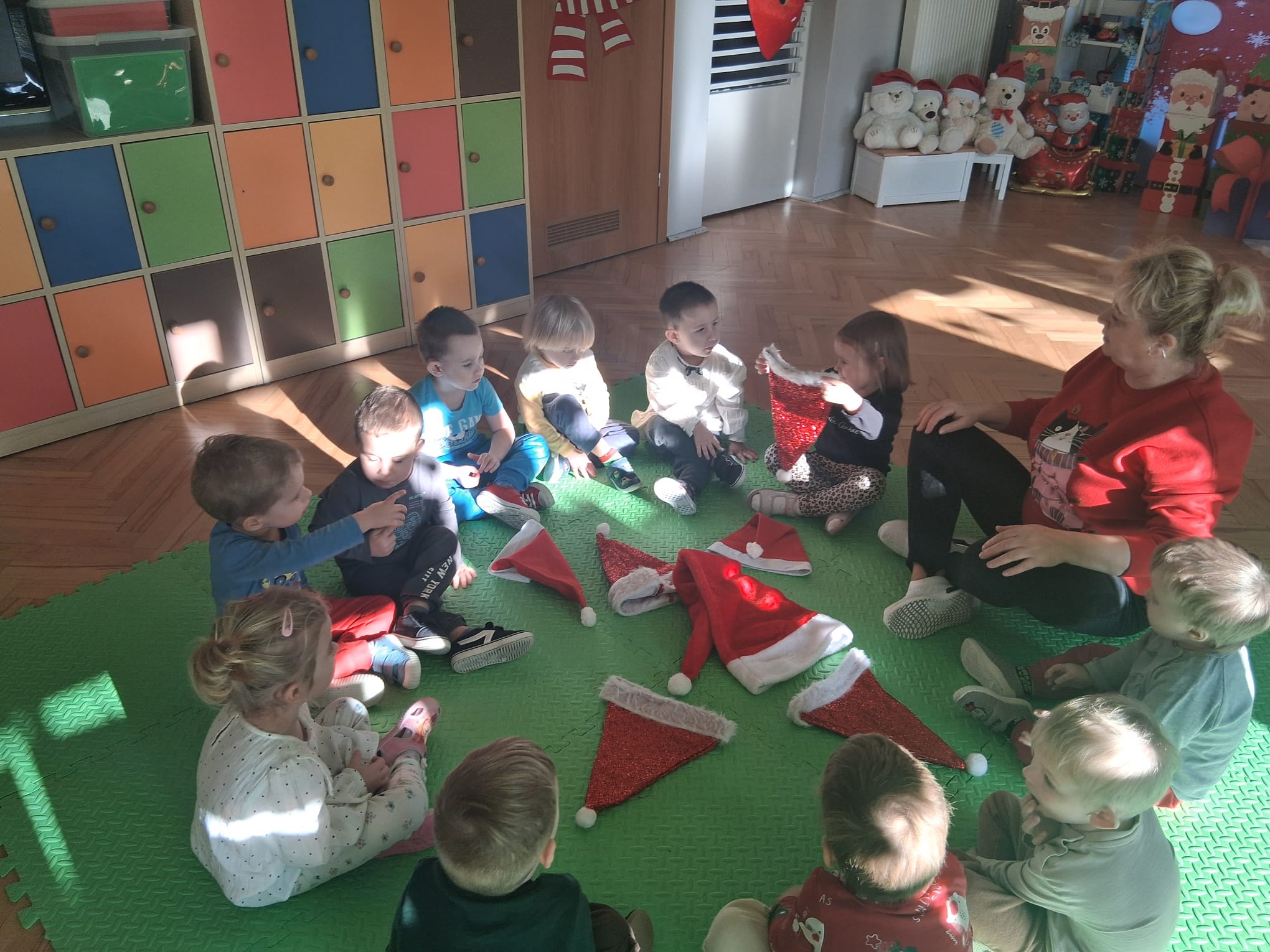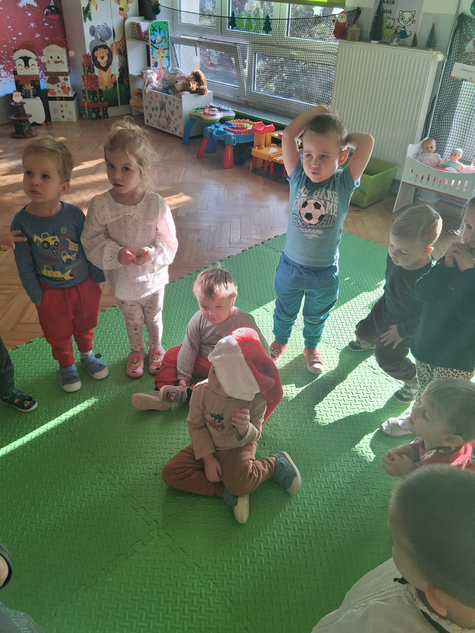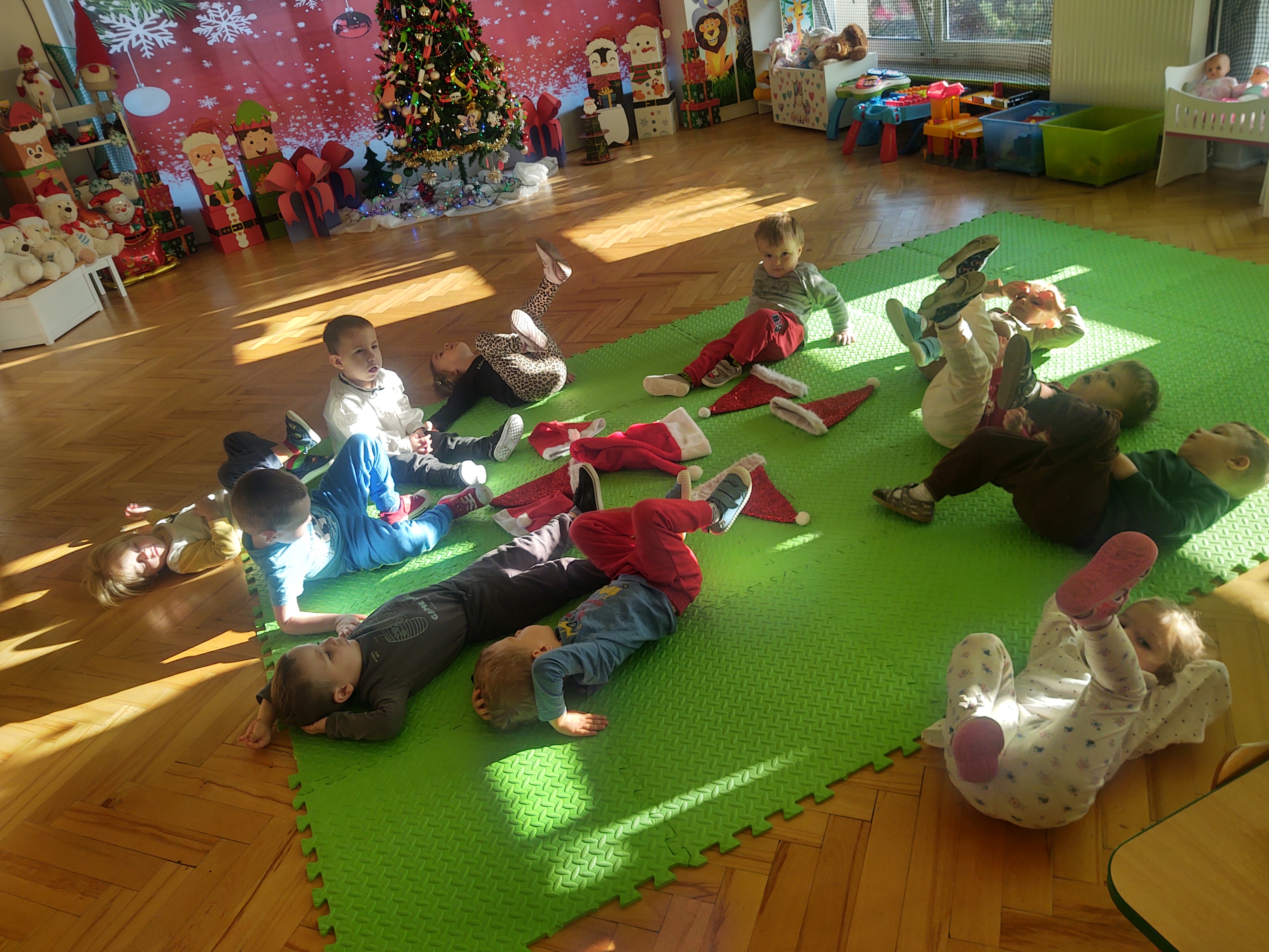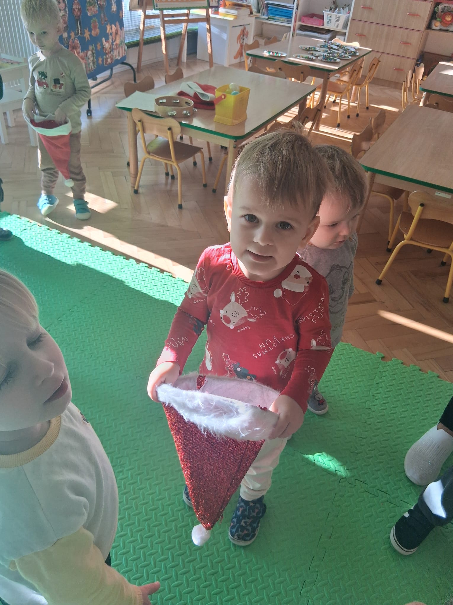 Krasnoludki zrealizowały kolejne zadania z Programu Edukacyjnego ,, W zdrowym ciele zdrowy duch, wie to każdy mały zuch''. W zabawach pomagały nam czapeczki mikołajowe.