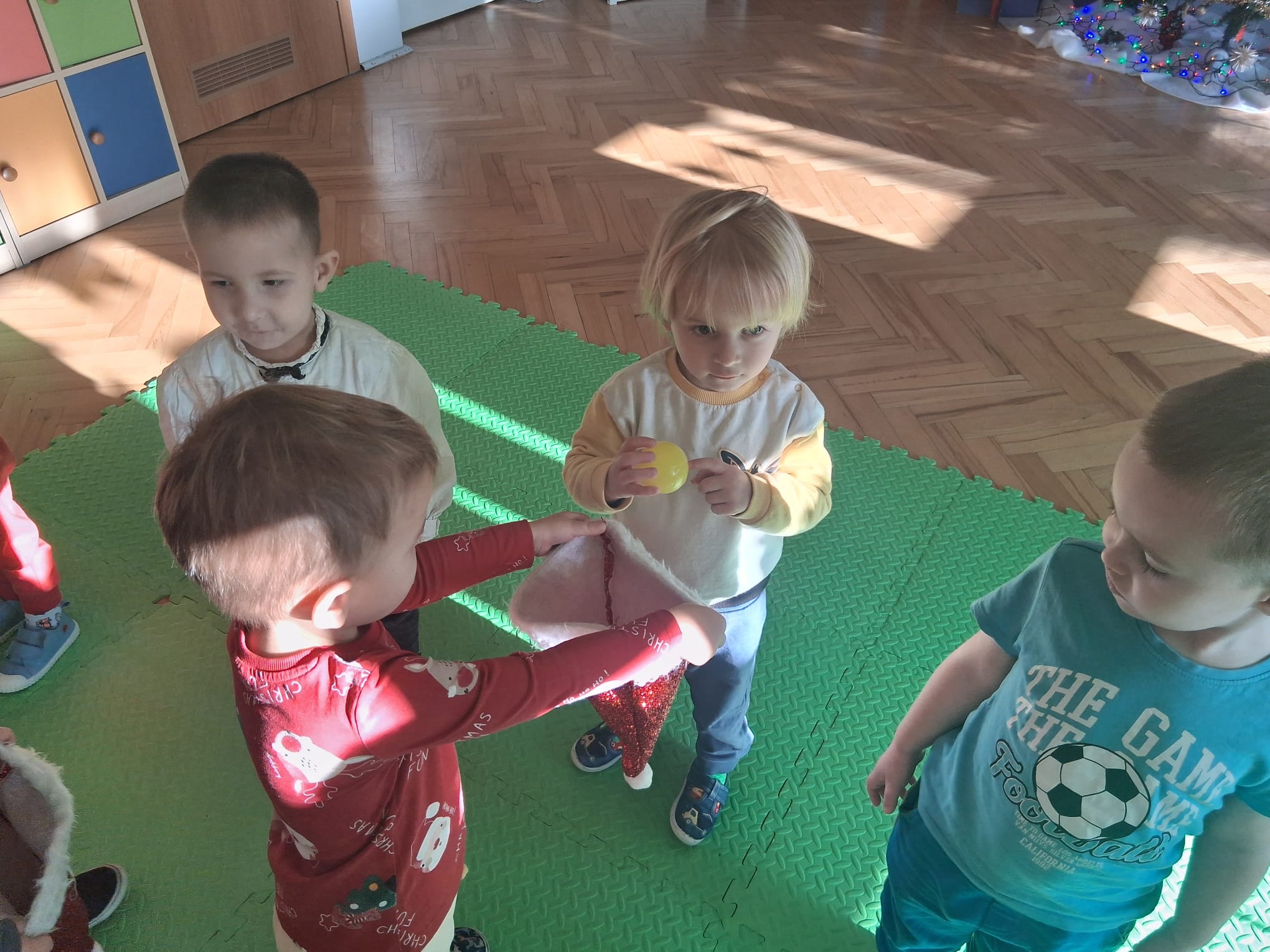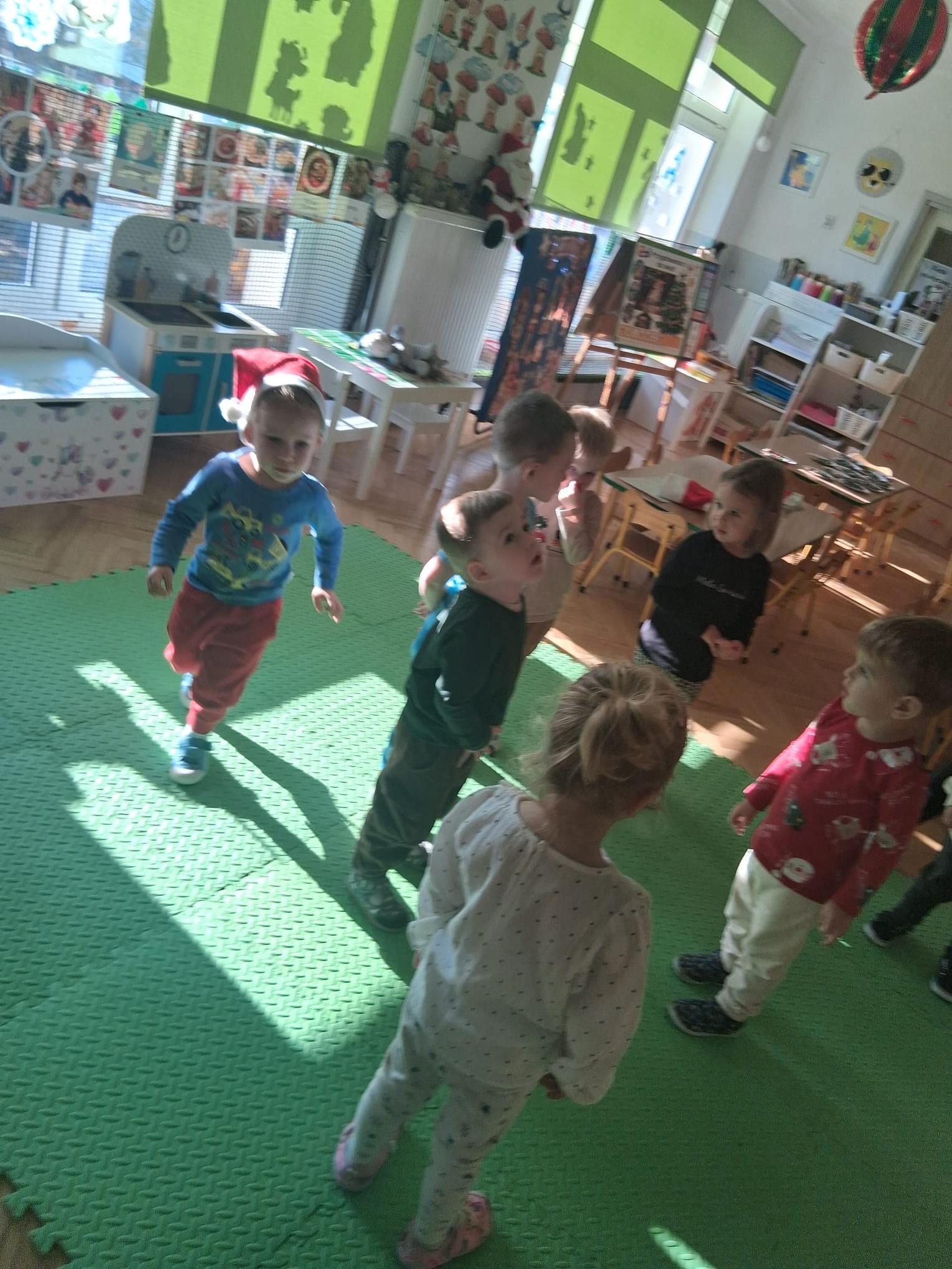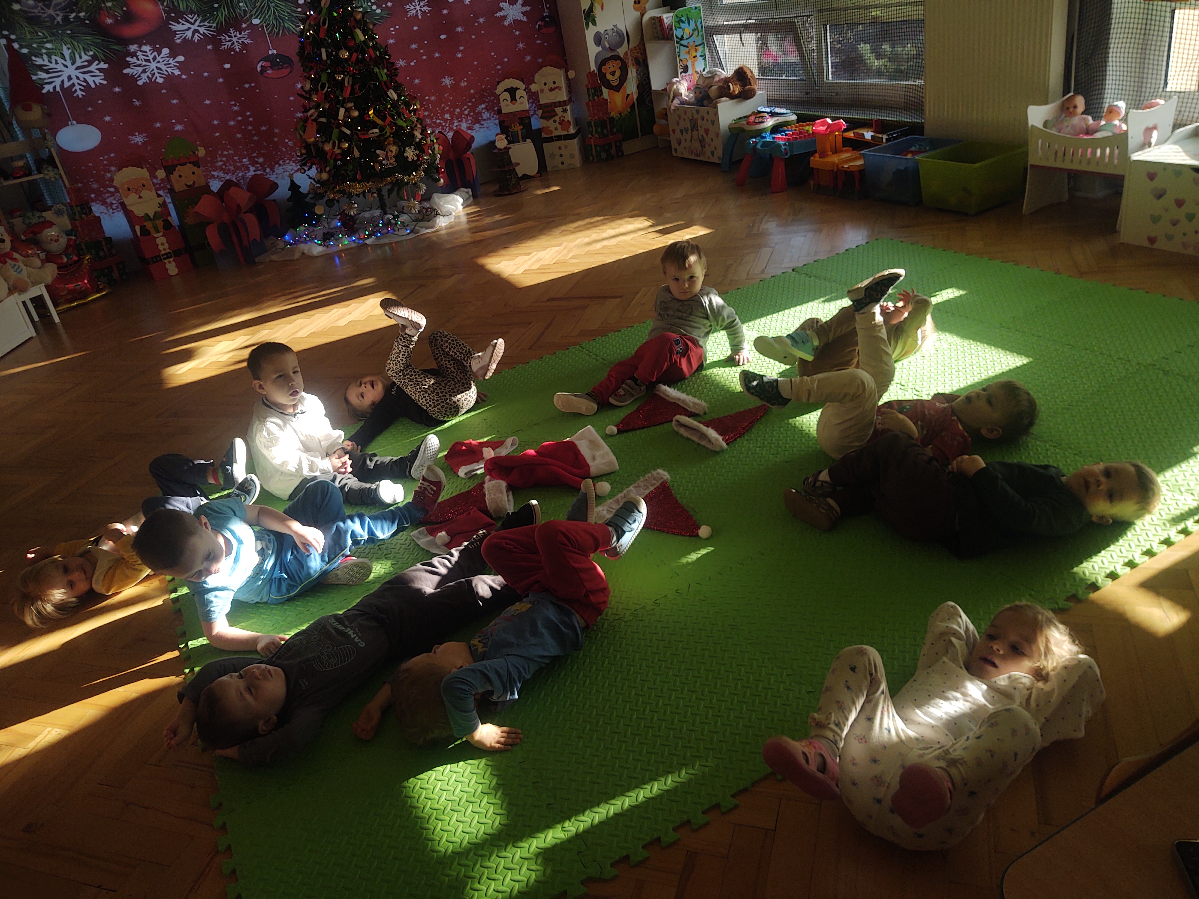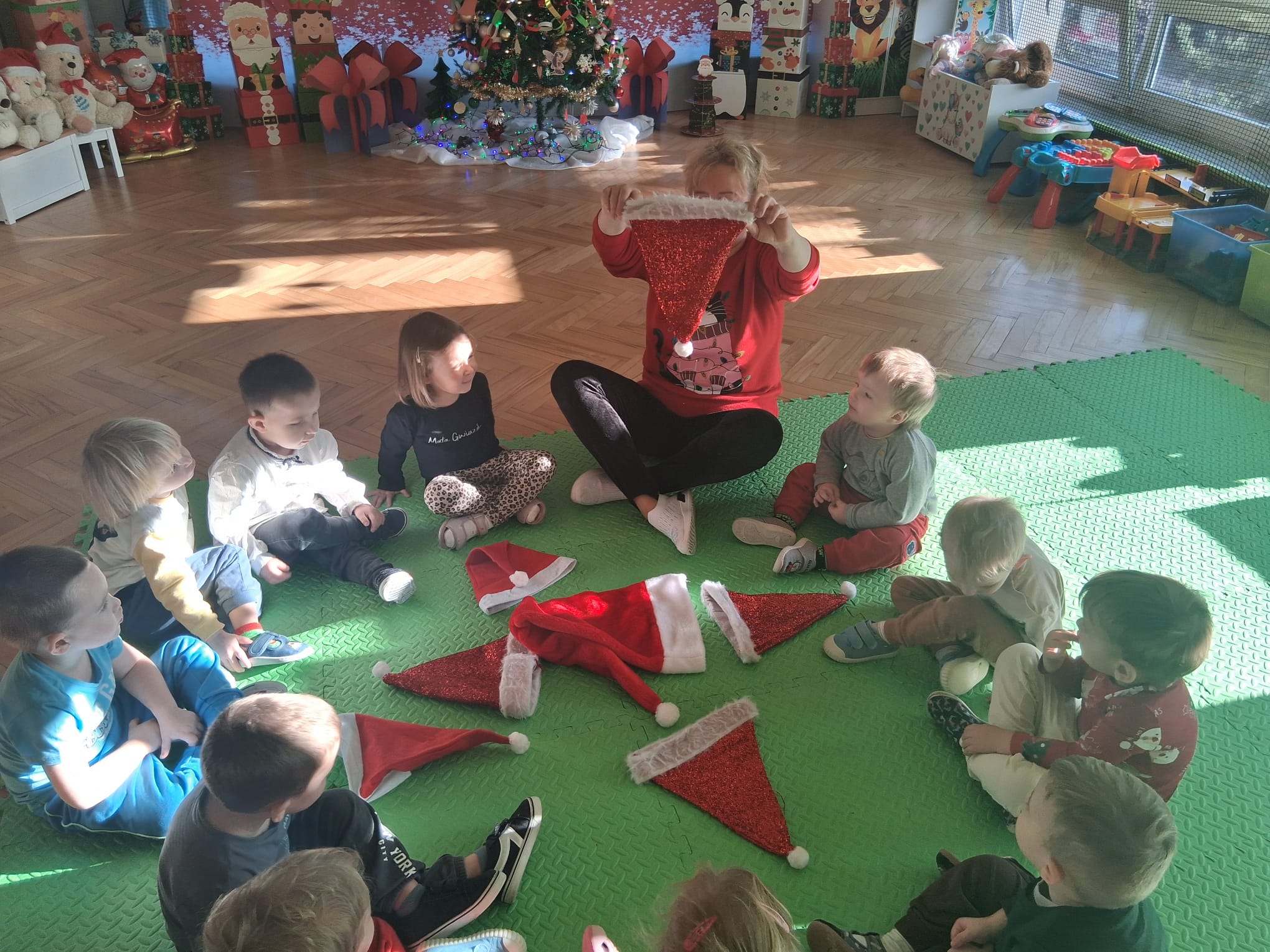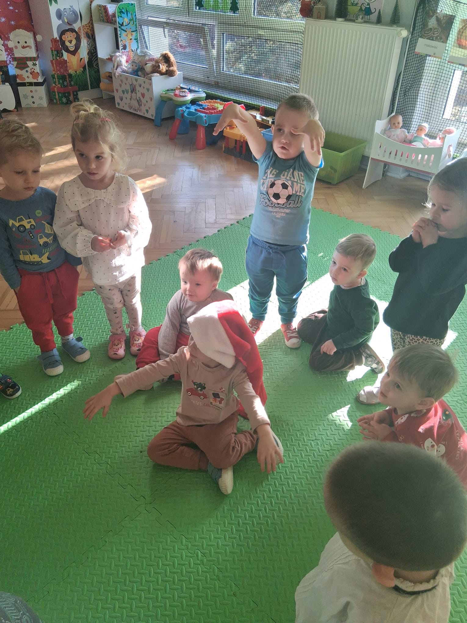 Krasnoludki zrealizowały kolejne zadania z Programu Edukacyjnego ,, W zdrowym ciele zdrowy duch, wie to każdy mały zuch''. W zabawach pomagały nam czapeczki mikołajowe.