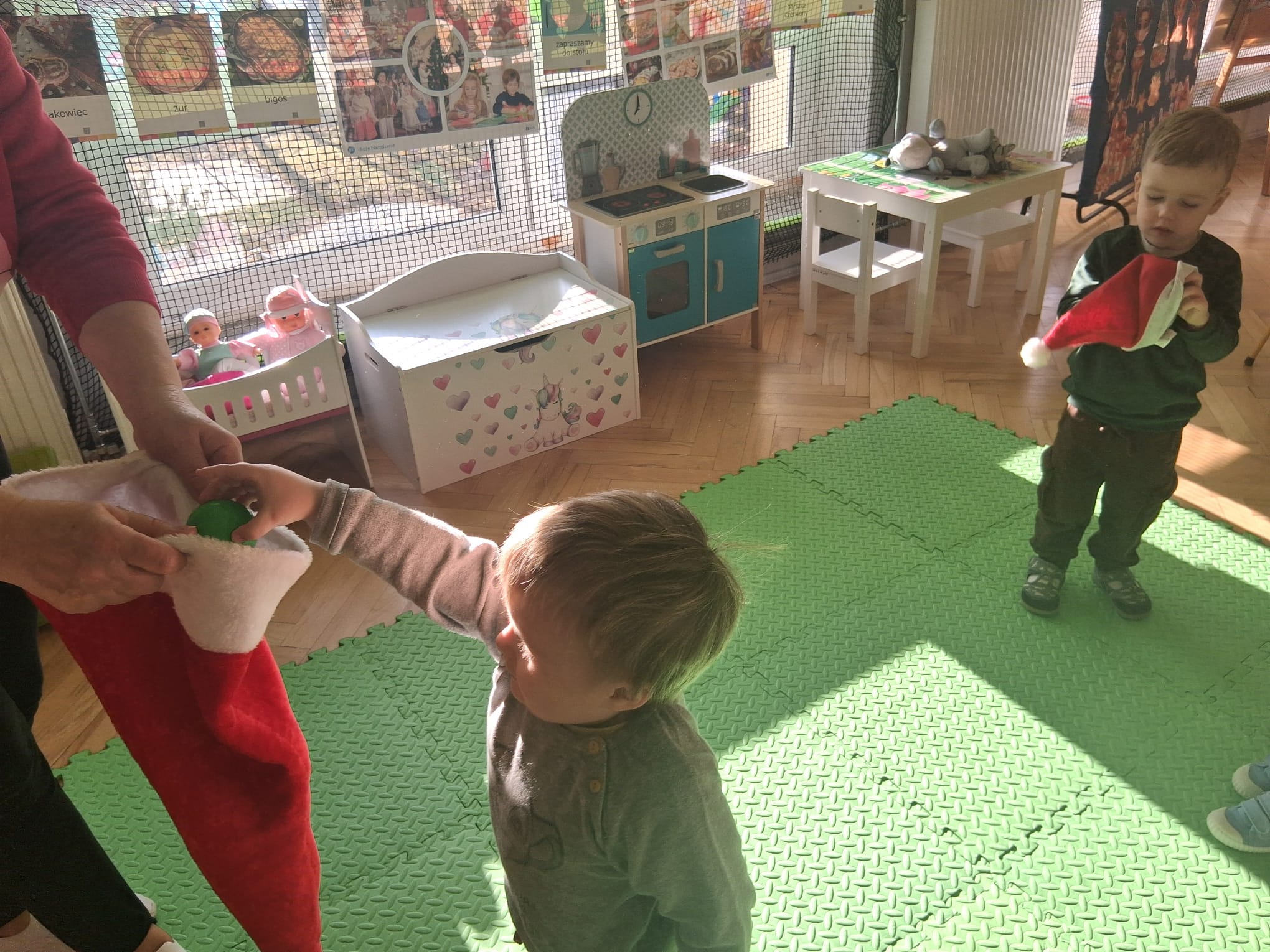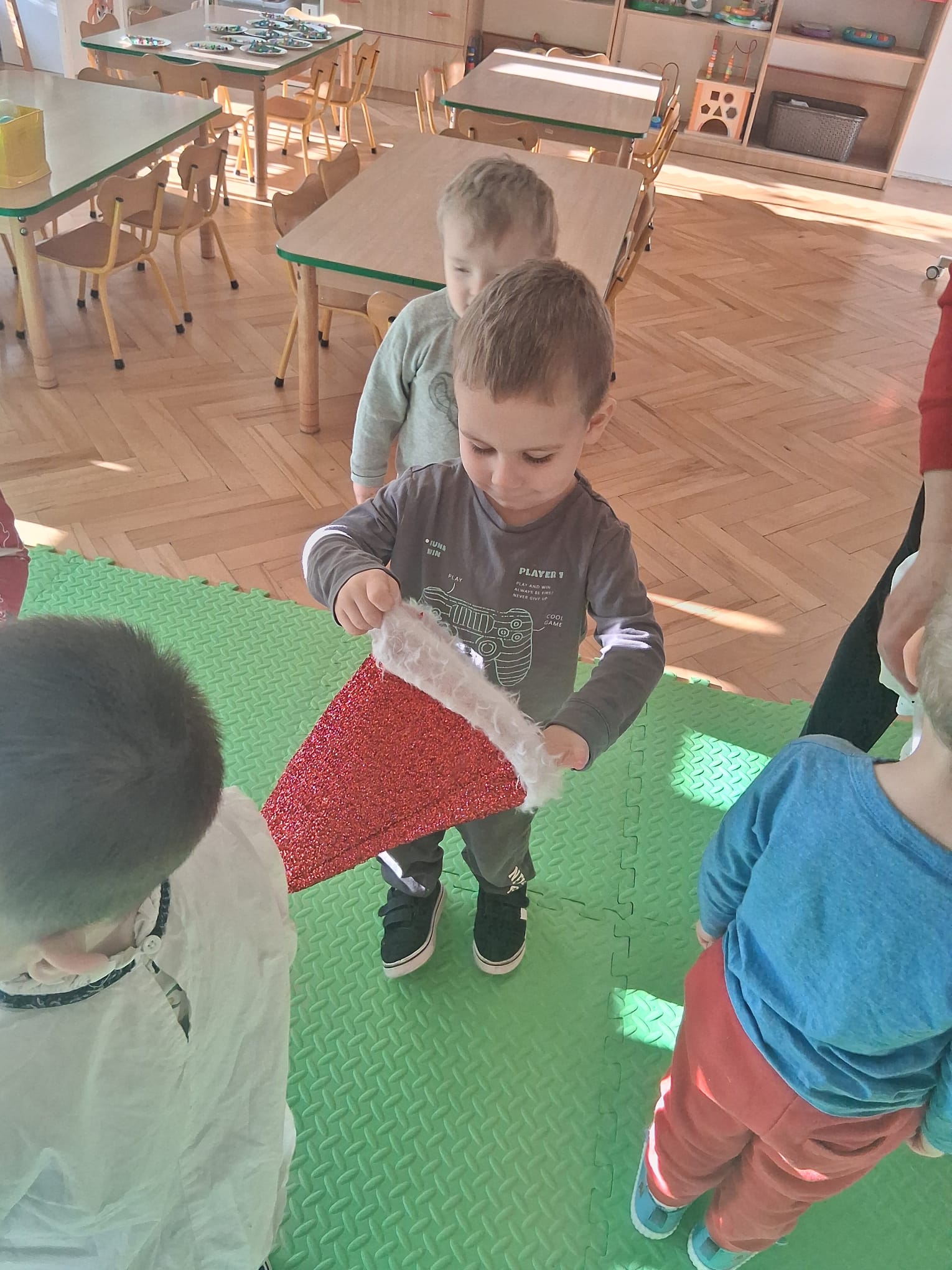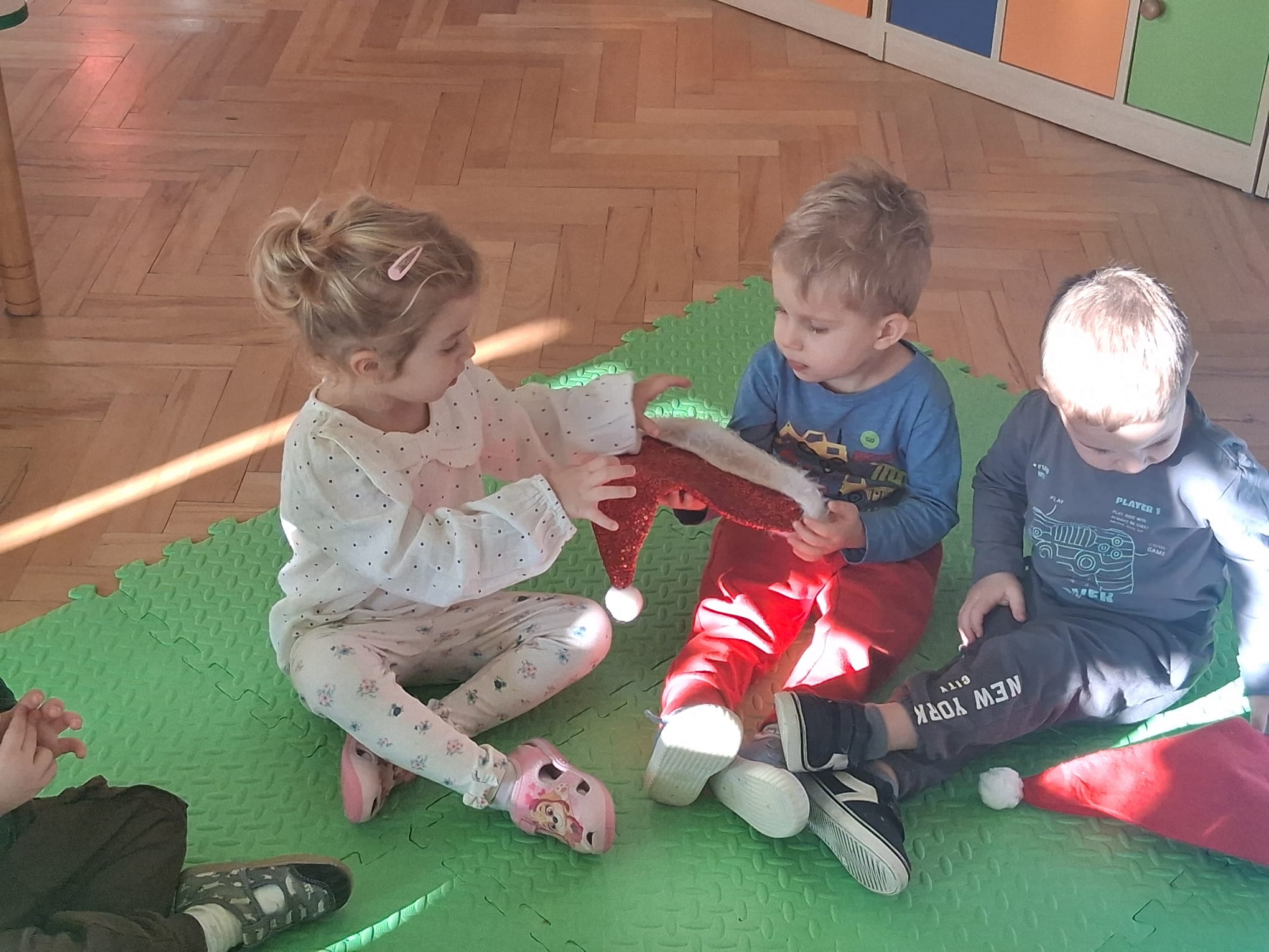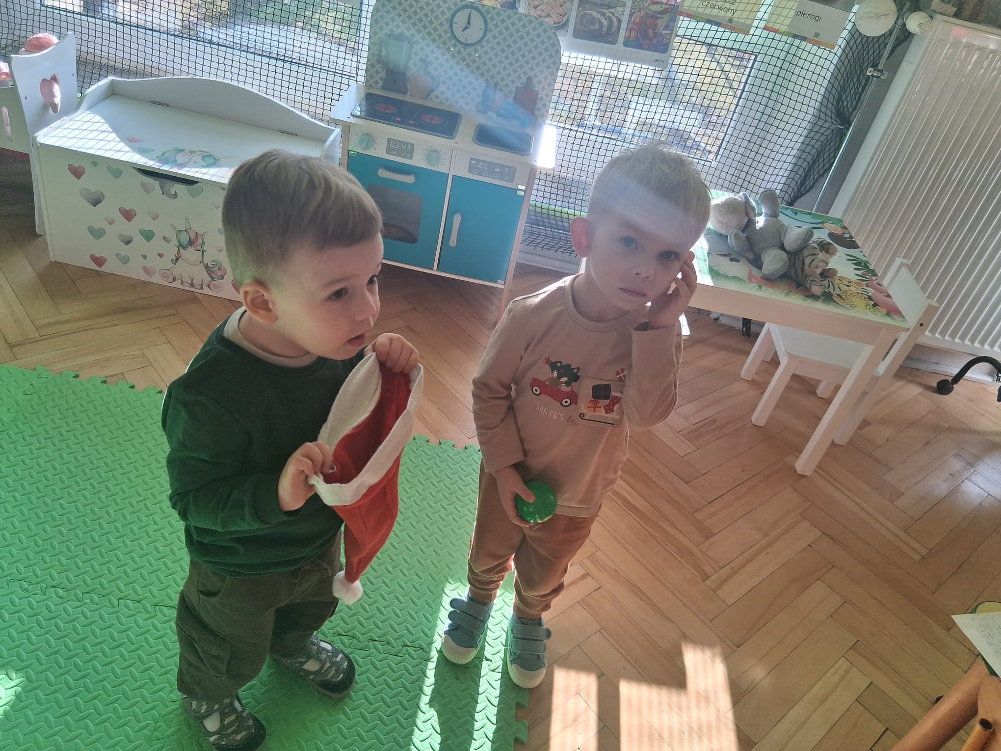 Krasnoludki zrealizowały kolejne zadania z Programu Edukacyjnego ,, W zdrowym ciele zdrowy duch, wie to każdy mały zuch''. W zabawach pomagały nam czapeczki mikołajowe.